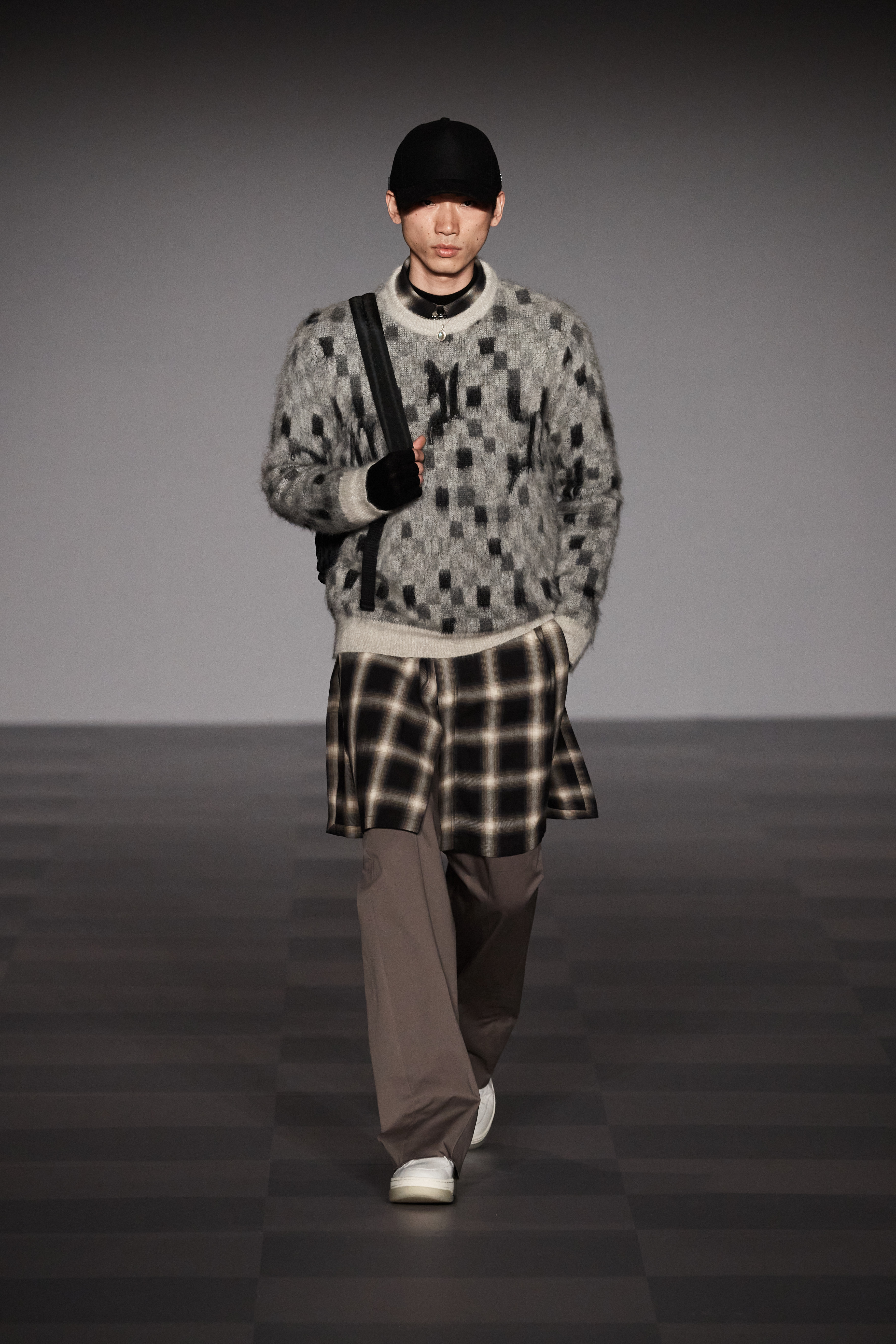 Accessories and footwear elaborate on the season’s visual narrative. Leather crossbody bags are worn high, encouraging new silhouette lines, and selected works by Wes Lang are traced across a new slim tote silhouette, branded with this season's gallery tag. On foot, the house's signature Stadium and Court sneakers hit the runway in this season's tonal colorways and checkerboard motif alongside shearling accent combat boots – shearling is further explored as plush slippers. Crochet bucket hats and trucker caps are interchangeable as West Coast tropes