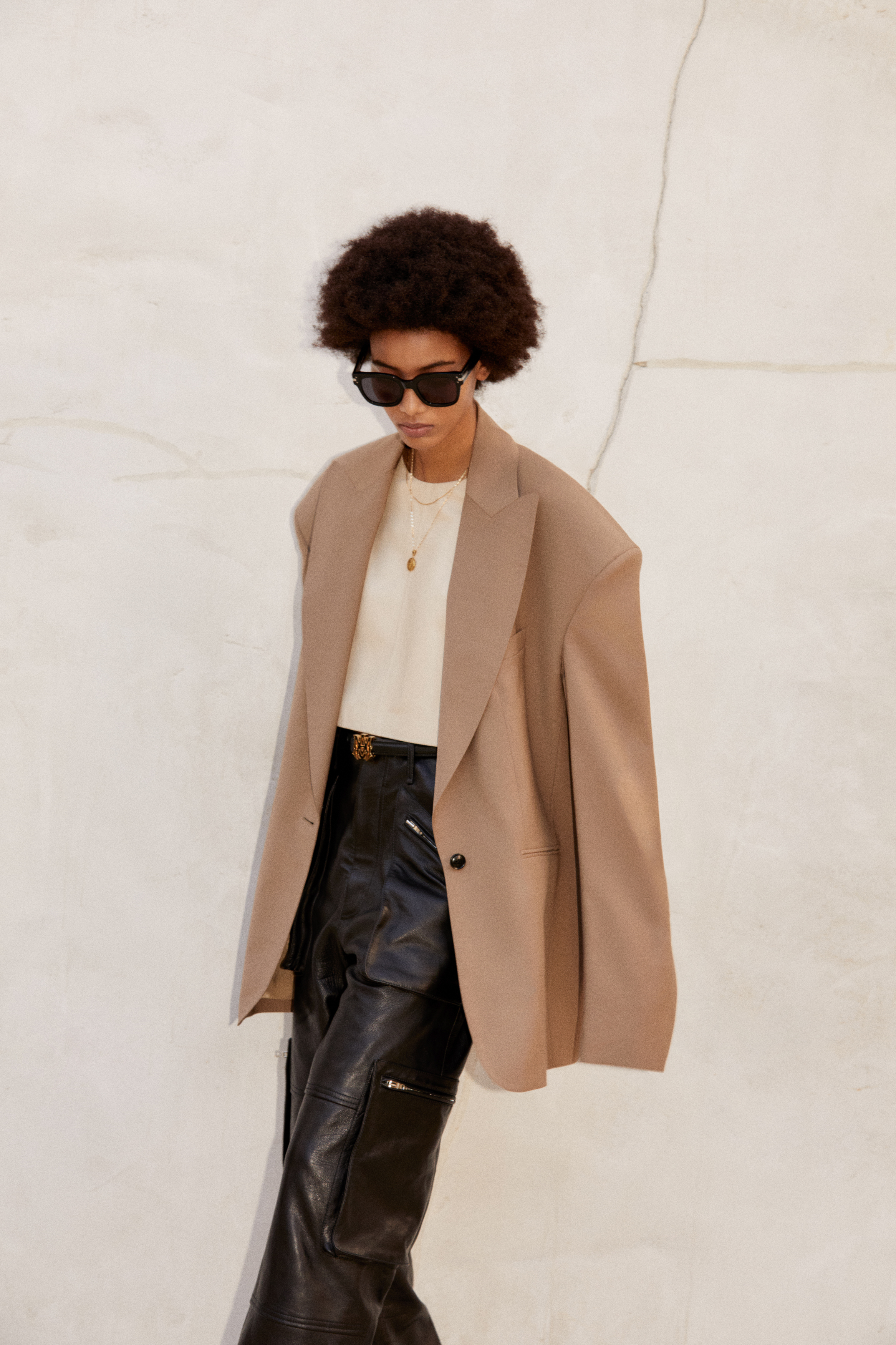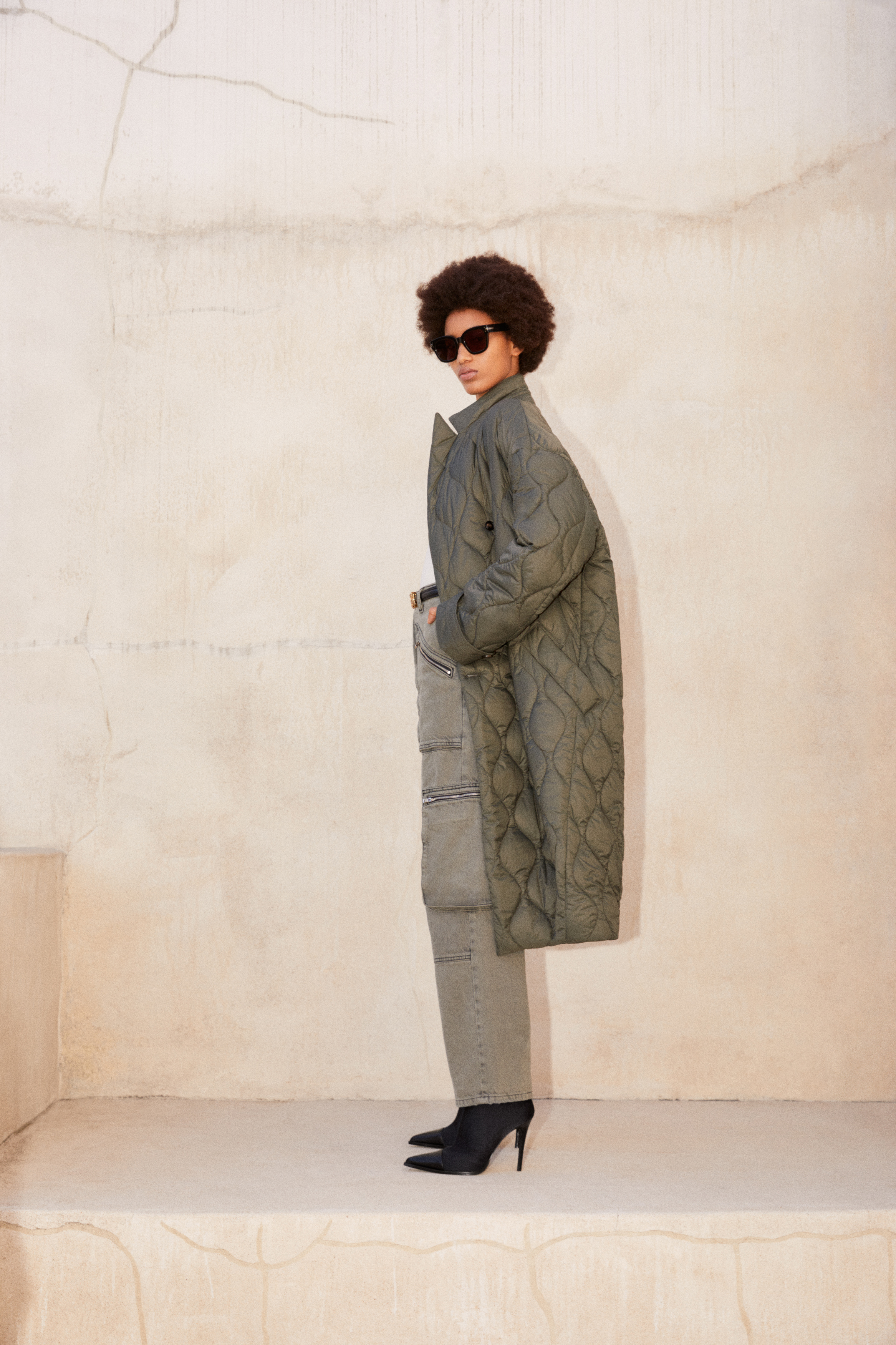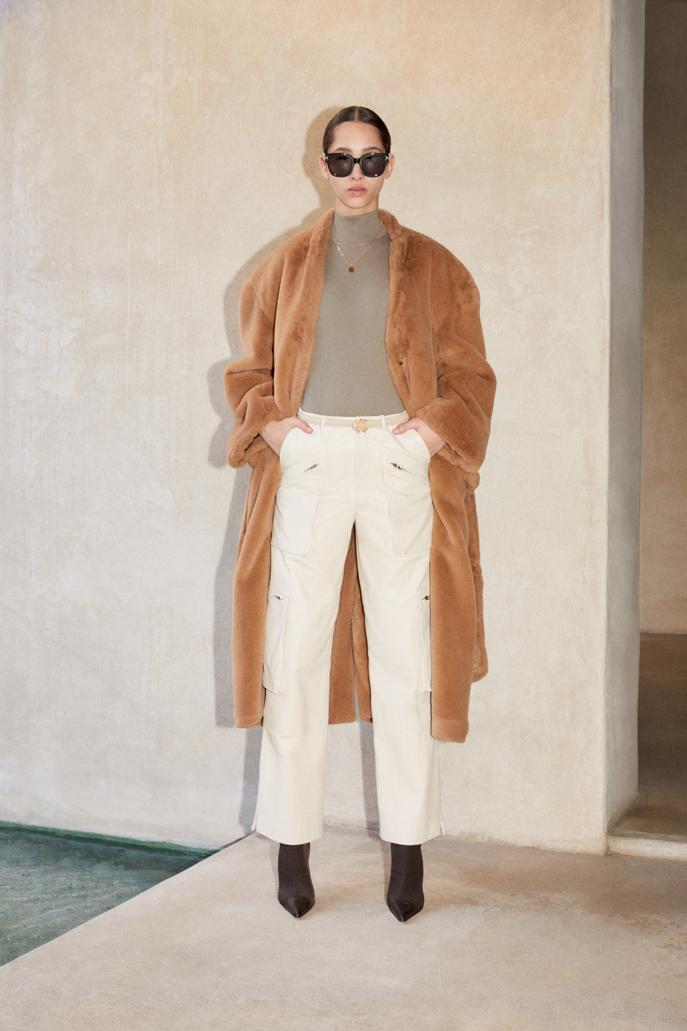 A palette of neutral and earthy tones defines the collection – alabaster, beige, brown, and sage – accented by a season-specific camo print. This tonal color spectrum assembles across a complex textural canvas that bridges the hardy and technical with the soft and sensual: nylon, treated denim, ripstop camo, Terry cotton and shearling find ease alongside jersey, felt wool, boucle and silk.