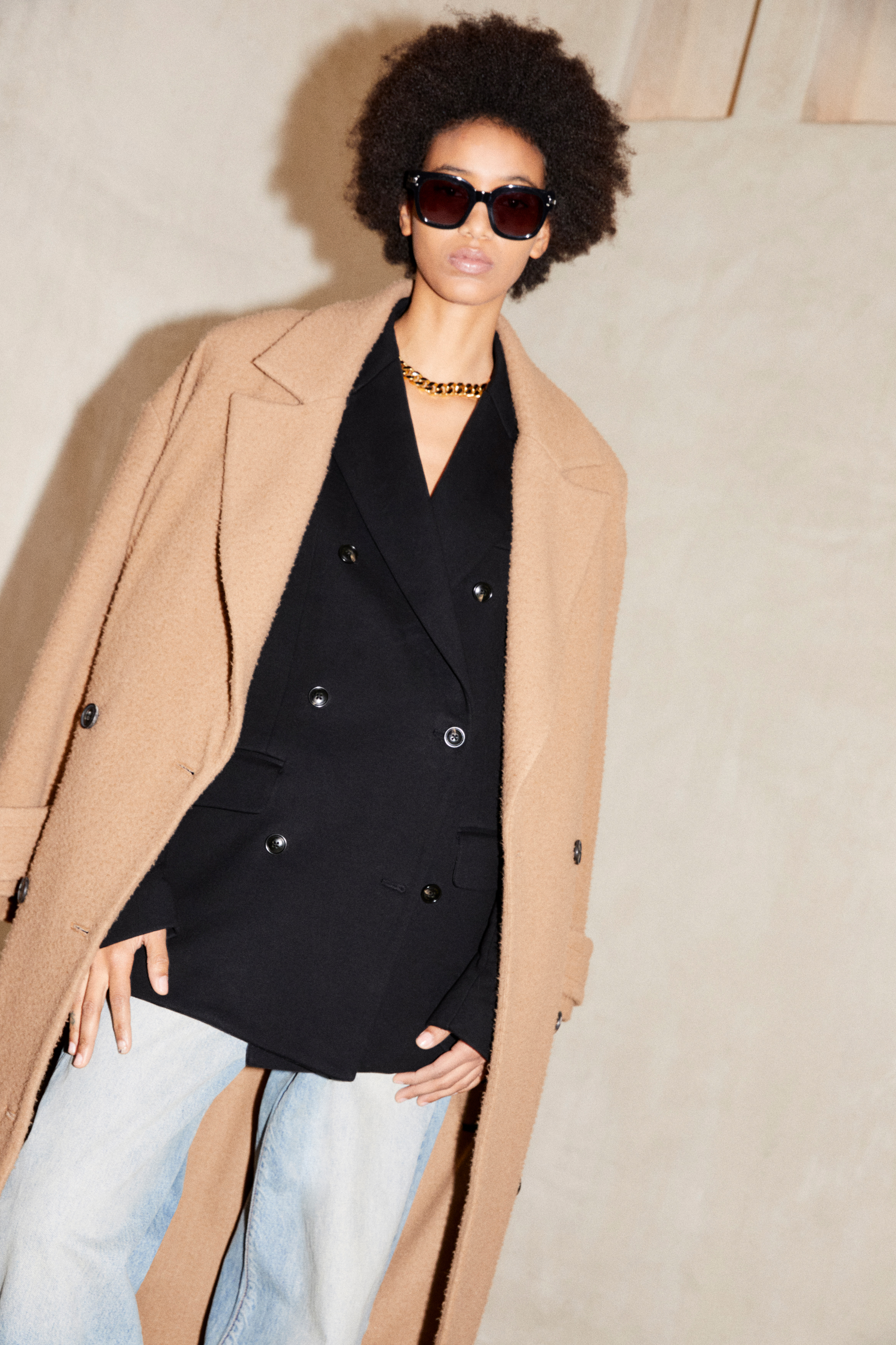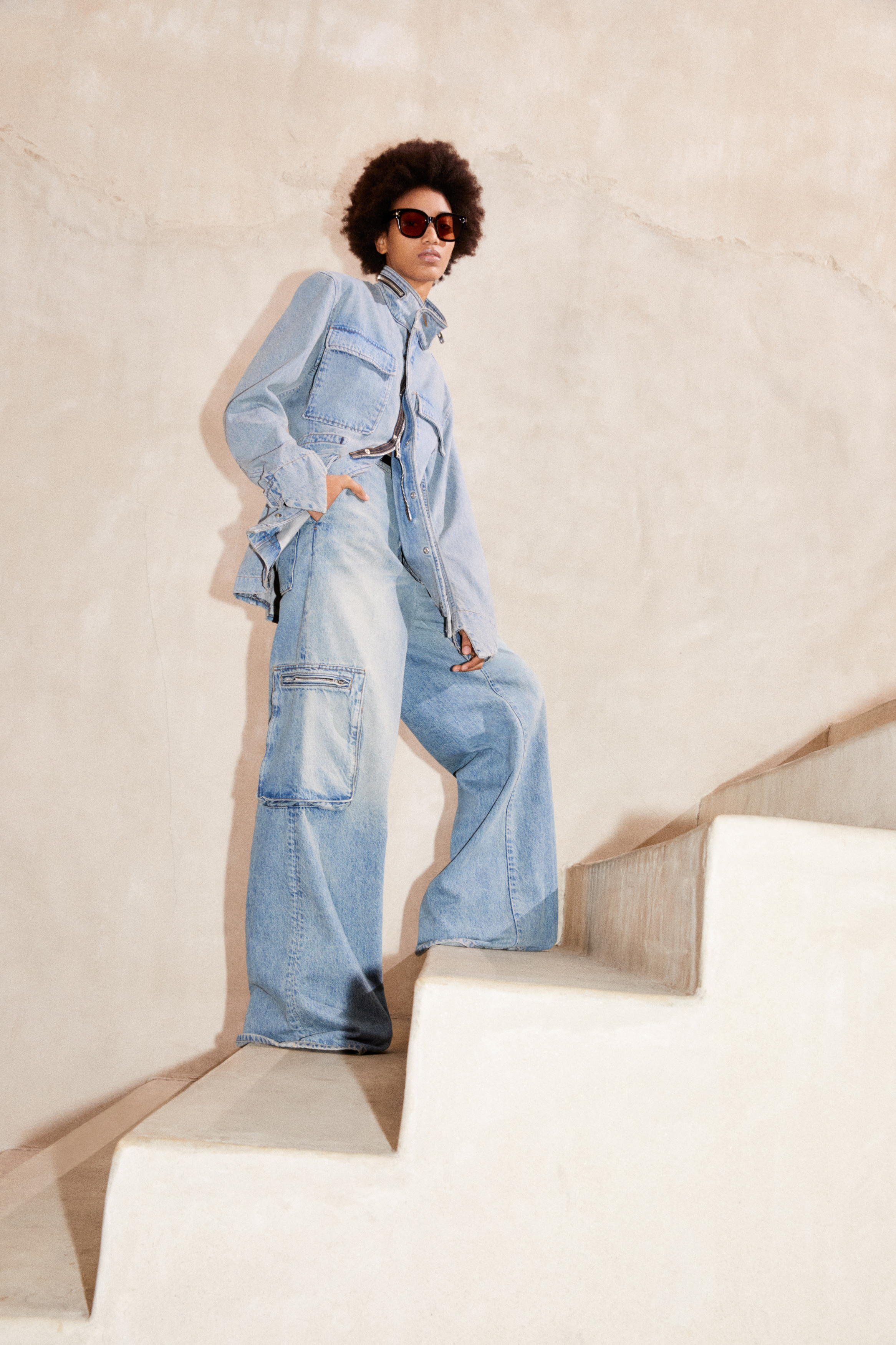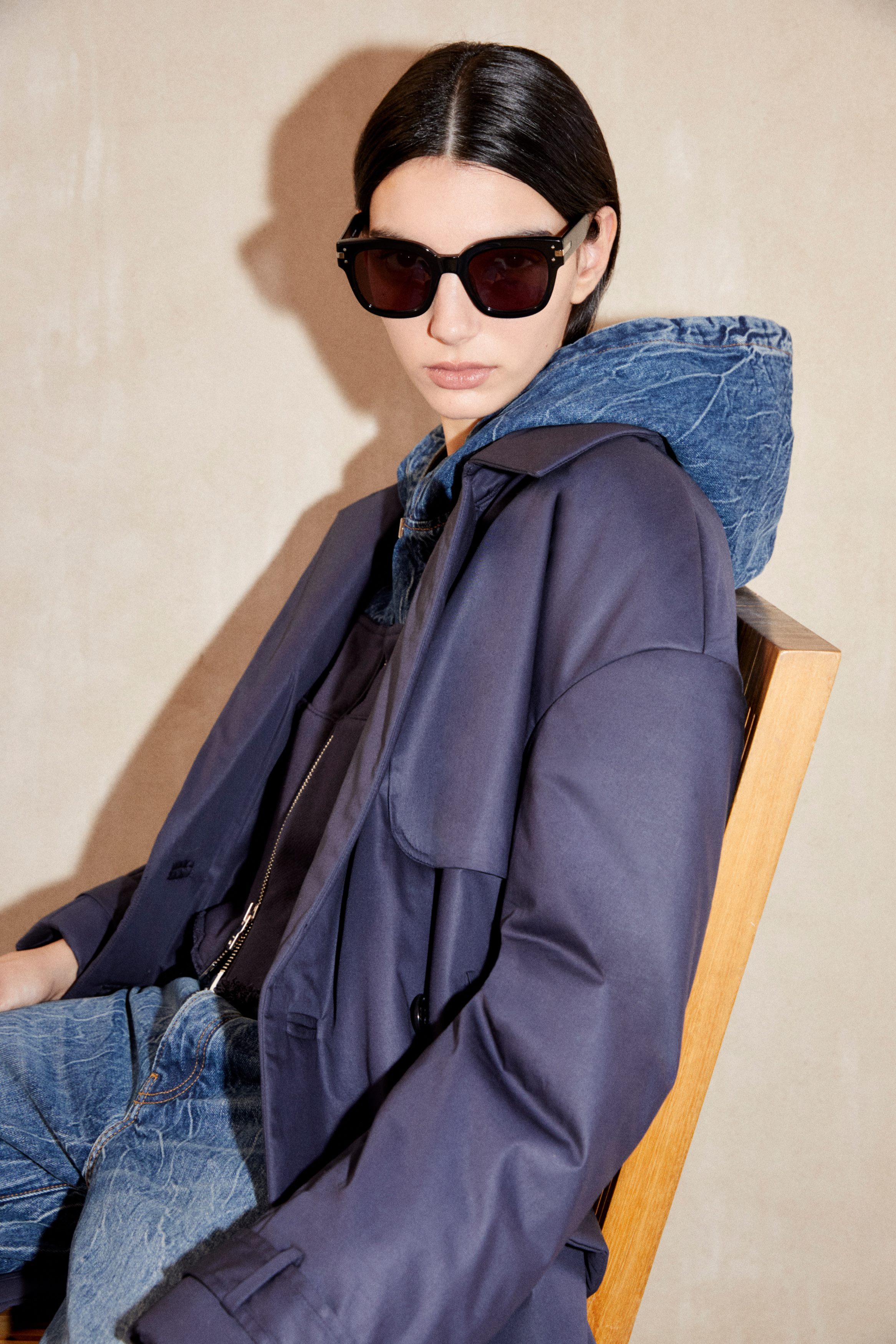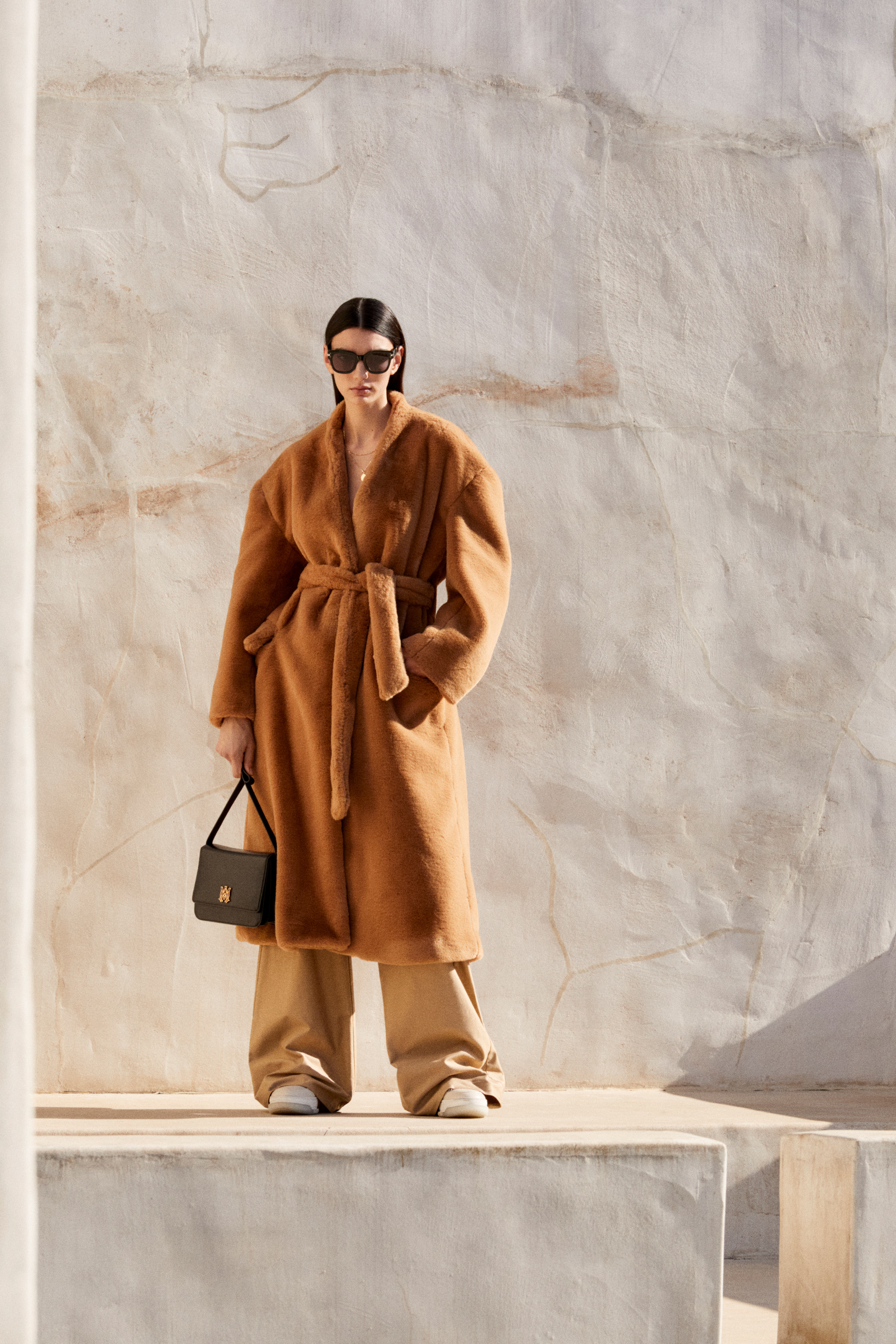A palette of neutral and earthy tones defines the collection – alabaster, beige, brown, and sage – accented by a season-specific camo print. This tonal color spectrum assembles across a complex textural canvas that bridges the hardy and technical with the soft and sensual: nylon, treated denim, ripstop camo, Terry cotton and shearling find ease alongside jersey, felt wool, boucle and silk.