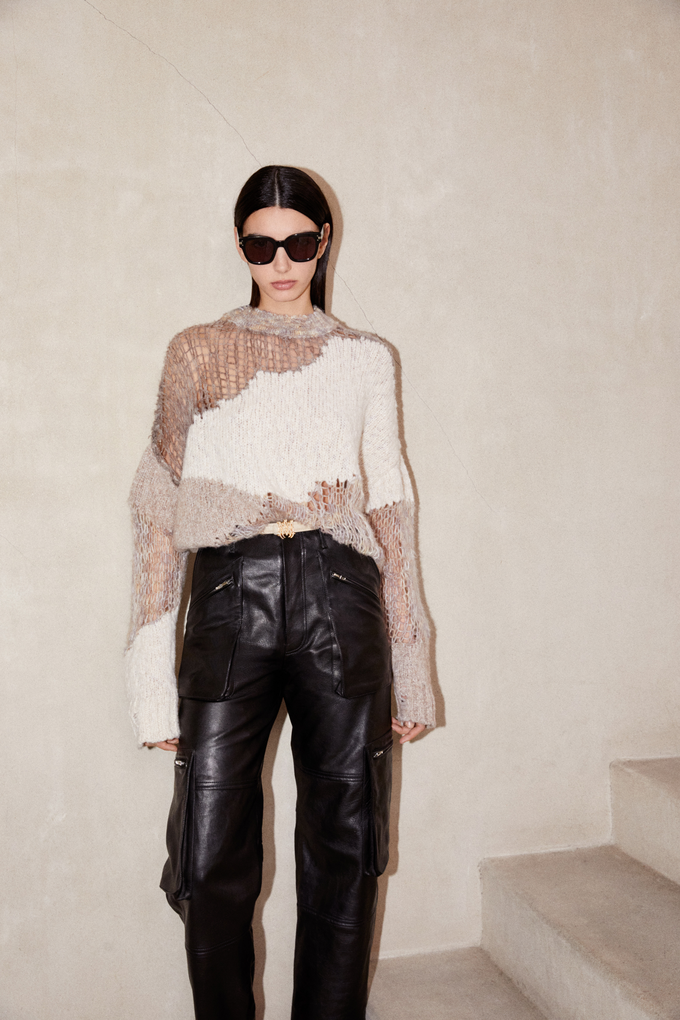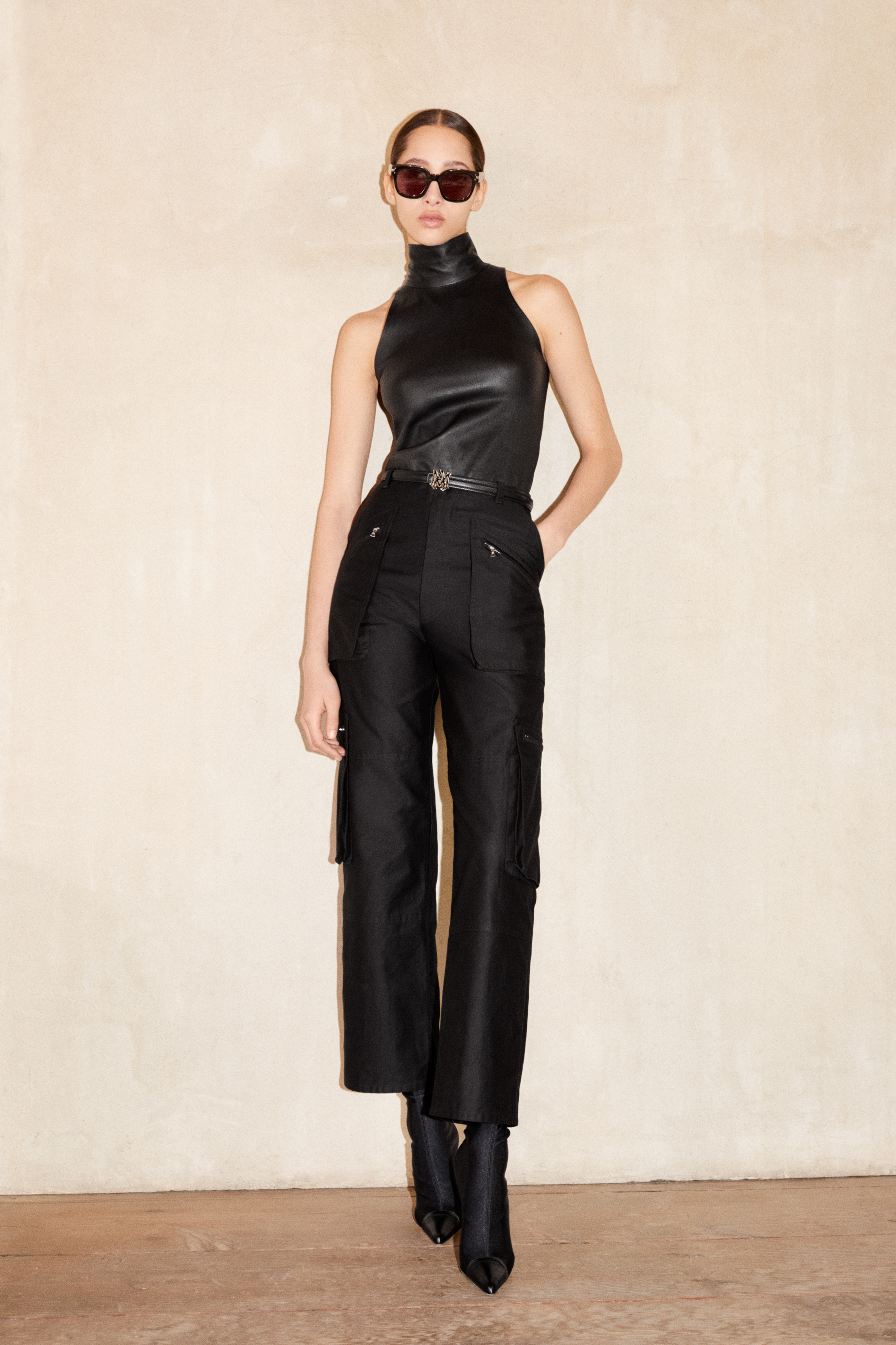 Applying AMIRI’s singular tailoring techniques to everyday garments, everything is elevated. Tapered sweatpants are cut with the precision of suiting, pleated trousers are designed to reflect motion and activity, and twill moleskin cargo pants are juxtaposed with technical nylon. At the base of each look, fitted tank tops rendered in soft leather become new archetypes with precise rigour.