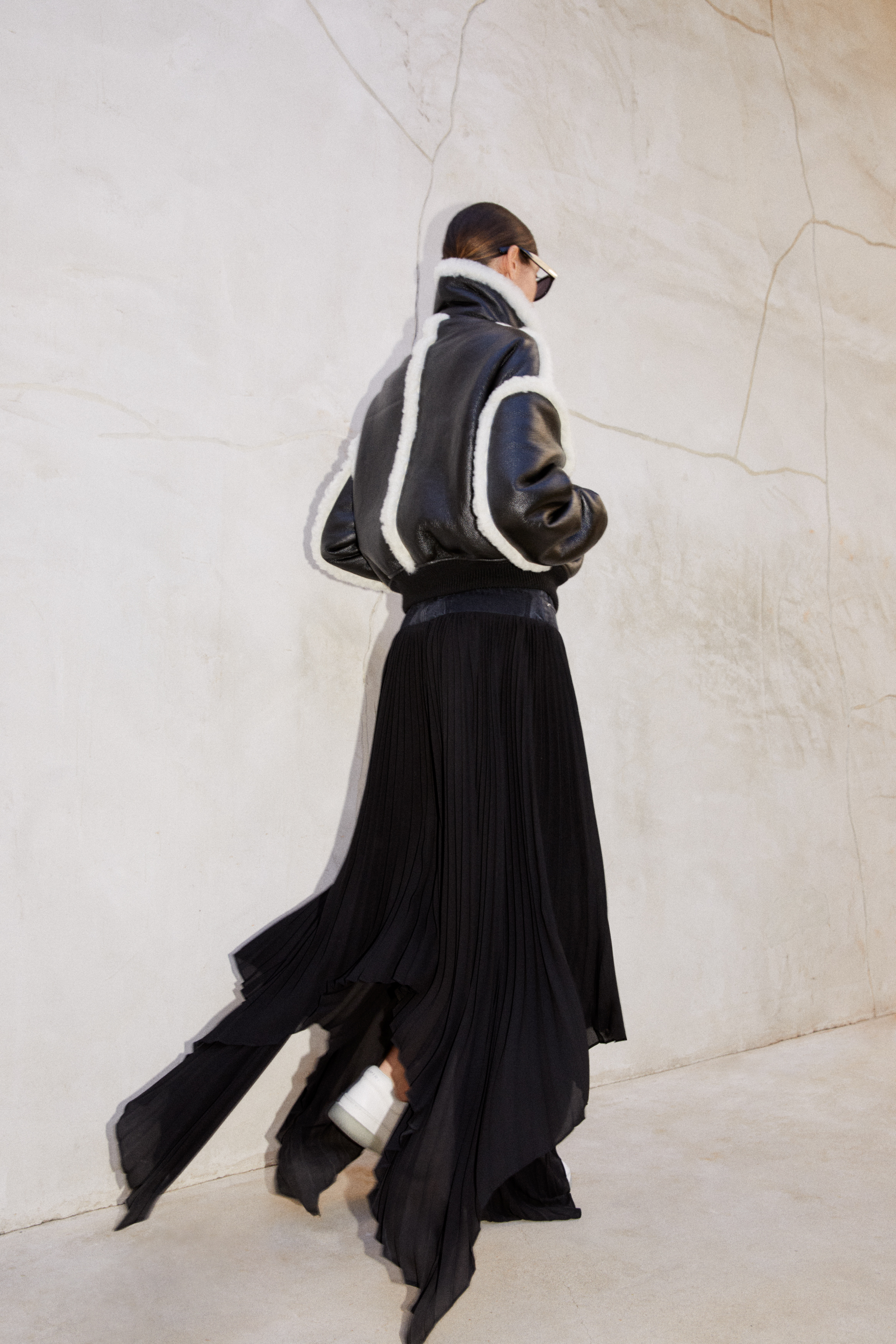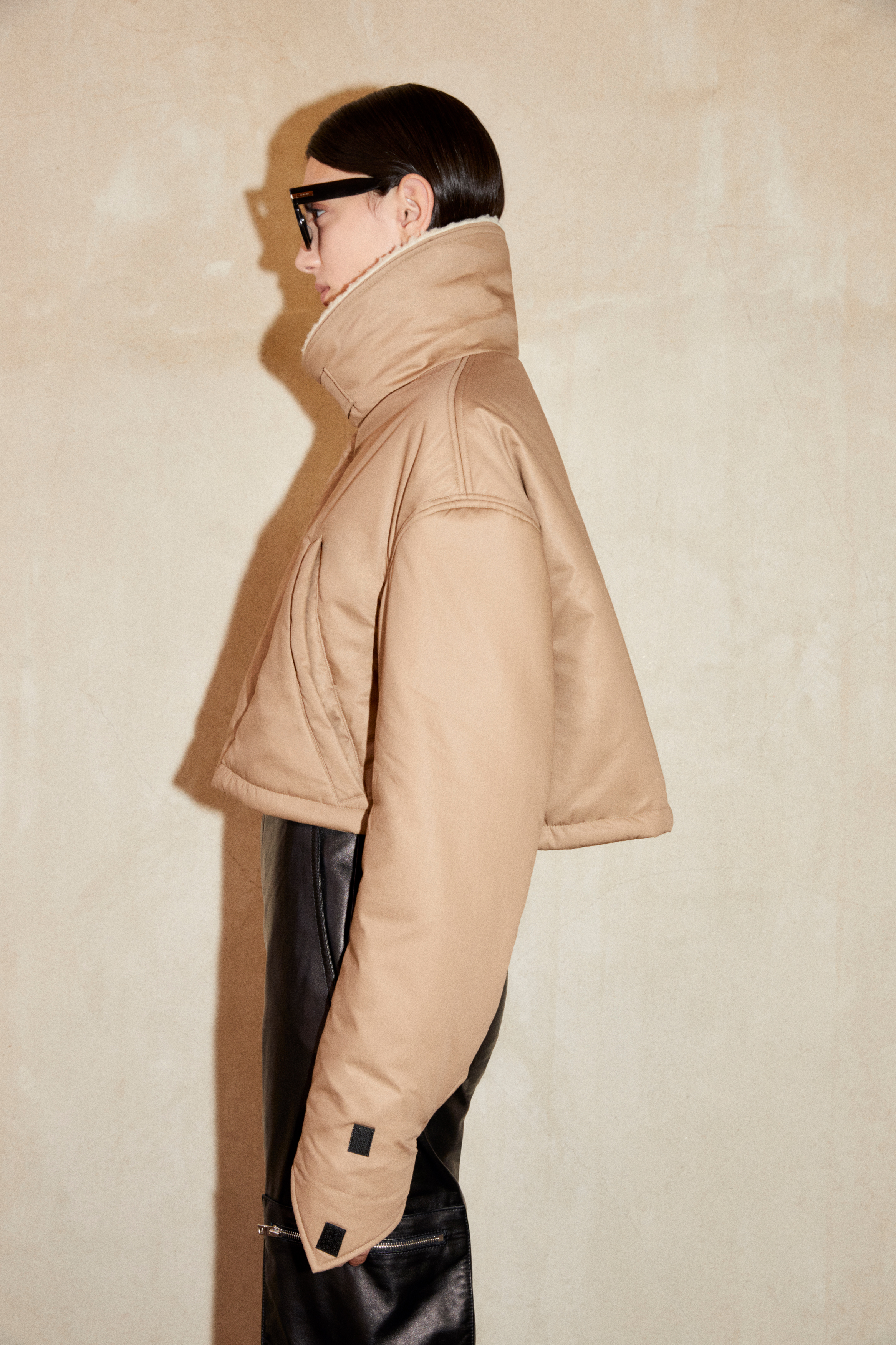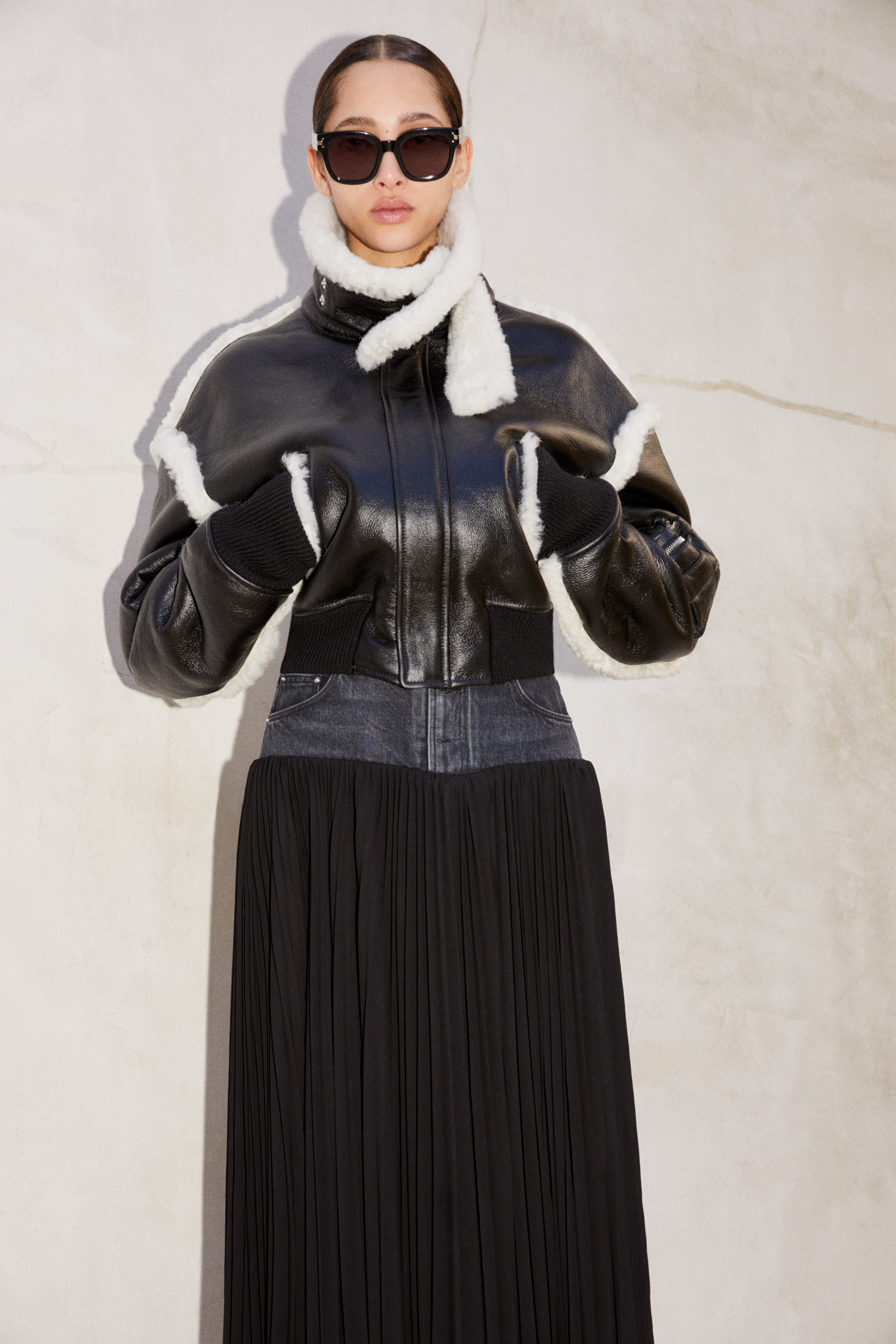 A duality of spirit shakes up perceptions through notions of hybridization as materials are spliced together to create new identities: French Terry with washed and veined denim, and Italian leather with cotton jersey – recalibrating traditional garment construction through conceptual distortion. Structured high Sherpa collars are formed with wire engineering as this season’s signifier, offering sculptural versatility that wraps the neck and alters the silhouette with a subtle movement or strap.