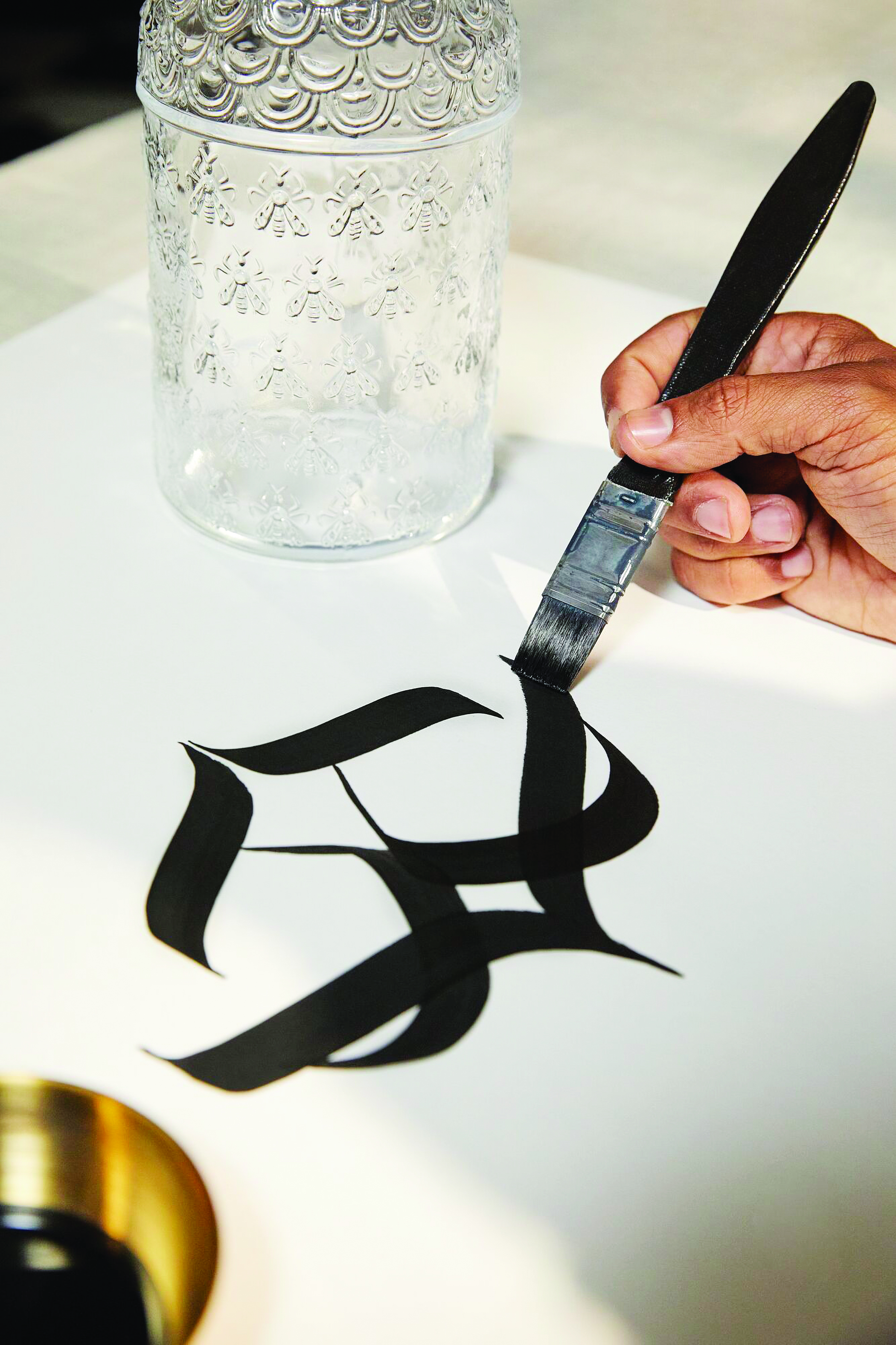 Sensuous and abstract, avant-garde and timeless, poetic and bold. For Guerlain, Inkman has created an artwork whose beauty is undeniable. Dazzling. Absolute. A jewel that wraps around the body of the mythical Bee Bottle produced by Pochet du Courval, the historical glassmaker of the House since 1853. And more than a jewel, a meeting between two of the creative worlds that are most emblematic of the East: calligraphy and perfume.