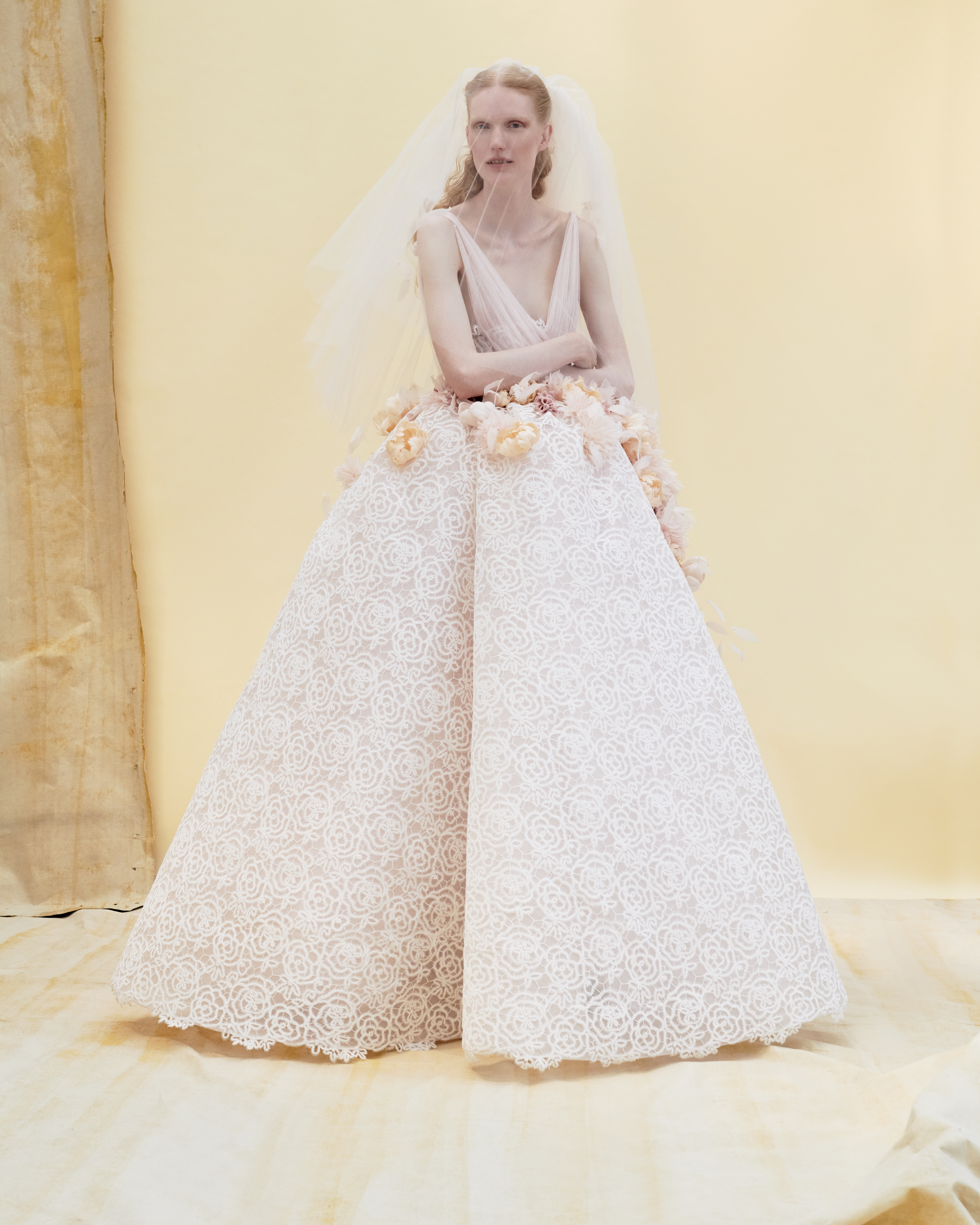 Garlands of laurel rain down in cascades of satin on the bottom of a bacchante dress. In braided golden metal, laurel also crowns a head or emphasizes a drape, underlines the waist. Everywhere blows the spirit of nymphs and goddesses, gathered for the time of a dream and a contemporary floralia.
