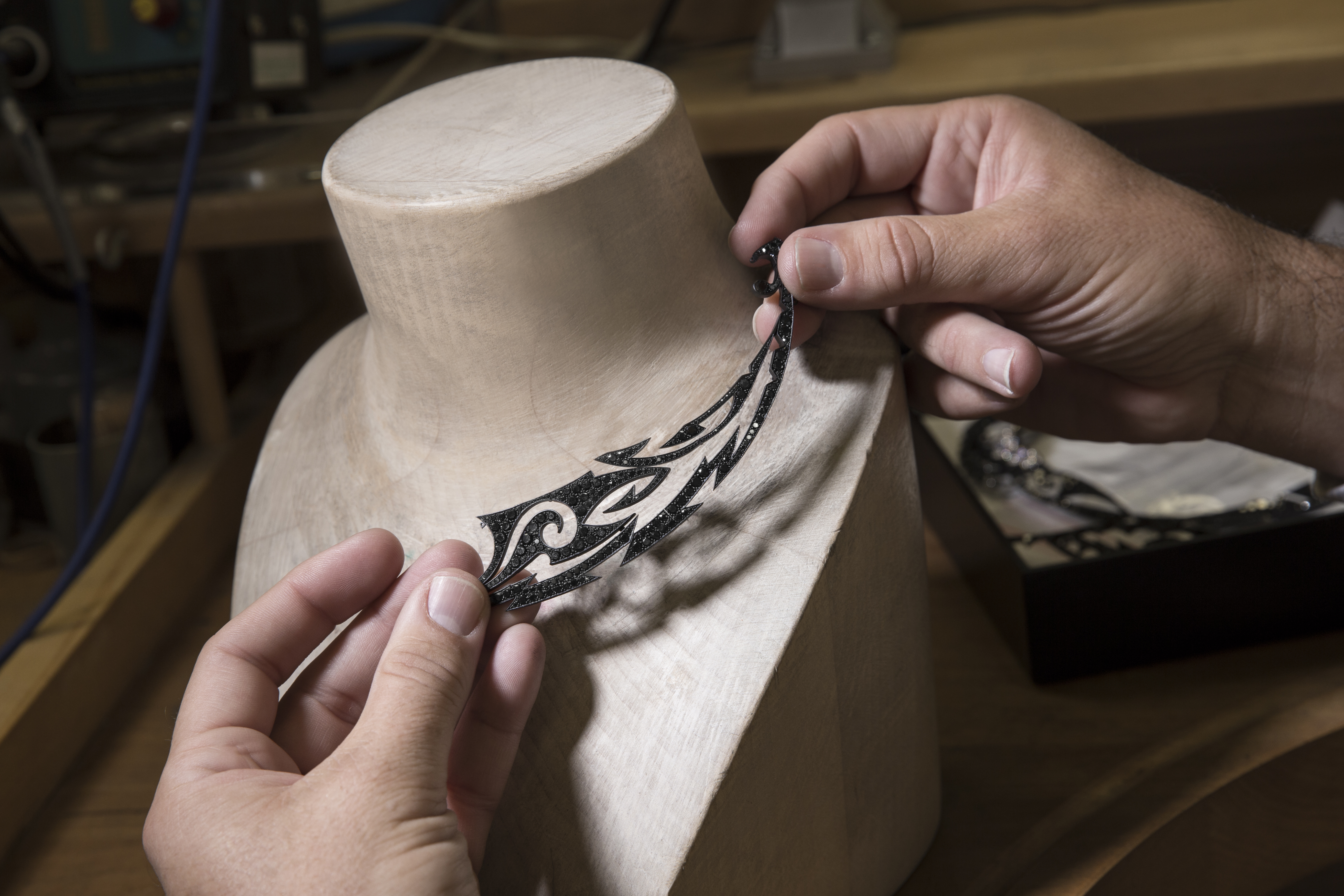To create the necklace — the rich and complex lynchpin of the whole collection — the French savoir-faire of Akillis studios adopted cutting-edge feats of engineering. Its curves and swirls come and go, like a wave alternating between frozen crest and sudden crash, plunging from the base of the neck to the shoulders. Other parts dwindle to thin wires. Akillis dares to marry white and black gold forged using traditional techniques. And since Caroline Gaspard loves the unexpected, she electrifies this piece with black diamonds. These high-quality gems are tailored in a painstaking process — the mark of true luxury — with each of the 71 jewels fashioned in unique triangular forms to create stunningly precise mirrored surfaces. The necklace appears to levitate. Conceived from countless sketches, born of an arrangement of lines and figures where every element depends on the one before and after it, the never-before-seen geometric calligraphy stands out on the skin. Its enmeshed joints guarantee flexibility and comfort. The latticework supports both upward and downward motion, while the fine vanishing points and dramatic angles deliver a “punk rock” sensuality to the necklace. With 1,727 black diamonds and 137 white, the total carat-age is 62.78. This piece was crafted with critical attention to detail: every setting, mounting and crimping, demanded meticulous care. A shapely work of art born of several trials and adjustments. It will find its home on the woman who can appreciate it for what it is: a work of haute couture, as fine as a tailored gown.