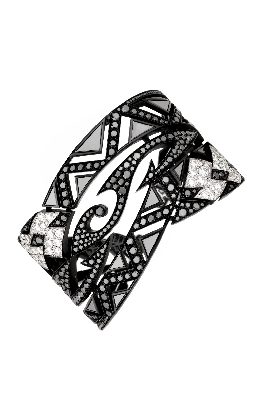 For the matching cuff, 370 black diamonds — including 19 specially cut for this piece — and 202 white ones enlace the wrists with finery. Its hinged opening makes the application of this bejeweled tattoo as easy as a single click. The other earring, an inverted one, rests entirely on the back of the ear and is only visible in profile or from behind. The lacework design is of an exquisite lightness: it unites black-DLC-coated white gold with a sumptuous and delicate jeweling of 367 black diamonds.