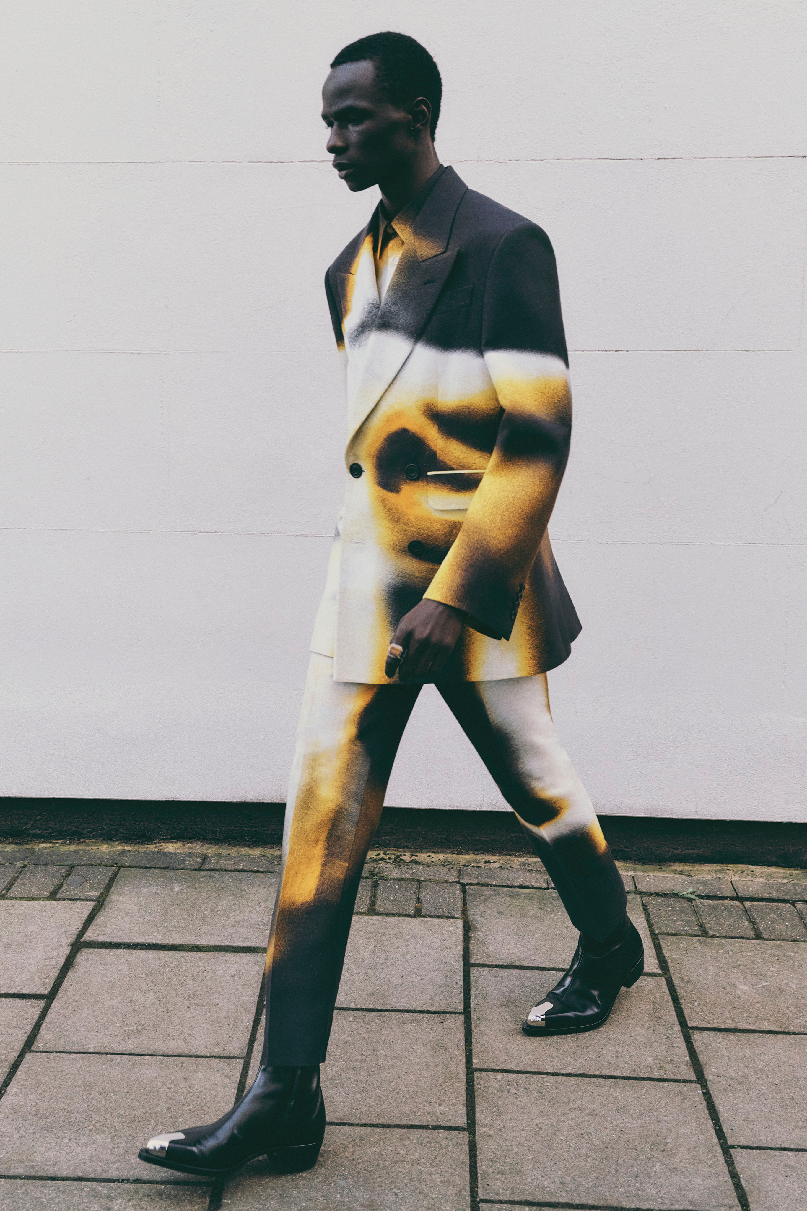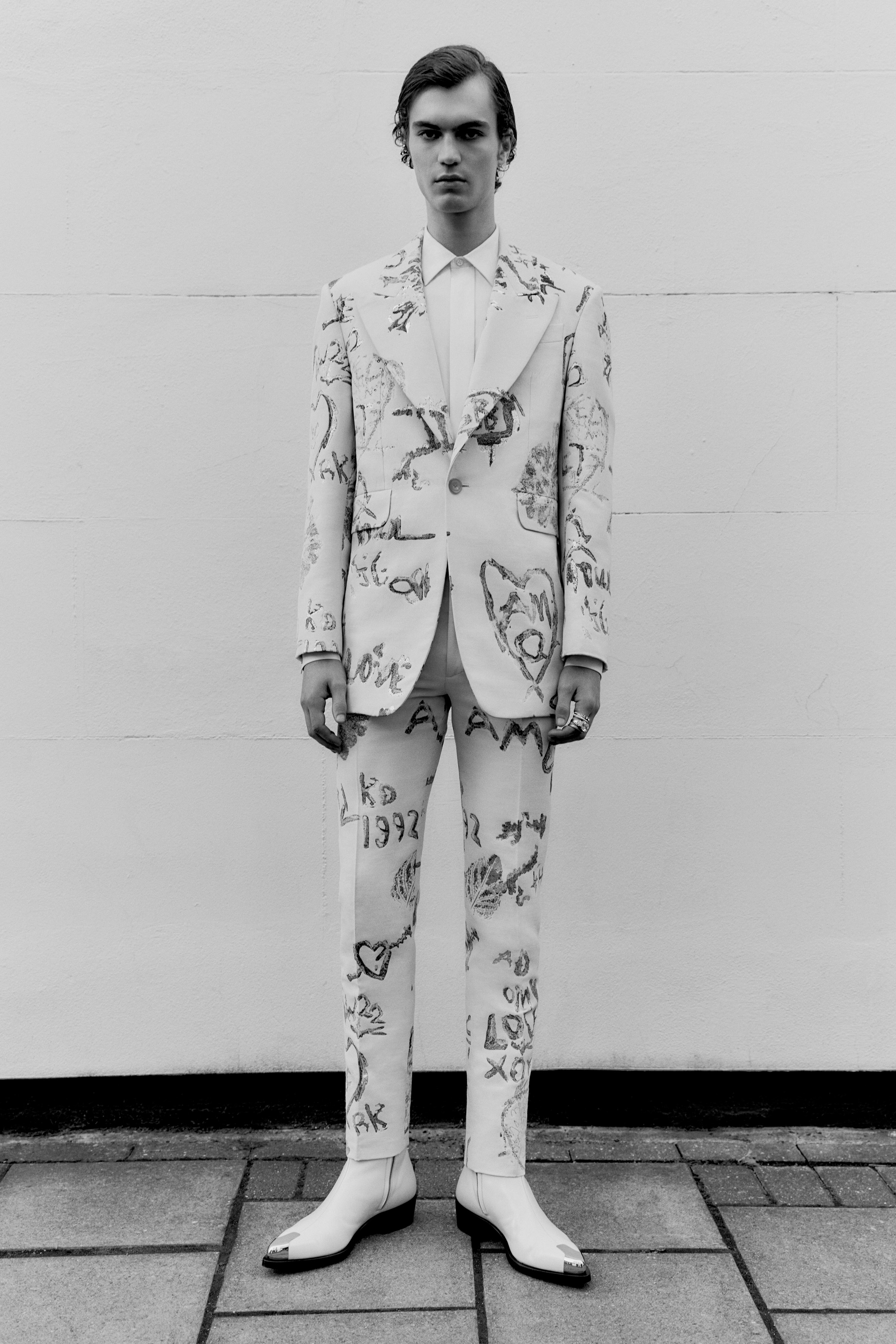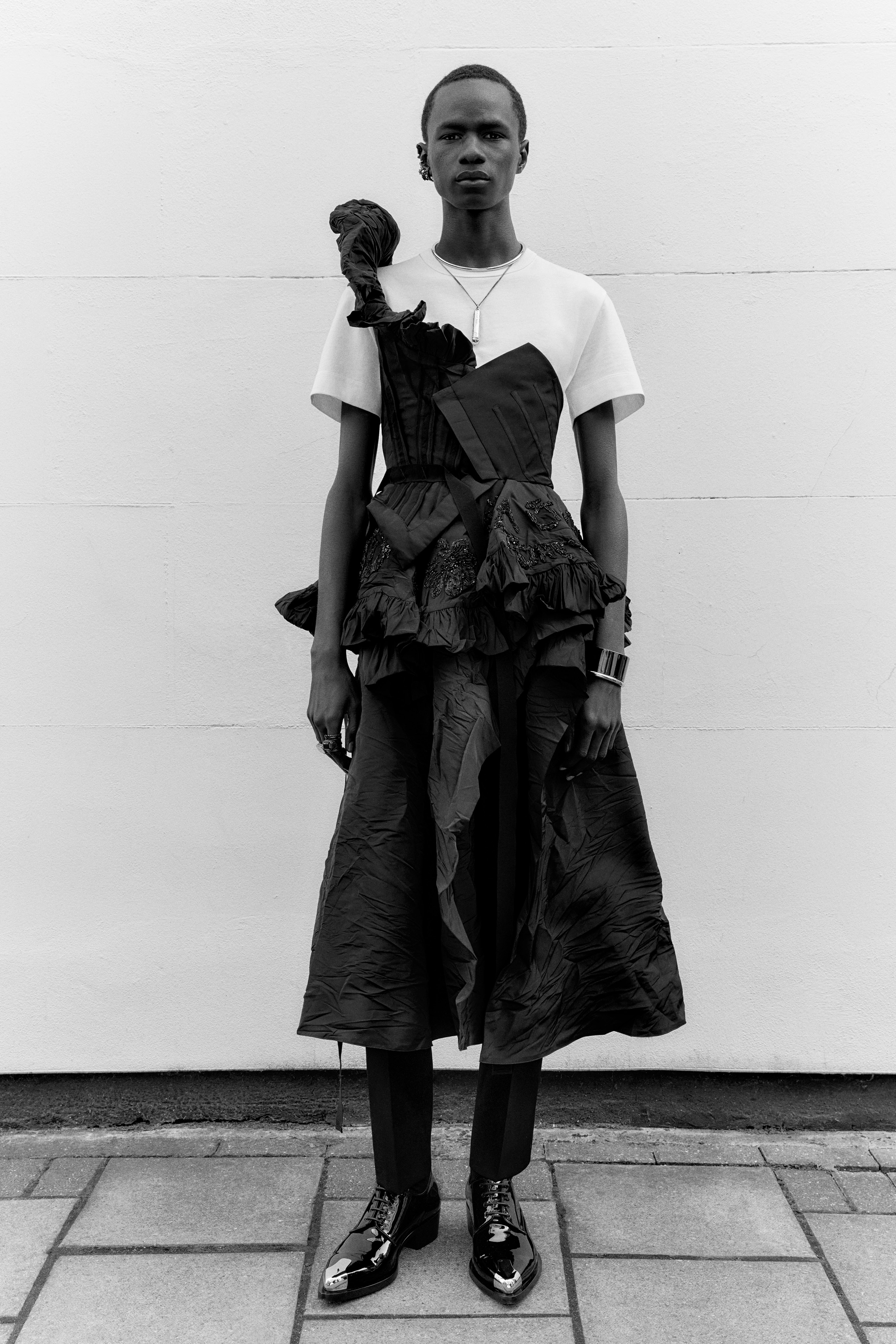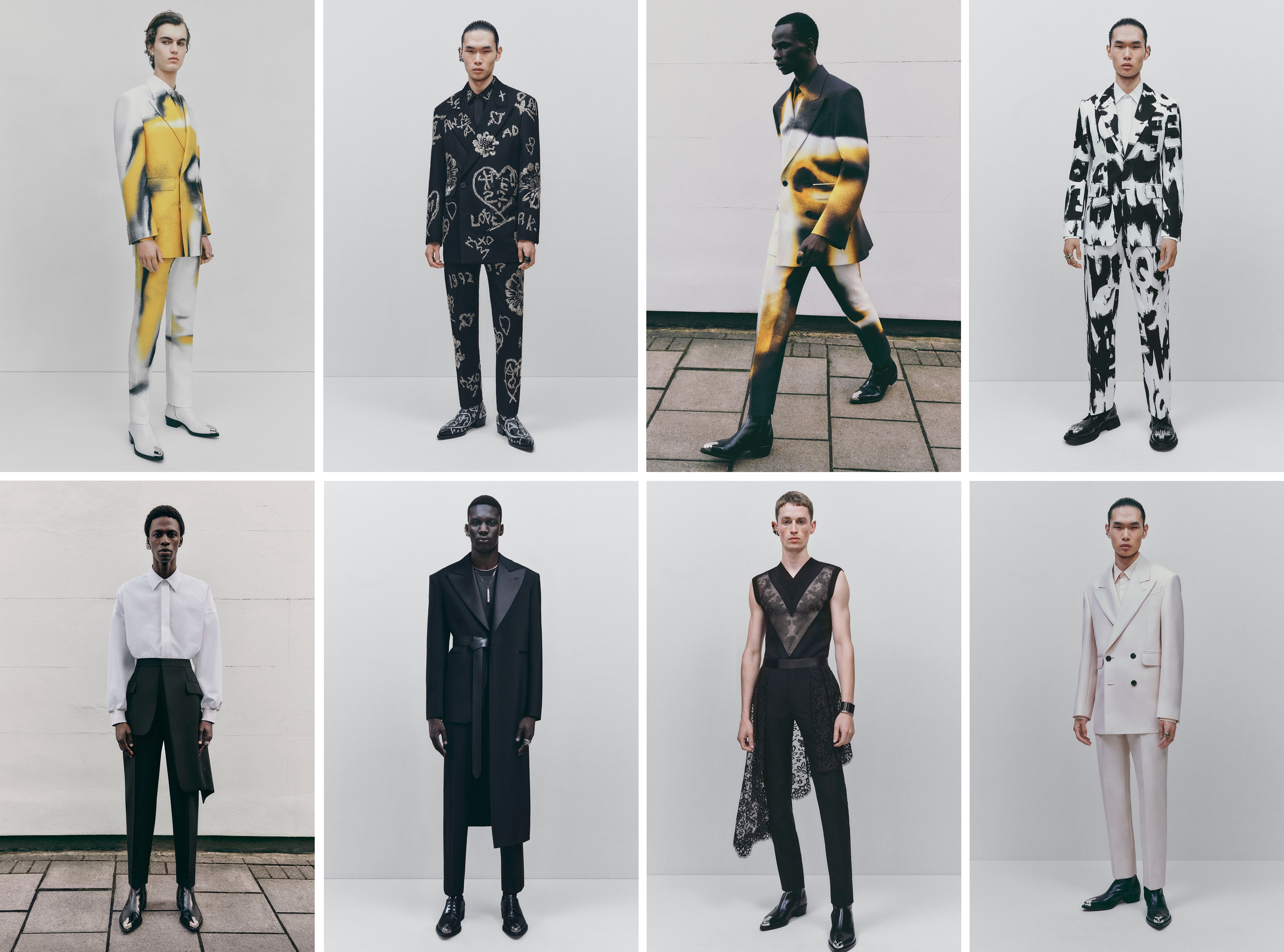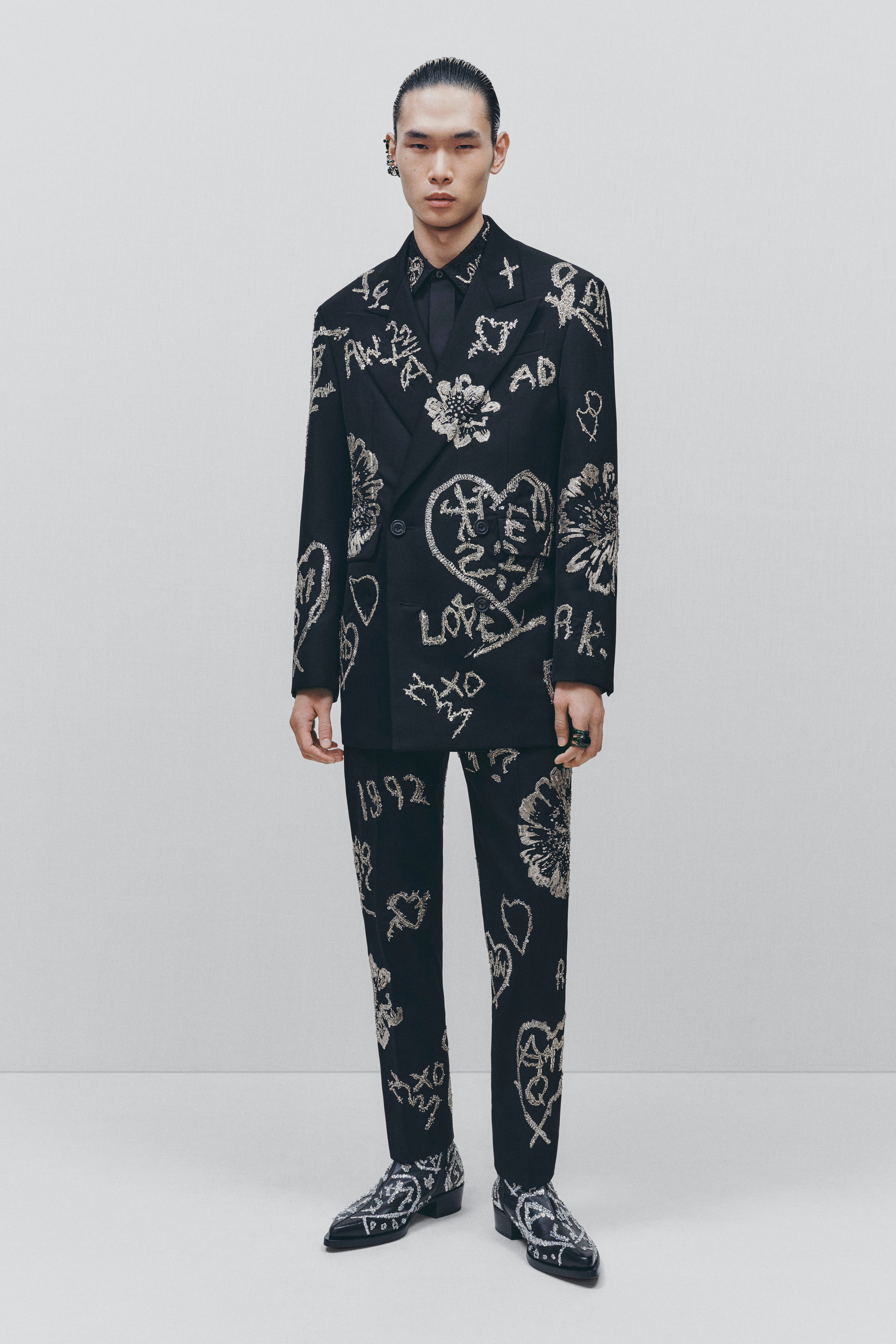 Closer to the earth. Grounded. References to early Alexander McQueen and to late Fifties and early Sixties Soho: looking to George Dyer and John Deakin. A focus on tailoring and silhouette: fitted, oversized and with asymmetric drape and detailing. Inside-out corsetry. Spray paint silhouette and graffiti prints. The initials of the studio team: a creative community, woven in thread.