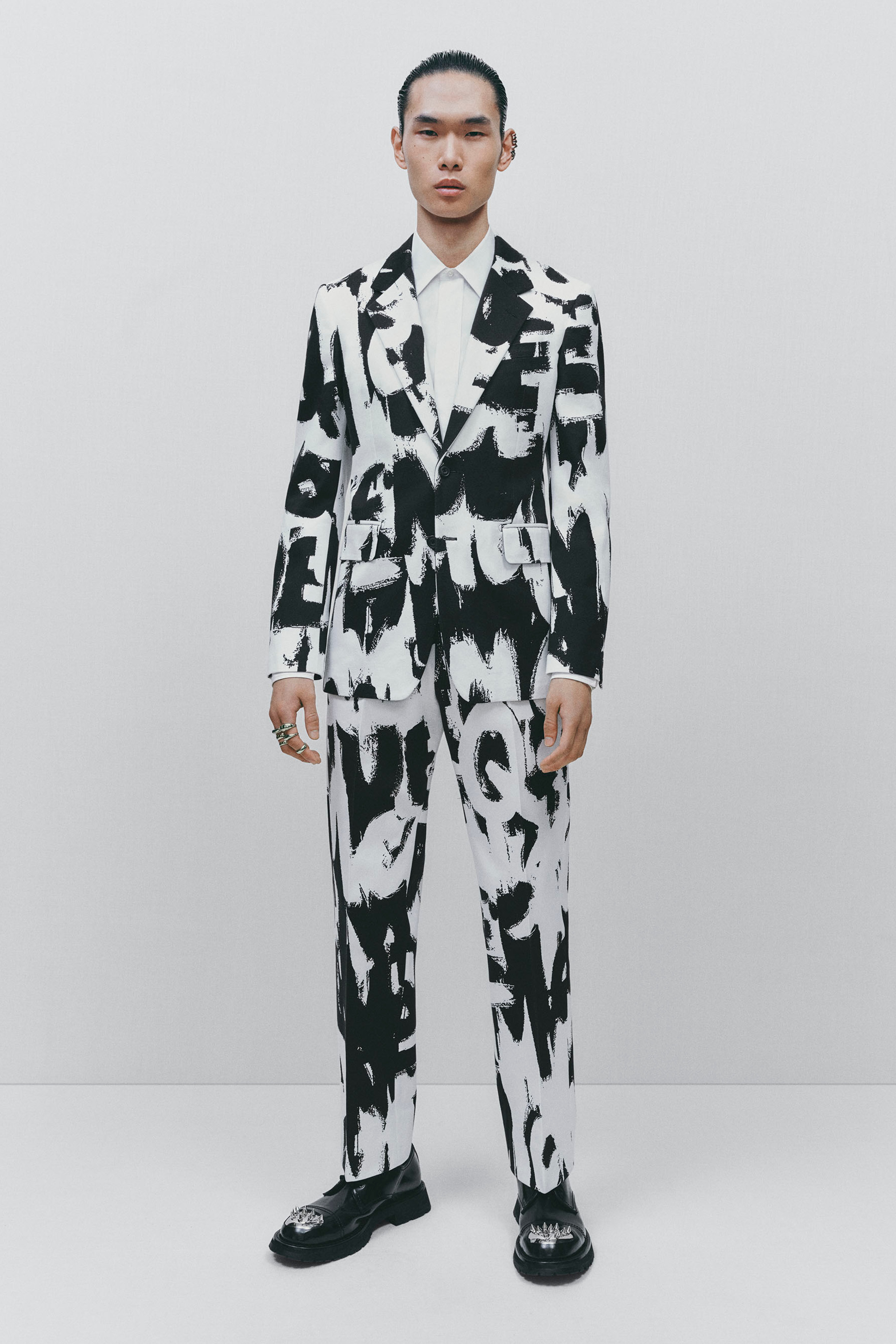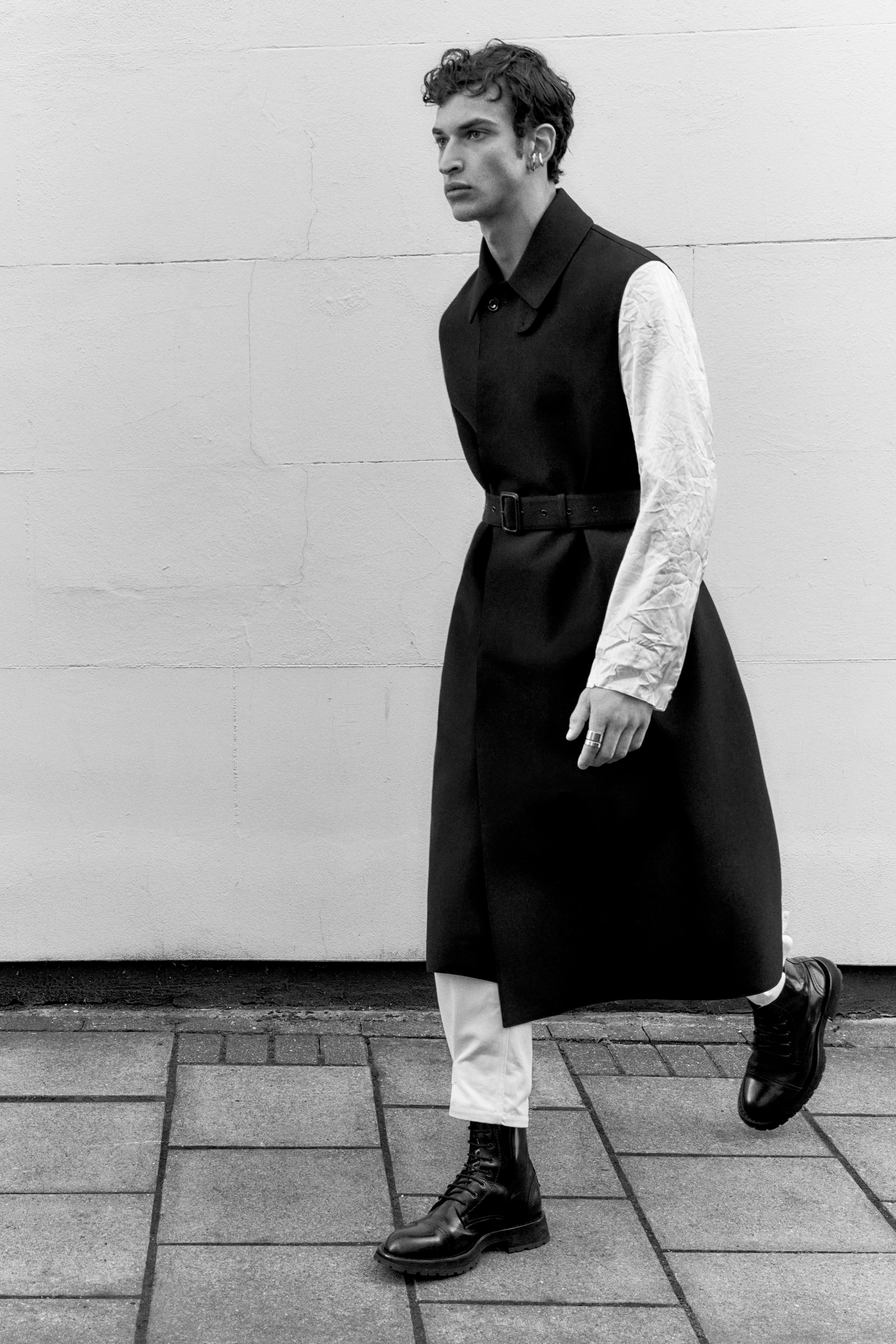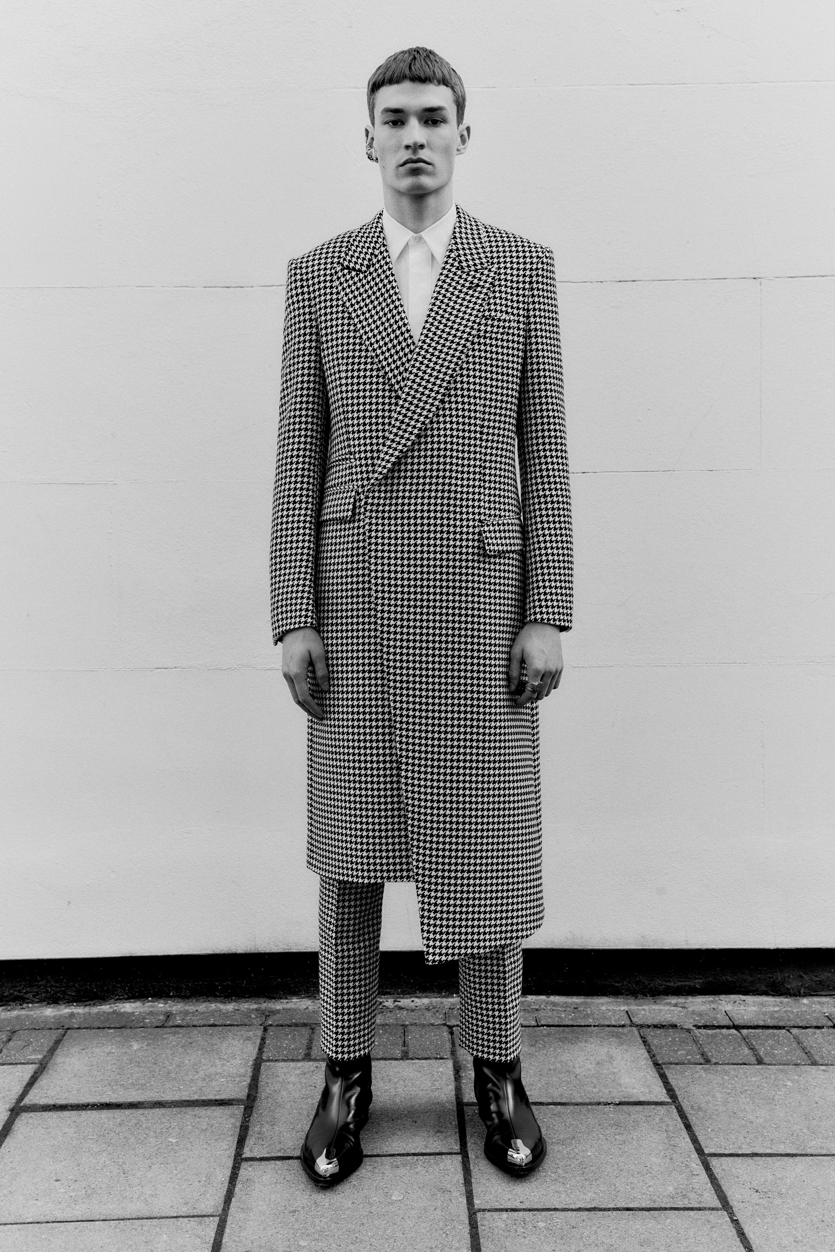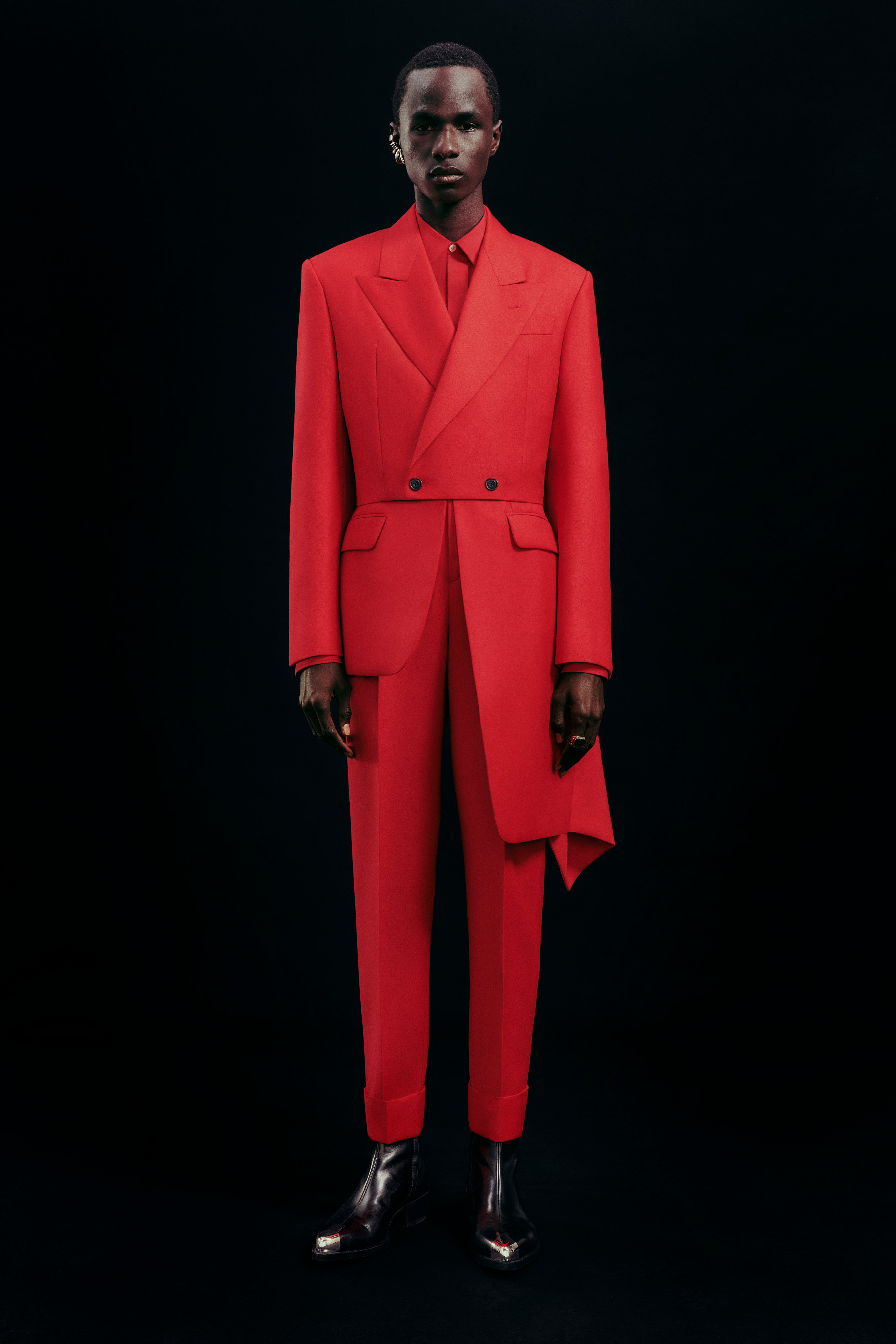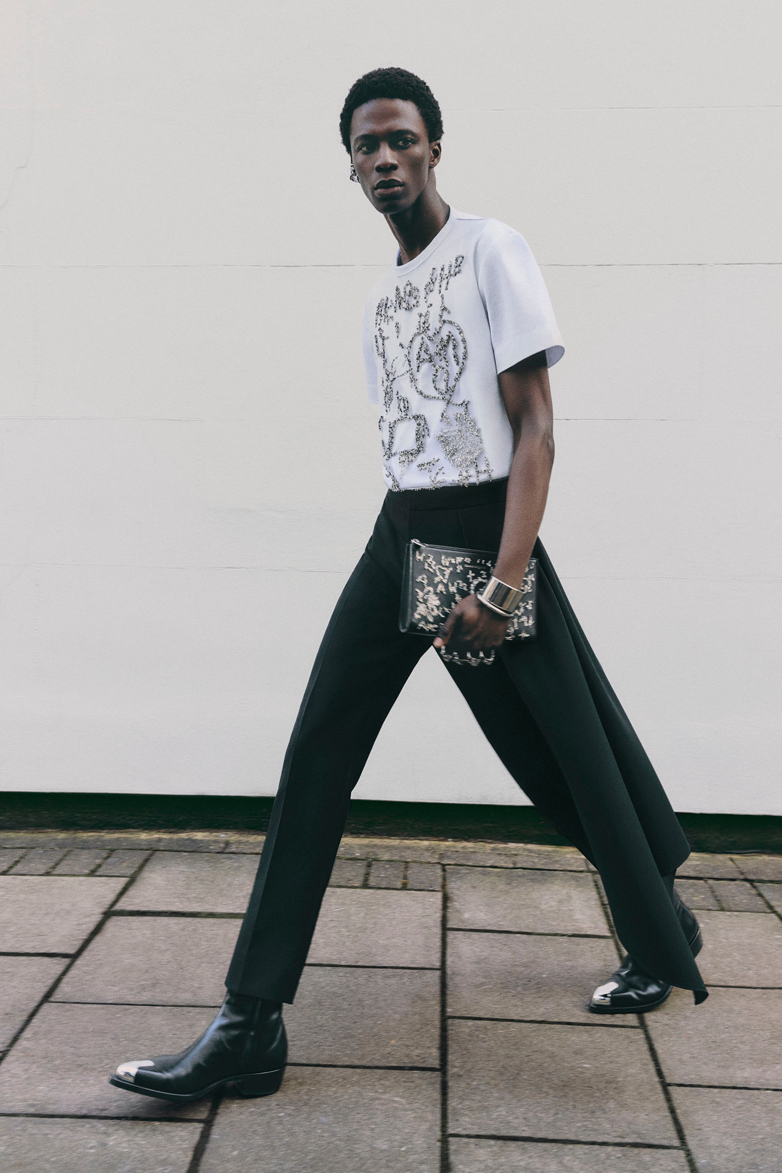Closer to the earth. Grounded. References to early Alexander McQueen and to late Fifties and early Sixties Soho: looking to George Dyer and John Deakin. A focus on tailoring and silhouette: fitted, oversized and with asymmetric drape and detailing. Inside-out corsetry. Spray paint silhouette and graffiti prints. The initials of the studio team: a creative community, woven in thread.