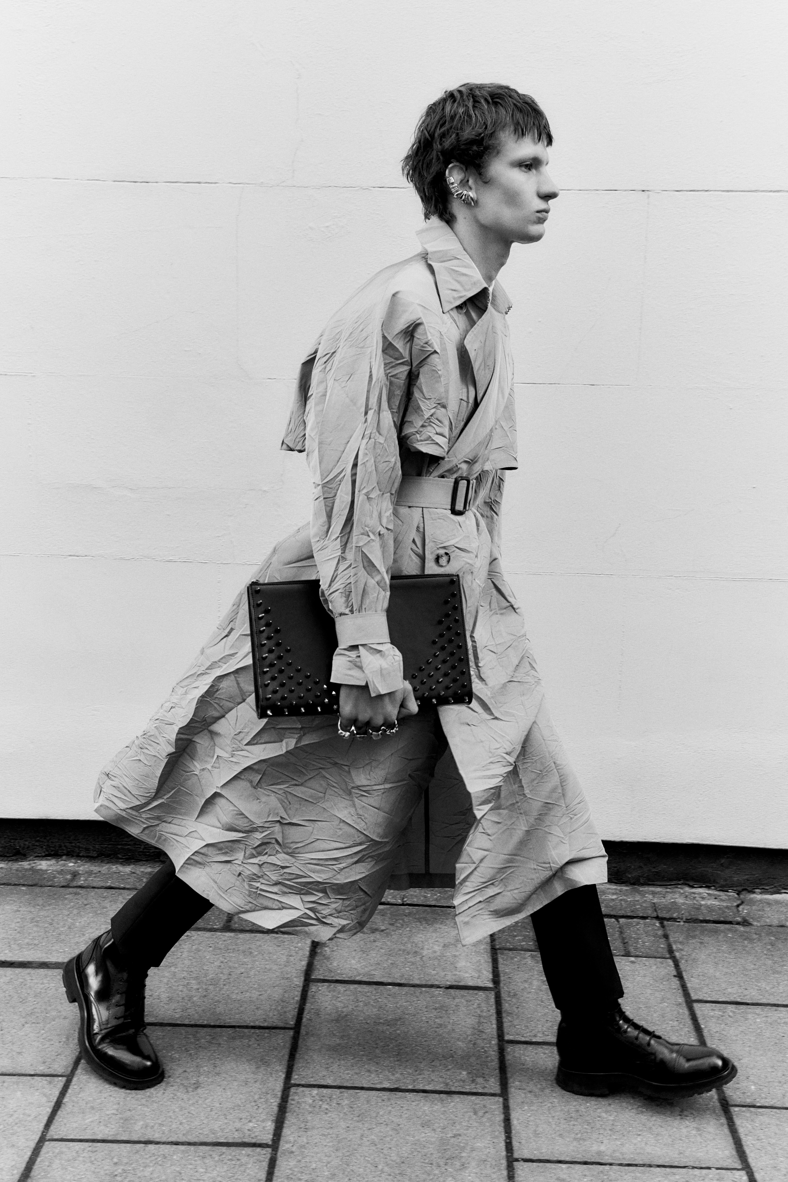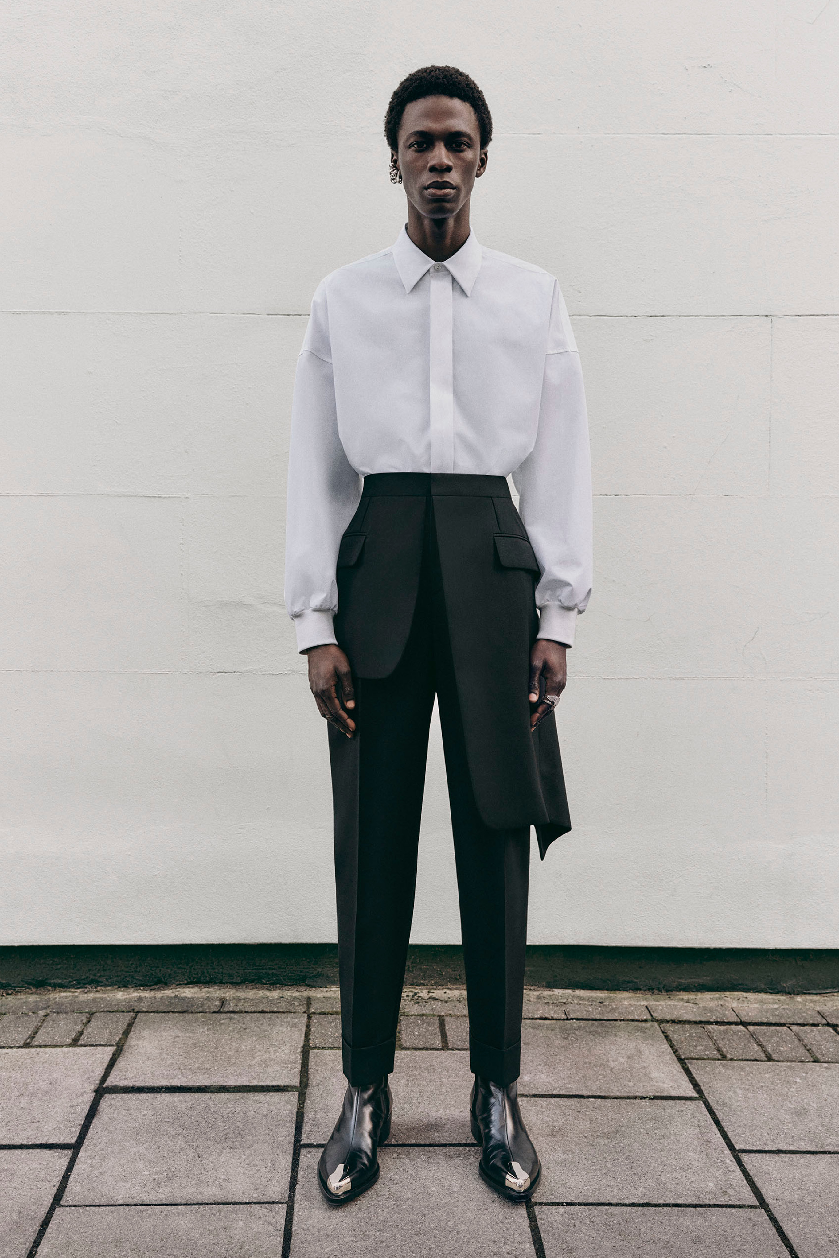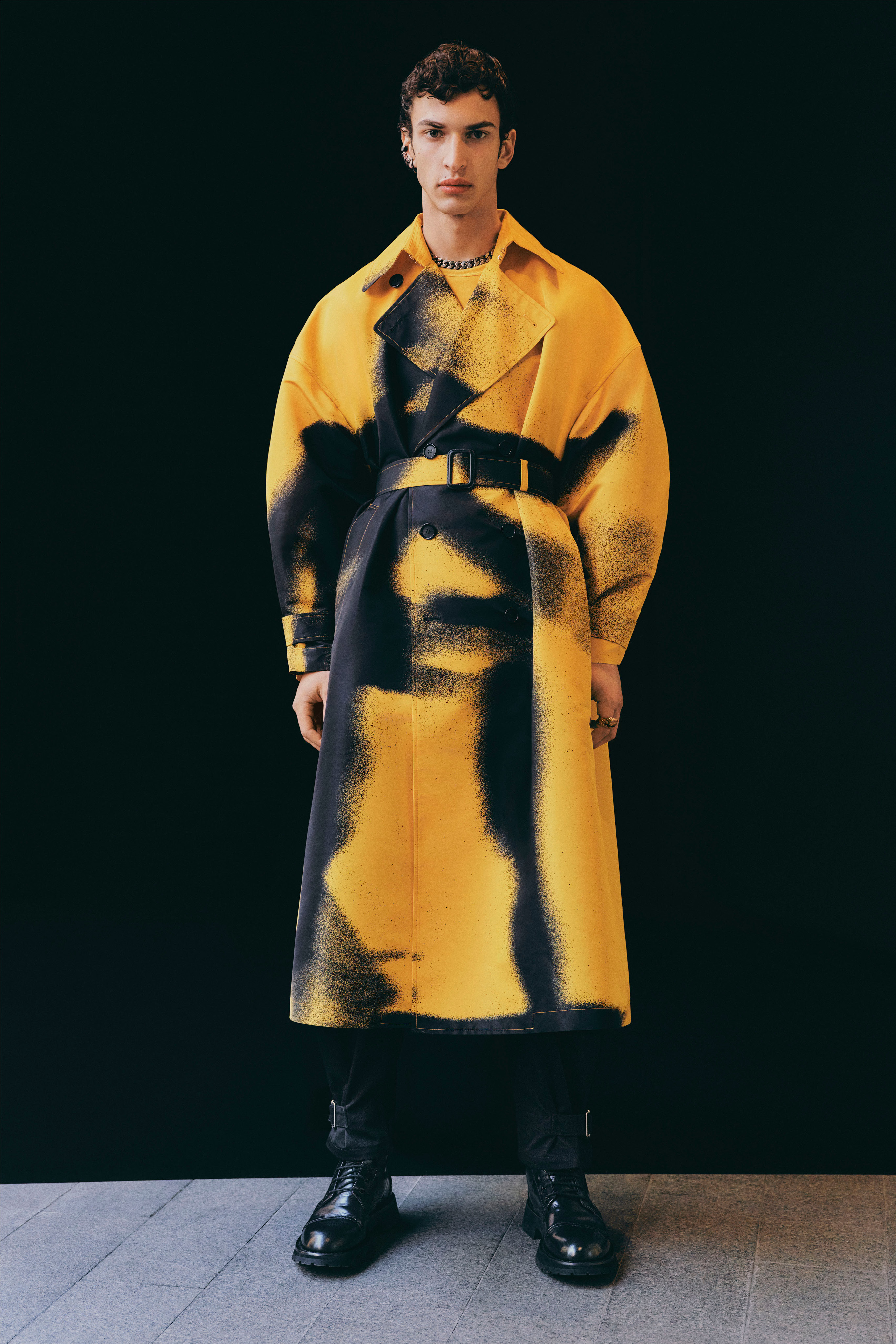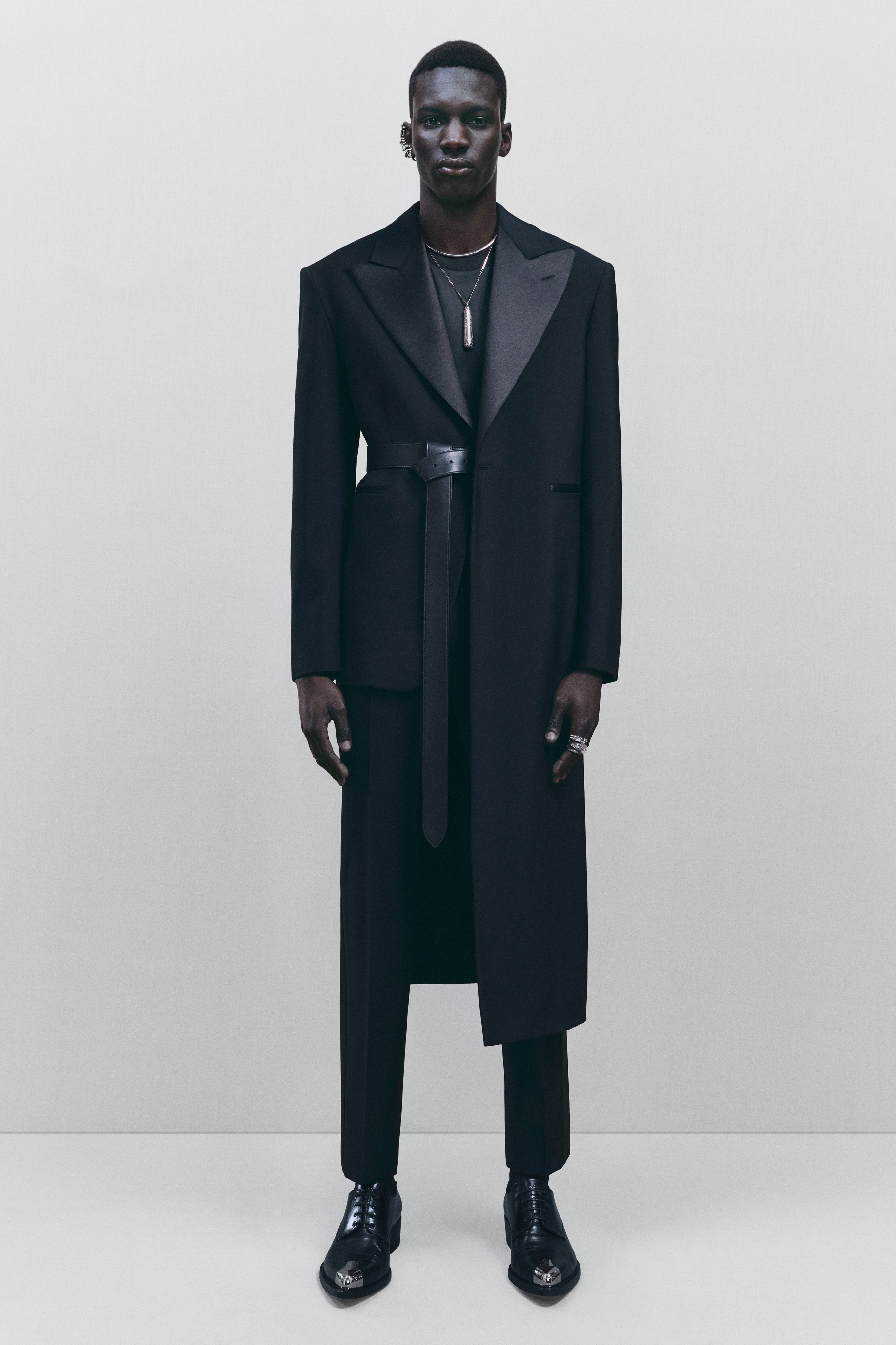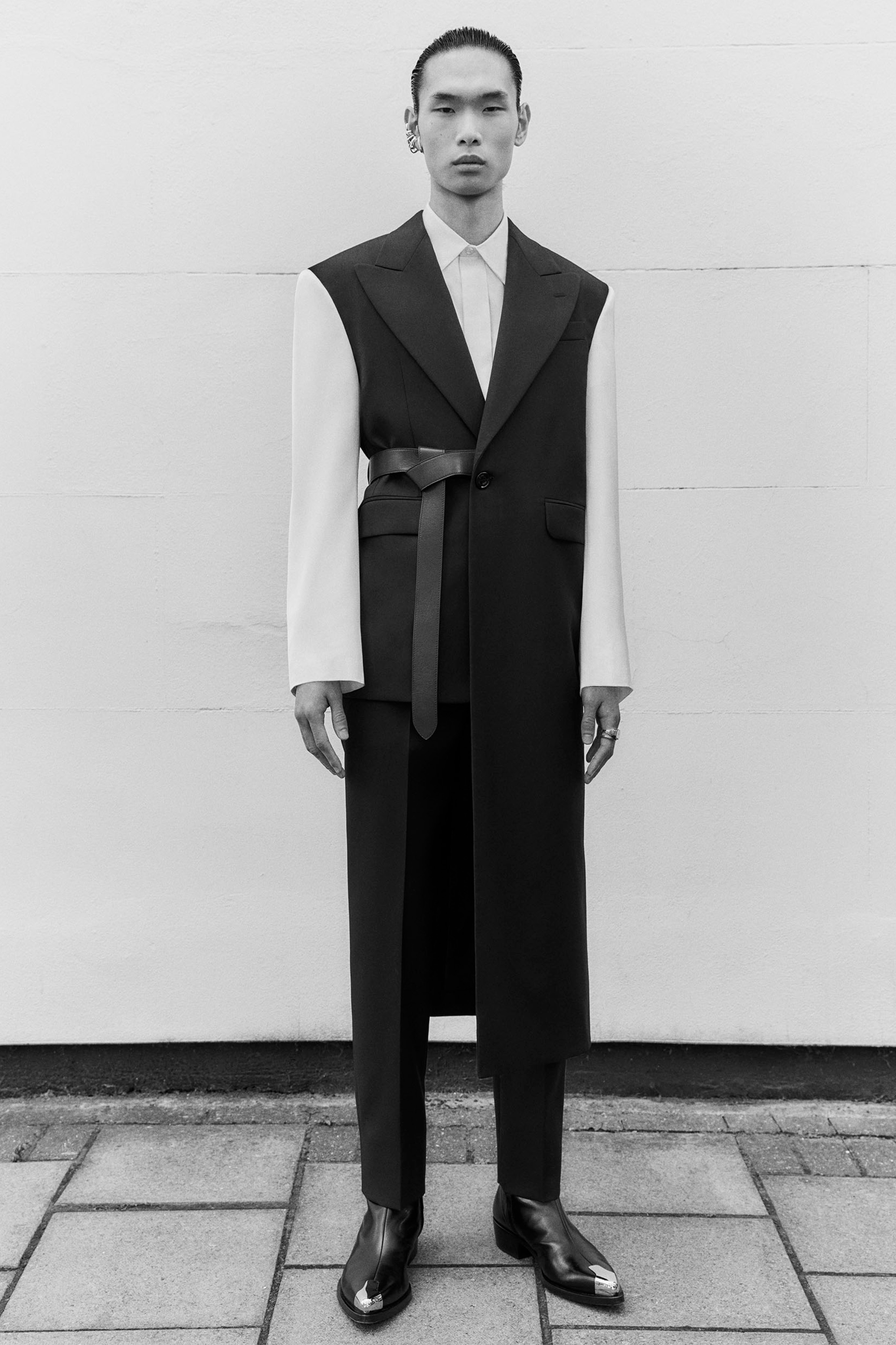 Closer to the earth. Grounded. References to early Alexander McQueen and to late Fifties and early Sixties Soho: looking to George Dyer and John Deakin. A focus on tailoring and silhouette: fitted, oversized and with asymmetric drape and detailing. Inside-out corsetry. Spray paint silhouette and graffiti prints. The initials of the studio team: a creative community, woven in thread.