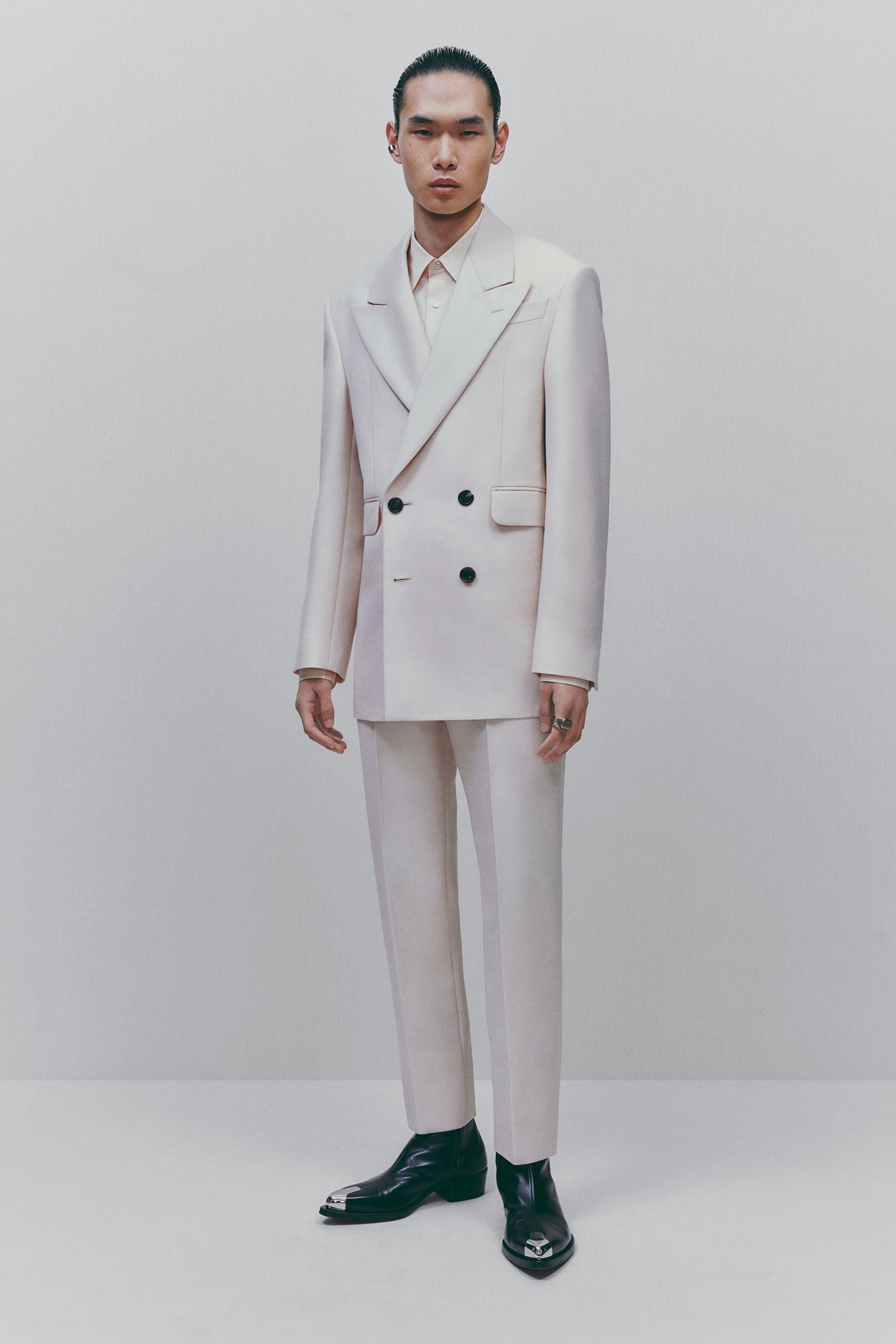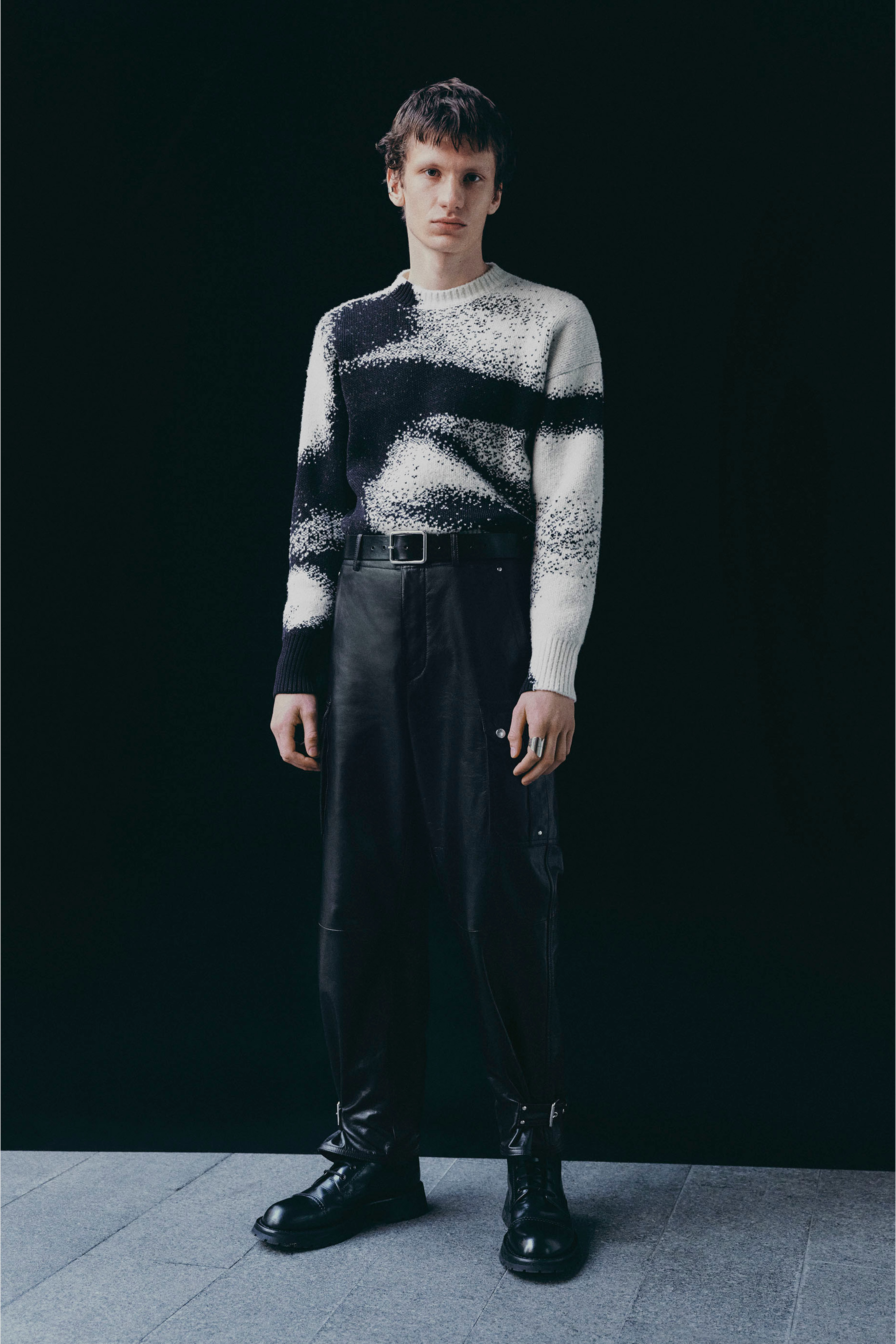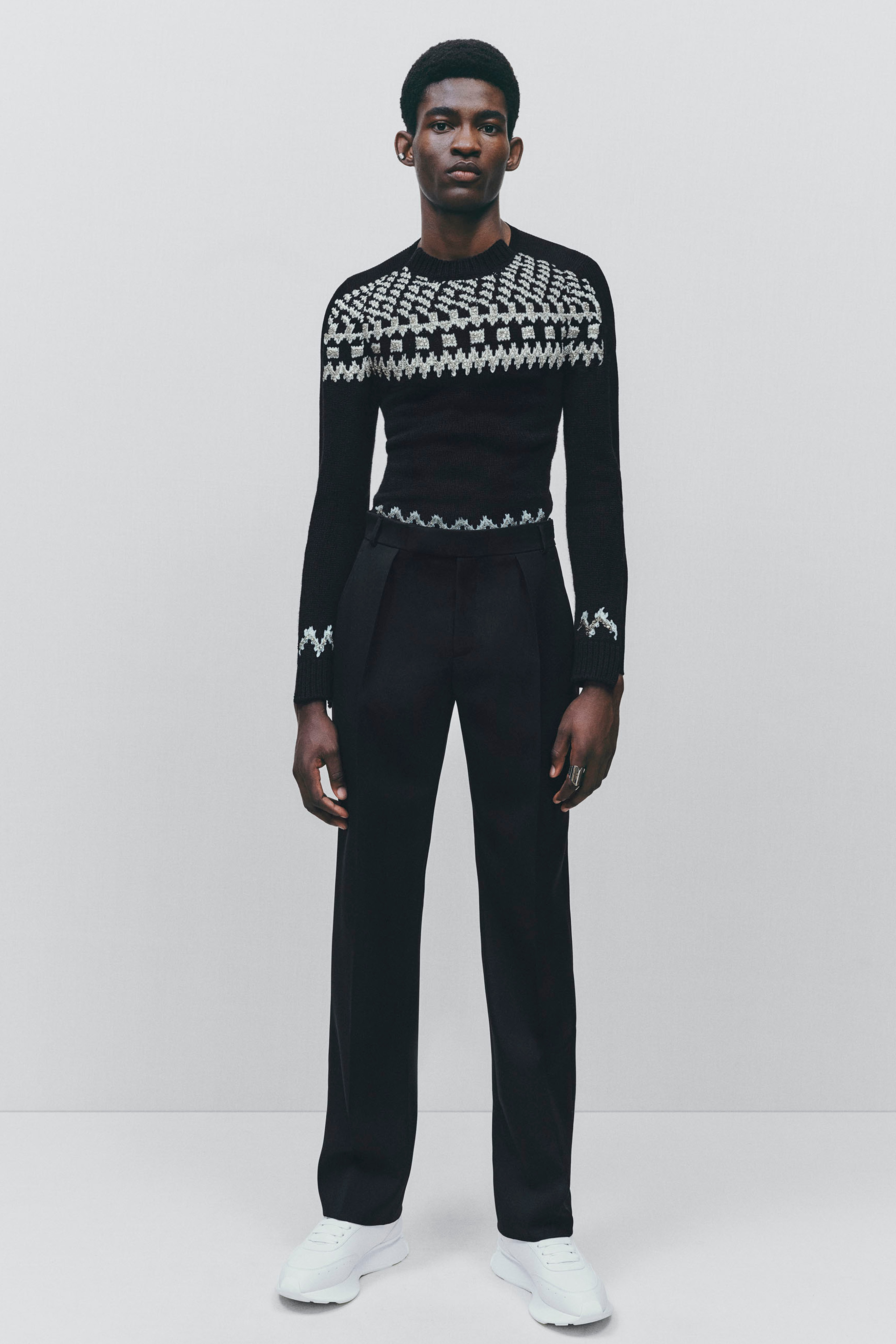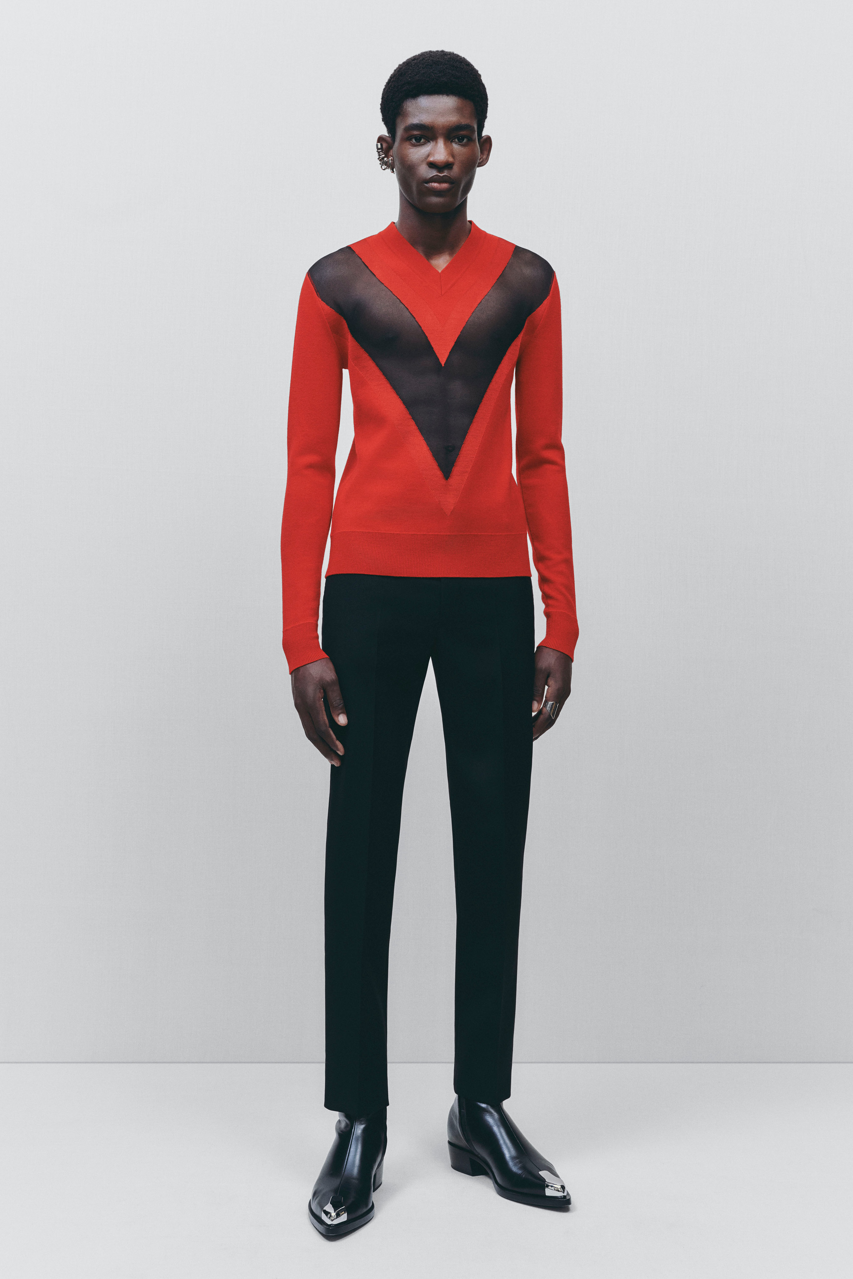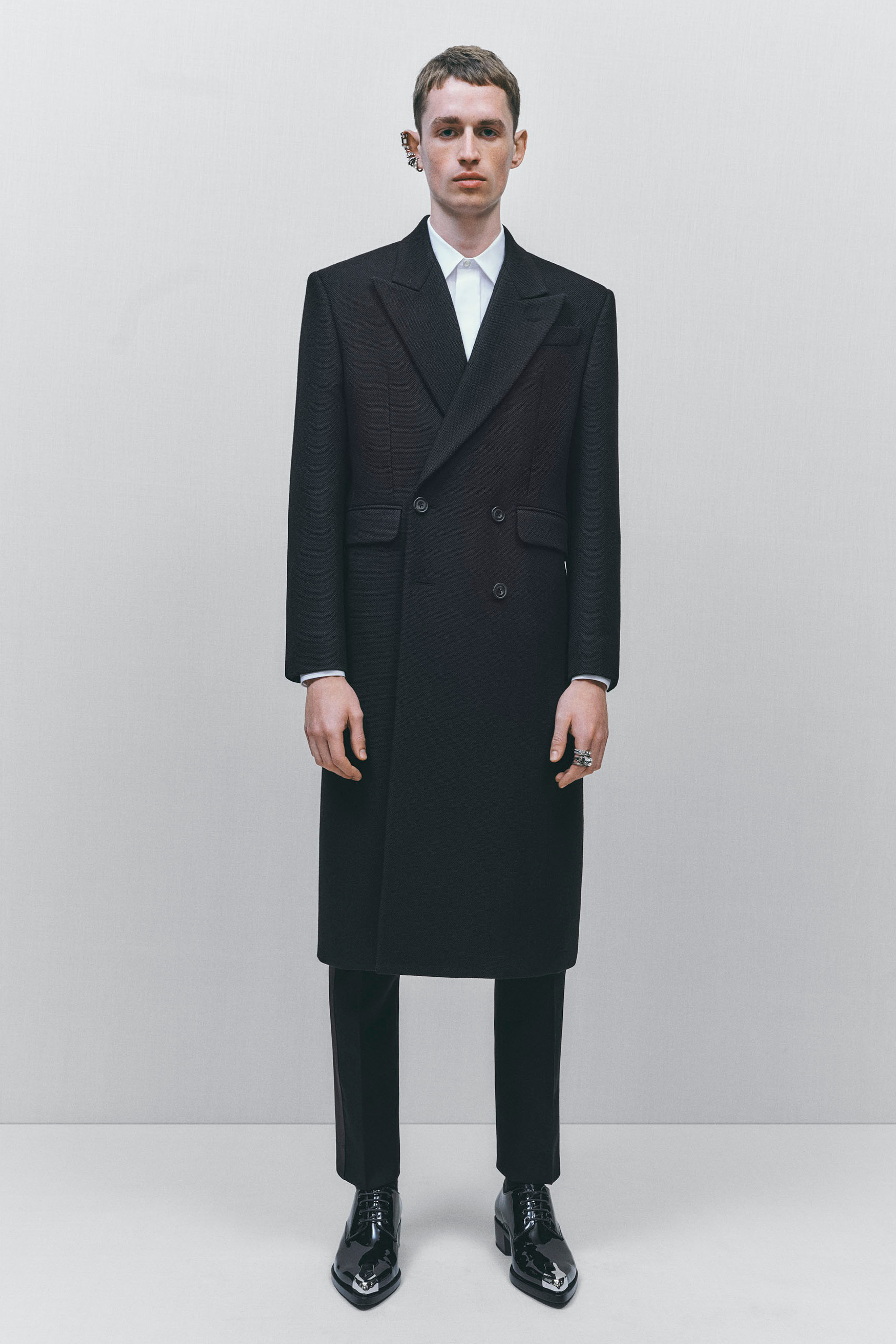 Closer to the earth. Grounded. References to early Alexander McQueen and to late Fifties and early Sixties Soho: looking to George Dyer and John Deakin. A focus on tailoring and silhouette: fitted, oversized and with asymmetric drape and detailing. Inside-out corsetry. Spray paint silhouette and graffiti prints. The initials of the studio team: a creative community, woven in thread.