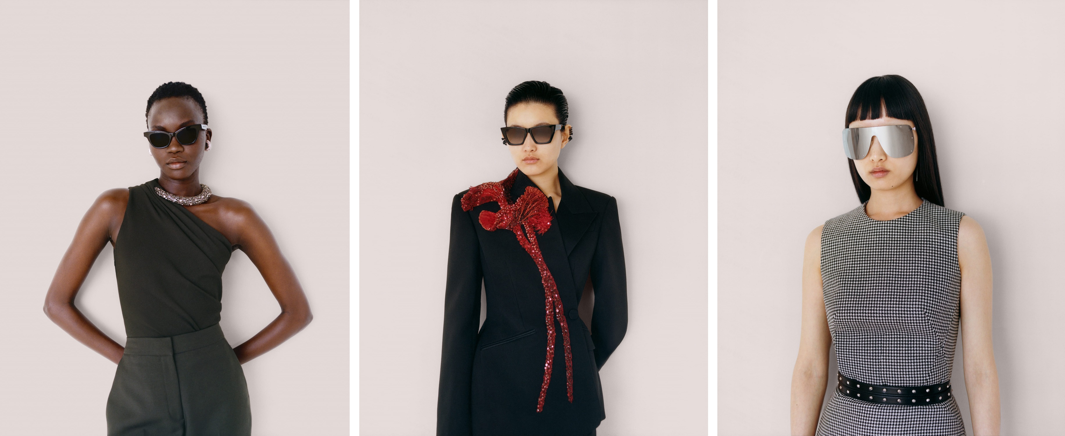 New for Autumn/Winter 2022 are Angled sunglasses, with a curved cat-eye silhouette and tone on tone logo as a subtle signature. Selvedge Cat-Eye sunglasses, a more square, similarly bold variation on a similar theme is continued. From the same, youthful family is the Selvedge Mask - a larger rectangular design in bi-colour acetate. In black acetate again as well as pale pink and dove grey - are Seal Logo sunglasses with the Alexander McQueen seal finishing both temples in metal.