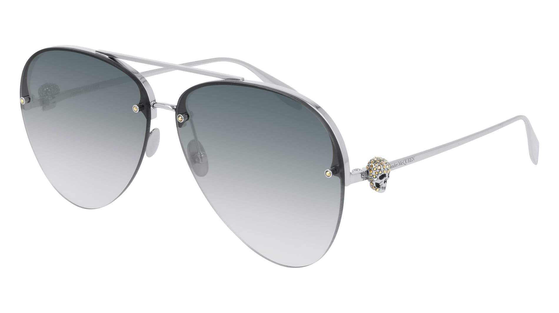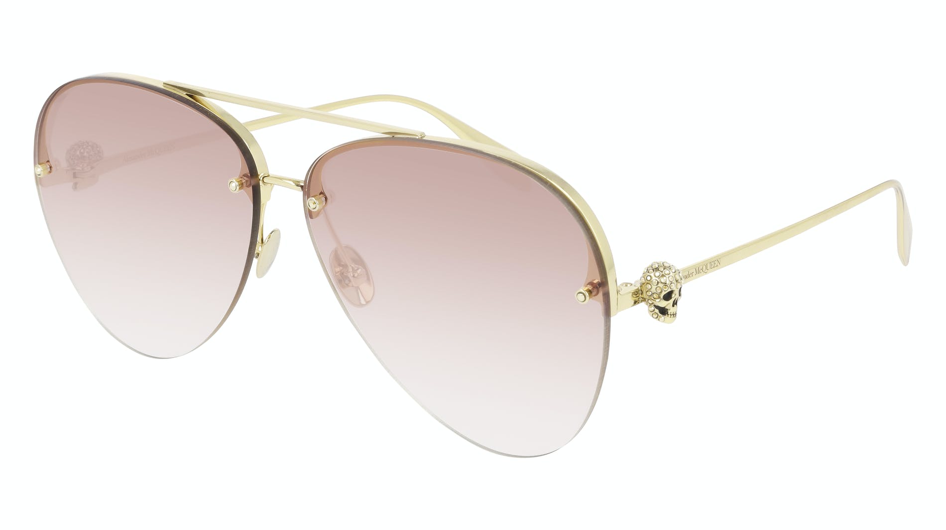 This masculine navigator shape has a double bridge detail and a striking front design with a metal structure visible through the lens. It further features the Alexander McQueen logo engraved on both temples.