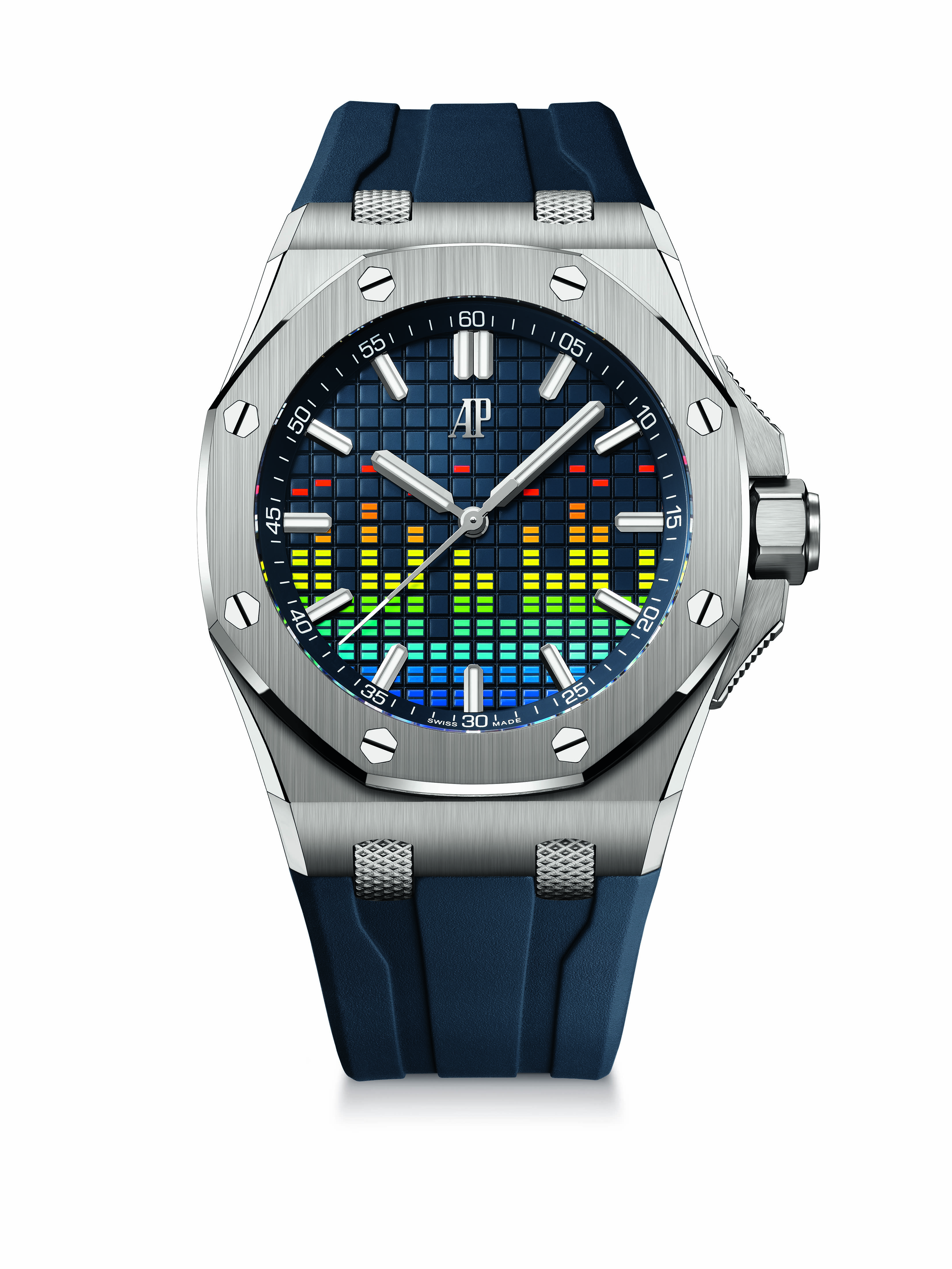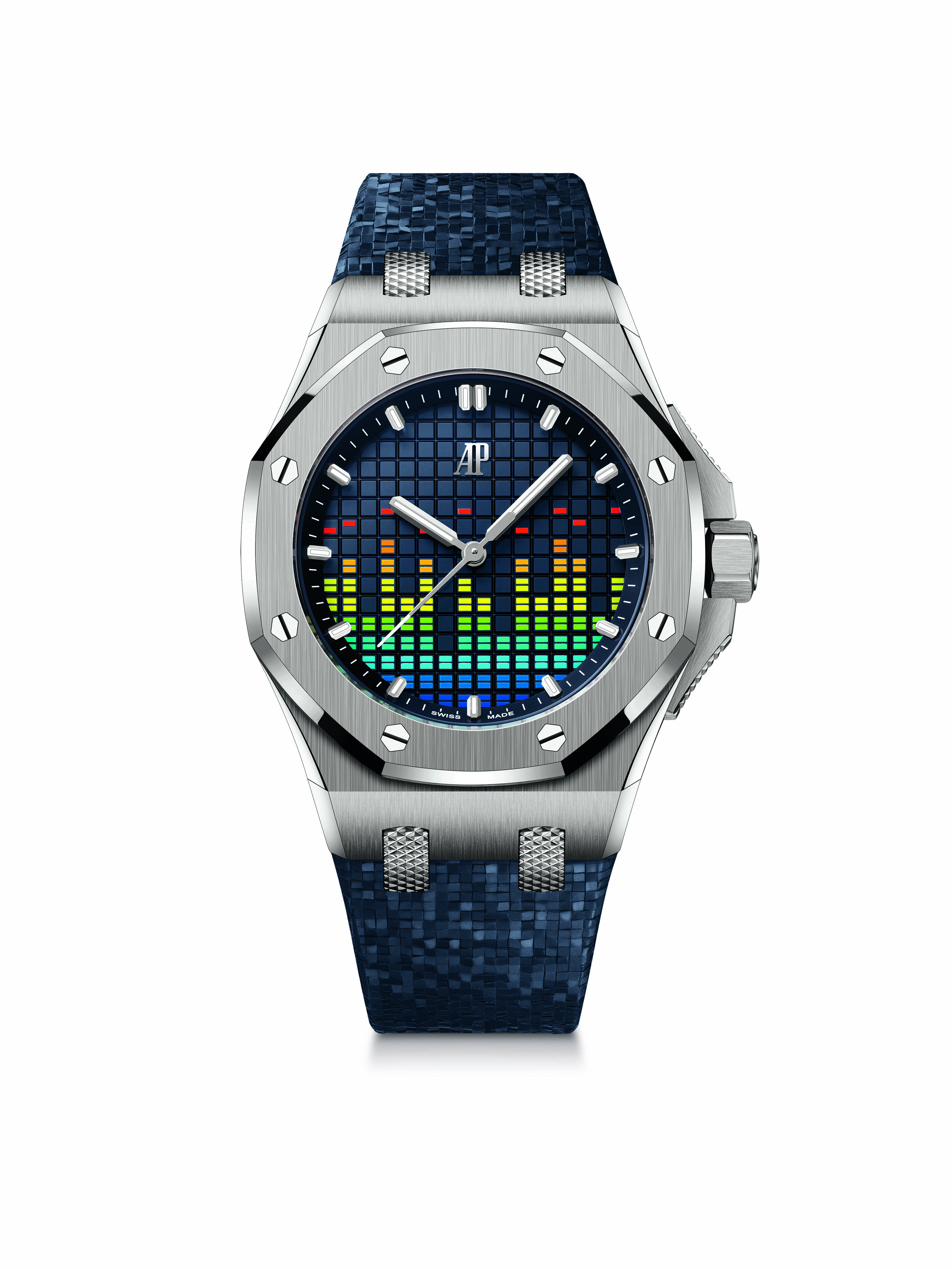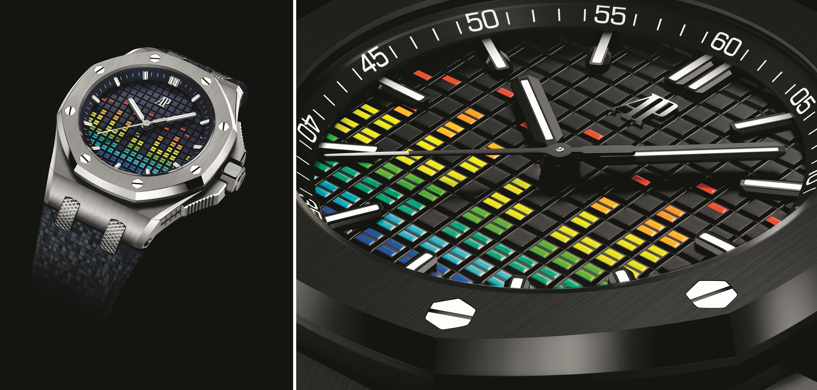 Today, the new Royal Oak Offshore models celebrate this long-standing relationship: a Tapisserie dial reproducing the motifs of an equaliser, knurled-textured studs reminiscent of jack plugs and crown guards inspired by the fader on mixing consoles. Featuring a sapphire crystal curved along the 6 to 12 o’clock axis as well as enlarged bevels, these selfwinding hours, minutes and seconds models radiate a colourful, pop-style appearance.