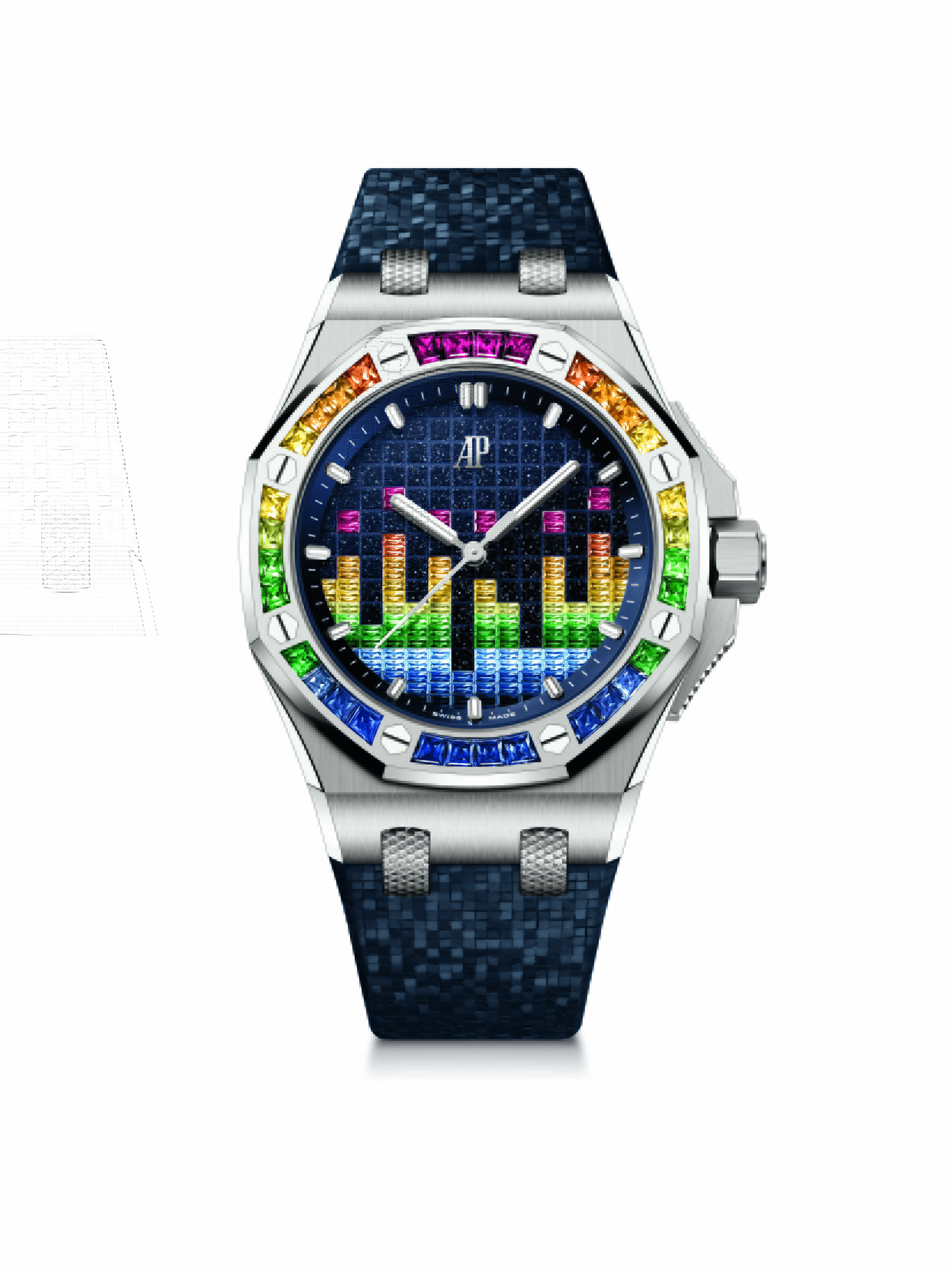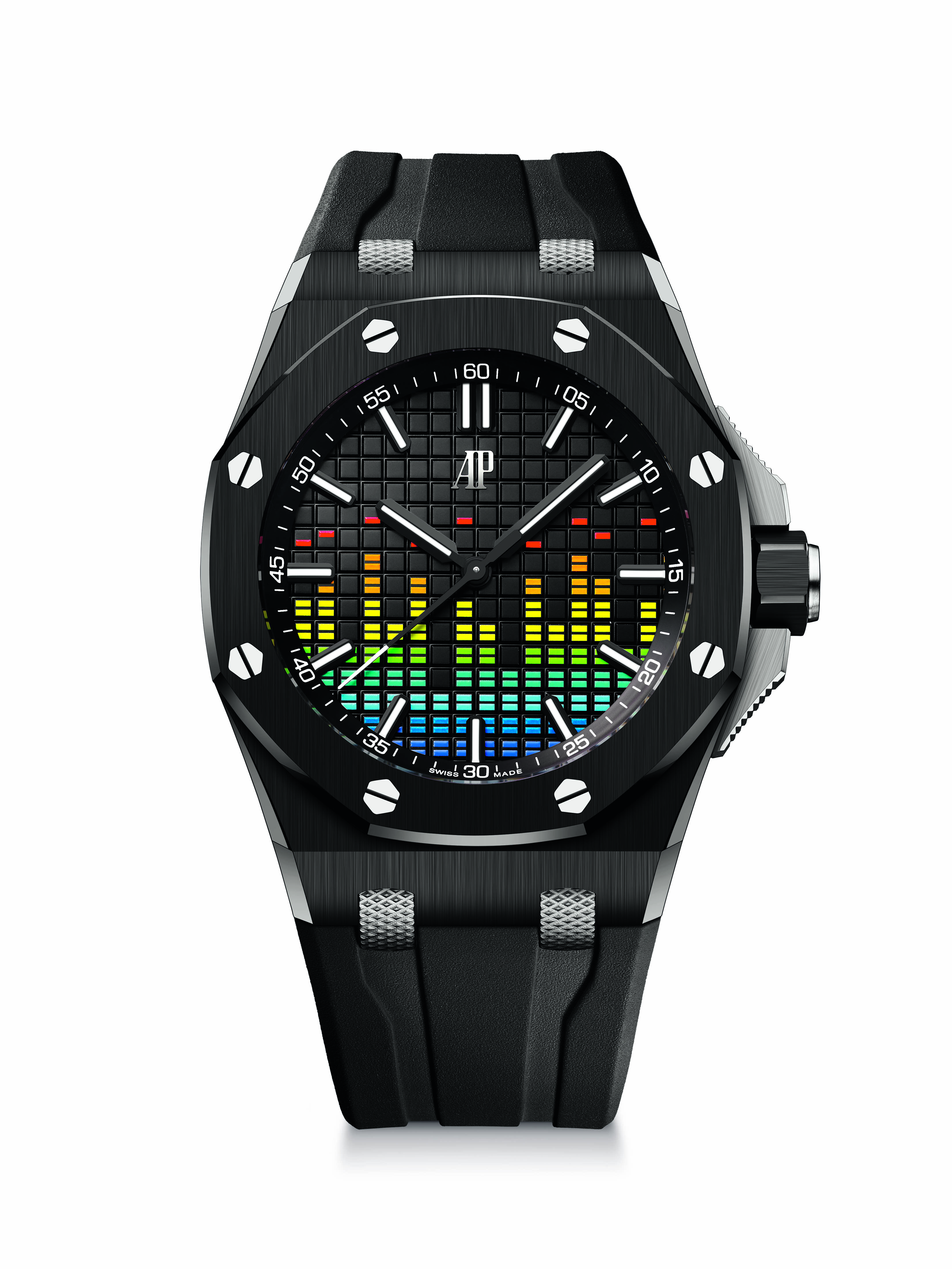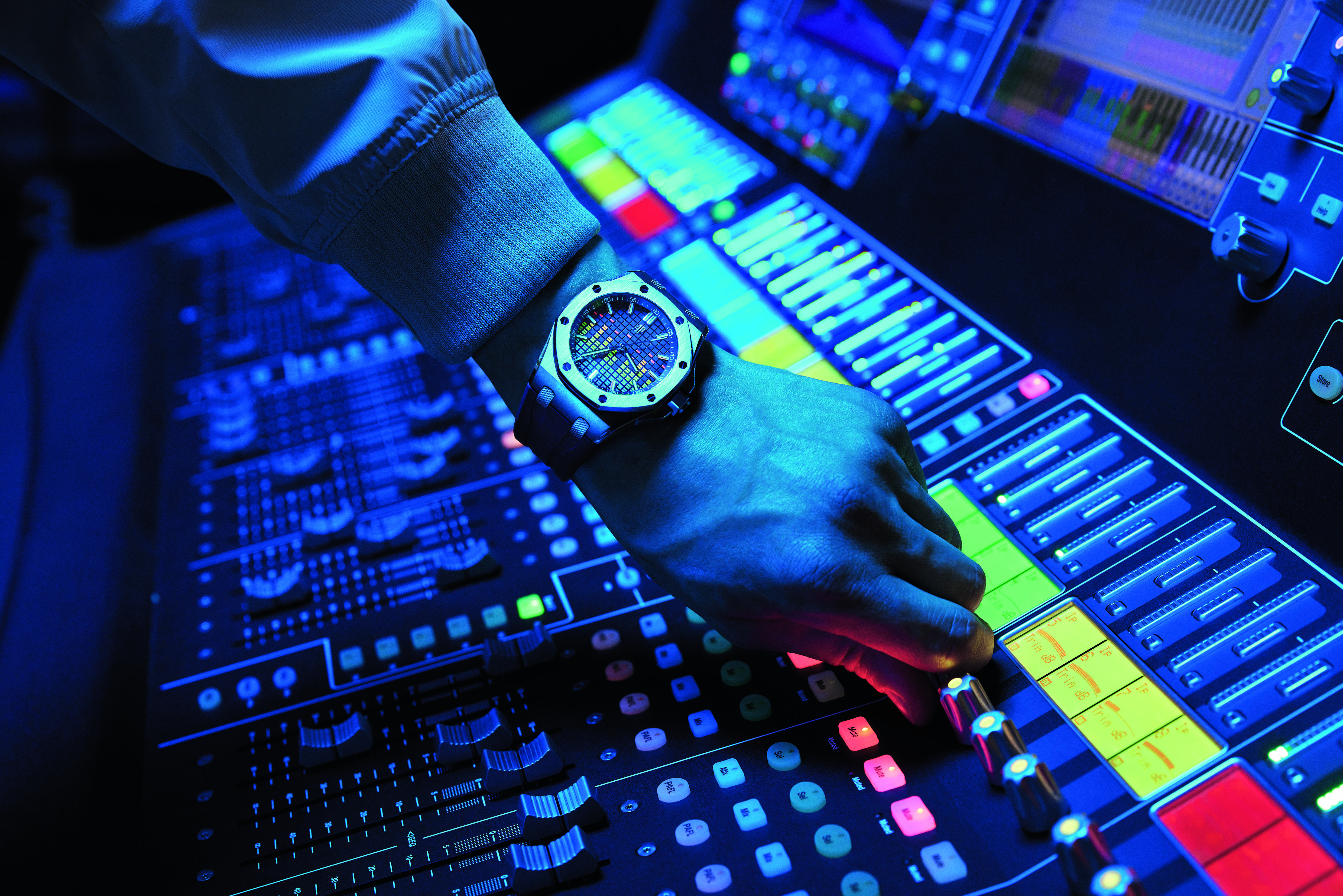 Today, the new Royal Oak Offshore models celebrate this long-standing relationship: a Tapisserie dial reproducing the motifs of an equaliser, knurled-textured studs reminiscent of jack plugs and crown guards inspired by the fader on mixing consoles. Featuring a sapphire crystal curved along the 6 to 12 o’clock axis as well as enlarged bevels, these selfwinding hours, minutes and seconds models radiate a colourful, pop-style appearance.