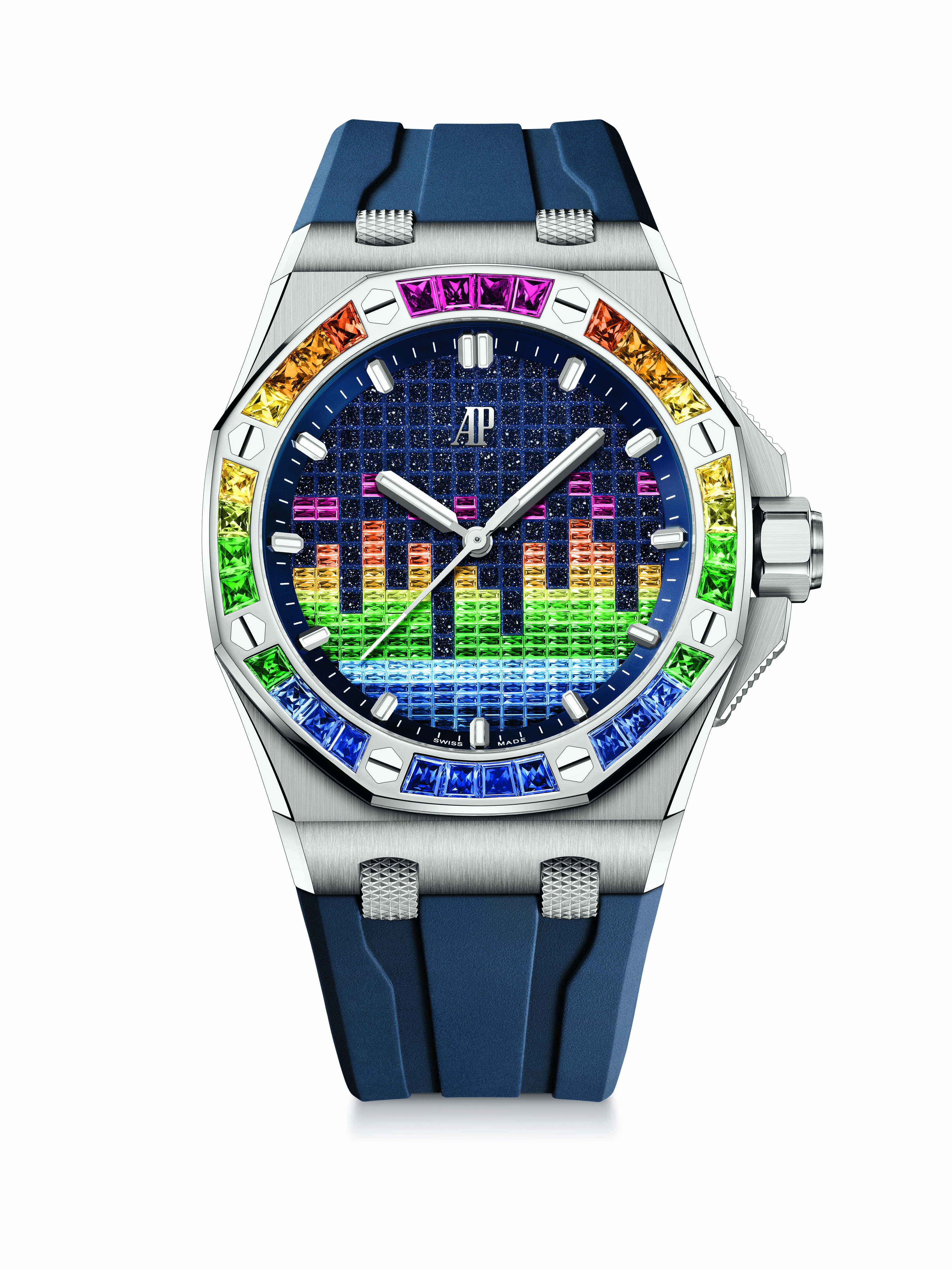 The 37 mm reference is adorned with 166 stones totalling ~3.7 carats, while the 43 mm variant sparkles with 230 stones totalling ~6.15 carats. Like the titanium models, these two references feature the polished AP monogram at 12 o’clock as well as 18-carat white gold hour-markers and hands. They are completed by a blue interchangeable strap – with a “mosaic effect” motif for the 37 mm reference – and come with three additional rubber straps in turquoise, yellow and green.
