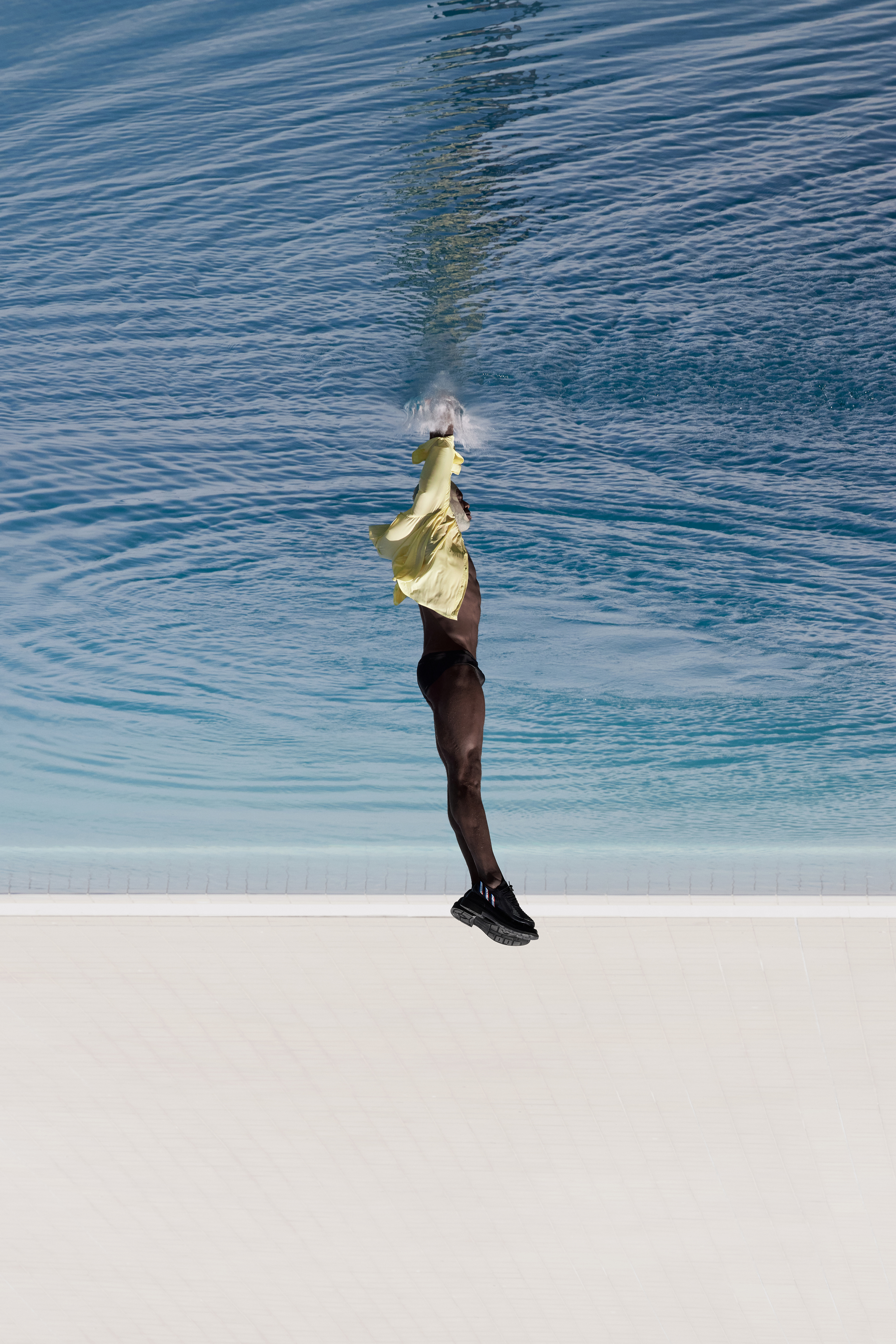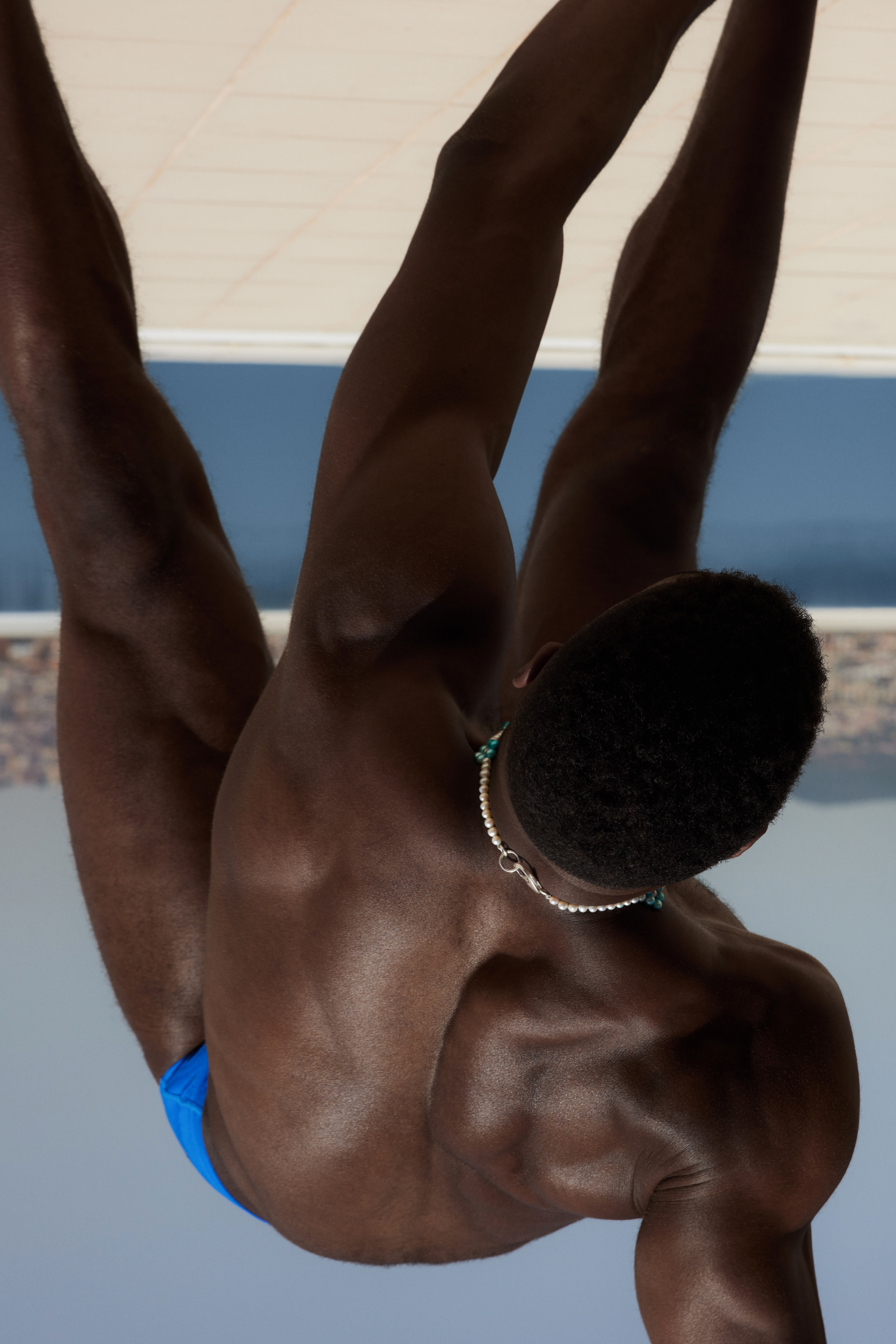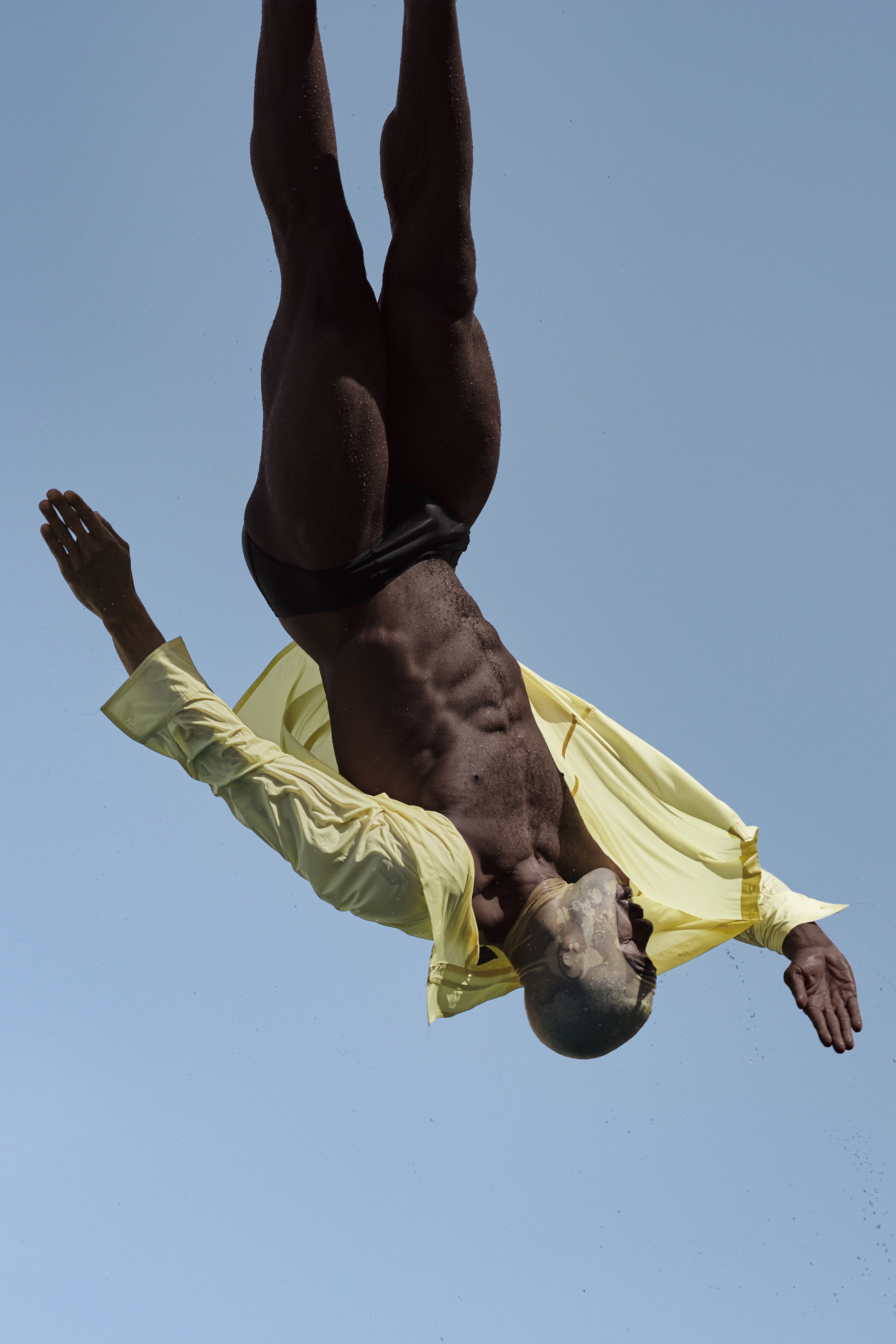 Pride of our caribbean DNA is central to us and therefore THE DIVE features and celebrates Yona Knight-Wisdom, the first Jamaican platform diver to compete in an olympic game. Yona's mastery of his craft conveys the beauty of a sport that uses the human body artistically as a canvas for expression. There lies the natural connection to fashion and what draws us together. As a fashion house, our work and our art come to life through the human body.