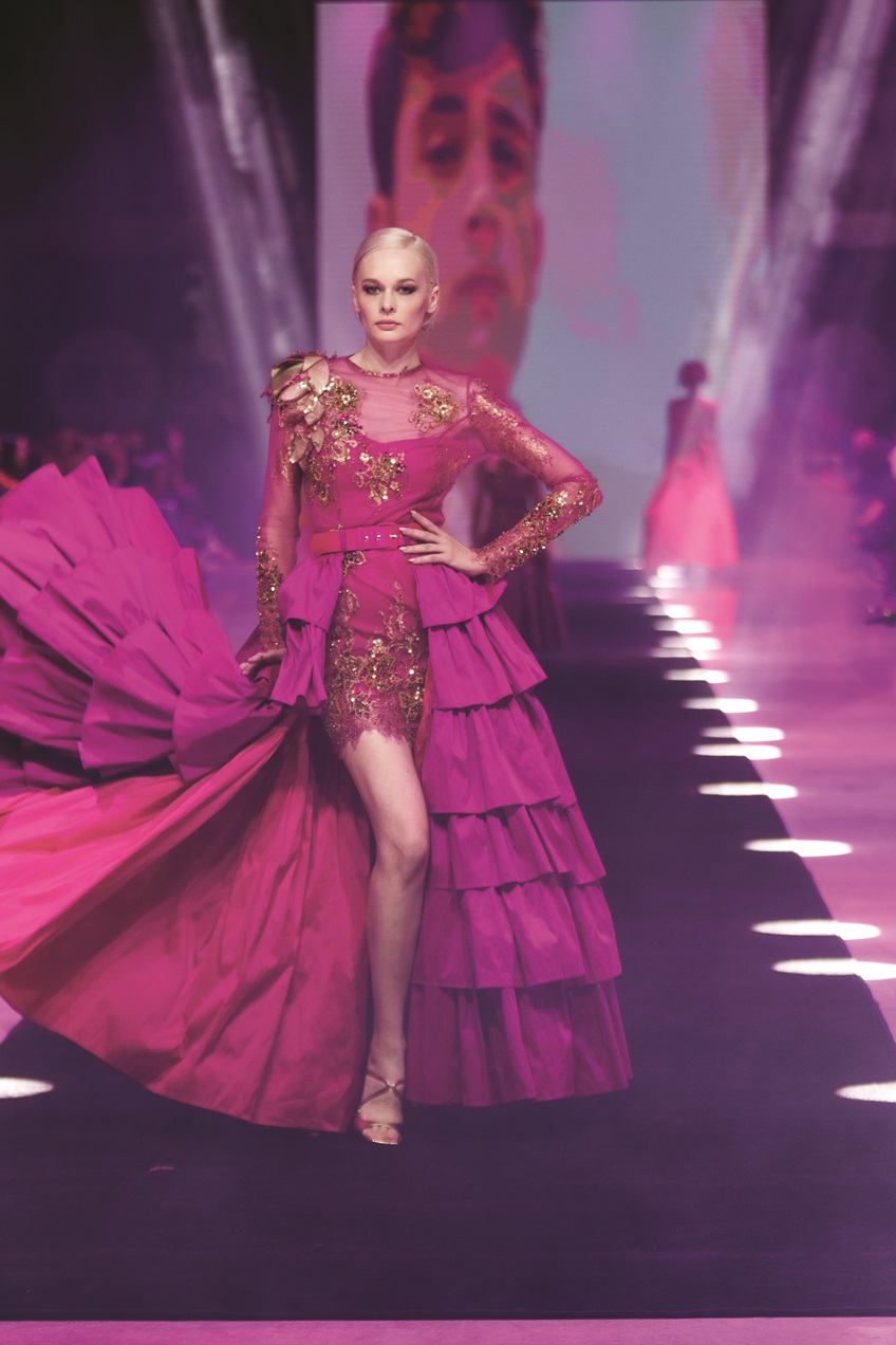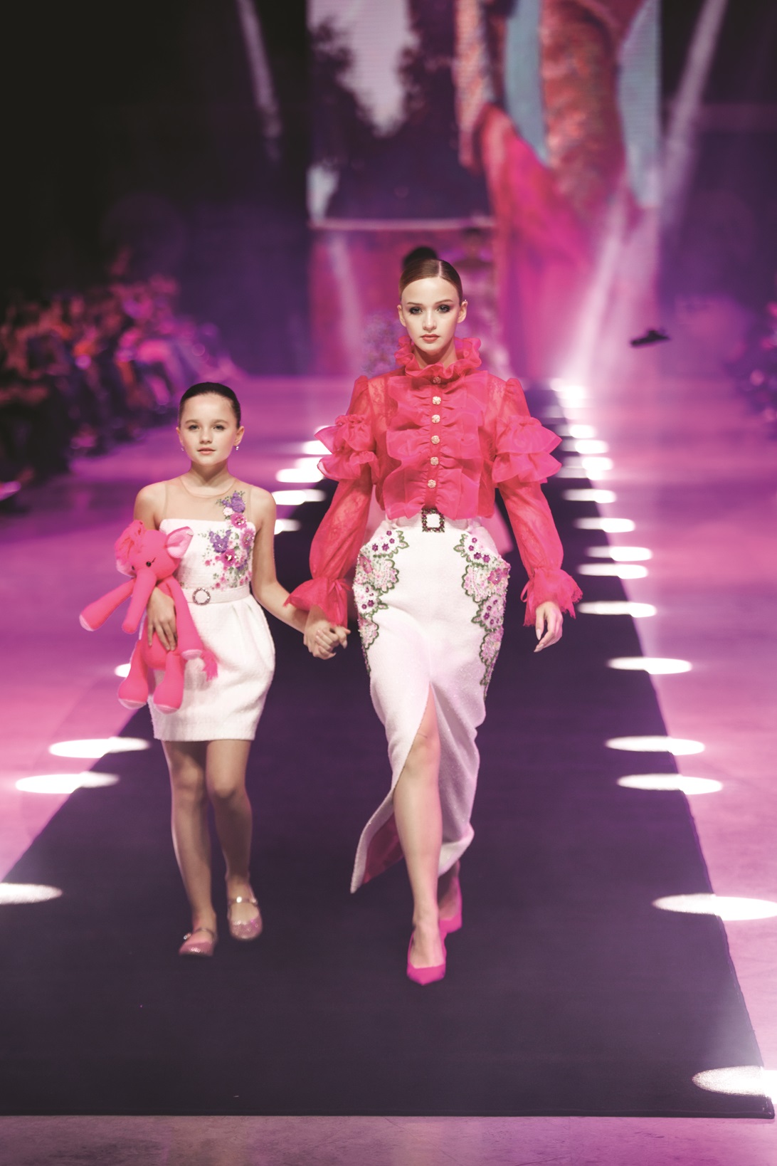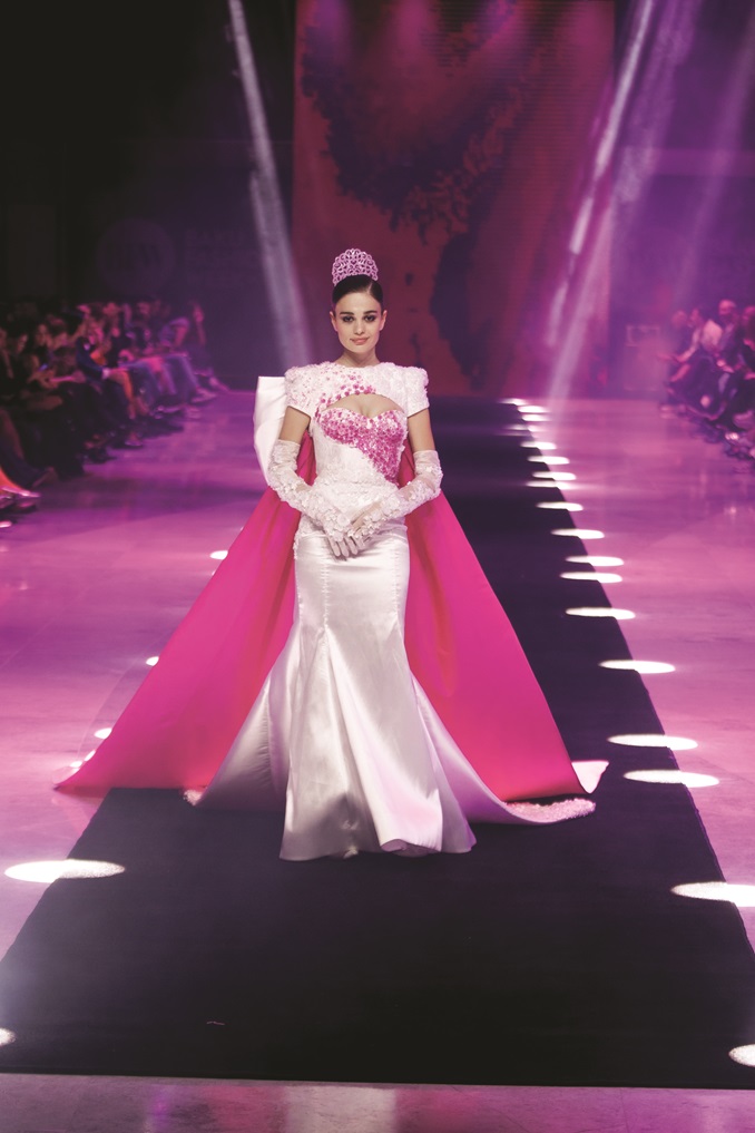The day's finale featured a presentation by specially invited Georgian designer Datuna, with a collection dominated by black and pink, adorned with abundant decorative elements and featuring local stars alongside professional models.