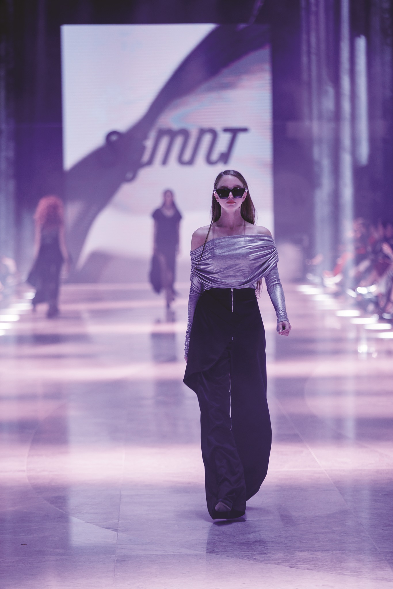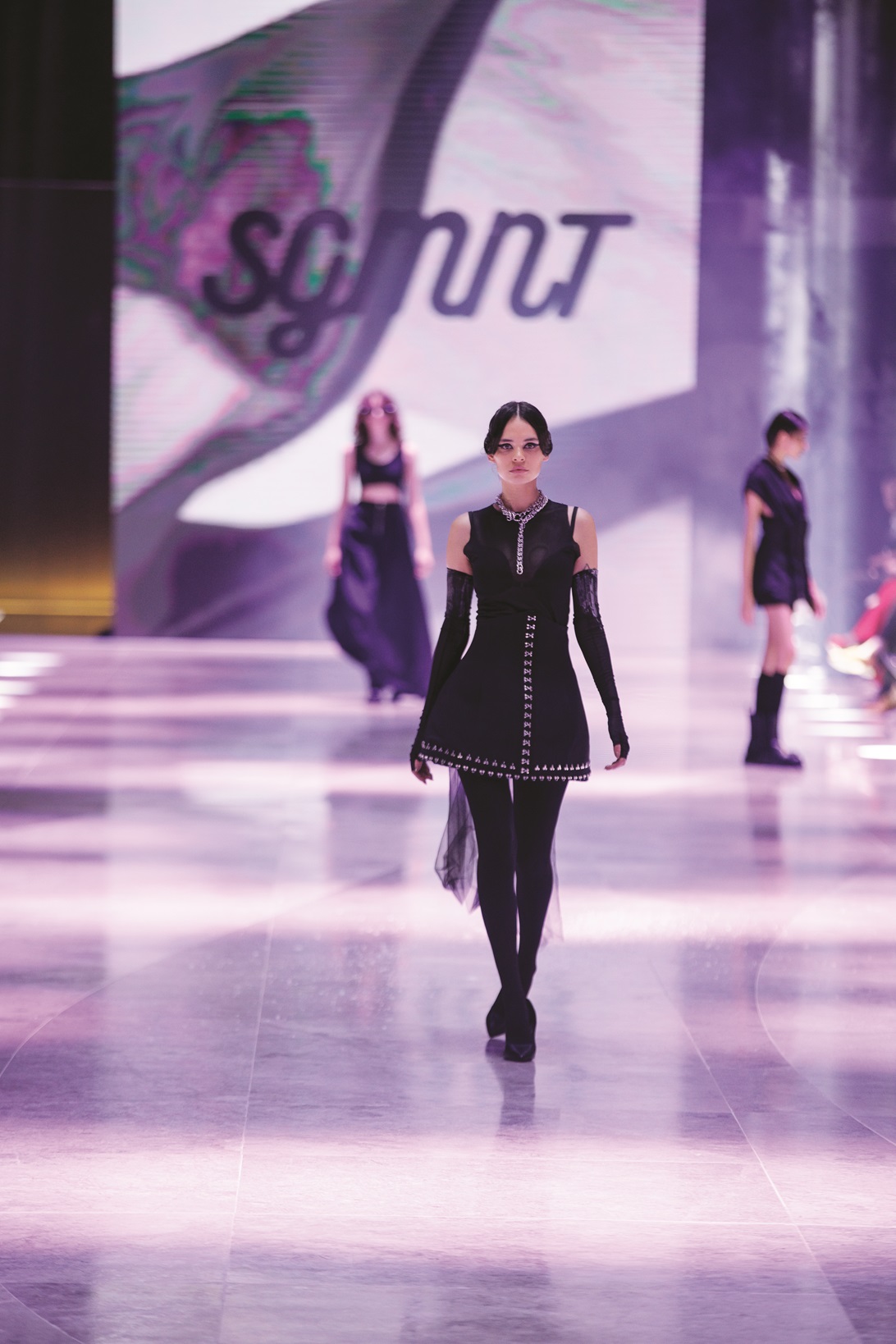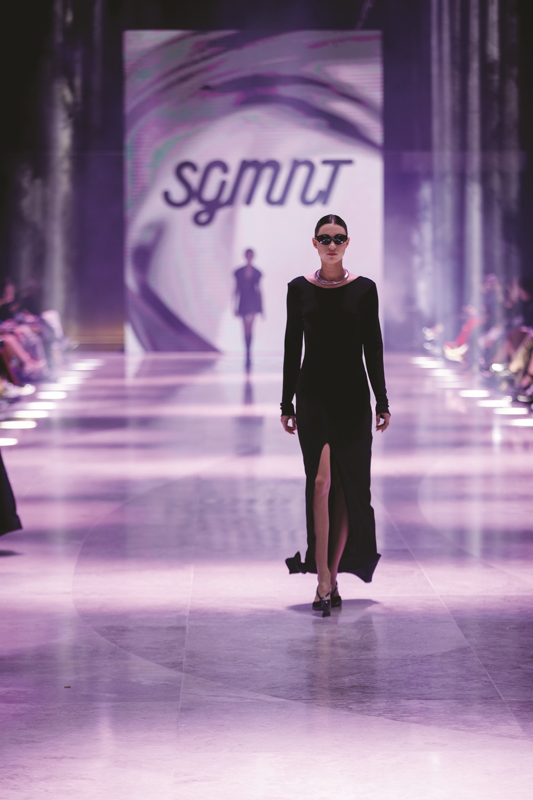 Azerbaijani brand SGMNT presented the "RE-birth" collection, celebrating the modern woman's unique style inspired by strength and a subtle inner world, featuring a color palette of black and metallic tones.