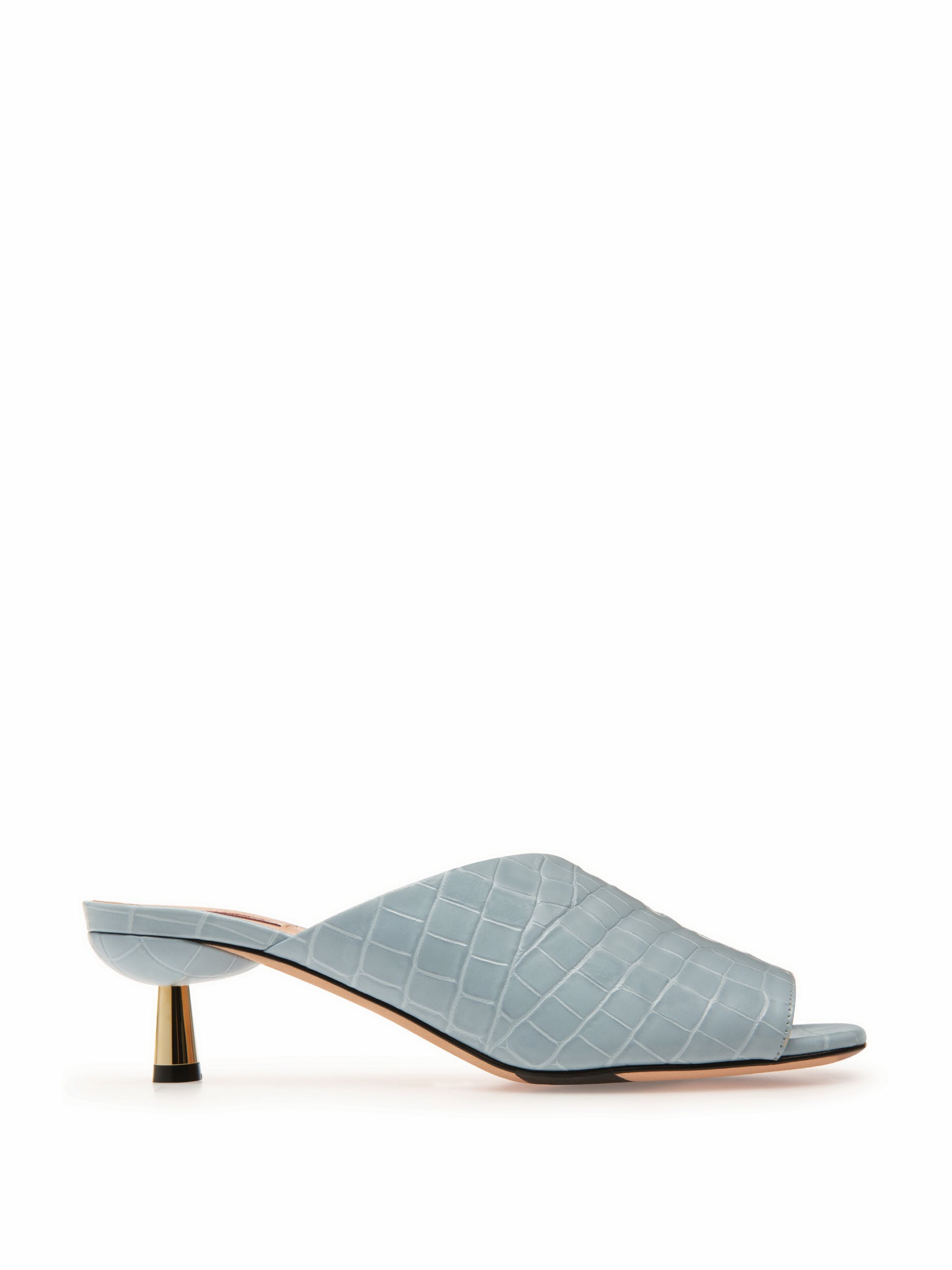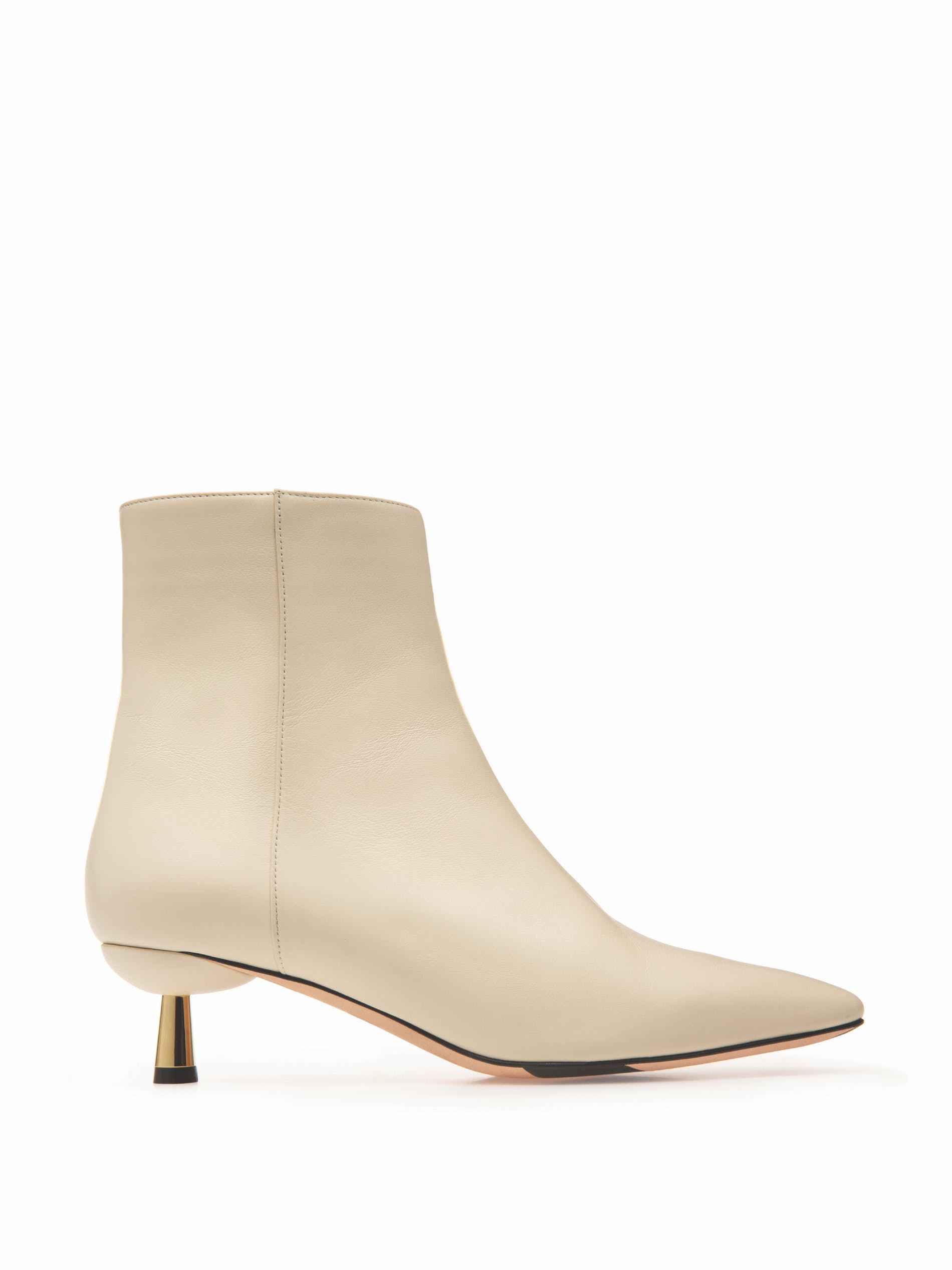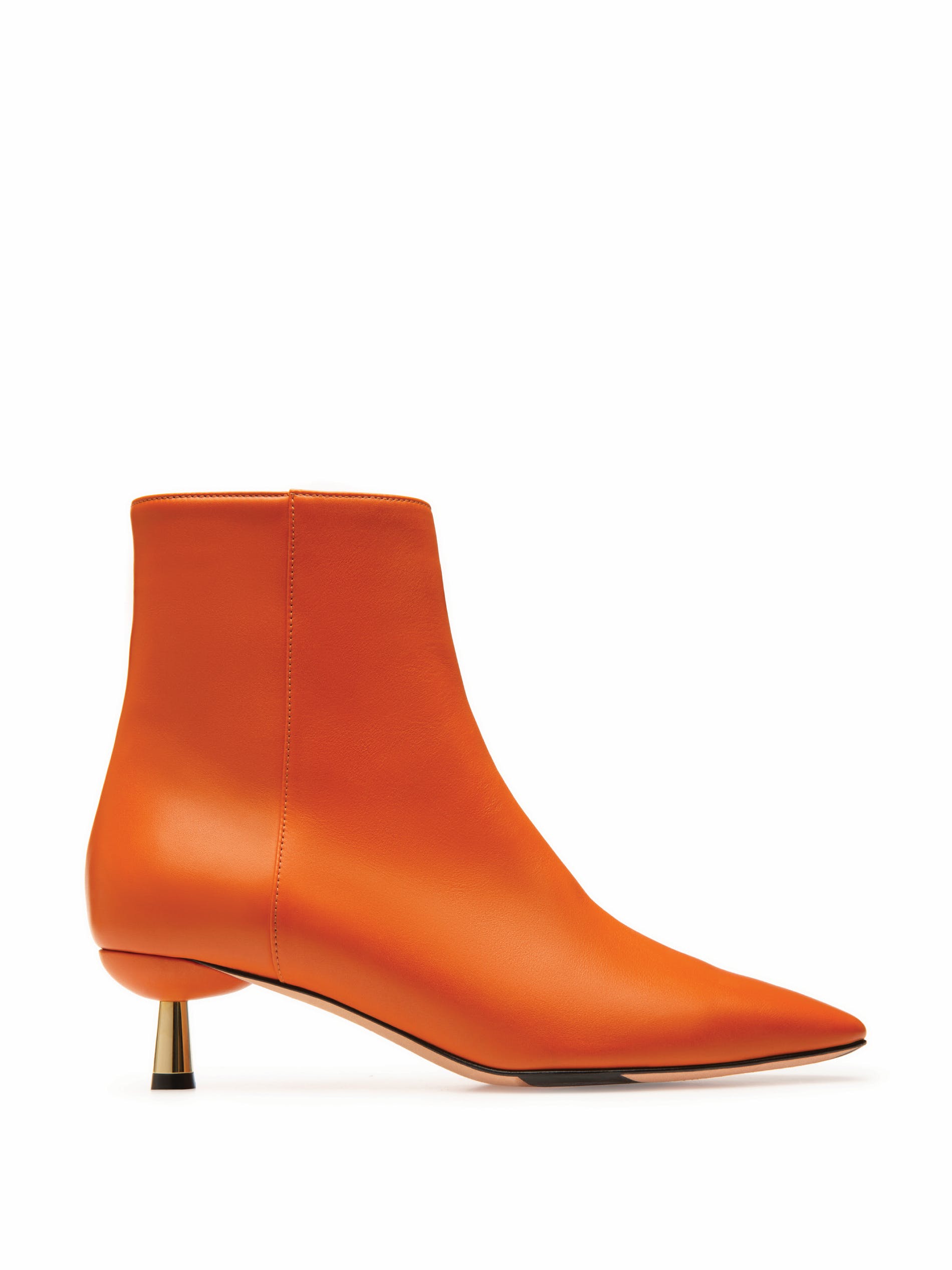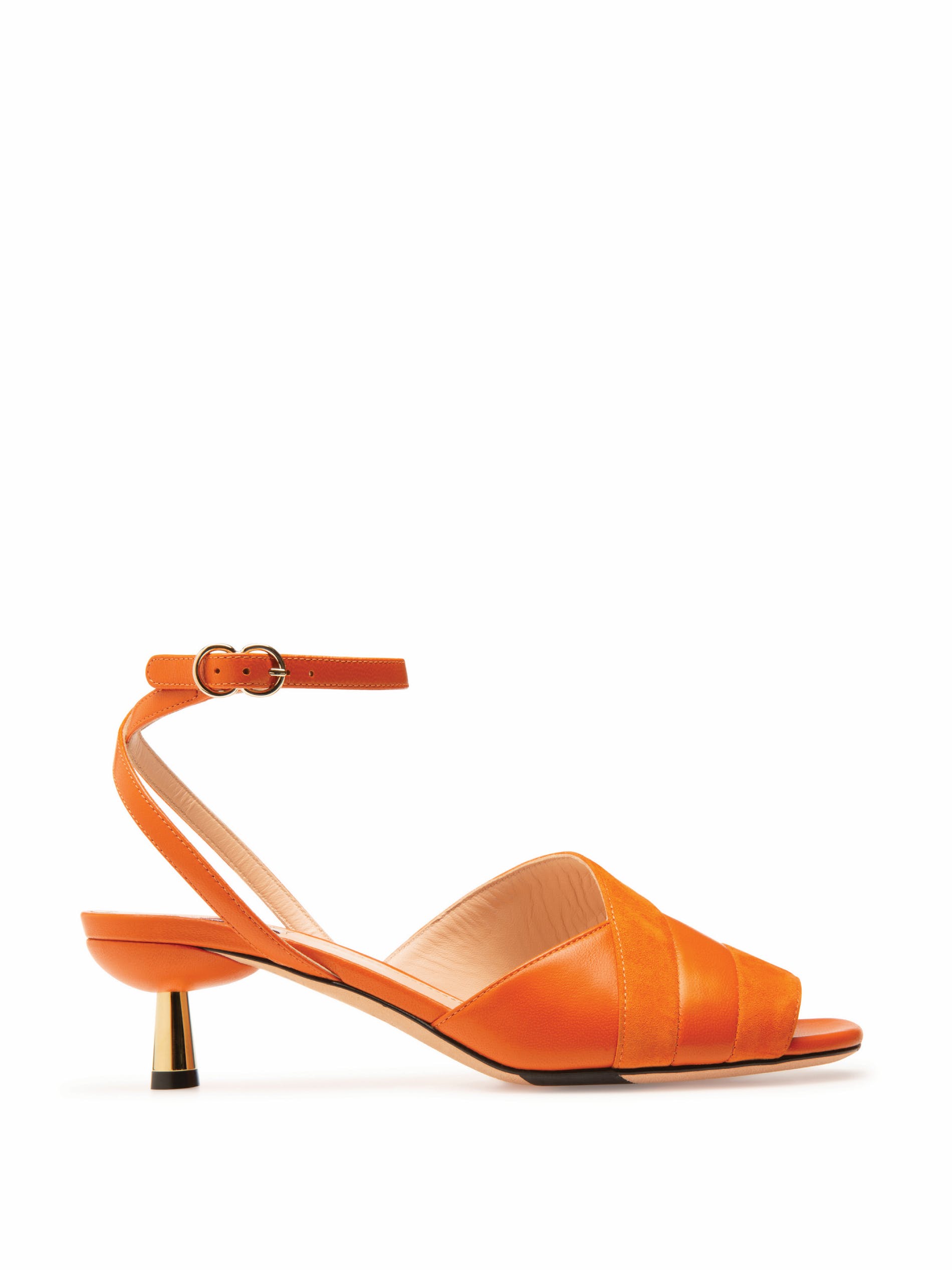 Boasting a structural chisel toe and a metallic golden kitten heel, directly inspired by a 1960’s style from the Bally archive, the Callie is available in mandarin orange, seashell blue and classic colours like black, bone and white.