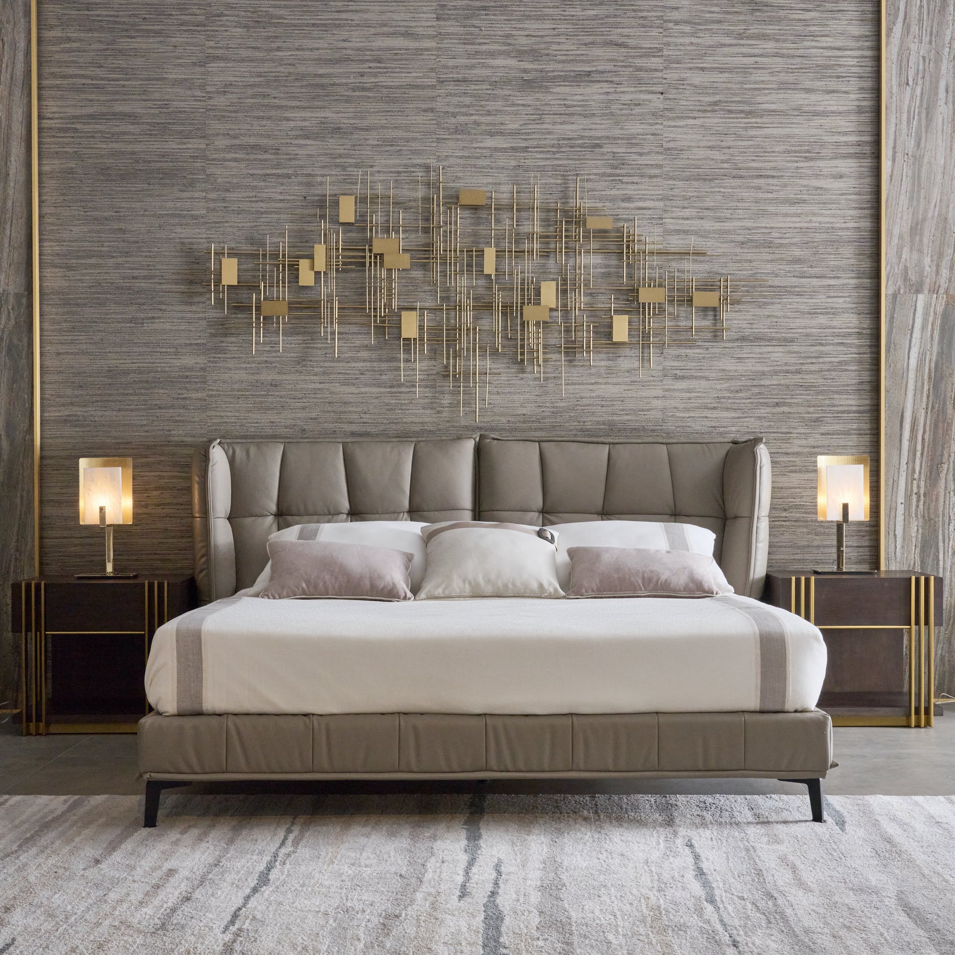 A space filled with cream and brown, the ultimate elegance for a luxurious night sleep. Add a gold backdrop statement piece and mix up textured fabrics through cushions and throw blankets for a blissful sleep experience.