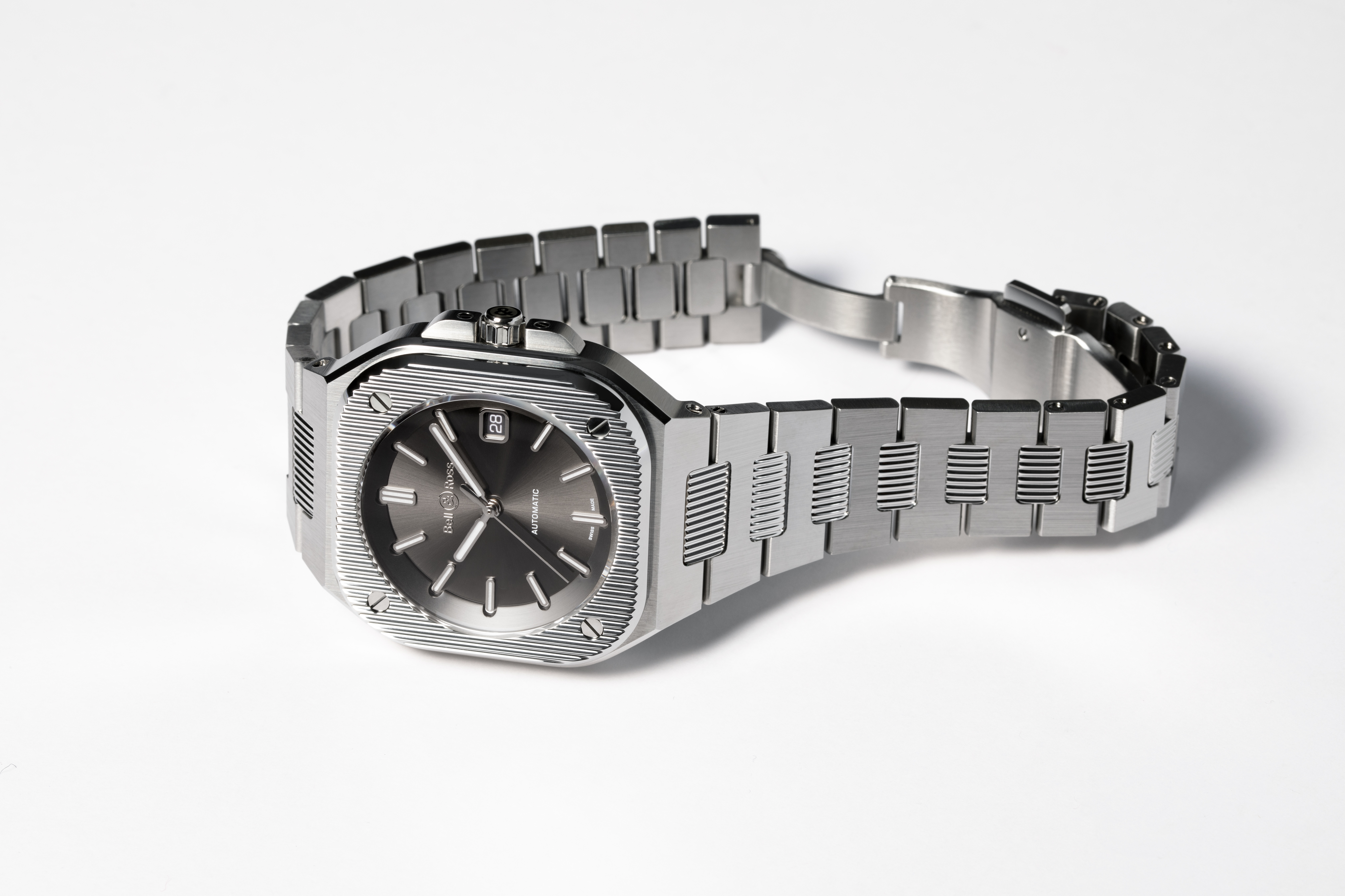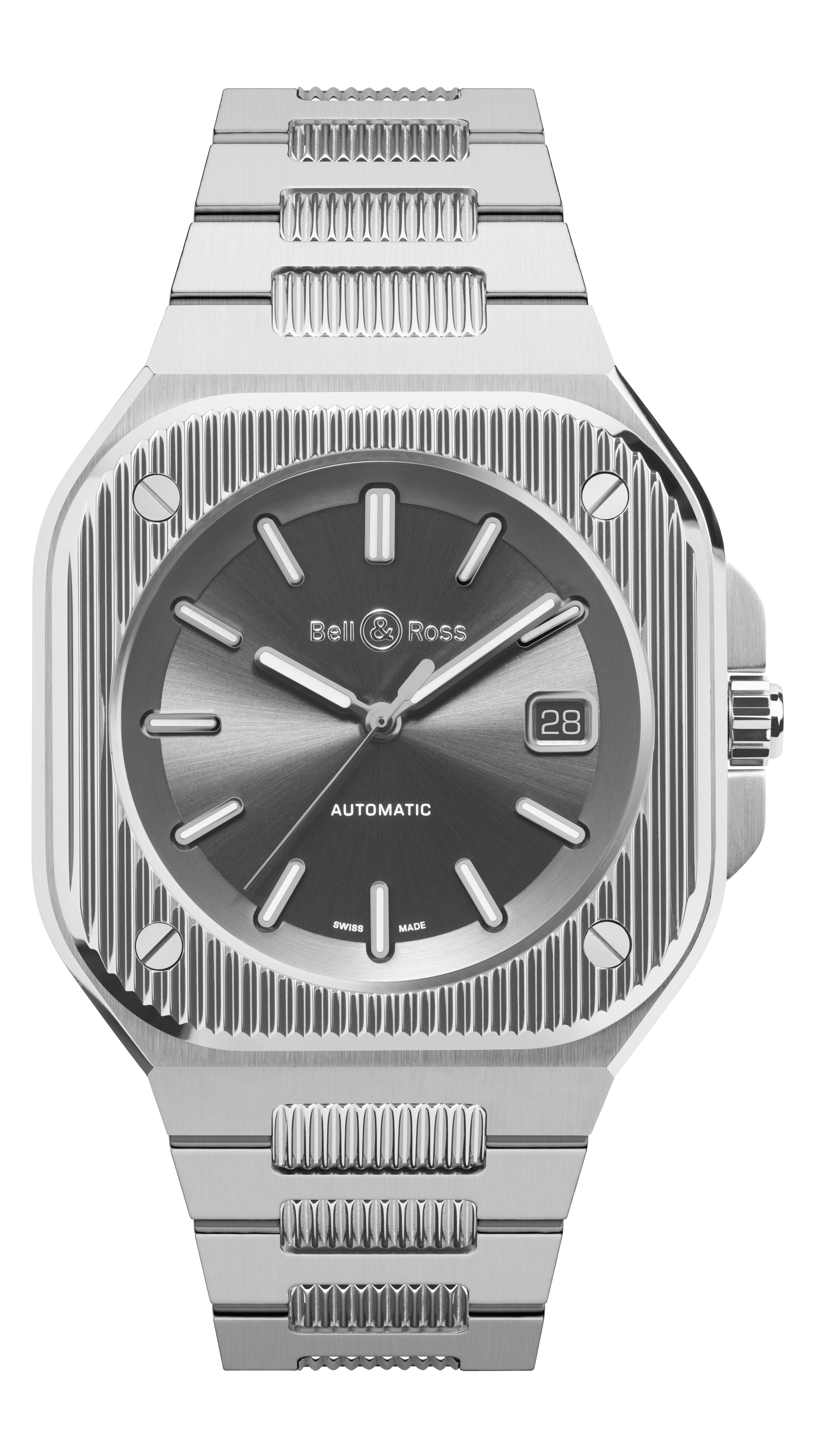 - the dial is adorned with a sunburst ruthenium grey. This elegant shade, never before used on a BR 05, is the result of metallisation. This colour contrasts with the steel of the 40 mm case and clearly makes the dial stand out. This watch is powered by the in-house self-winding BR-CAL 321 calibre. The sapphire caseback allows you to contemplate the oscillating weight, the design of which is reminiscent of a sports car rim.