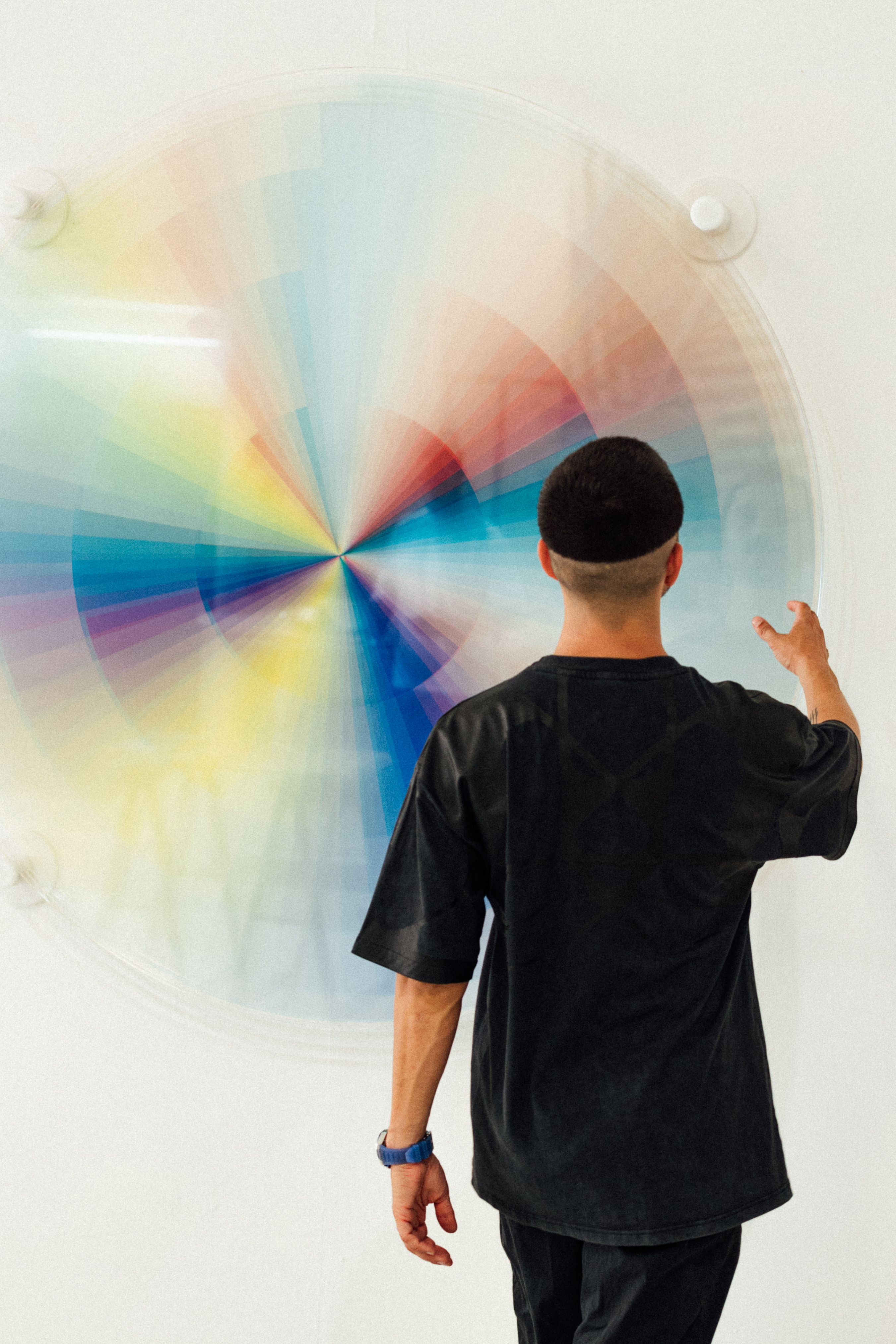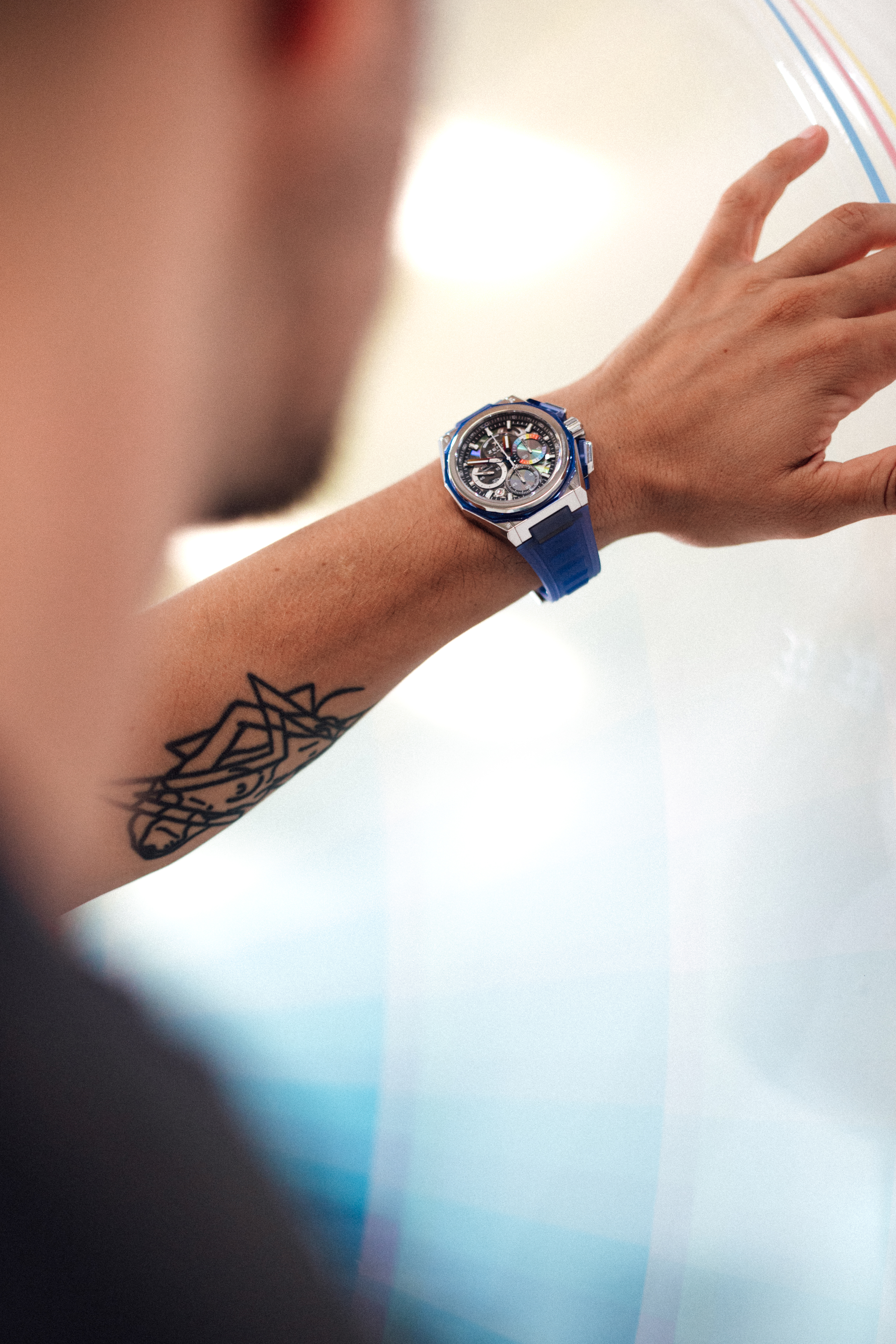 Looking down at the dial, its sapphire elements appear translucent and metallic. Turn it ever so slightly towards the light, and a spark of colours and geometric patterns emerge. Dynamic and metamorphic, the dial of the DEFY Extreme Felipe Pantone is unlike anything else that has ever been made in watchmaking. Colour gradients and the interplay of light, patterns and transparency are part of the artist’s signature. As such, ZENITH and Pantone sought to create a dial that retained the highly chromatic look typical of his work while incorporating elements that play with light in a most unexpected way. Using a transparent sapphire disk as the dial’s base, an innovative physio-chemical process is used to create some hidden micro-engraved patterns that are just 100 nanometres deep. This innovative process gives the sapphire an iridescent effect, reflecting different colours that shift with the angle of light while making the patterns visible. This element marks the first time that Felipe Pantone’s aesthetic is applied to sapphire crystal, while highlighting ZENITH’s persistence to find the most cutting-edge techniques to miniaturize and translate the artist’s palette into a horological context.
