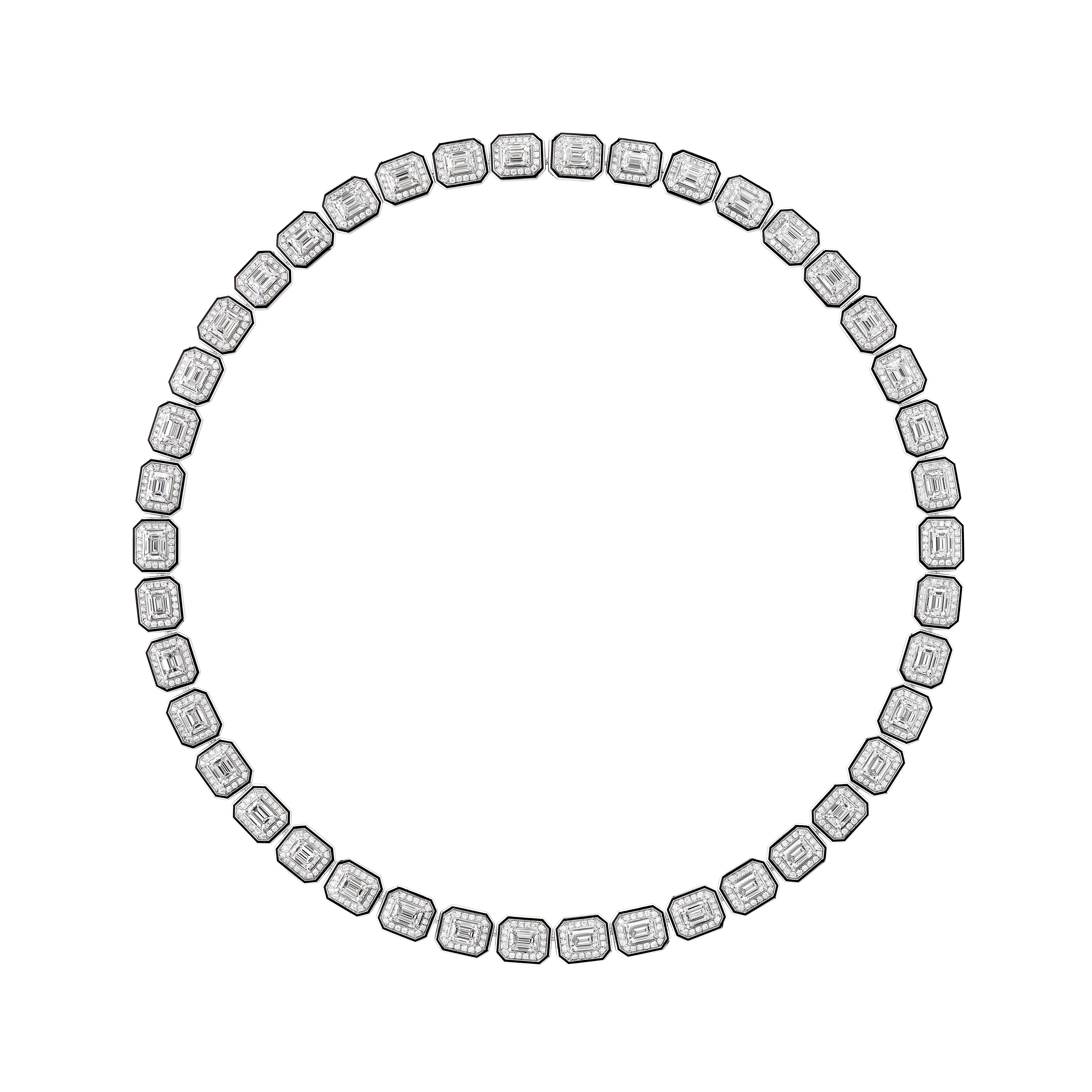 NECKLACE Inspired by the shape of Place Vendôme, the beating heart of the Maison, this beautiful necklace is a style statement. Its forty-two Art Deco-inspired motifs echo Boucheron's emblematic edging and its emerald-cut diamond. Graphic elegance and Parisian spirit - the very essence of the Maison Boucheron.