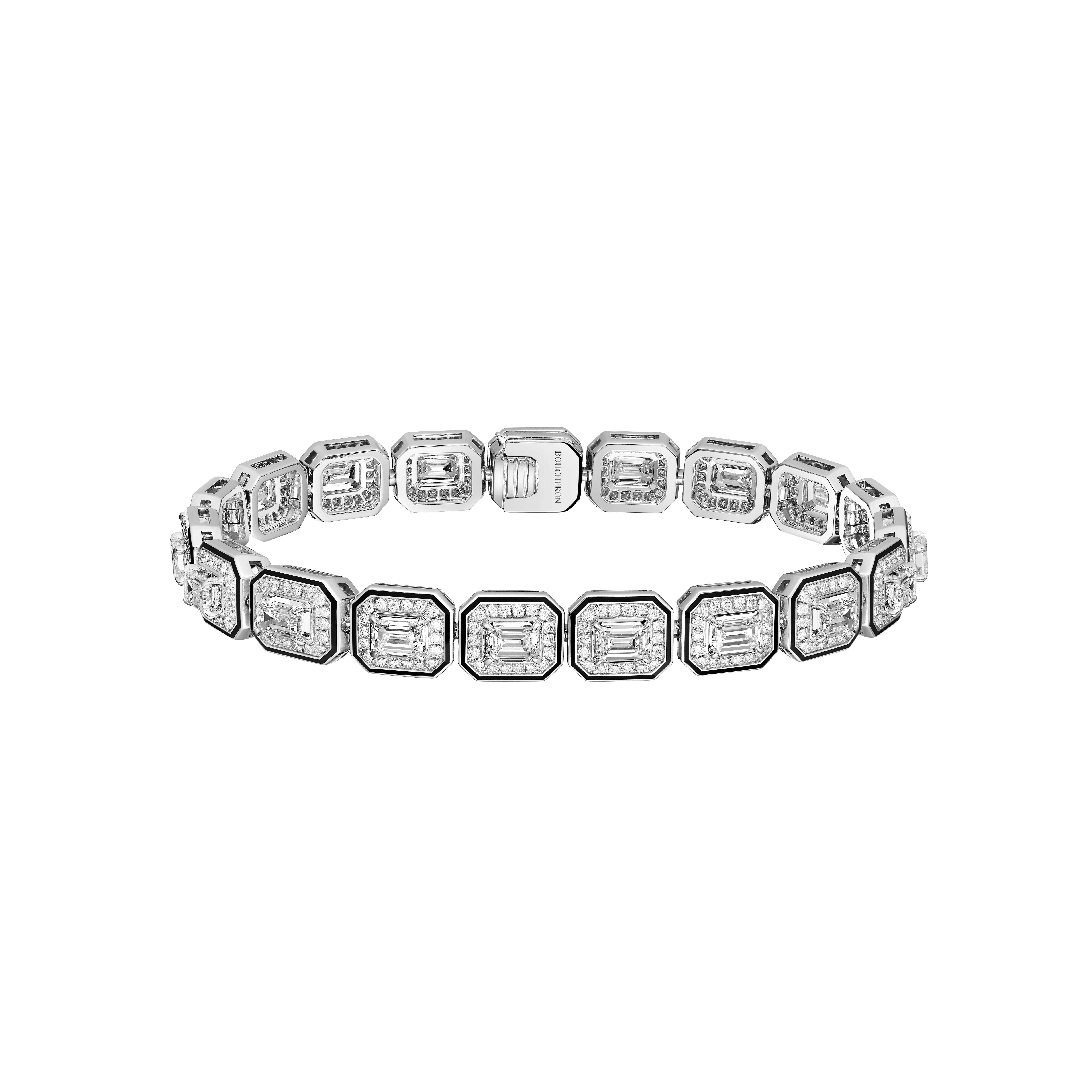 BRACELET A little piece of Paris to wrap around your wrist. Here, the edging motif, an octagonal design inspired by the Place Vendôme, is framed in black lacquer. At the heart of each of these white gold motifs is an emerald-cut diamond highlighted by round diamonds. The style of the Maison Boucheron has certainly found its expression in this Art Deco bracelet.