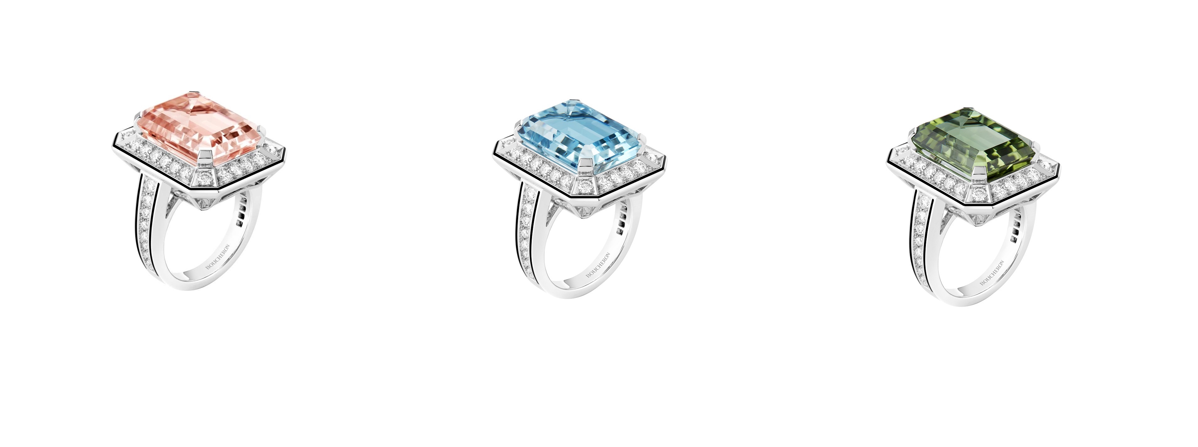 SOLITAIRES The Vendôme Liseré solitaire combines the splendor of an emerald-cut stone set with round diamonds with the boldness of color. This emblematic Boucheron piece is available in different versions: sparkling pink morganite, dazzling blue aquamarine or stunning green tourmaline.