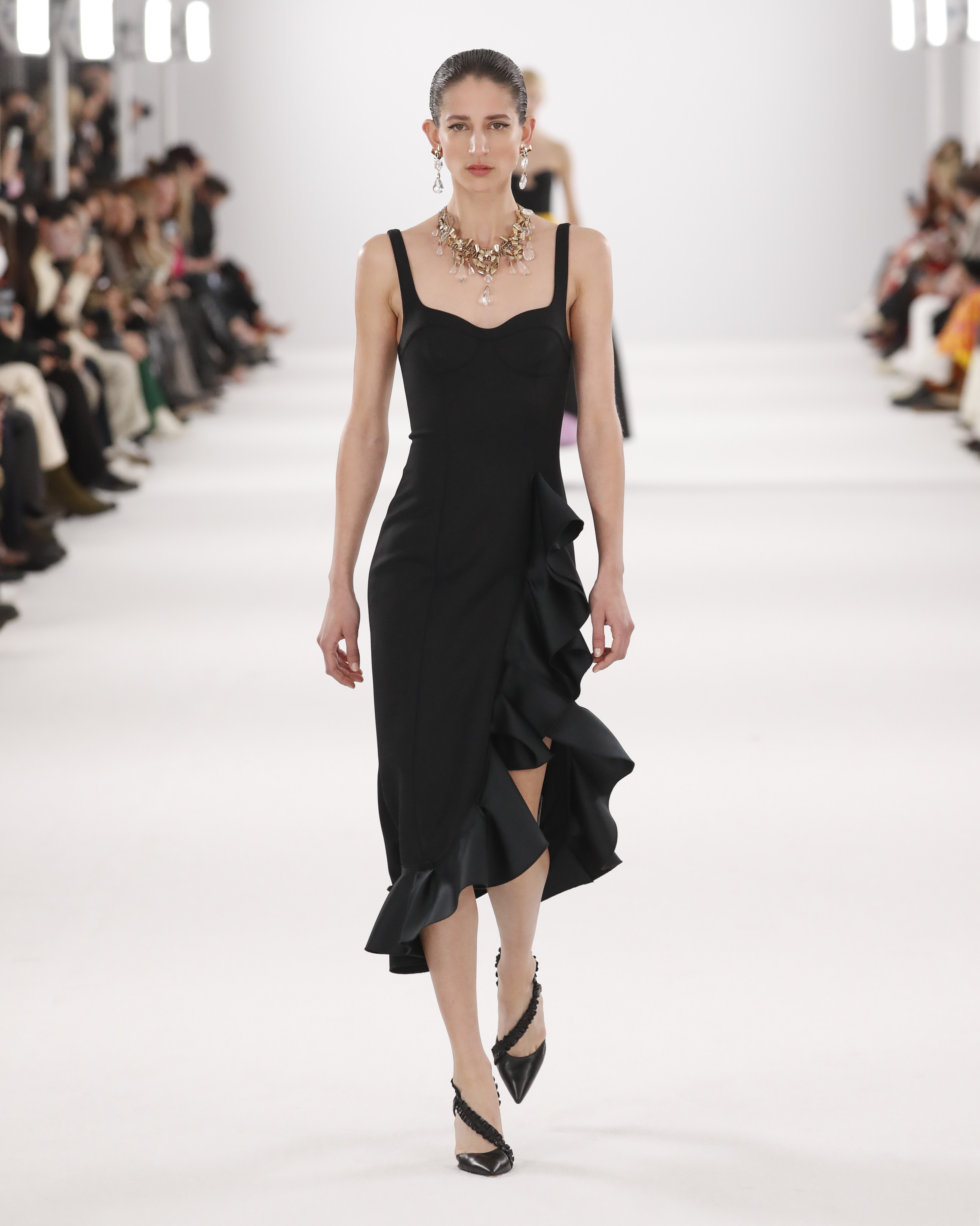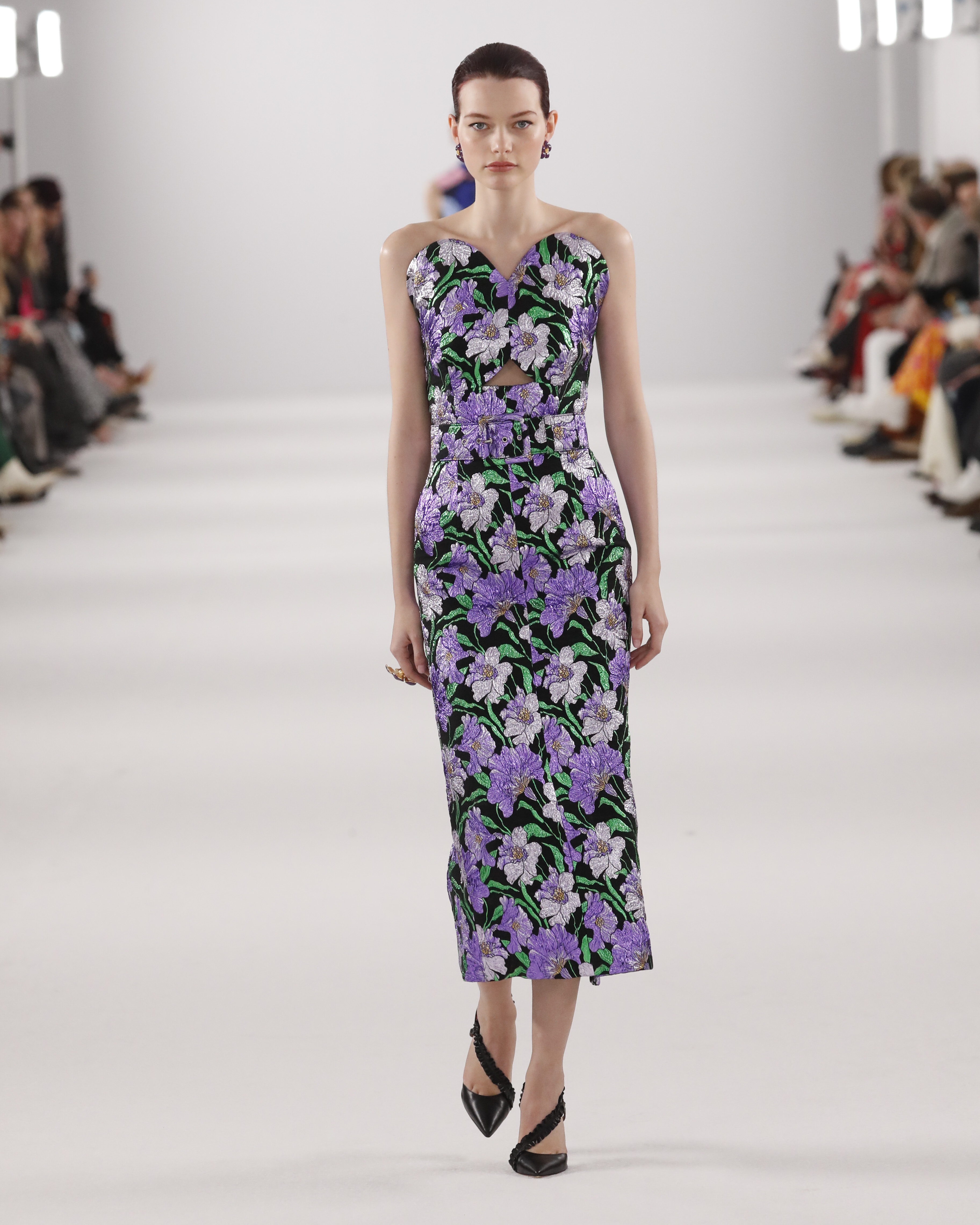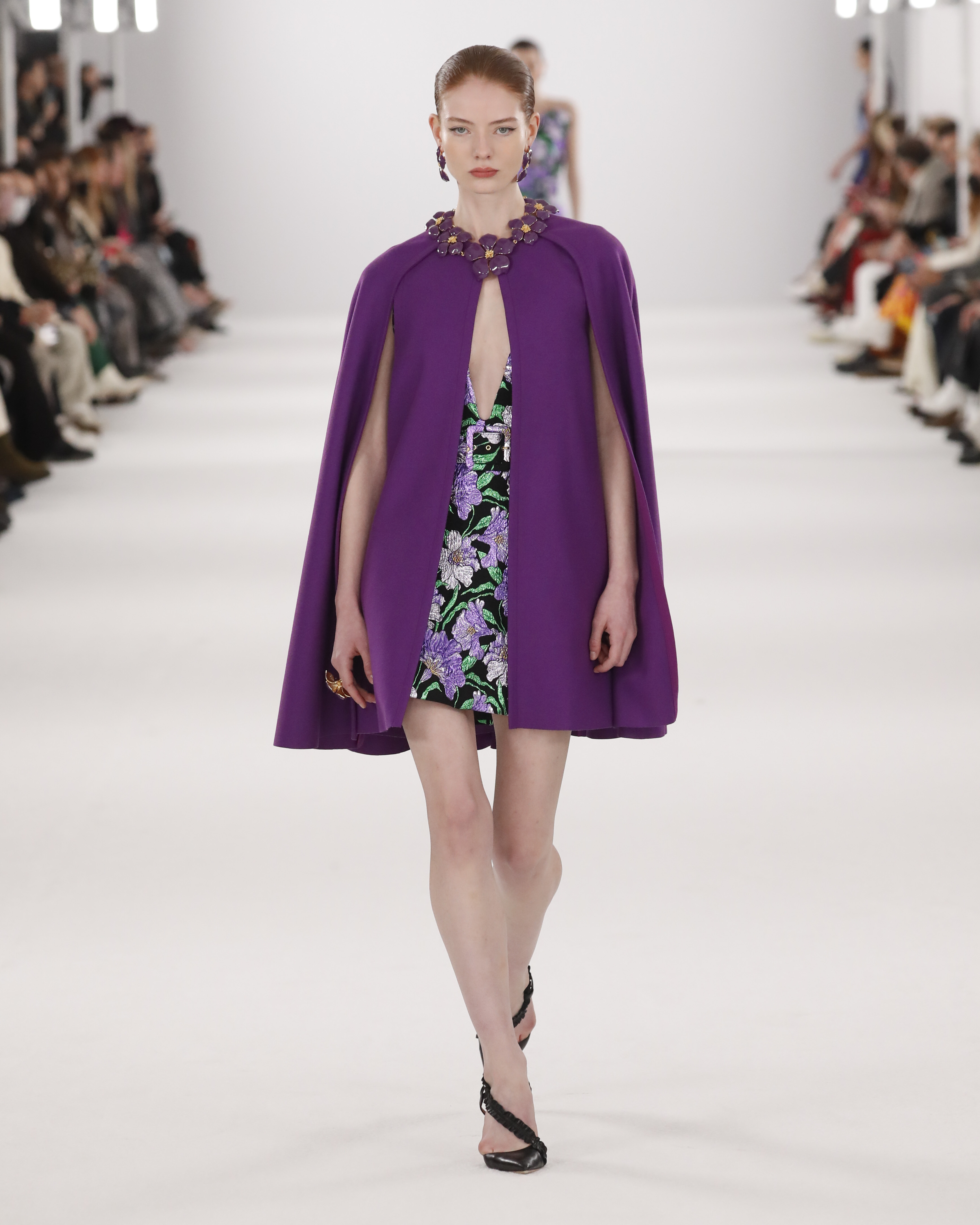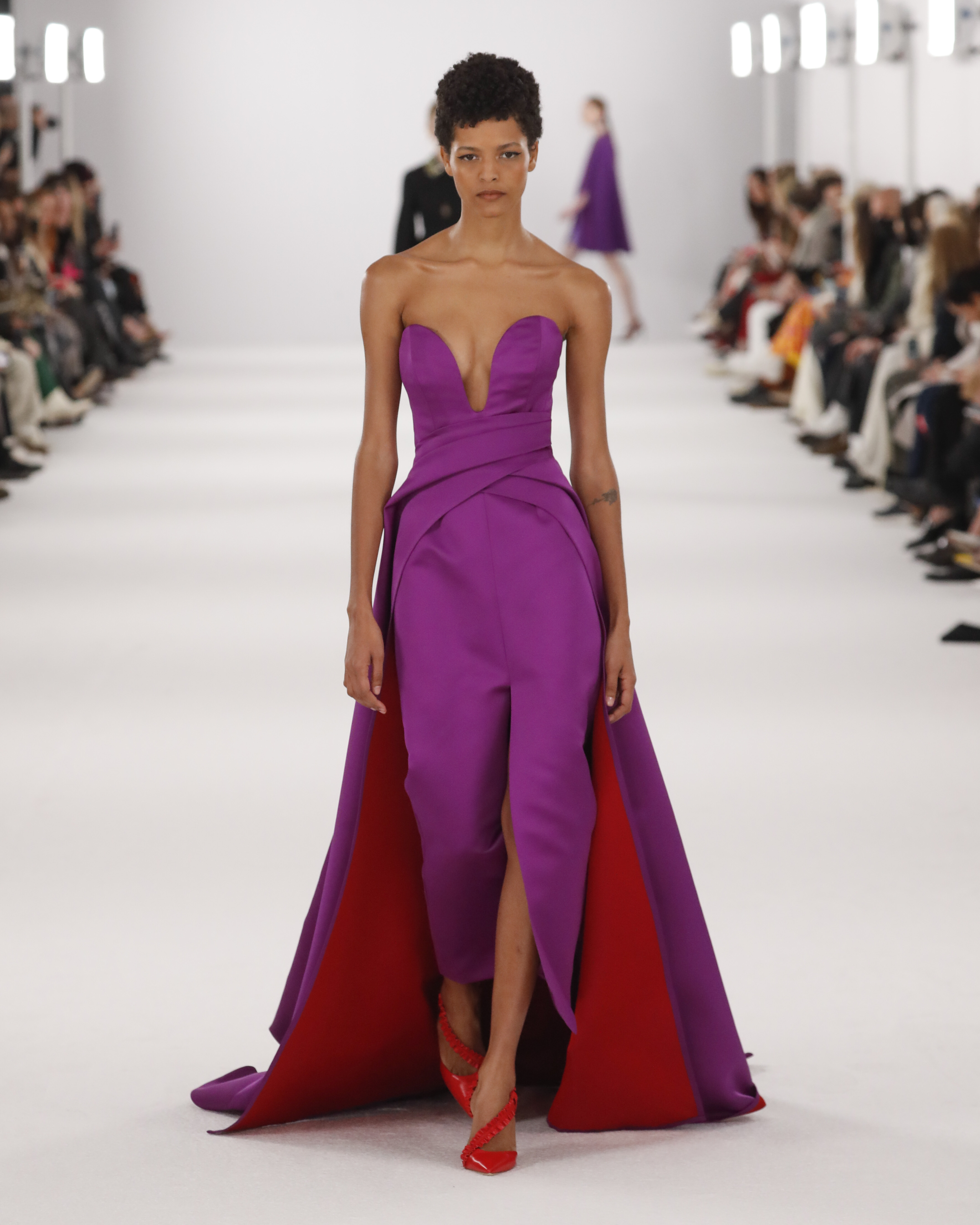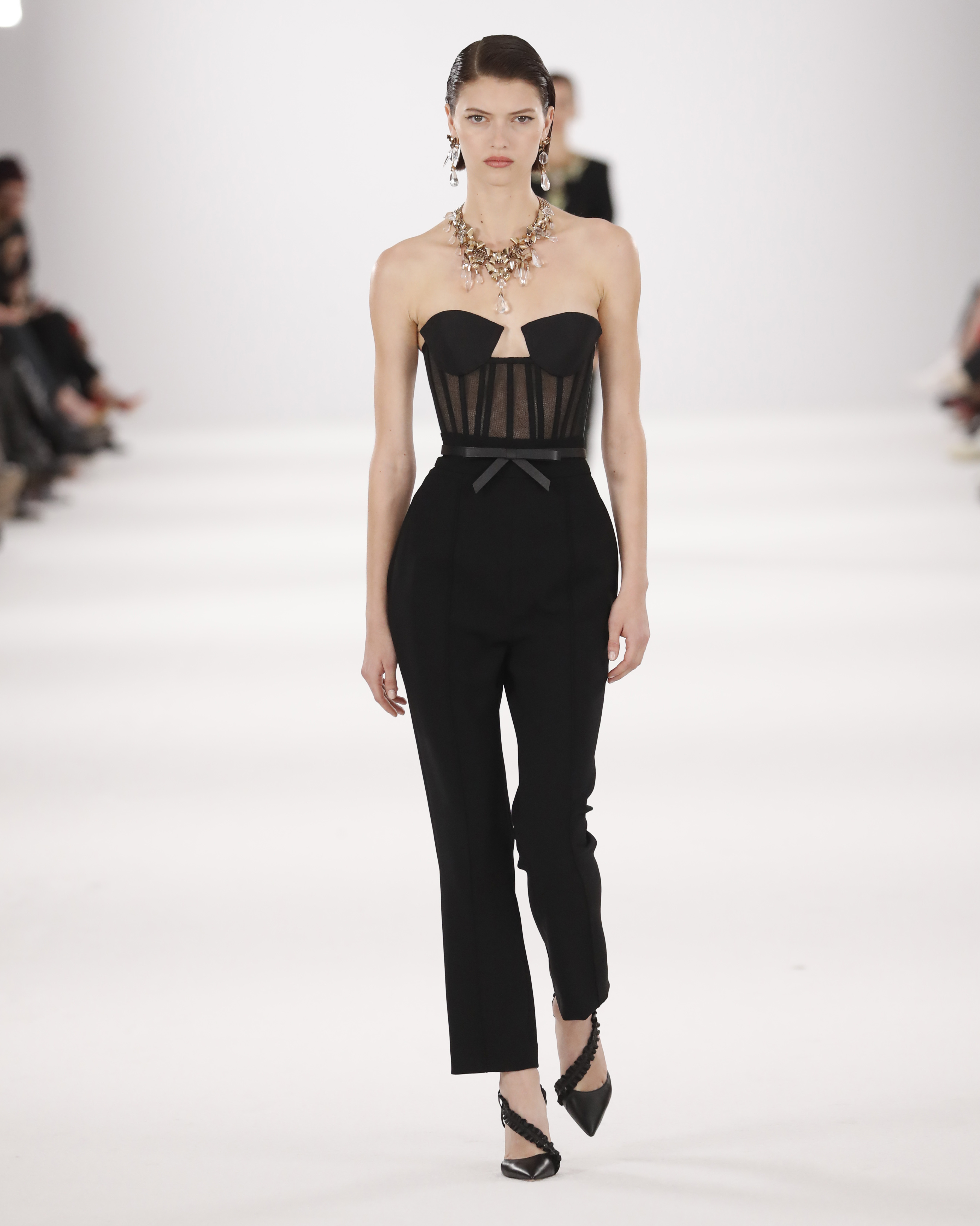 The silhouettes this season are markedly linear and tailored, yet feature moments of exuberance like an undulating cascade, an enormous sleeve or a color reveal at a hem. Bustier shapes are sensually and precisely cut, reinterpreted as fresh separates or daring beaded fringe.
