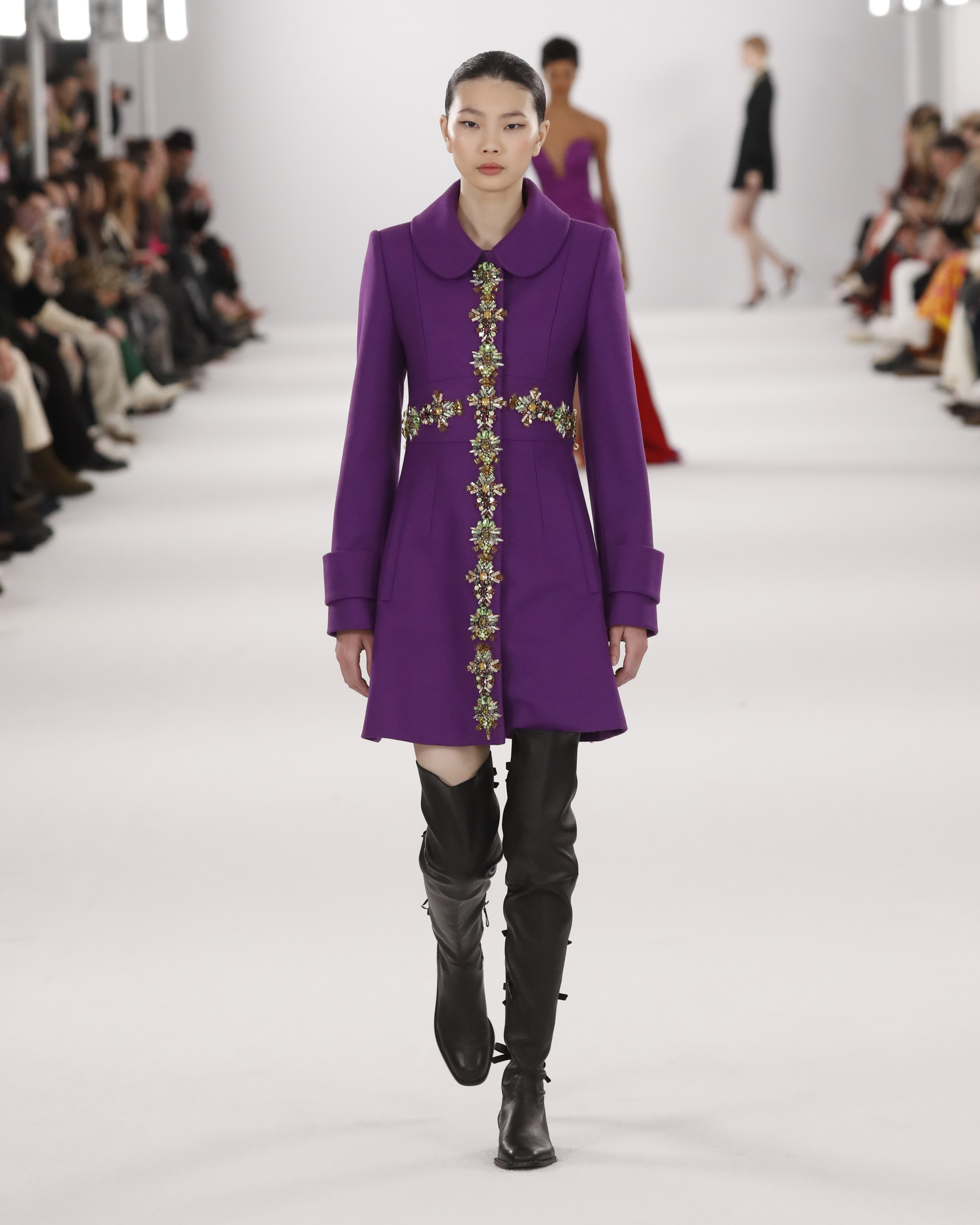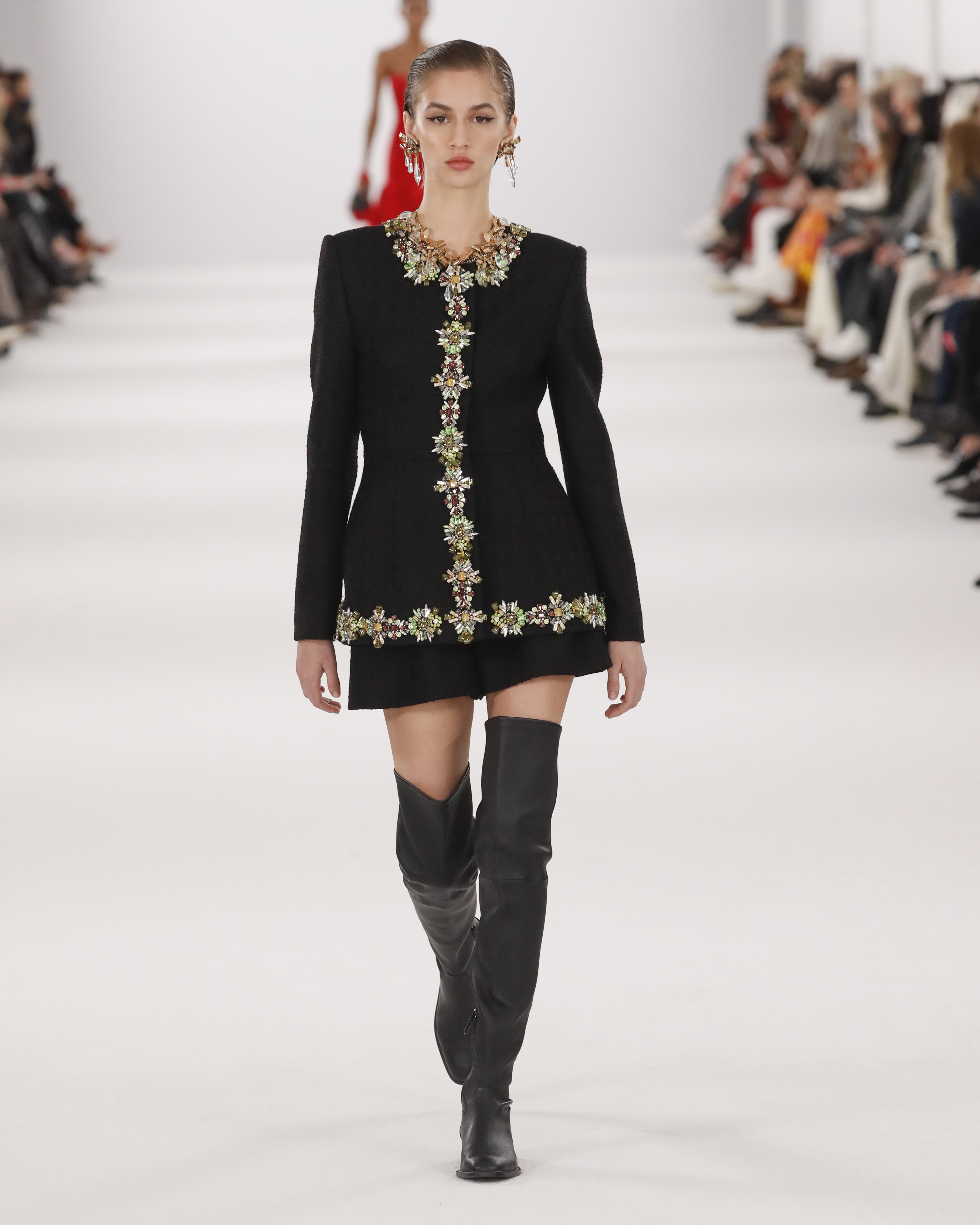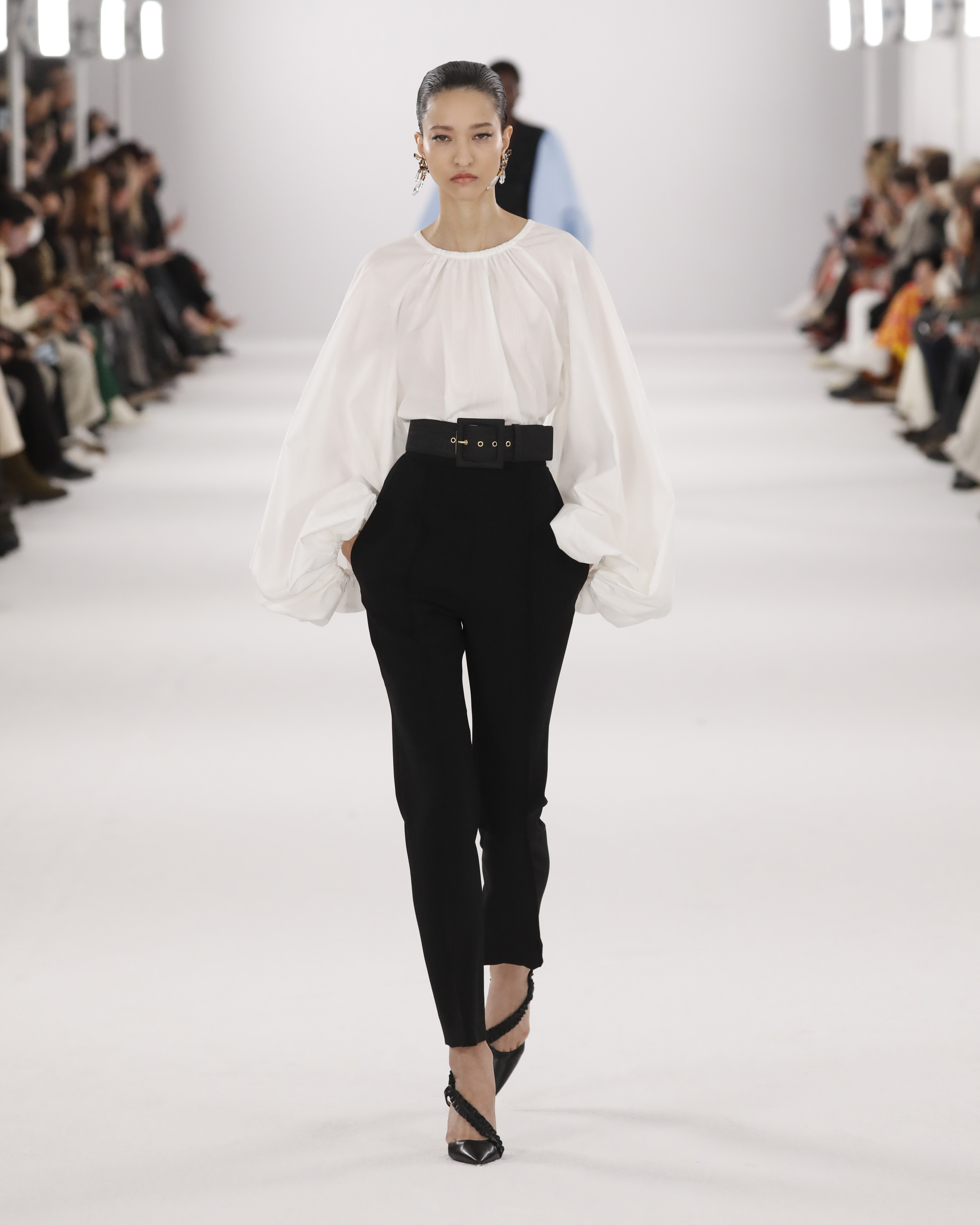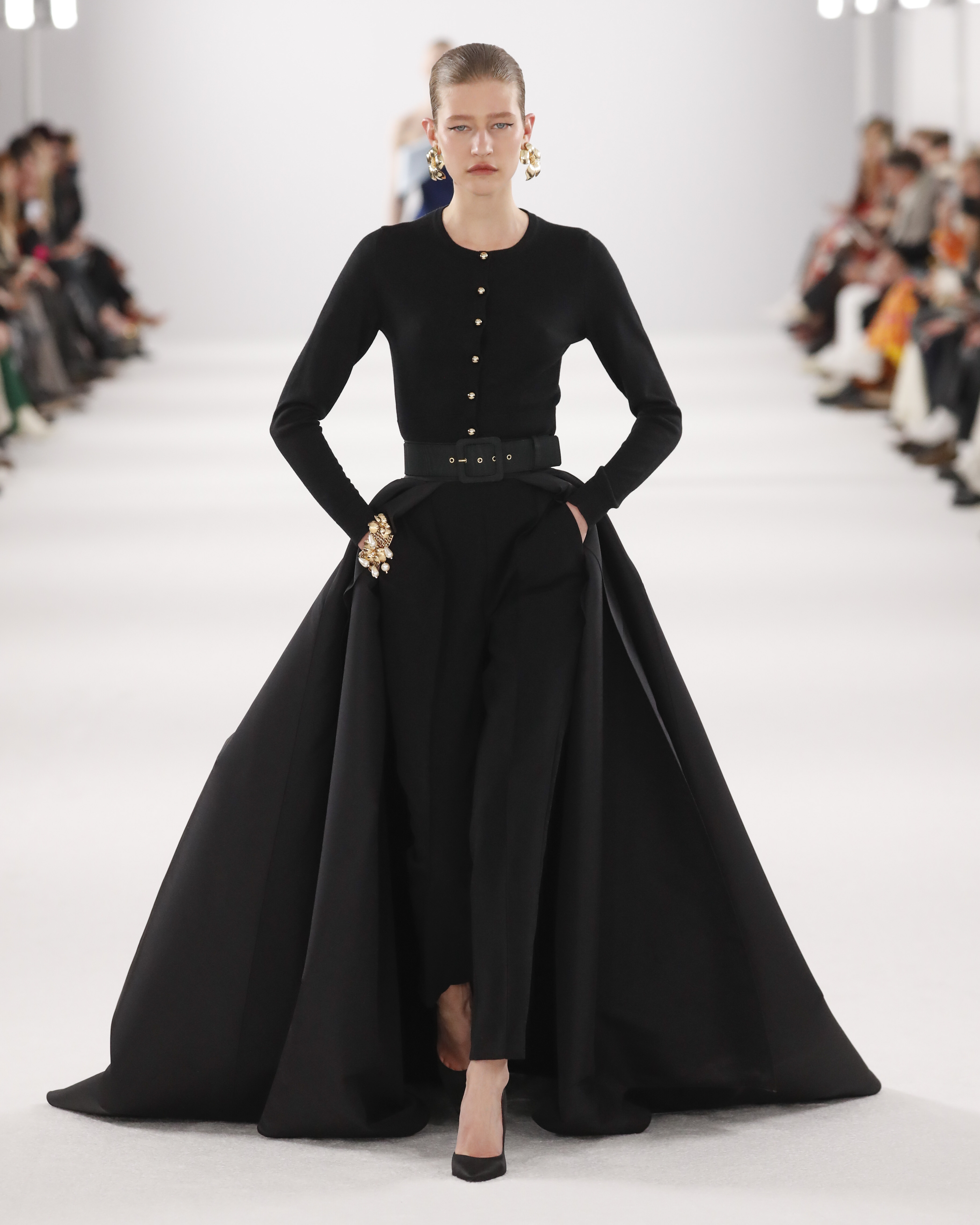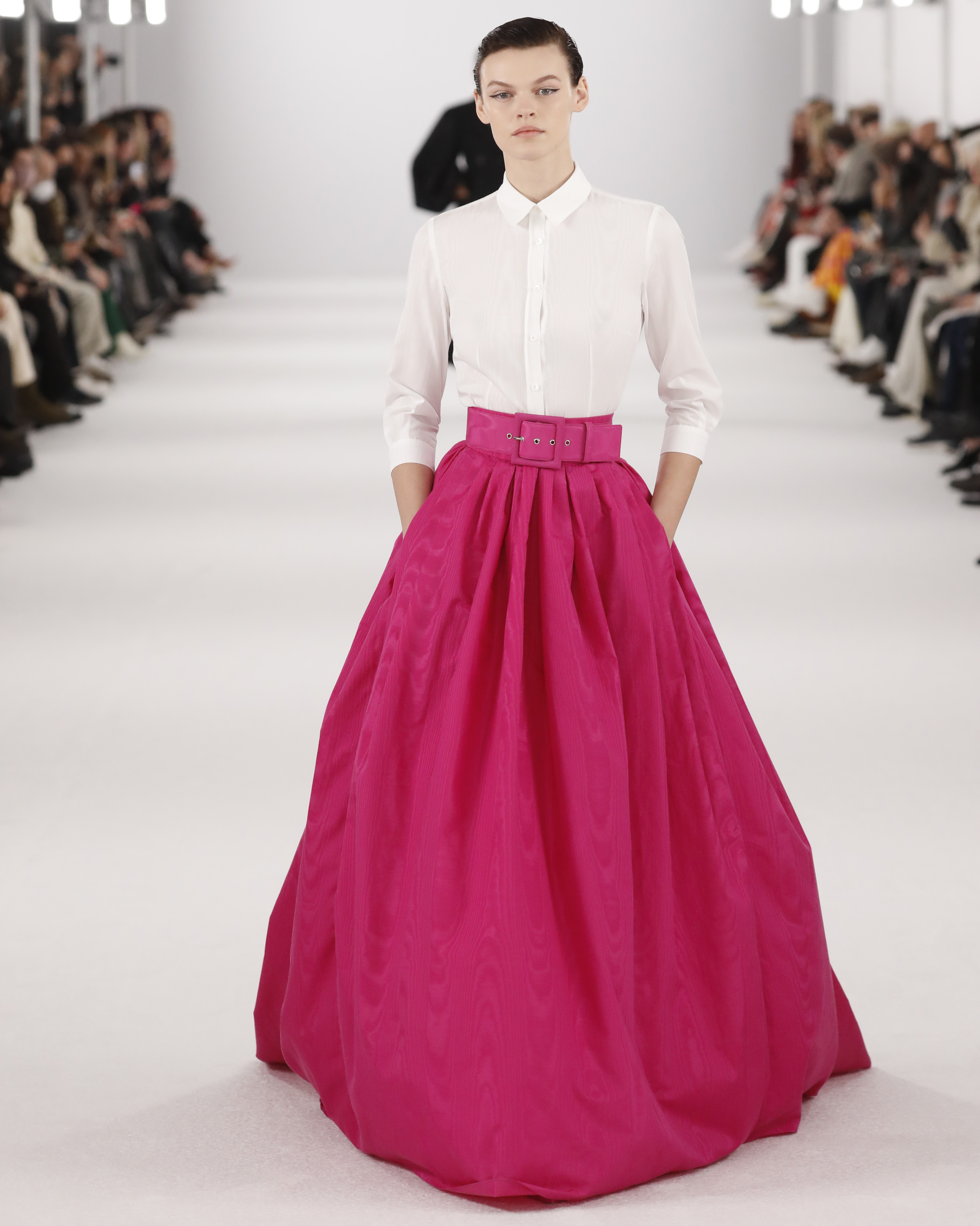 The silhouettes this season are markedly linear and tailored, yet feature moments of exuberance like an undulating cascade, an enormous sleeve or a color reveal at a hem. Bustier shapes are sensually and precisely cut, reinterpreted as fresh separates or daring beaded fringe.