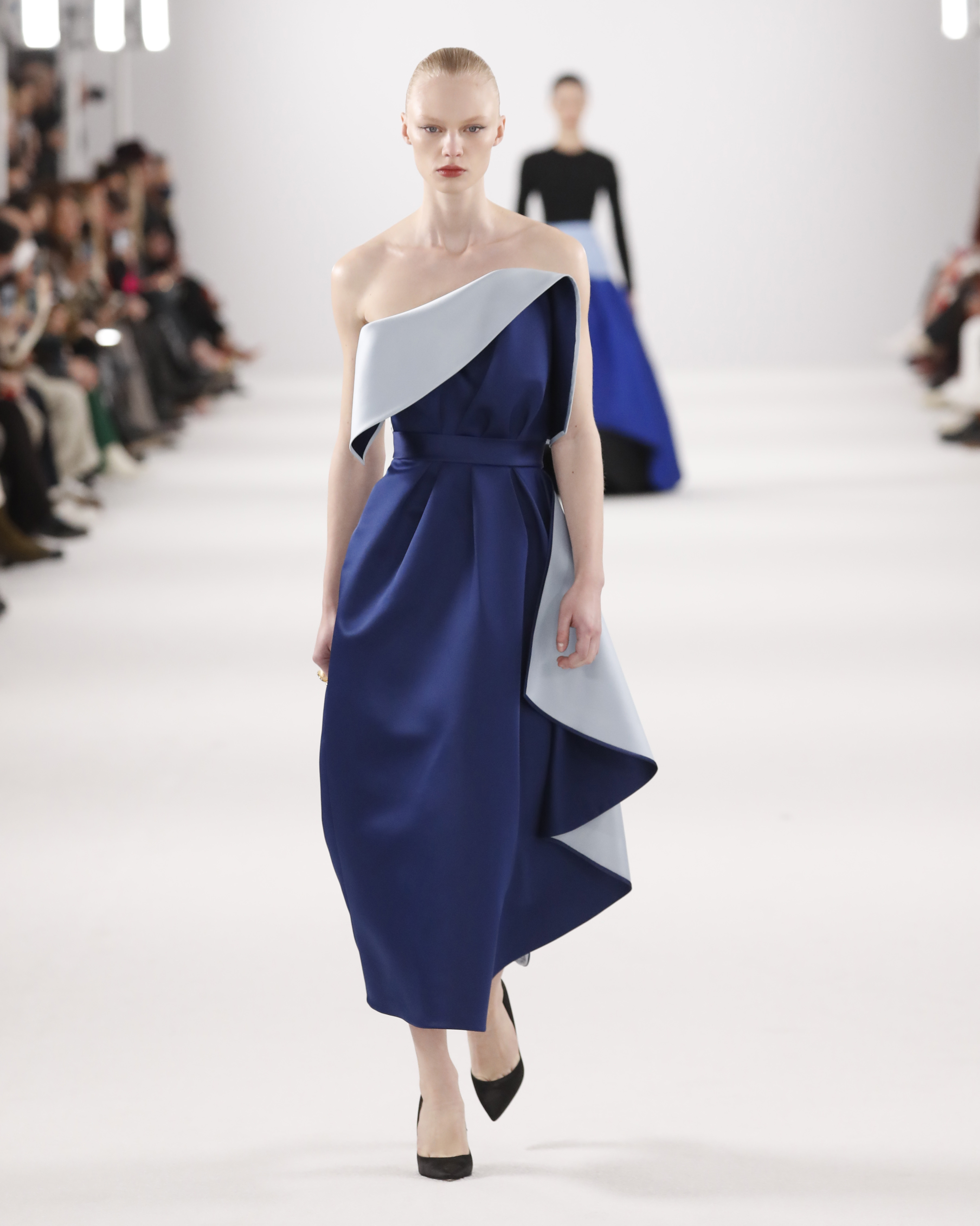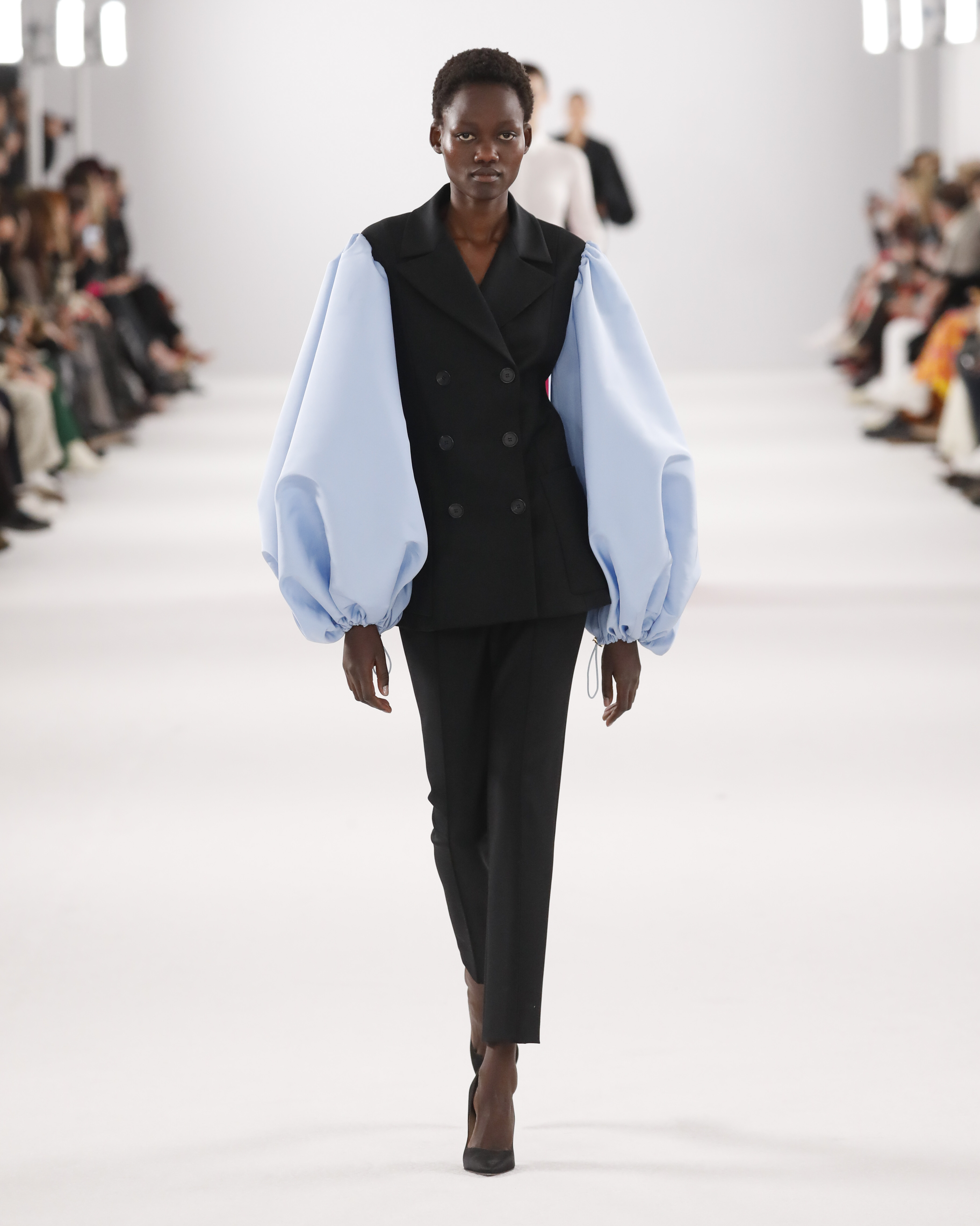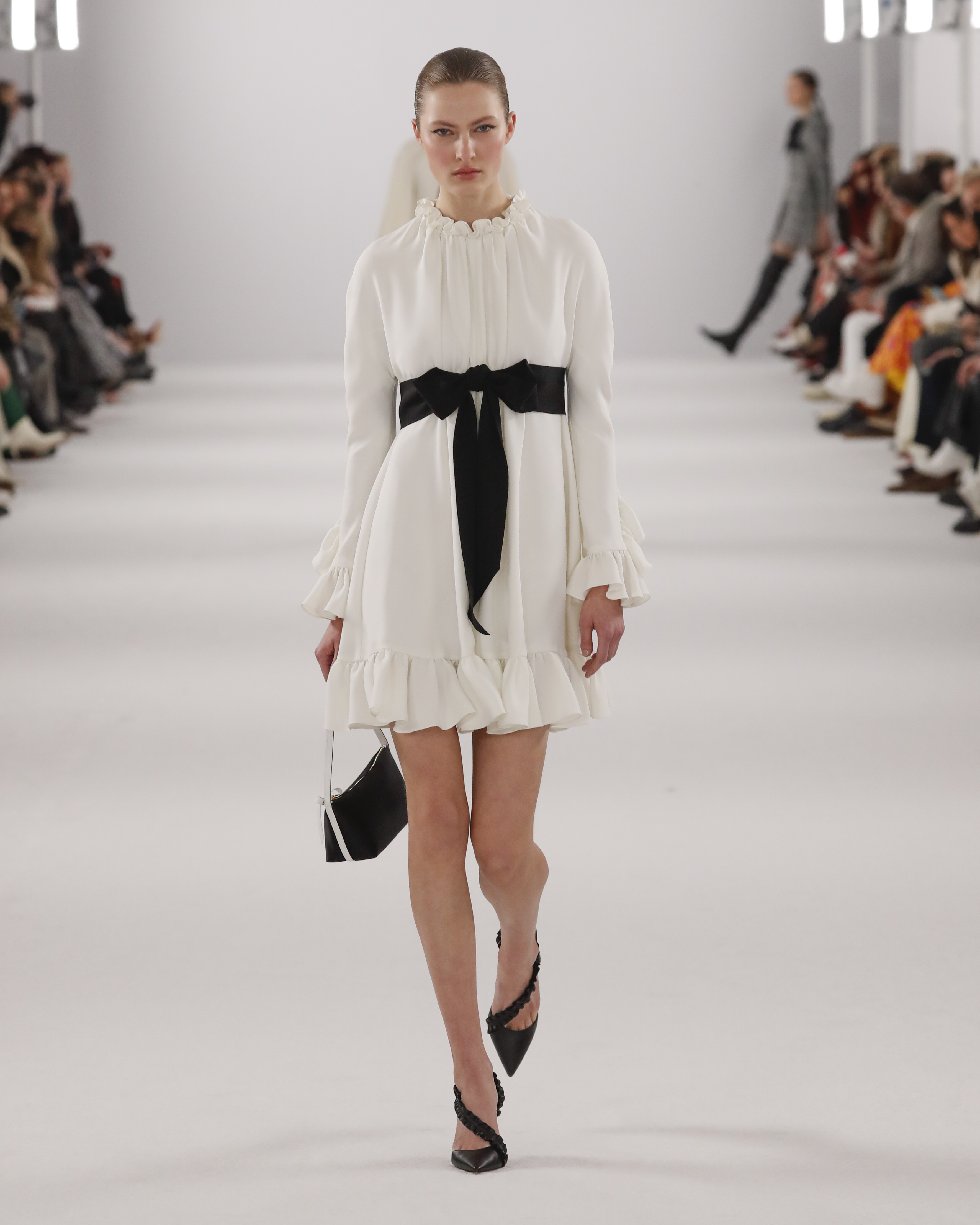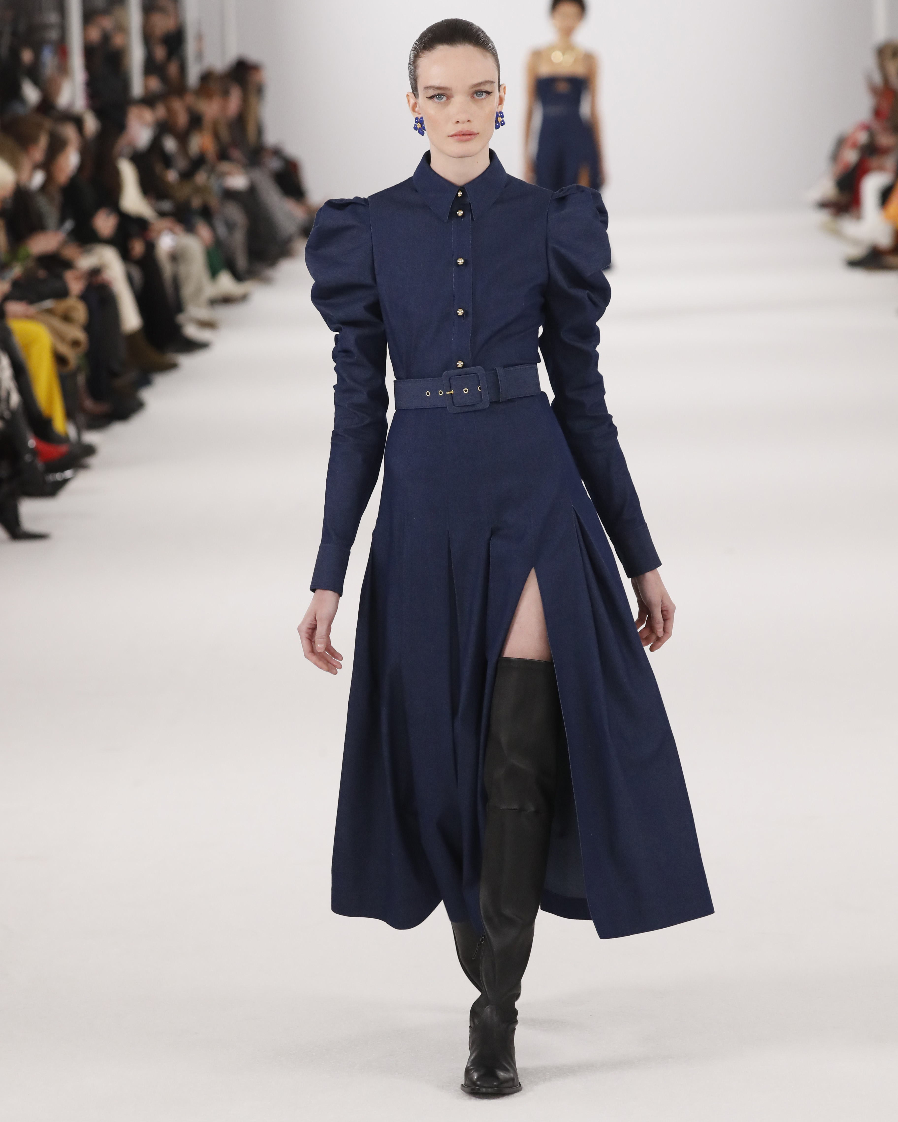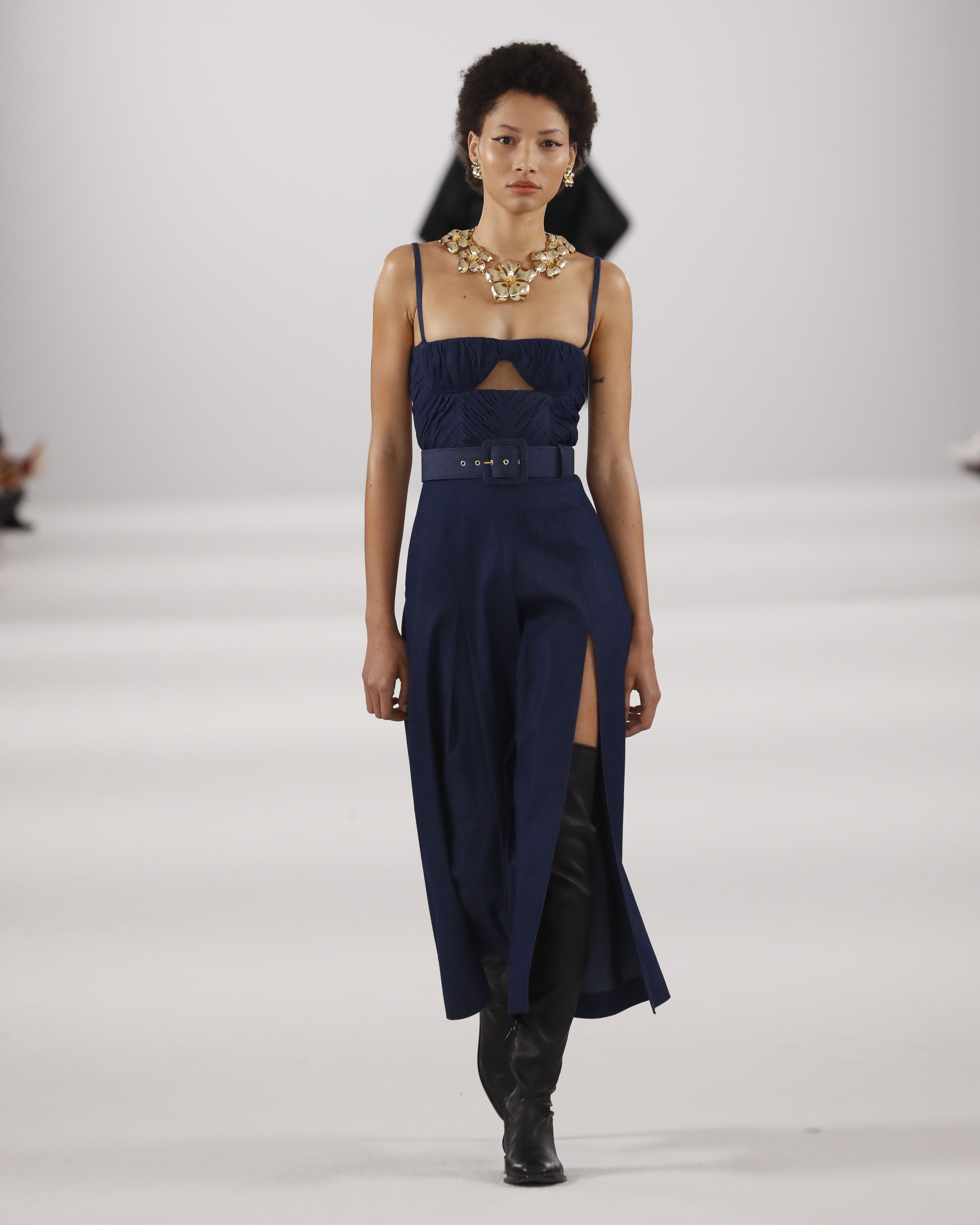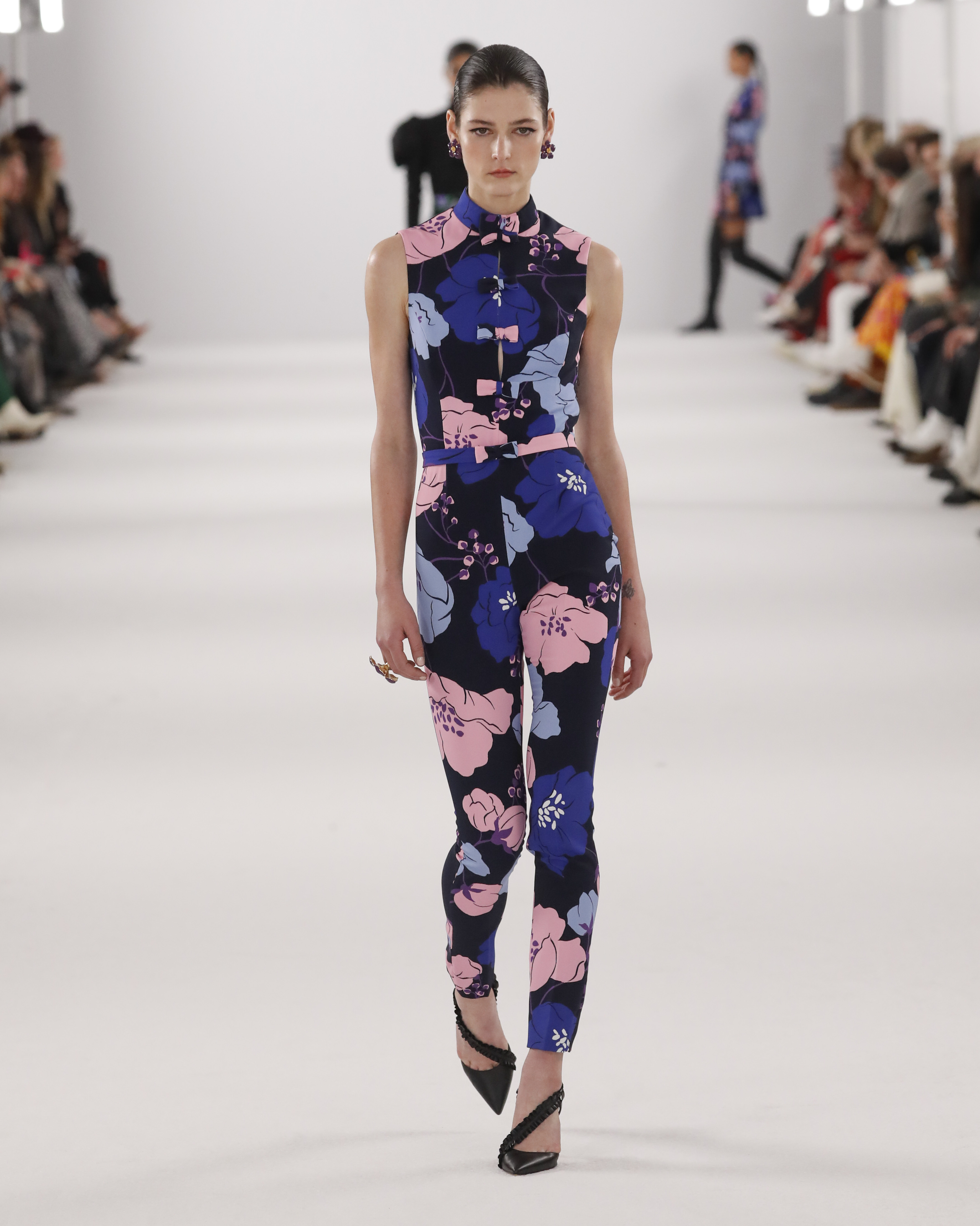 The silhouettes this season are markedly linear and tailored, yet feature moments of exuberance like an undulating cascade, an enormous sleeve or a color reveal at a hem. Bustier shapes are sensually and precisely cut, reinterpreted as fresh separates or daring beaded fringe.
