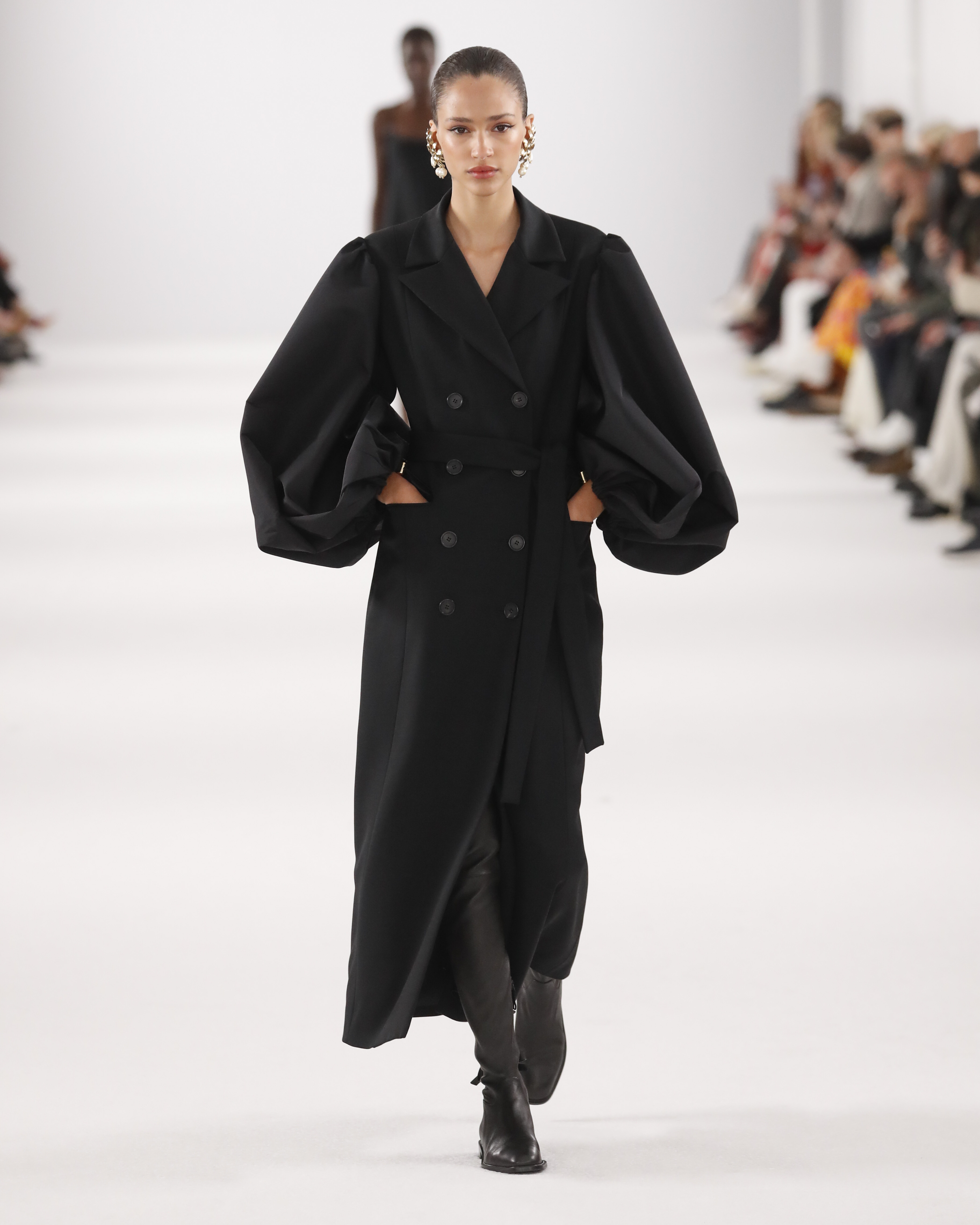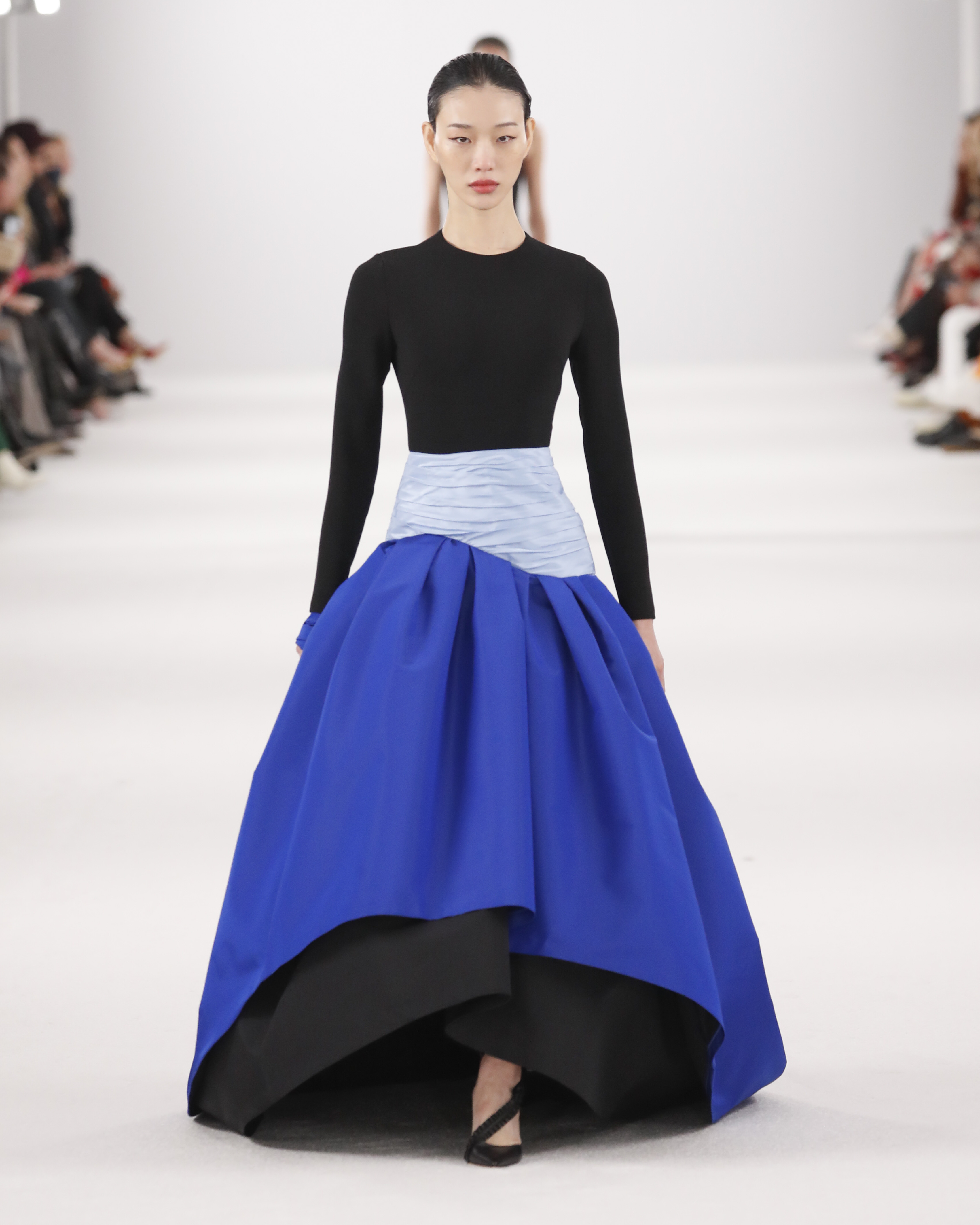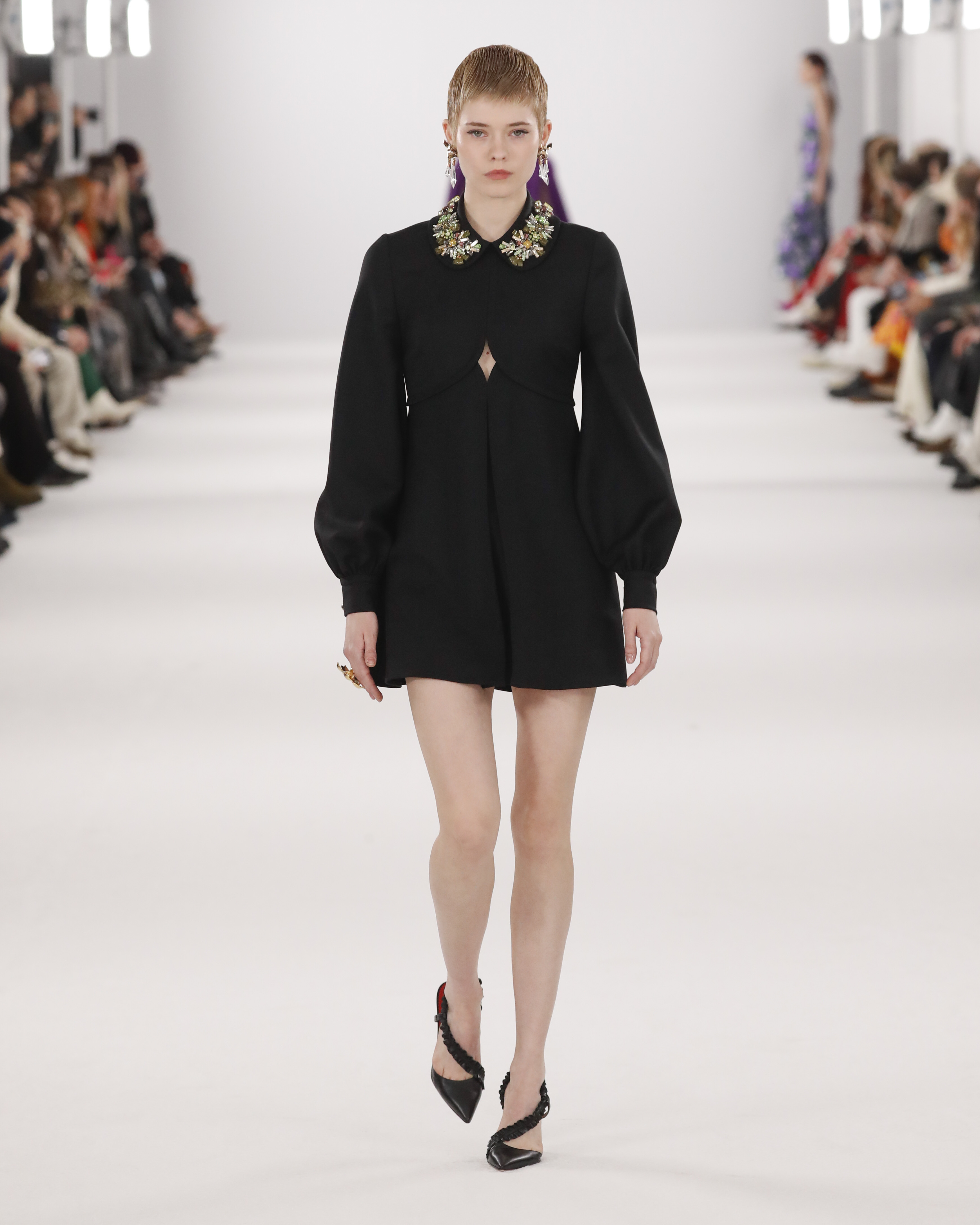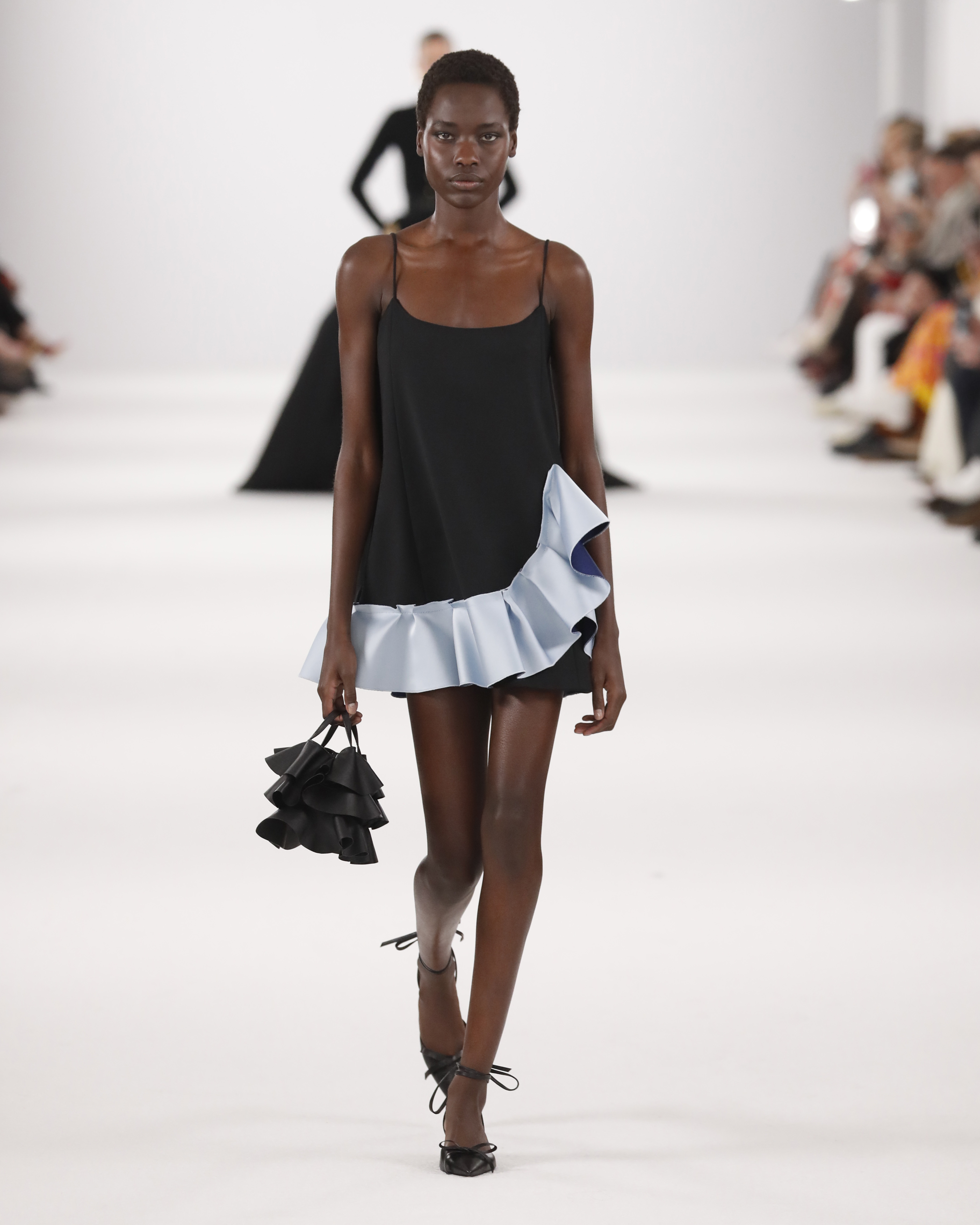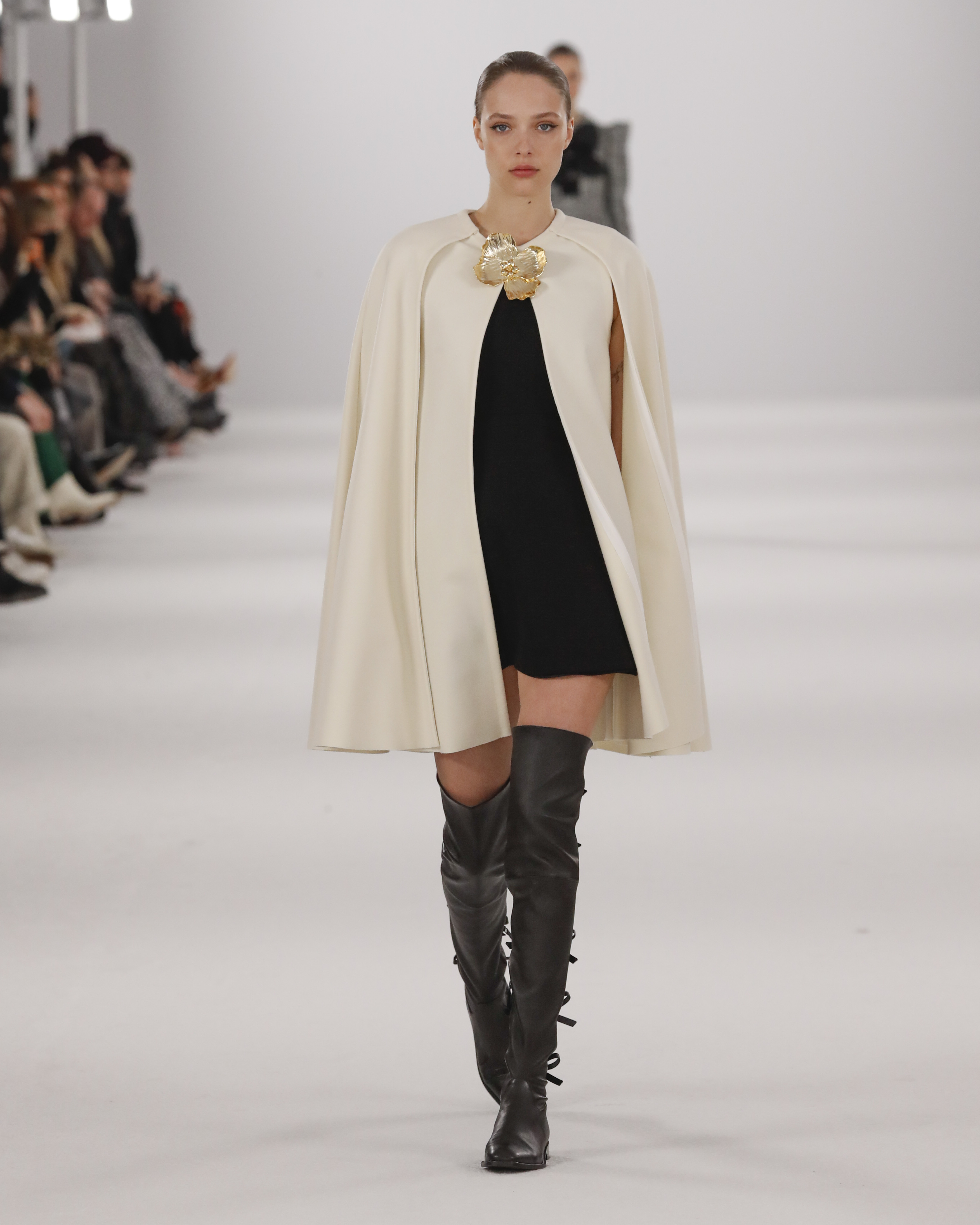 The silhouettes this season are markedly linear and tailored, yet feature moments of exuberance like an undulating cascade, an enormous sleeve or a color reveal at a hem. Bustier shapes are sensually and precisely cut, reinterpreted as fresh separates or daring beaded fringe.