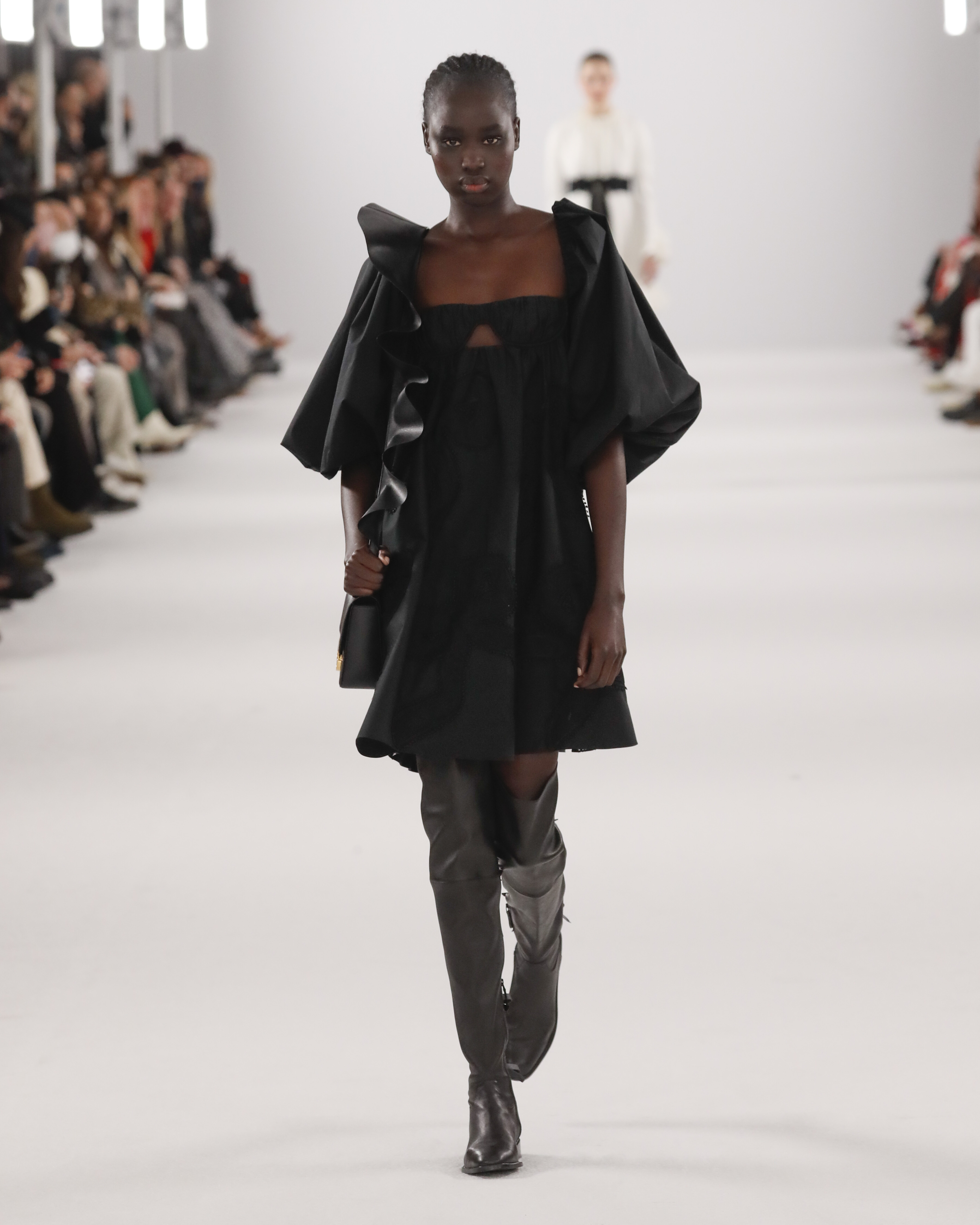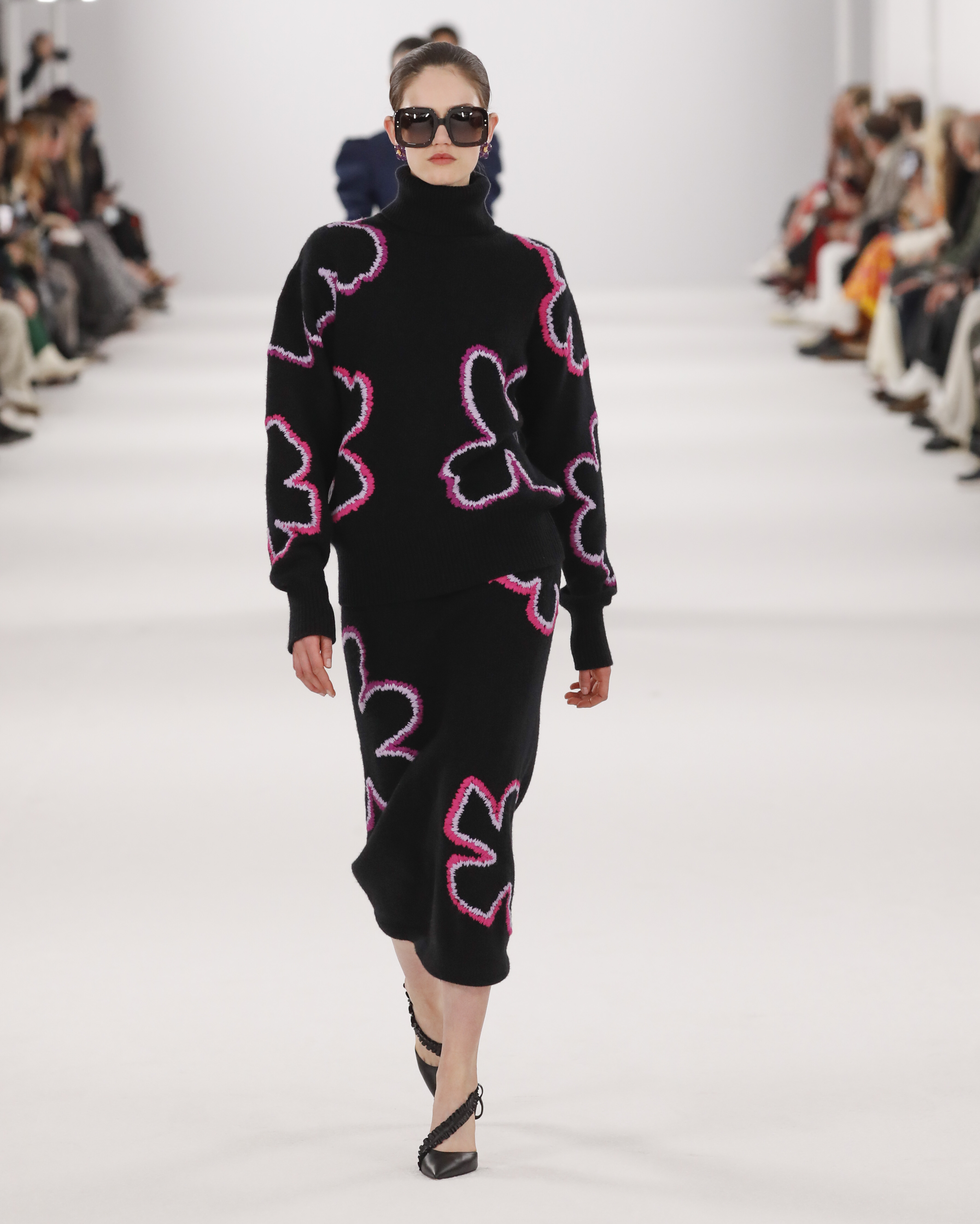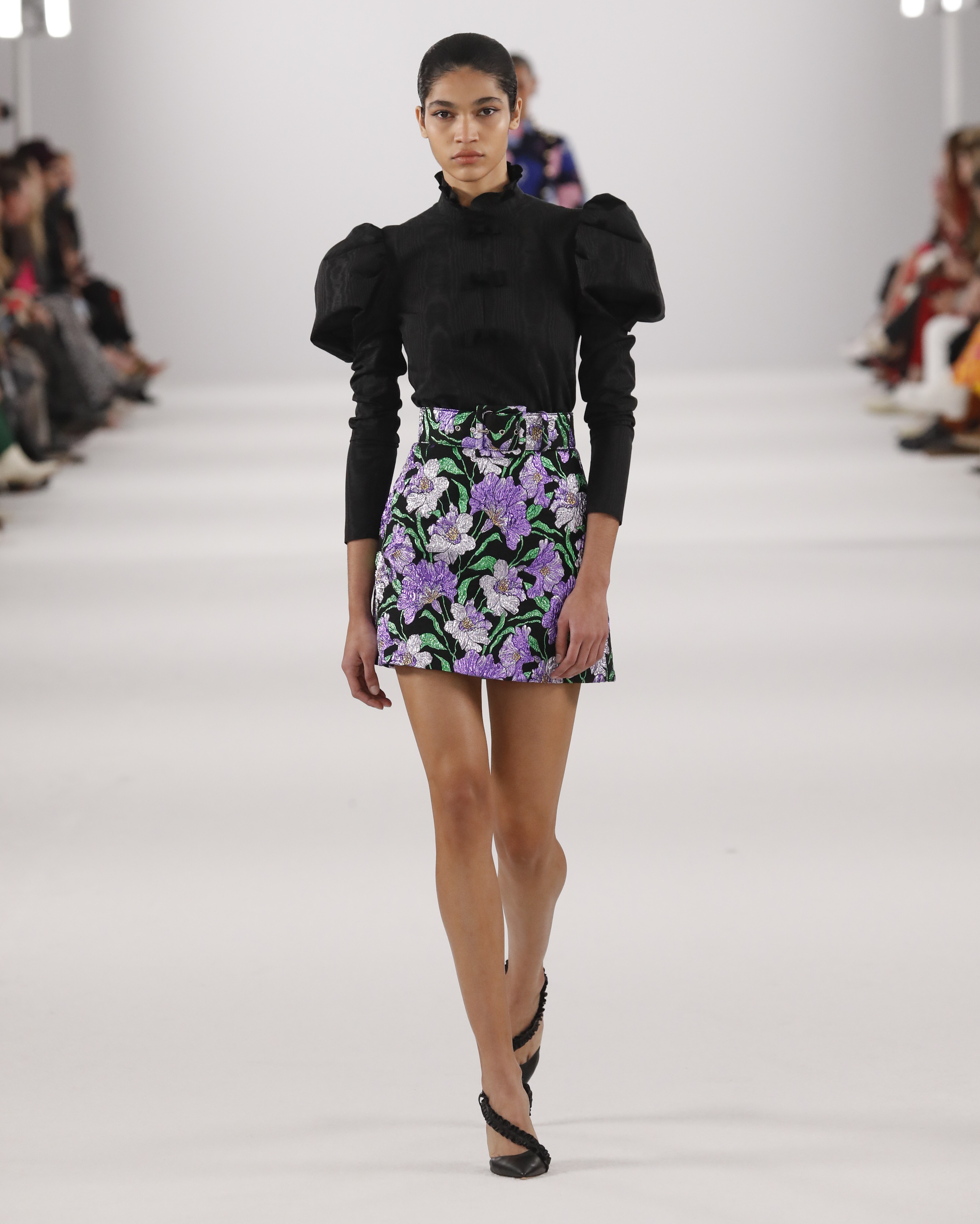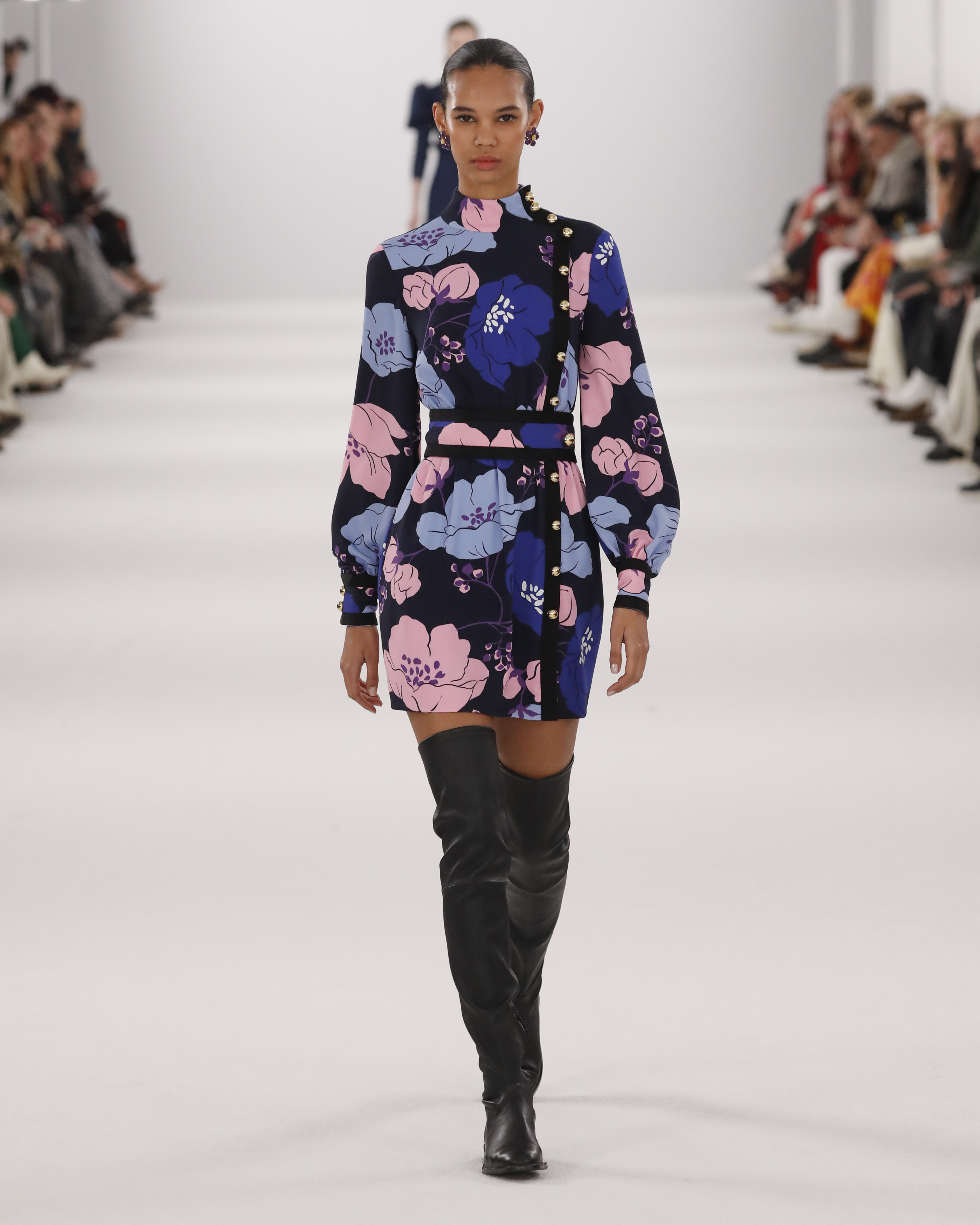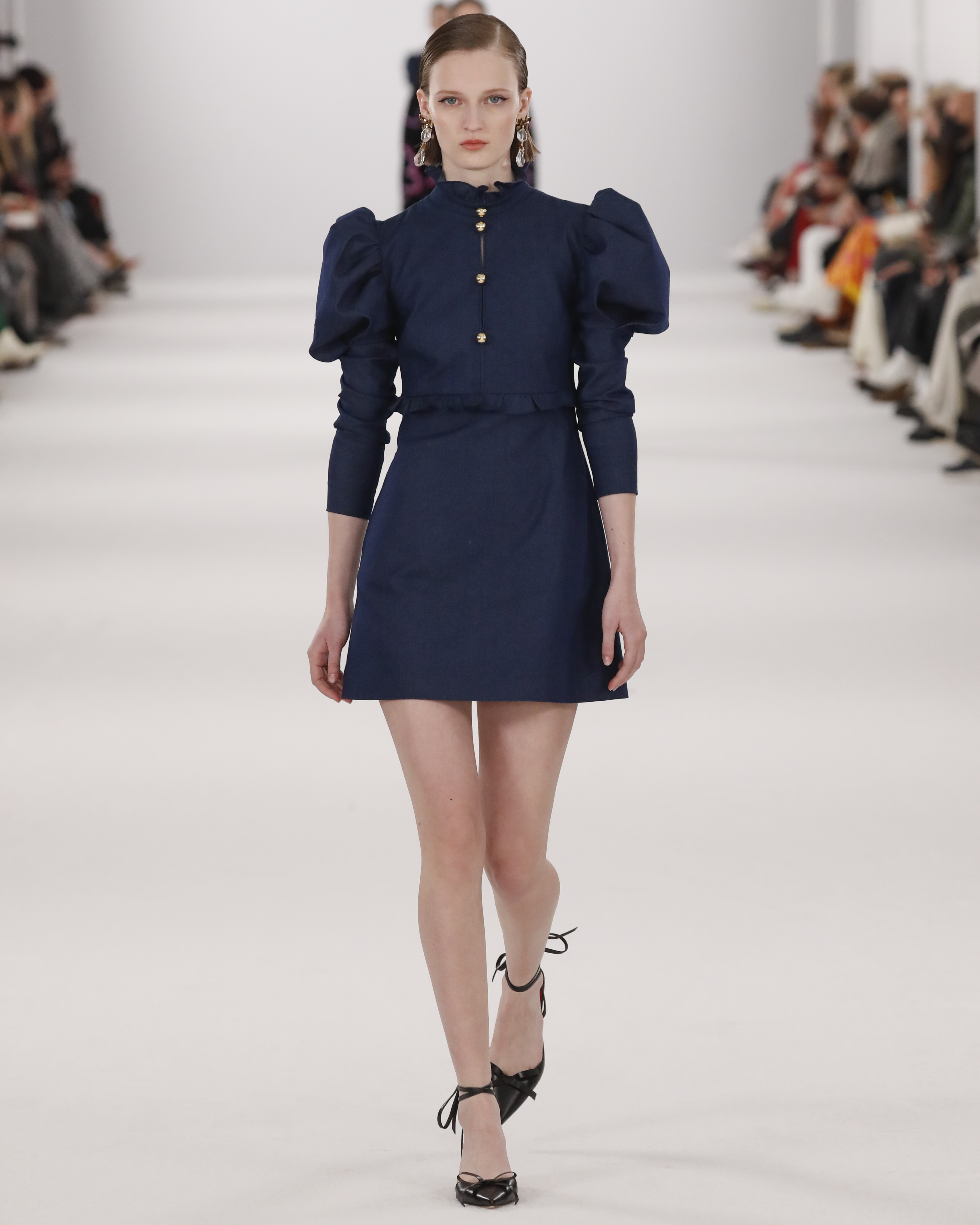 The silhouettes this season are markedly linear and tailored, yet feature moments of exuberance like an undulating cascade, an enormous sleeve or a color reveal at a hem. Bustier shapes are sensually and precisely cut, reinterpreted as fresh separates or daring beaded fringe.