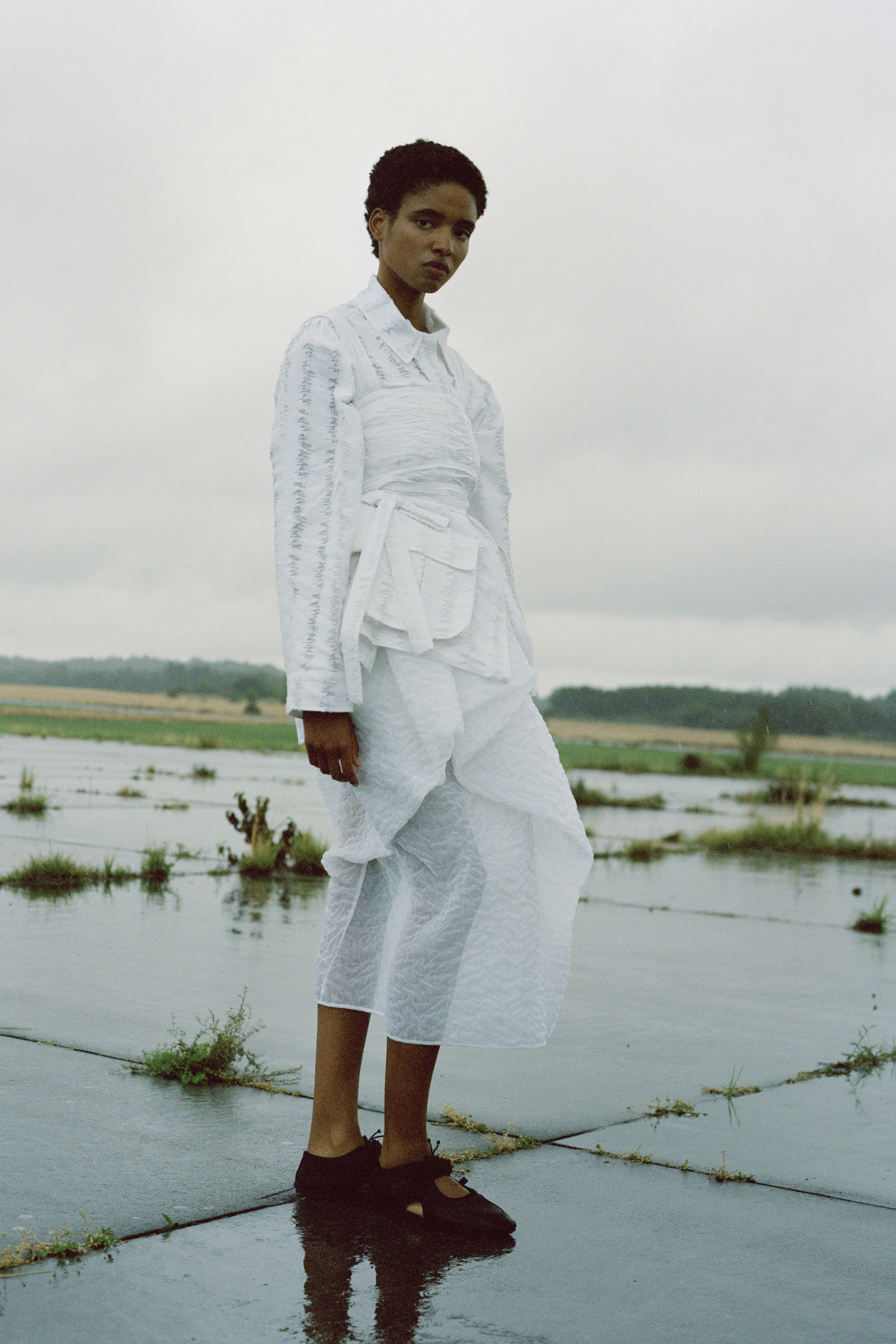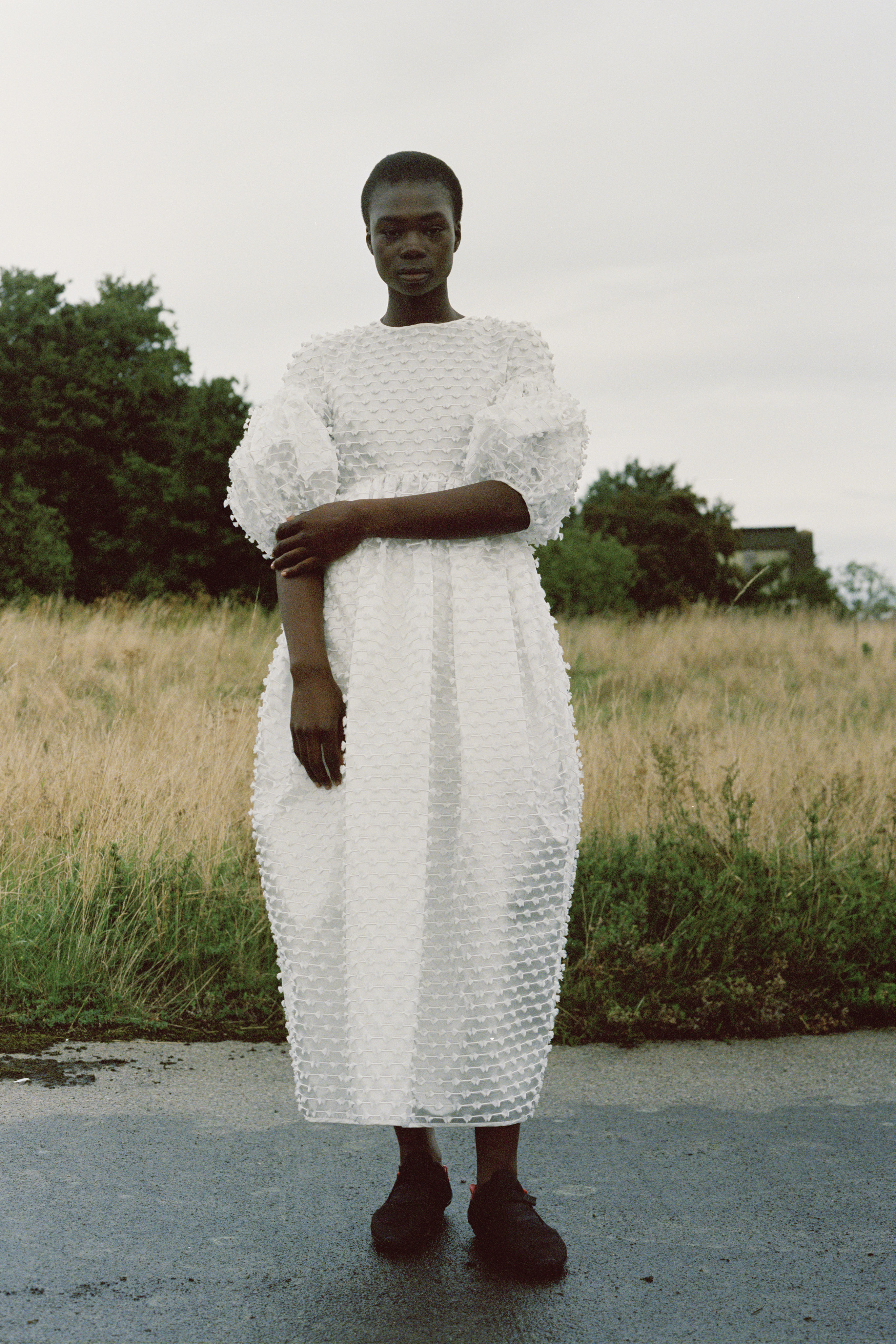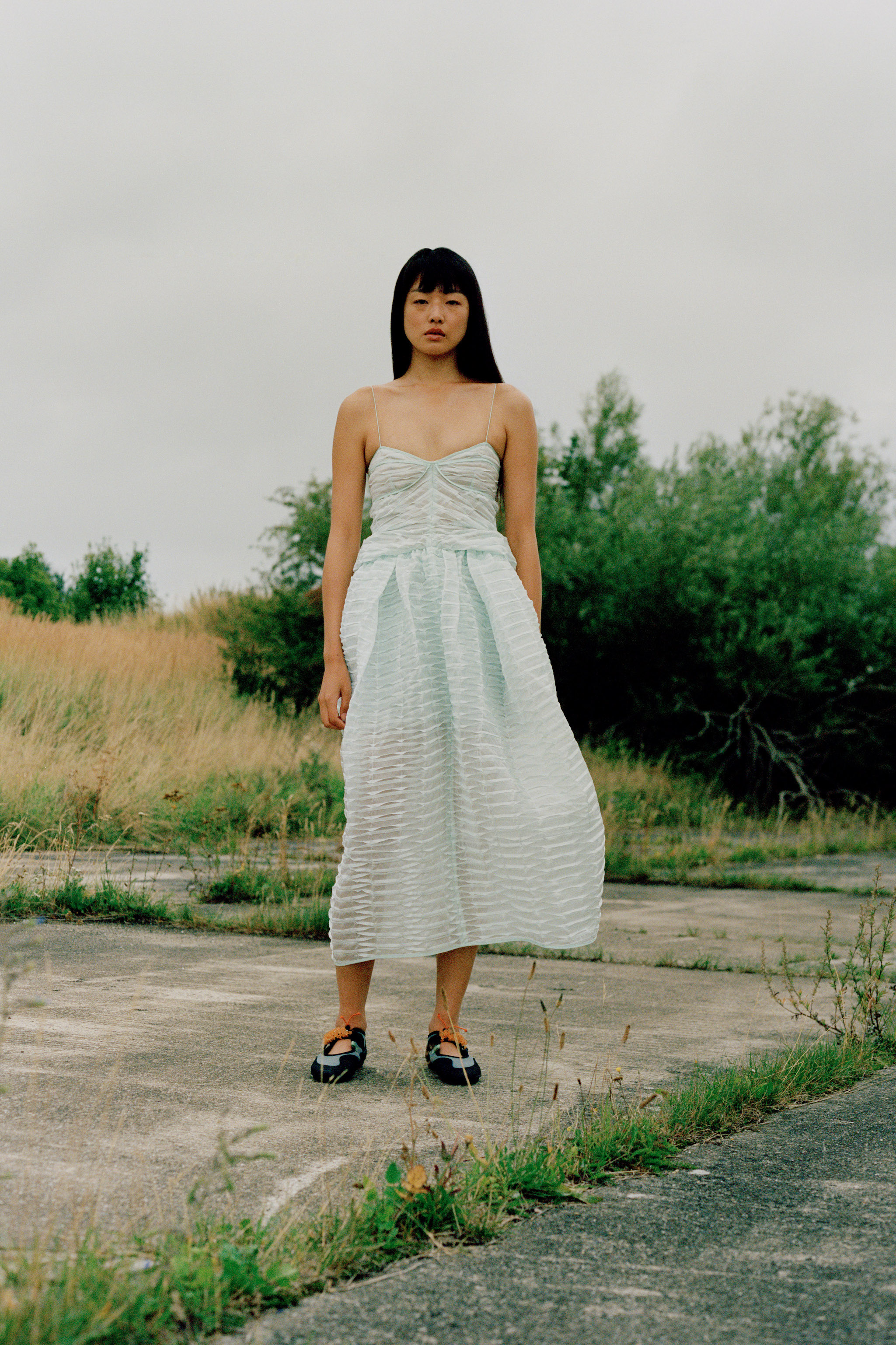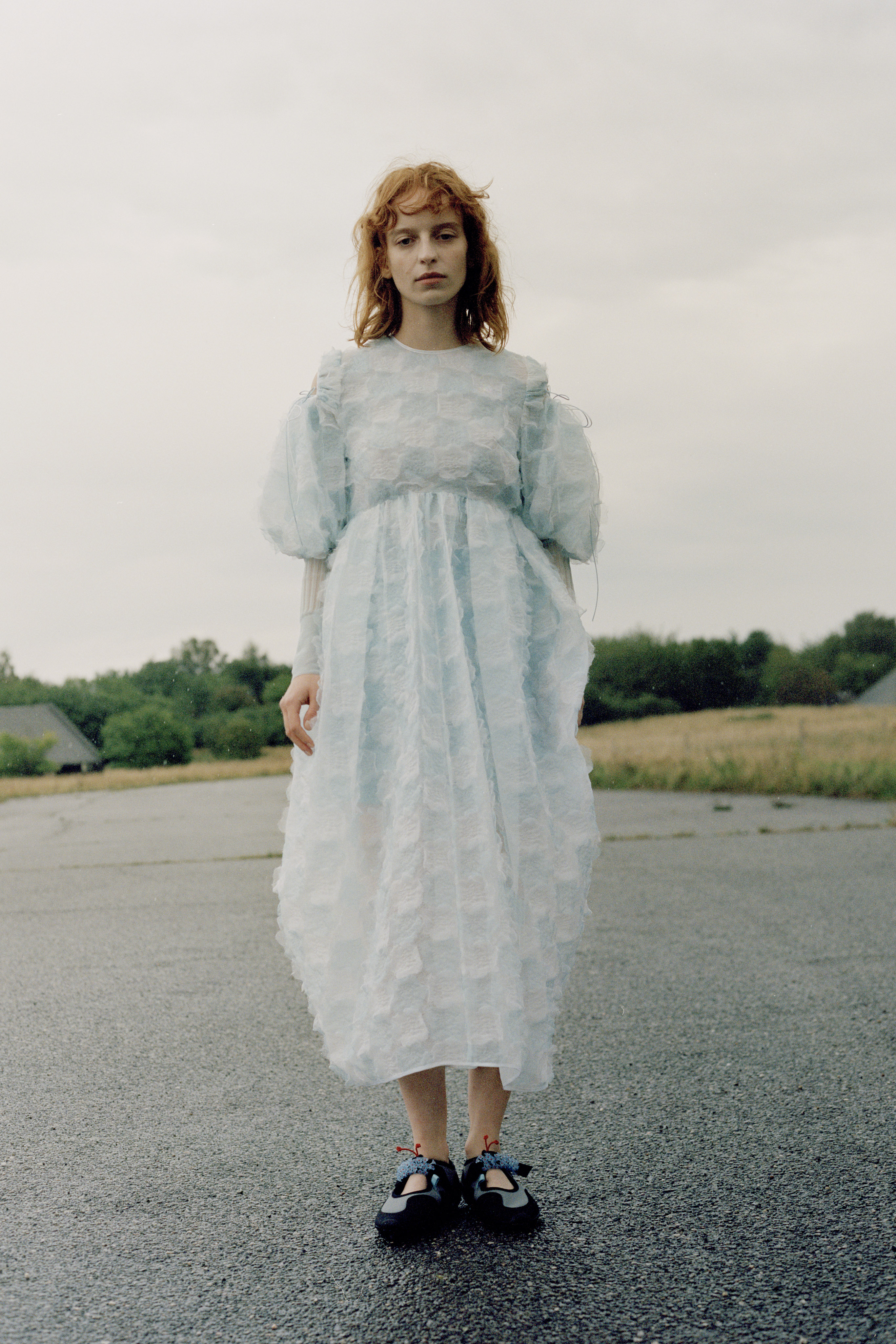 The conceptual motifs play a pivotal role in the collection, translated meticulously across the different fabrics. Textures completely unique, a touch only recognizable as Cecilie Bahnsen. Discreet tonal embroidery inspired by the Victorian style of cyanotype printing, the negative space creating an elevated texture.