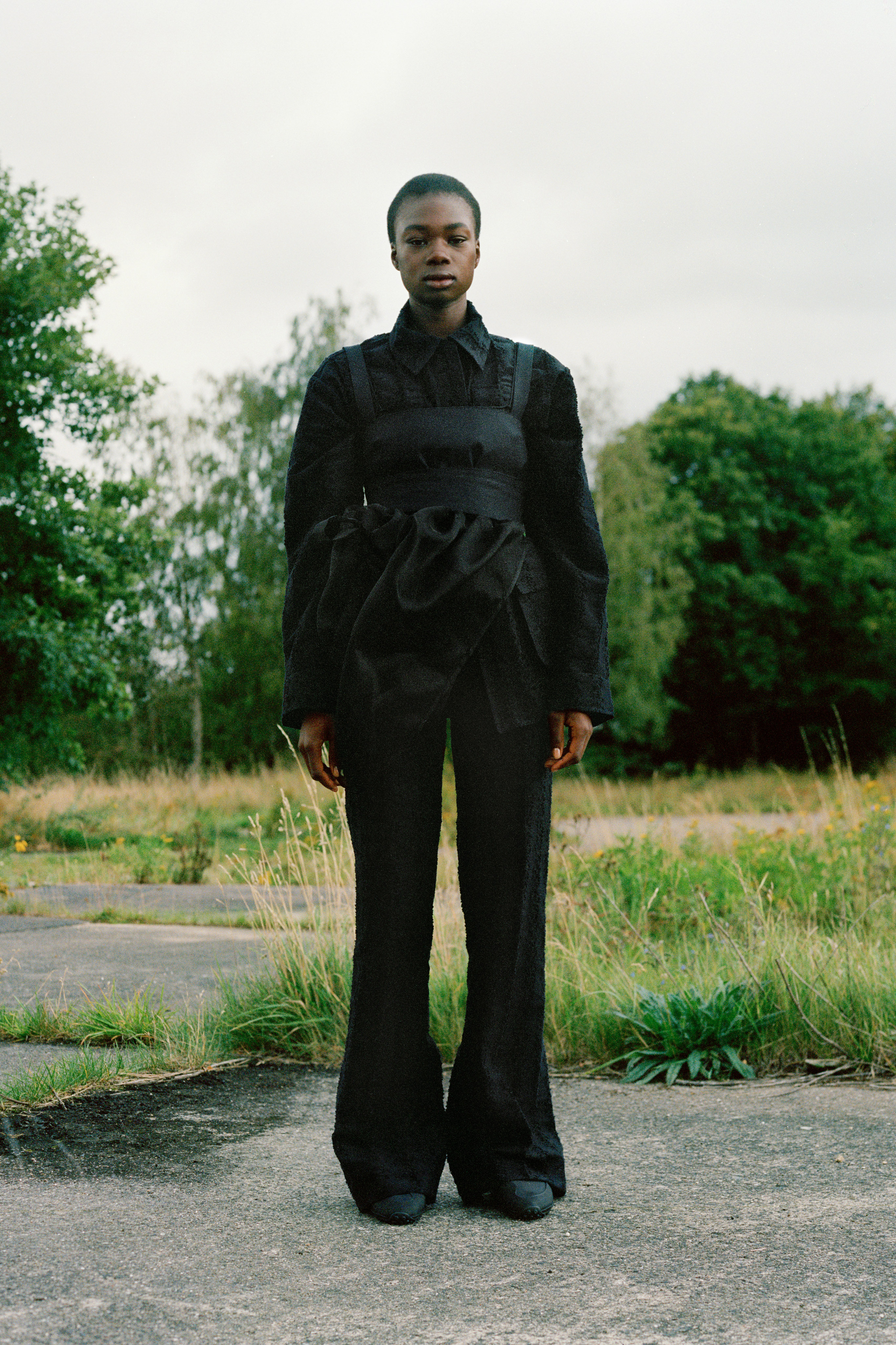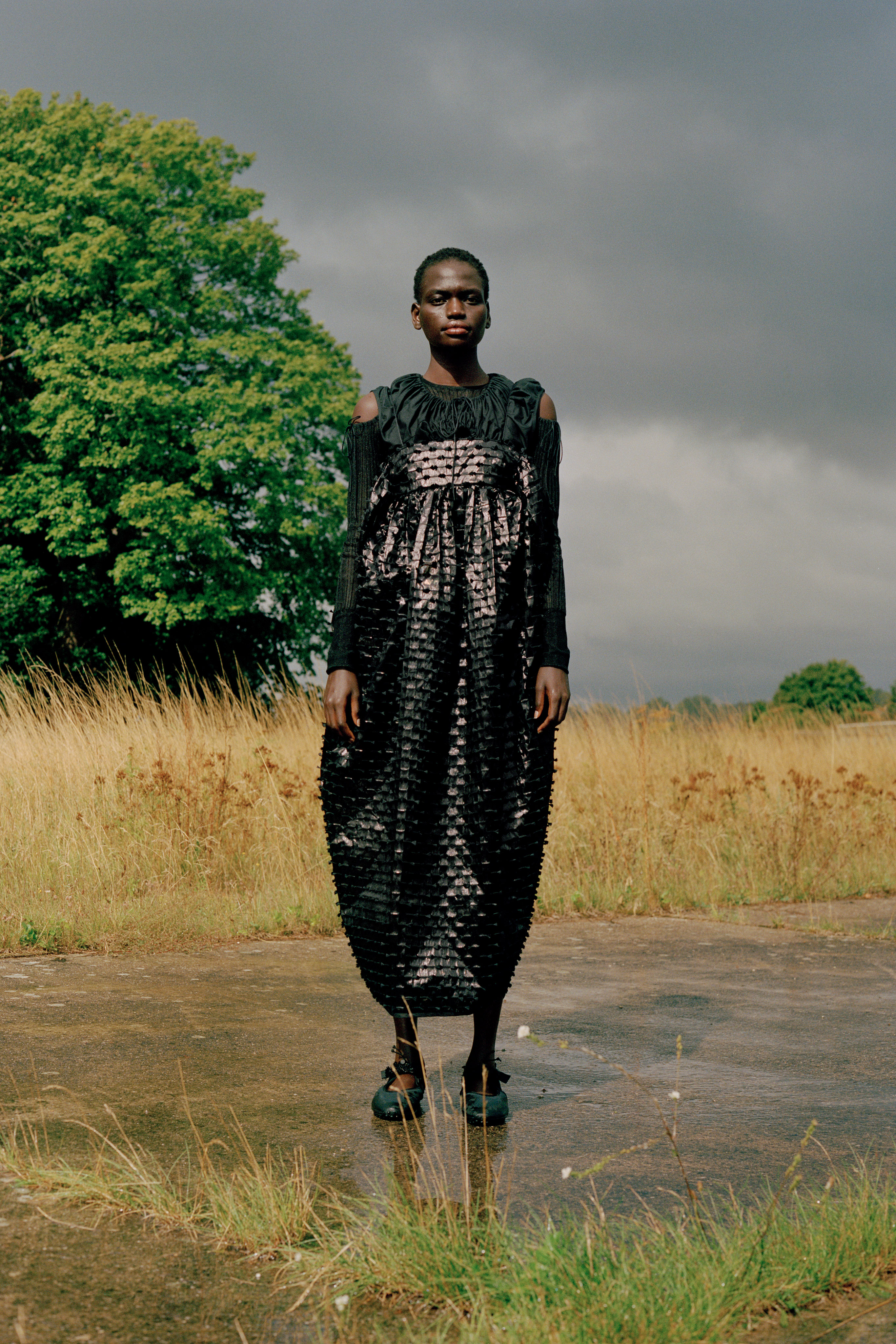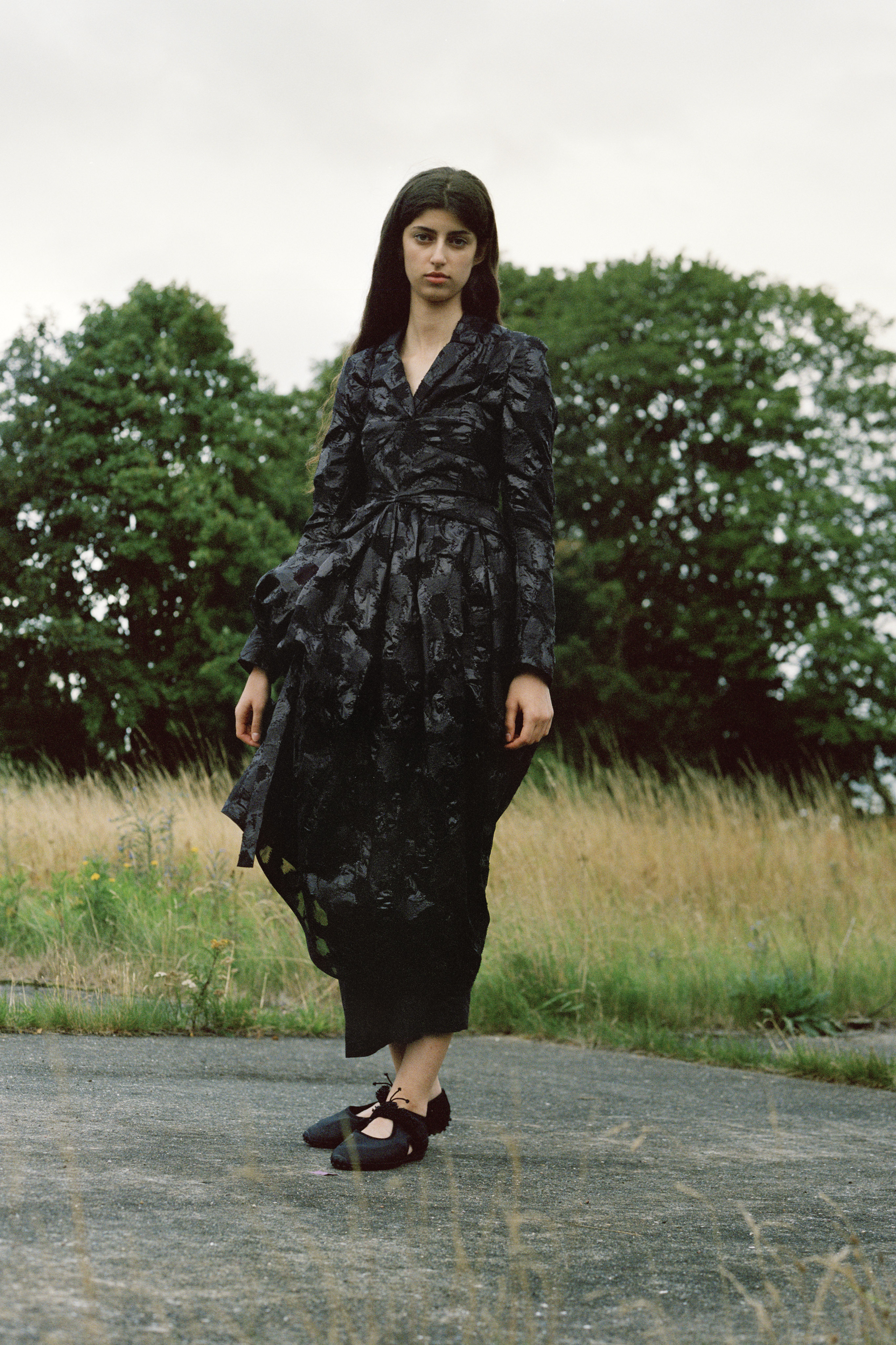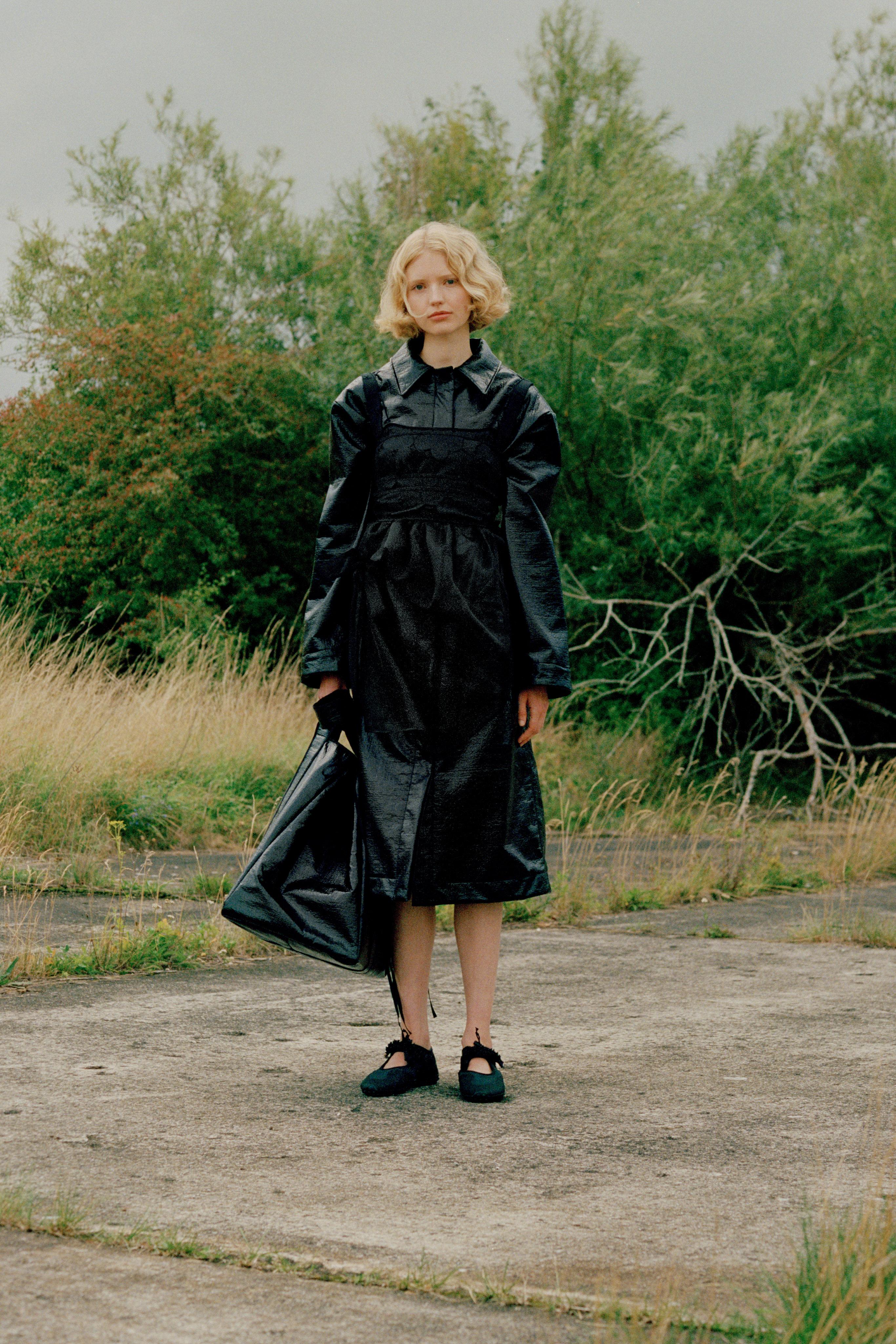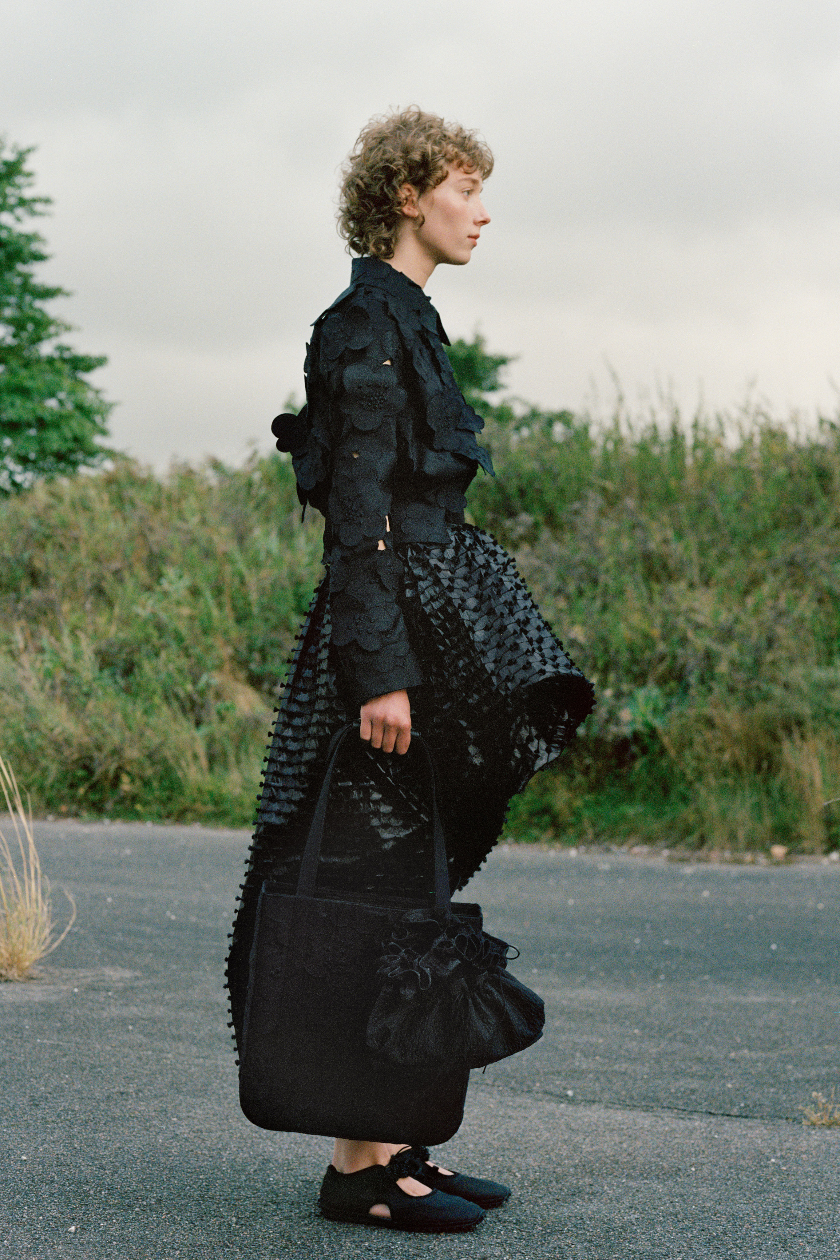 Drawing on the expertise of true craftsman, Cecilie continues her ongoing collaboration with Mackintosh, bringing a superfeminine approach to the masculine utilitarian function of the British heritage brand’s outerwear. For the first time, in partnership with Japanese heritage brand Chacoli, Cecilie has created a bag. The seemingly simple concept of a structural shell tote bag but crafted to withhold the test of time, functional and utilitarian the eponymous masculine contrast to the collection. New this season, after several collaborations, Cecilie has created her own shoes, inspired by the outdoor mountaineering forms, embellished with signature fabric detailing and embroidered flower beading.
