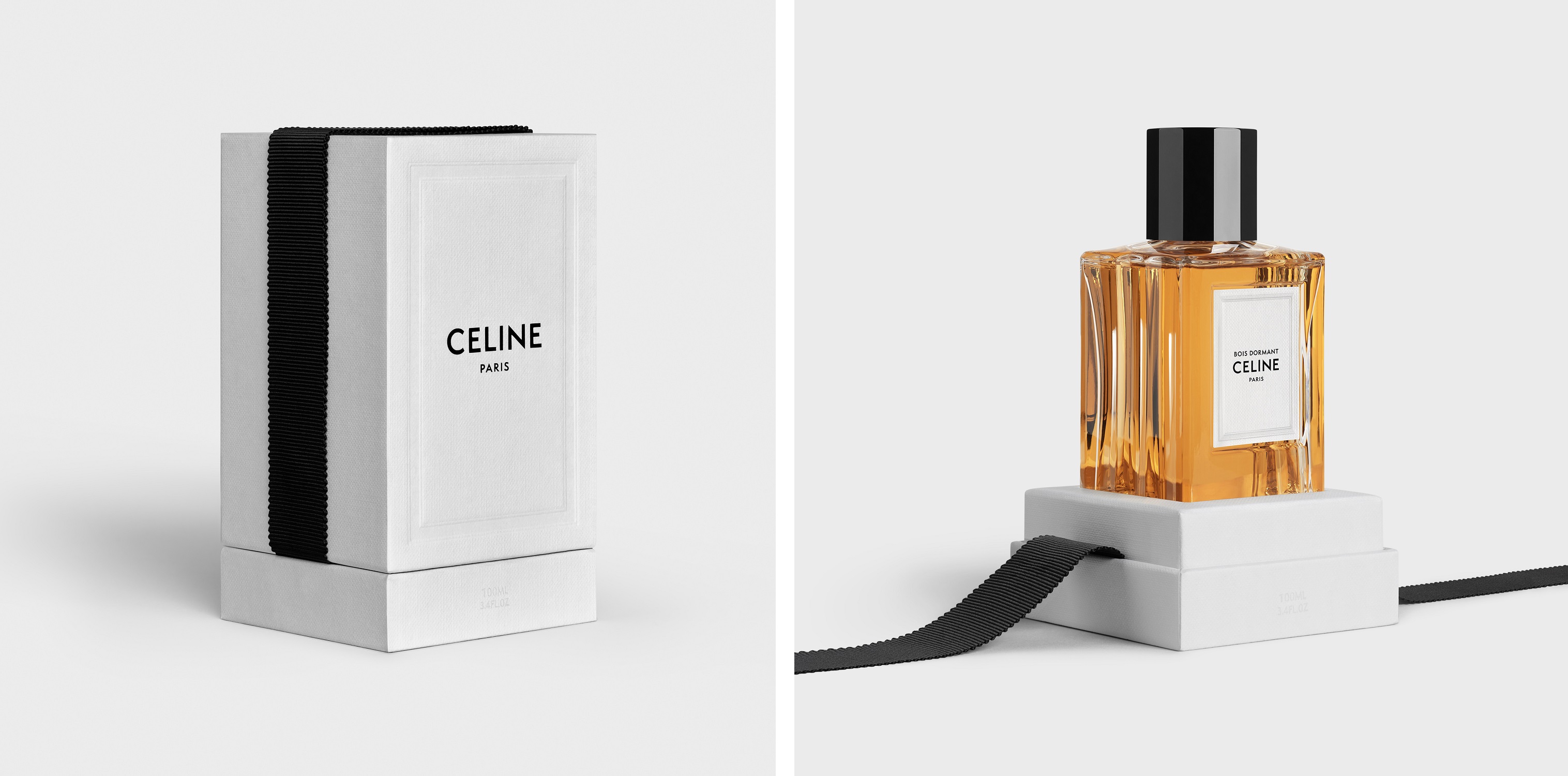 The bottle for the Celine haute parfumerie collection is decorated on two sides with sharp-edged fluting and topped with a faceted black lacquered cap. The aesthetic is inherited from late 17th-century classicism translated with a distinctive minimalism that imbues the bottle with the modernity of art deco. Through fine workmanship, the spare, exact lines of transparent glass reveal amber-gold reflections that highlight the nuances of each perfume. The box is adorned in paper with a "Grain de Poudre" feel and embossing that recreates the effect of the "Grand Siècle" mouldings inspired by the woodwork panelling of the Celine ateliers at the Hotel Colbert de Torcy at 16, rue Vivienne in Paris. Engraved on the top of the cap is the maison's emblem, the "triomphe", that was chosen in 1971 by founder Céline Vipiana, who saw her first initial doubled within the links that encircled that arc de triomphe. In this way, the bottle is firmly associated with the history of the couture house.
