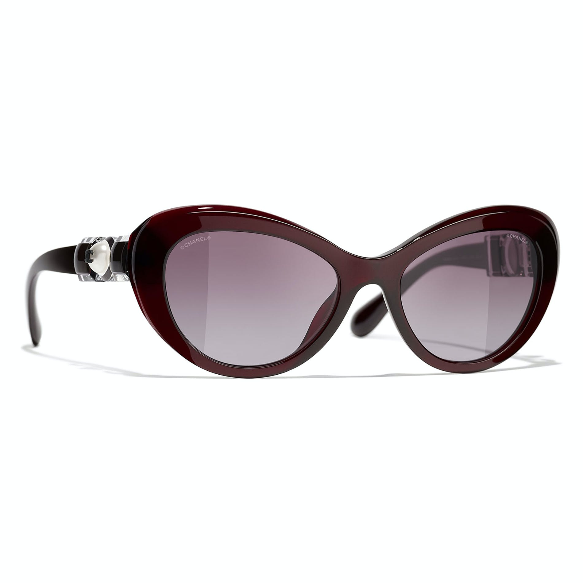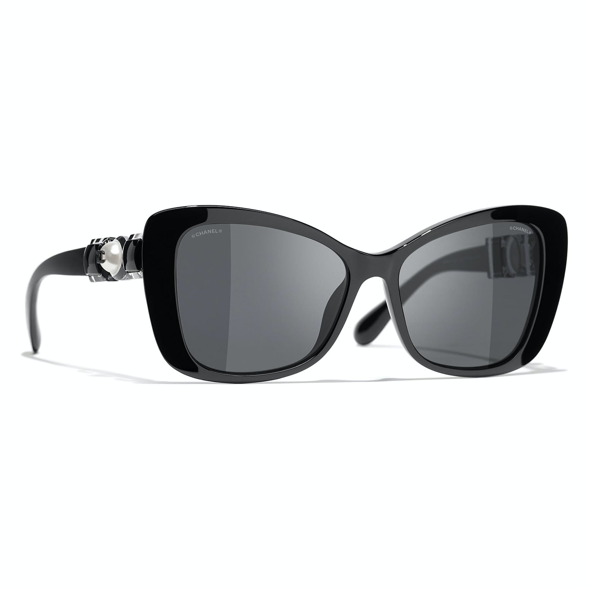 A byzantine aesthetic touches two pairs of sunglasses, one a cat-eye, the other a butterfly design. Their acetate frame is embellished on the temples with a pearl topped with a double C and two resin cabochons, just like the stones on the byzantine crosses so cherished by Gabrielle Chanel.