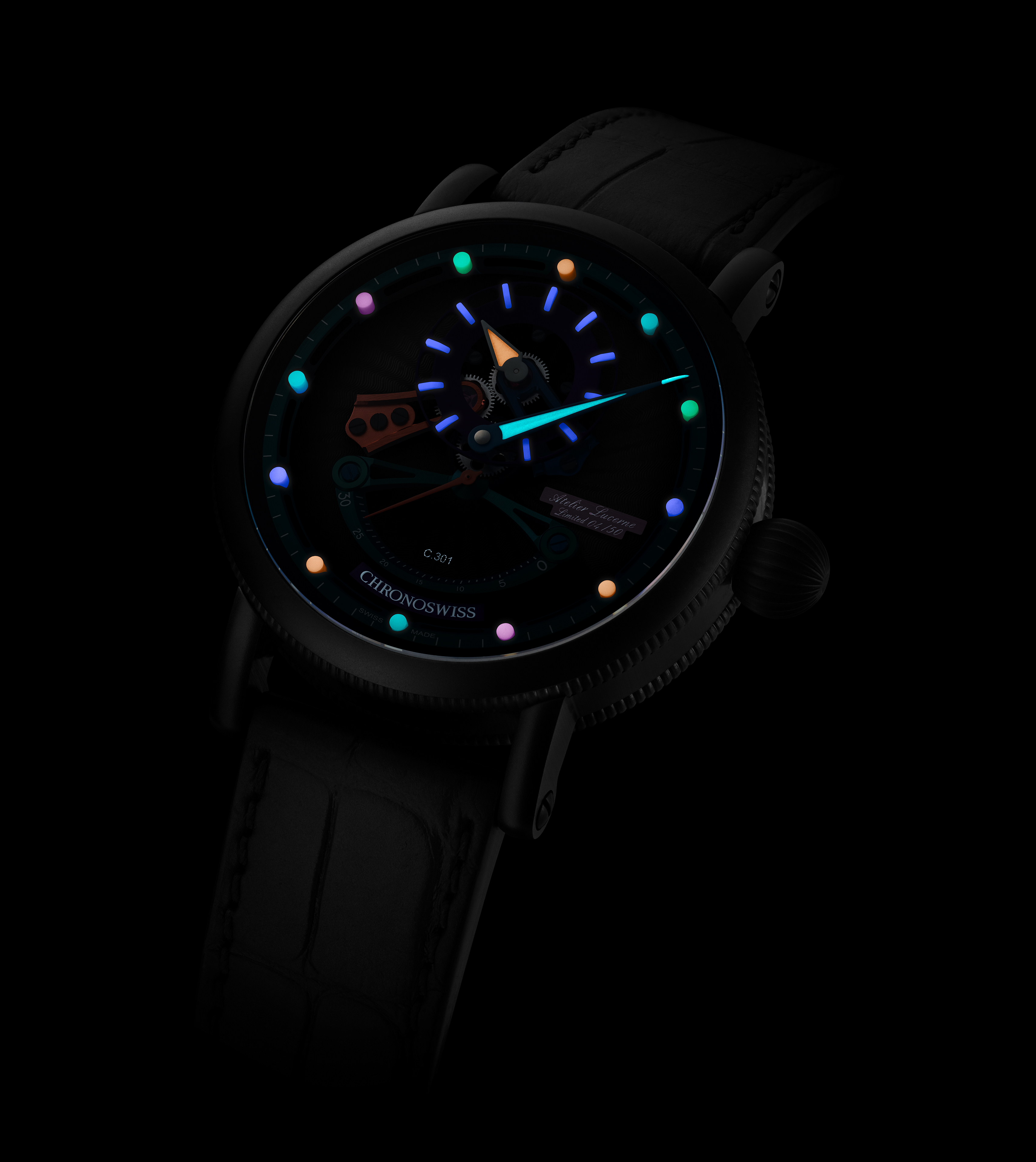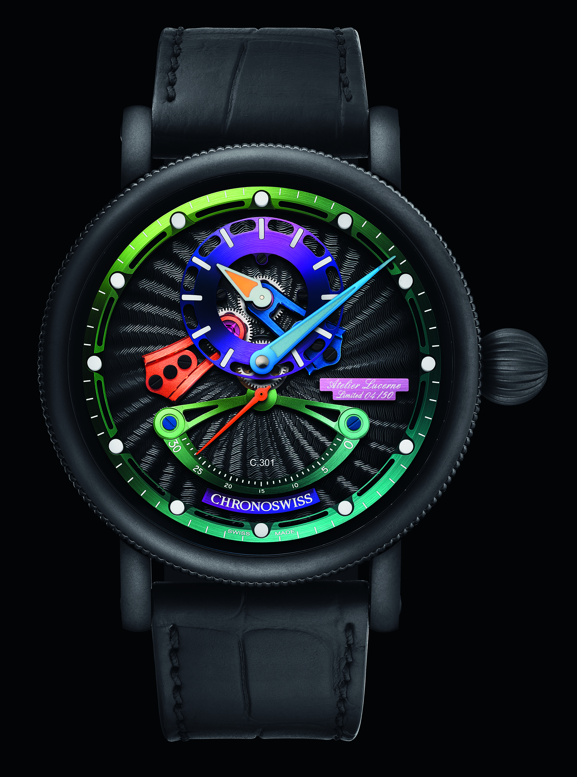 The provocative watchmaker’s interpretation of a Candy Shop is embedded into a bold DLC-coated 44mm case in black and powered by the reliable Chronoswiss C.301 movement.