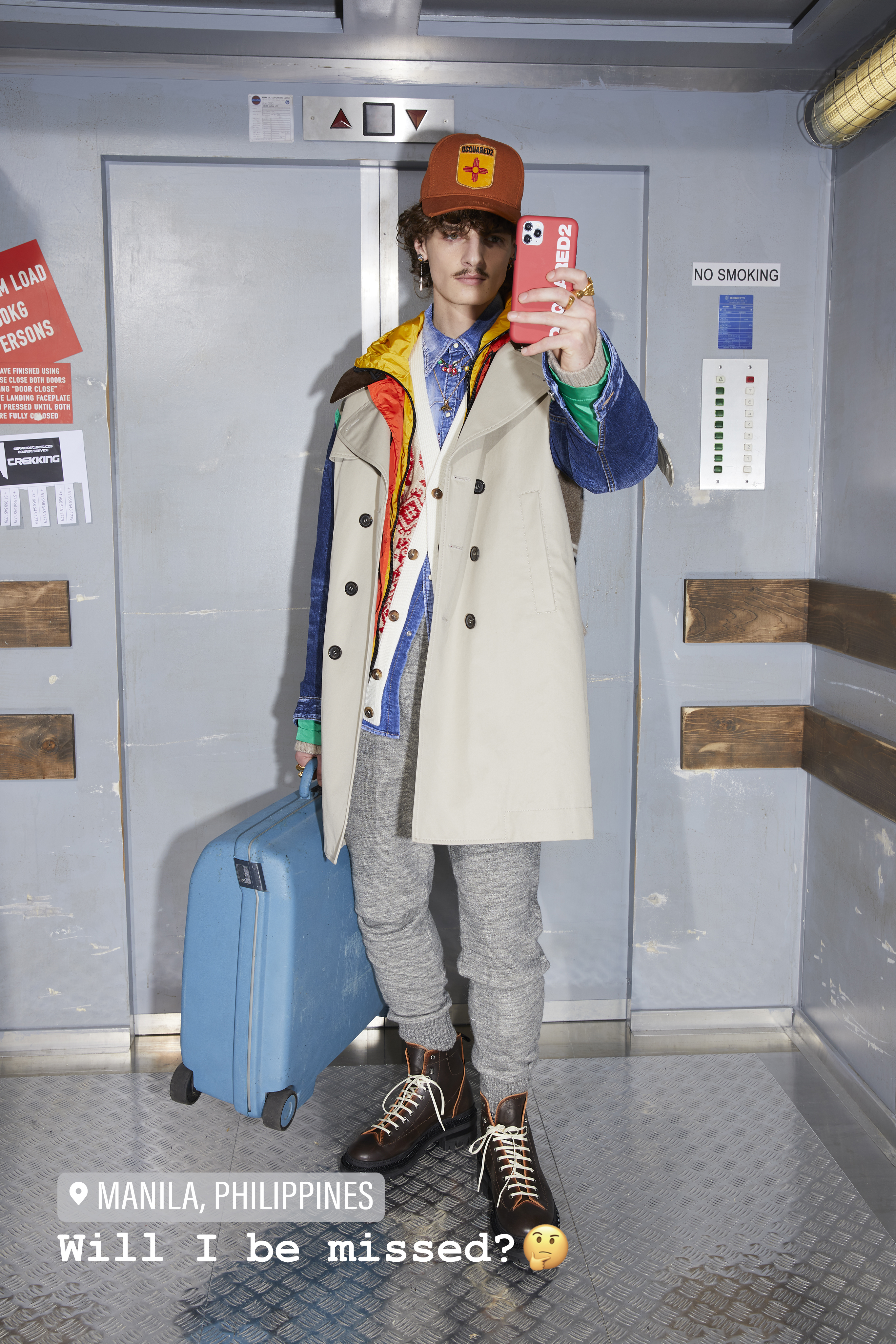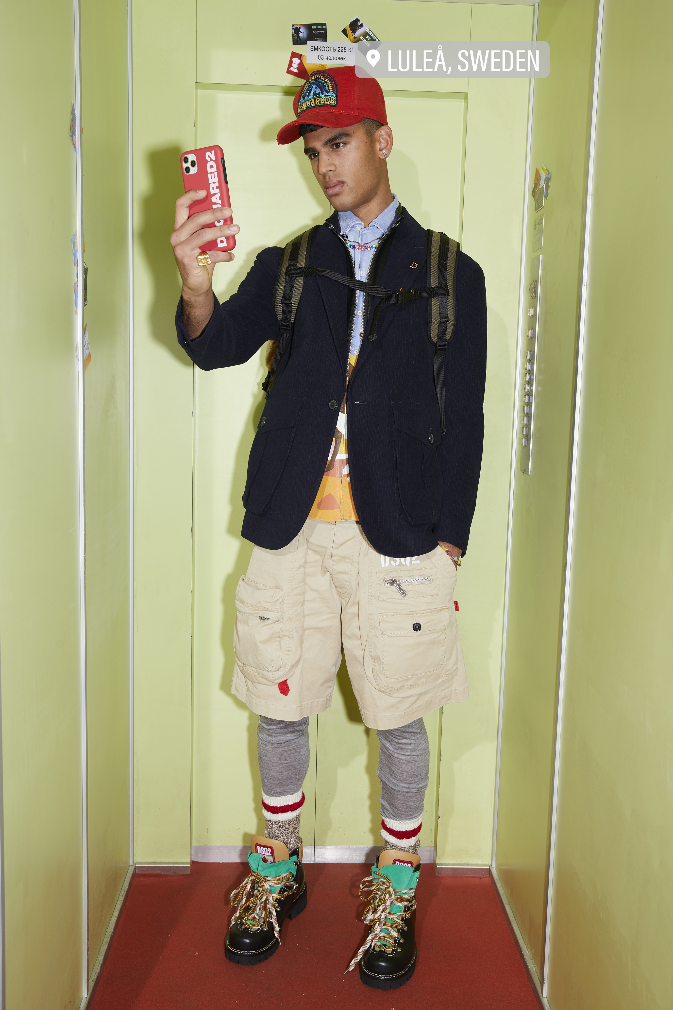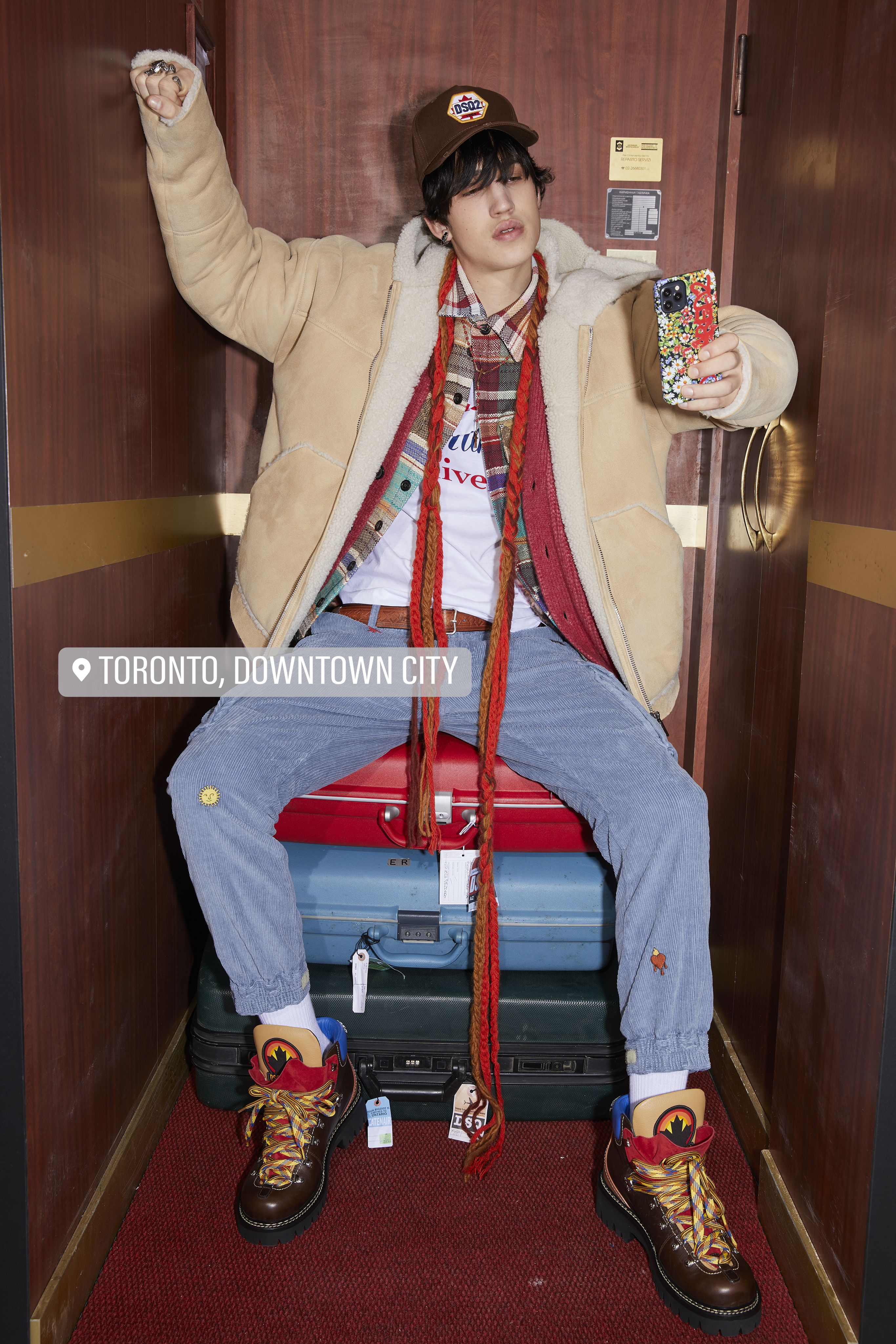 Headed for the road, Dsquared2’s worldwide wanderer is destined for the places he’s already travelled in his mind. The Pre-Fall 22 collection is the wardrobe for the journey, mixed with the pieces he found on the way. His suitcase is a mashup of his favourite travelling style, and new looks inspired by the possibilities of the places to be discovered. One day he’s outdoors under the falling leaves of nature never seen, another meeting new friends on a rooftop towering amongst a foreign city’s skyscrapers.