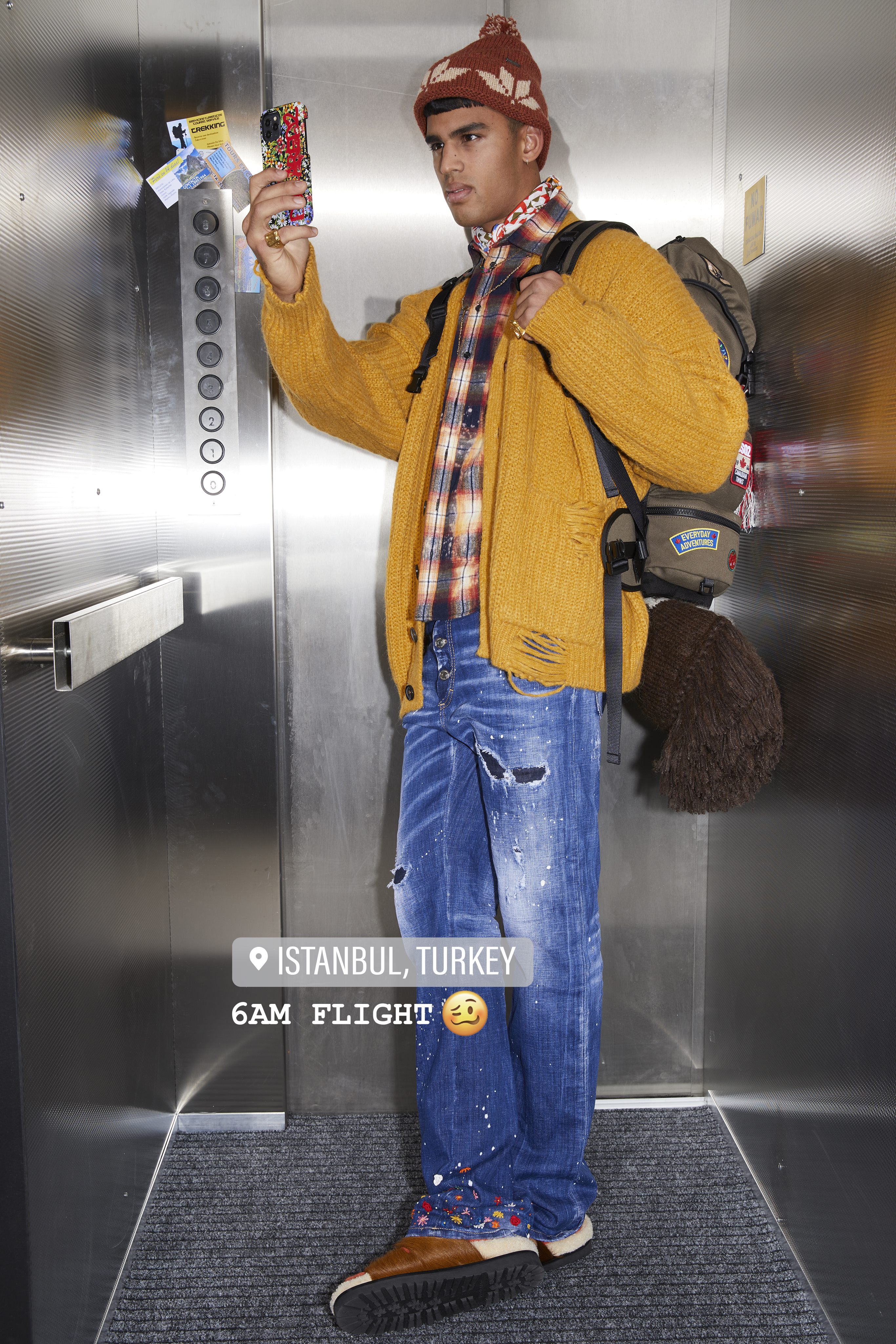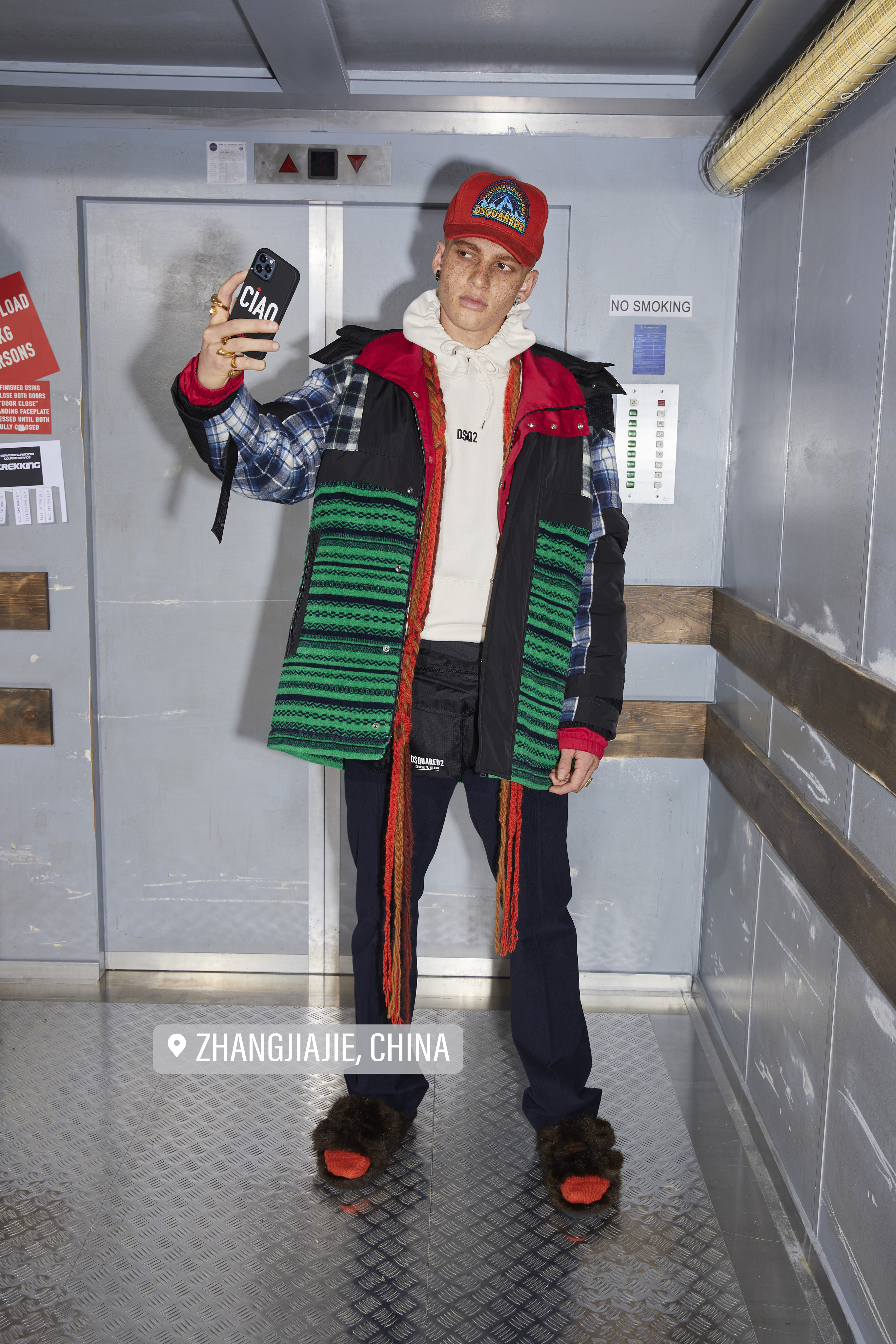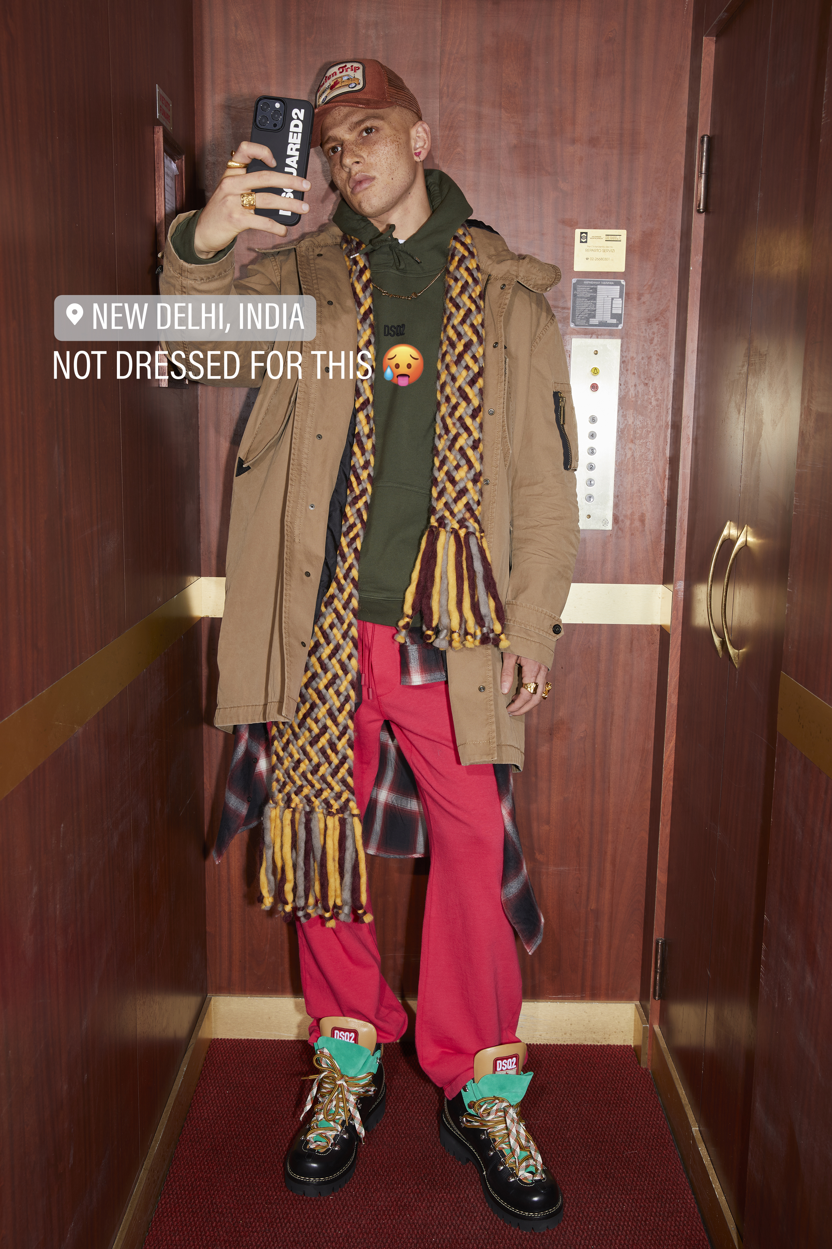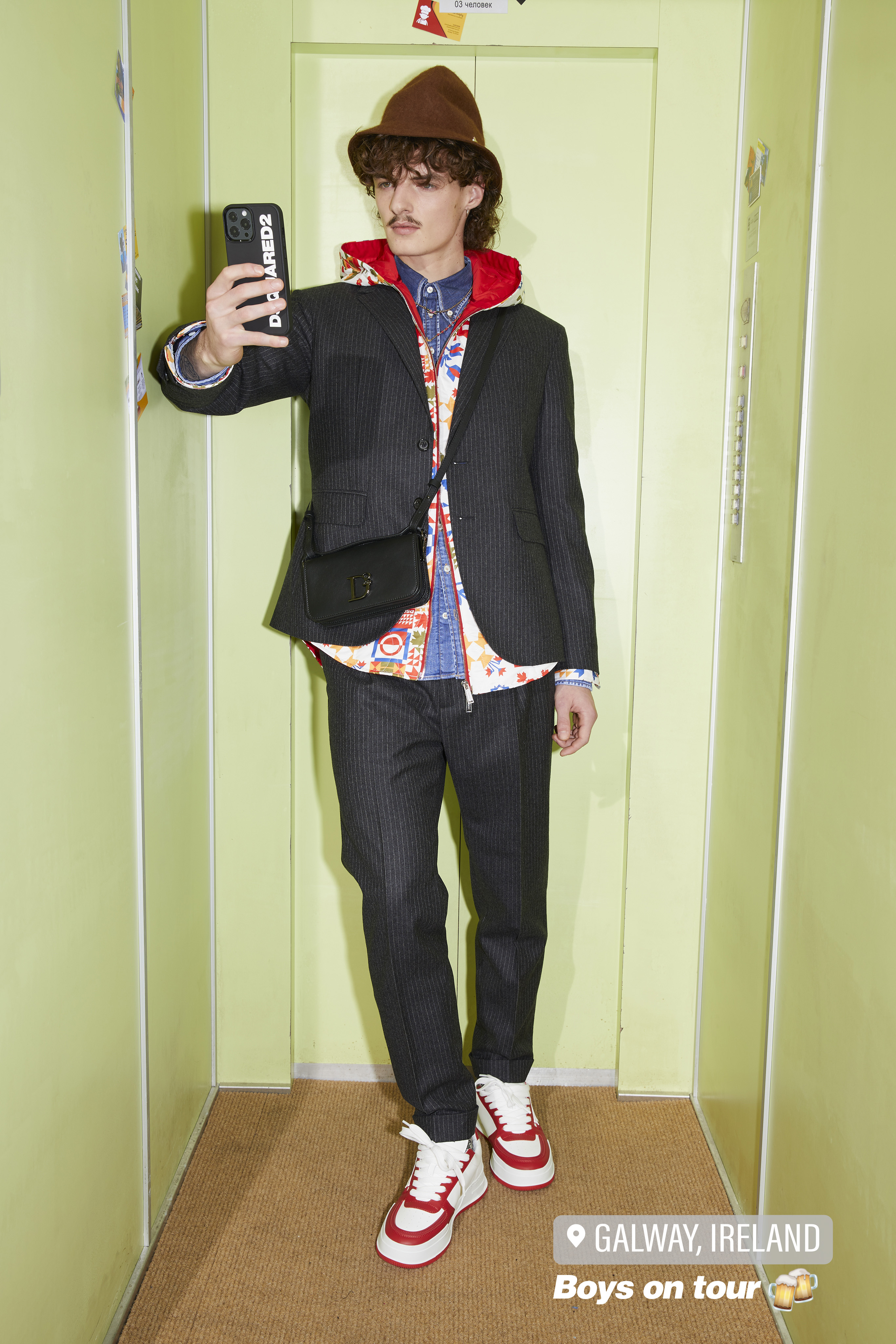 Headed for the road, Dsquared2’s worldwide wanderer is destined for the places he’s already travelled in his mind. The Pre-Fall 22 collection is the wardrobe for the journey, mixed with the pieces he found on the way. His suitcase is a mashup of his favourite travelling style, and new looks inspired by the possibilities of the places to be discovered. One day he’s outdoors under the falling leaves of nature never seen, another meeting new friends on a rooftop towering amongst a foreign city’s skyscrapers.