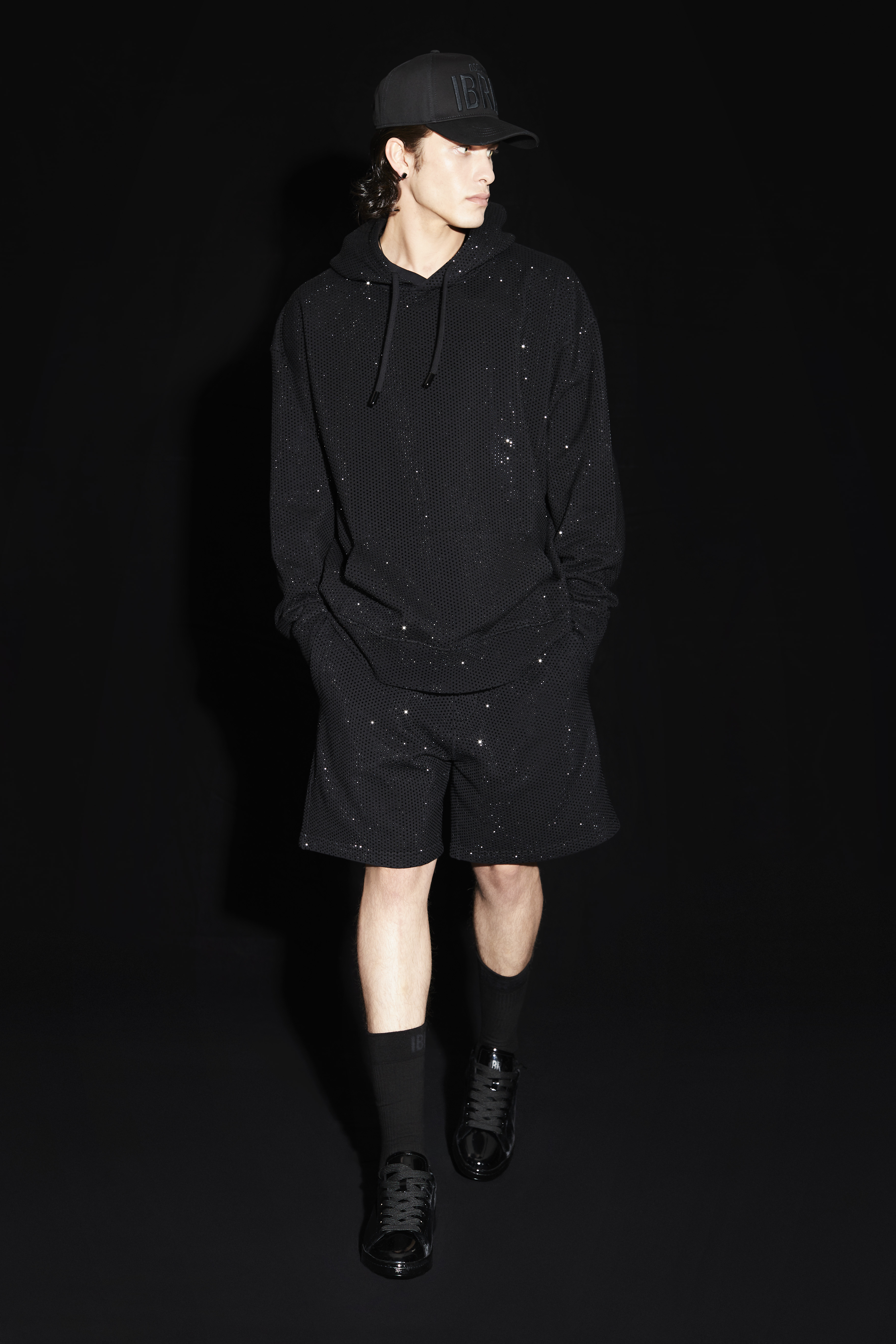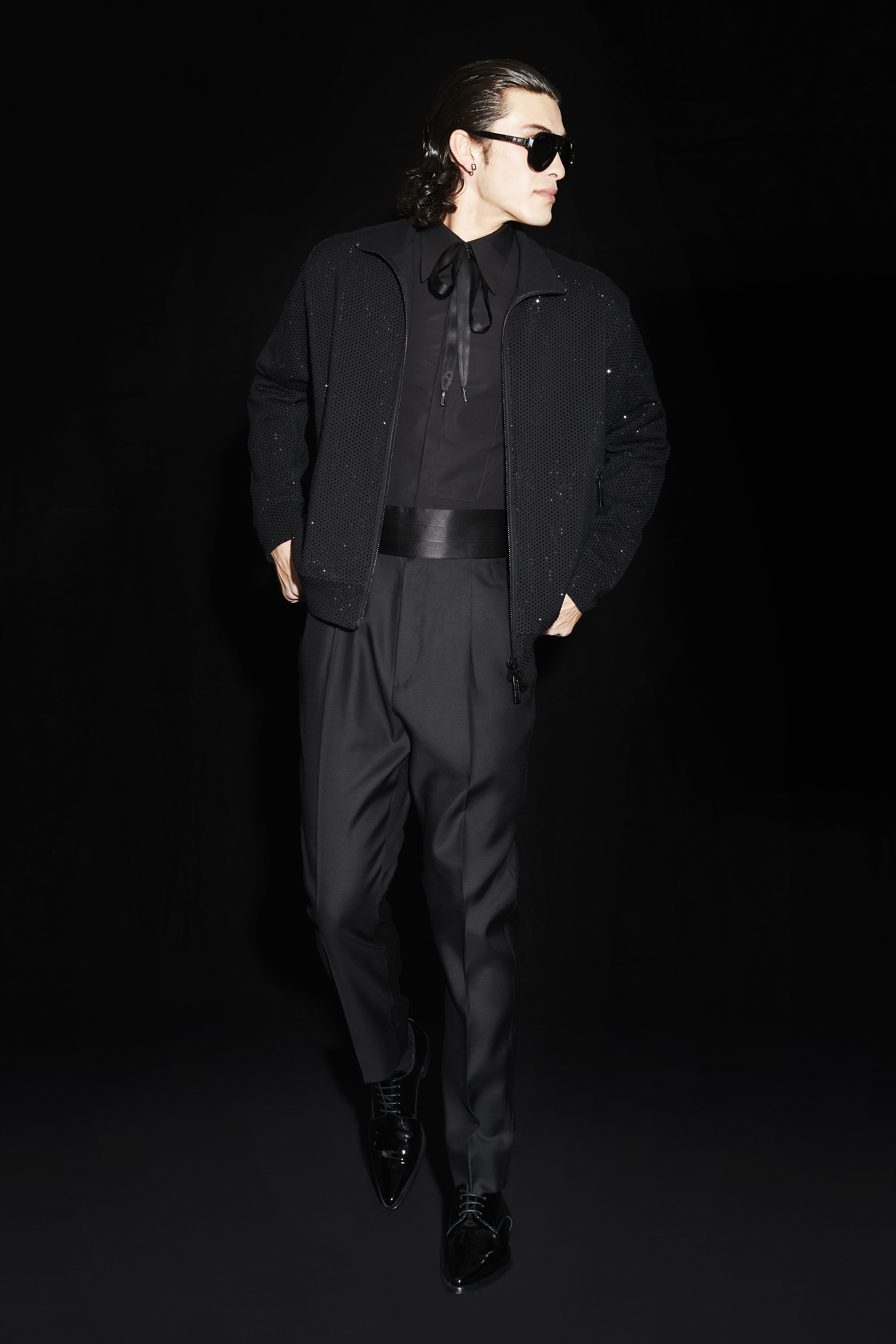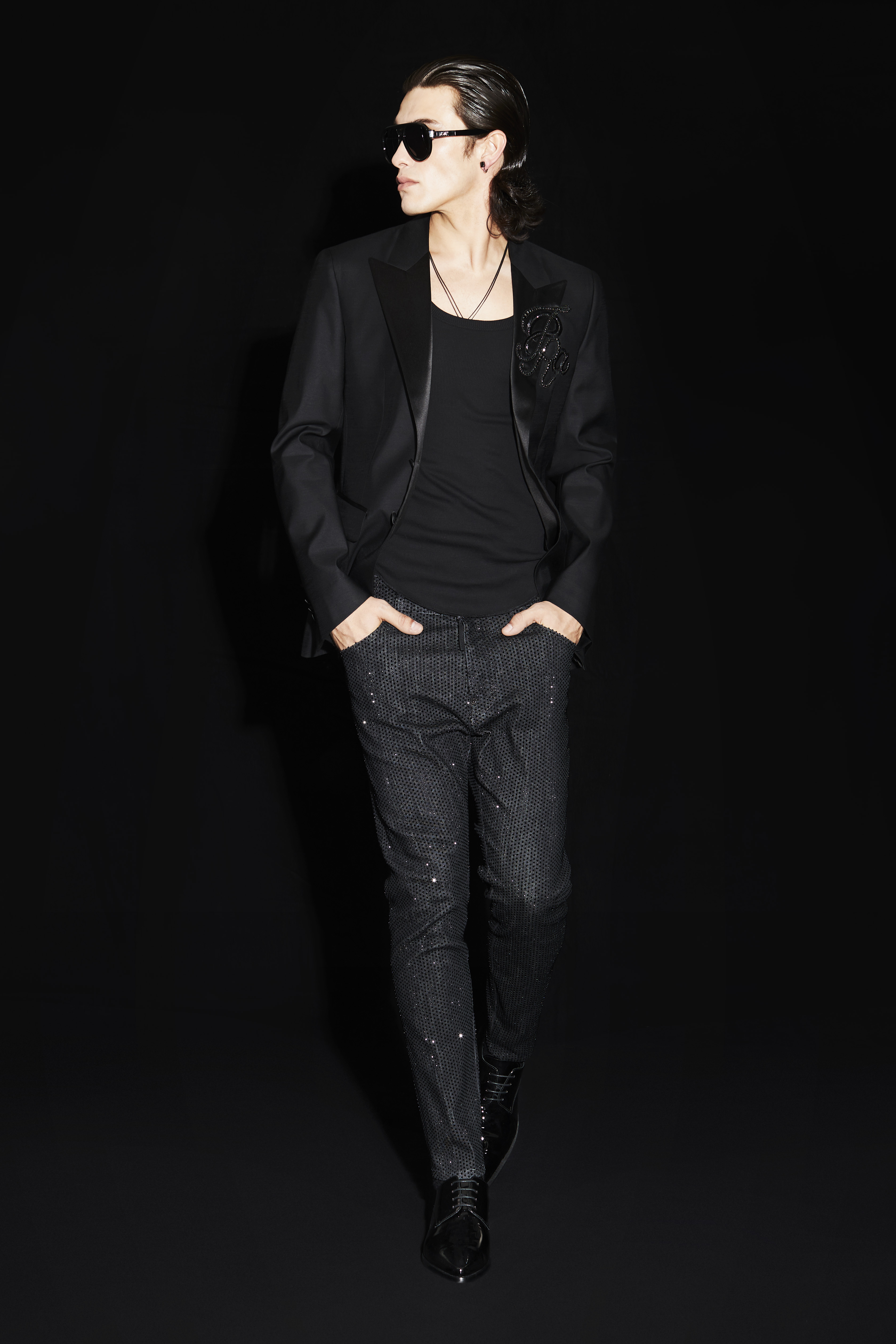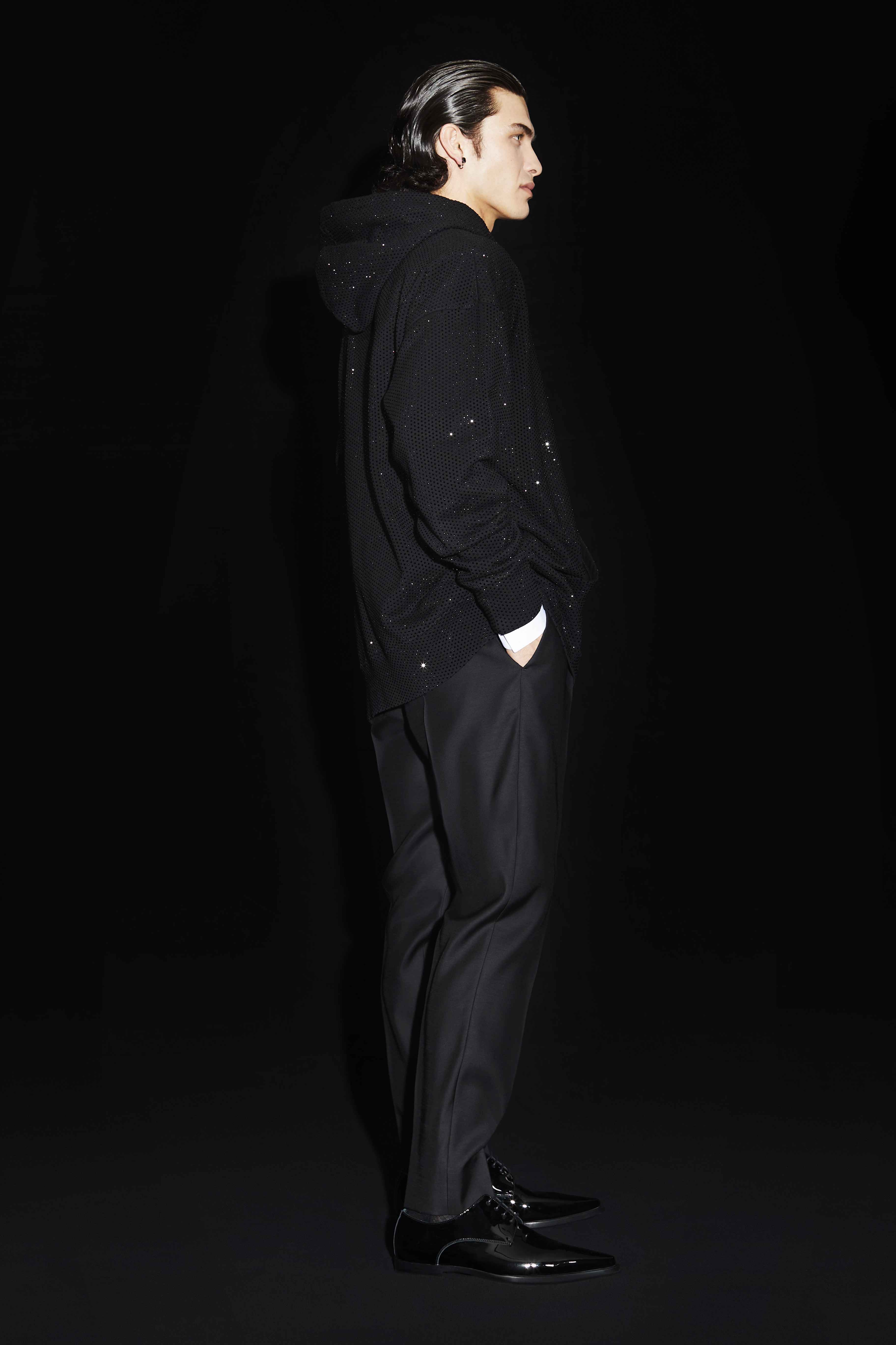 Eveningwear is a mix of contemporary and classic. The black tuxedo features a blazer, black tuxedo shirt, pleated pants and a slim bowtie and leather lace-ups. Unexpected evening looks are covered in a subtle shimmer of black crystals: jeans, a slouchy fit hoodie and relax fit shorts.