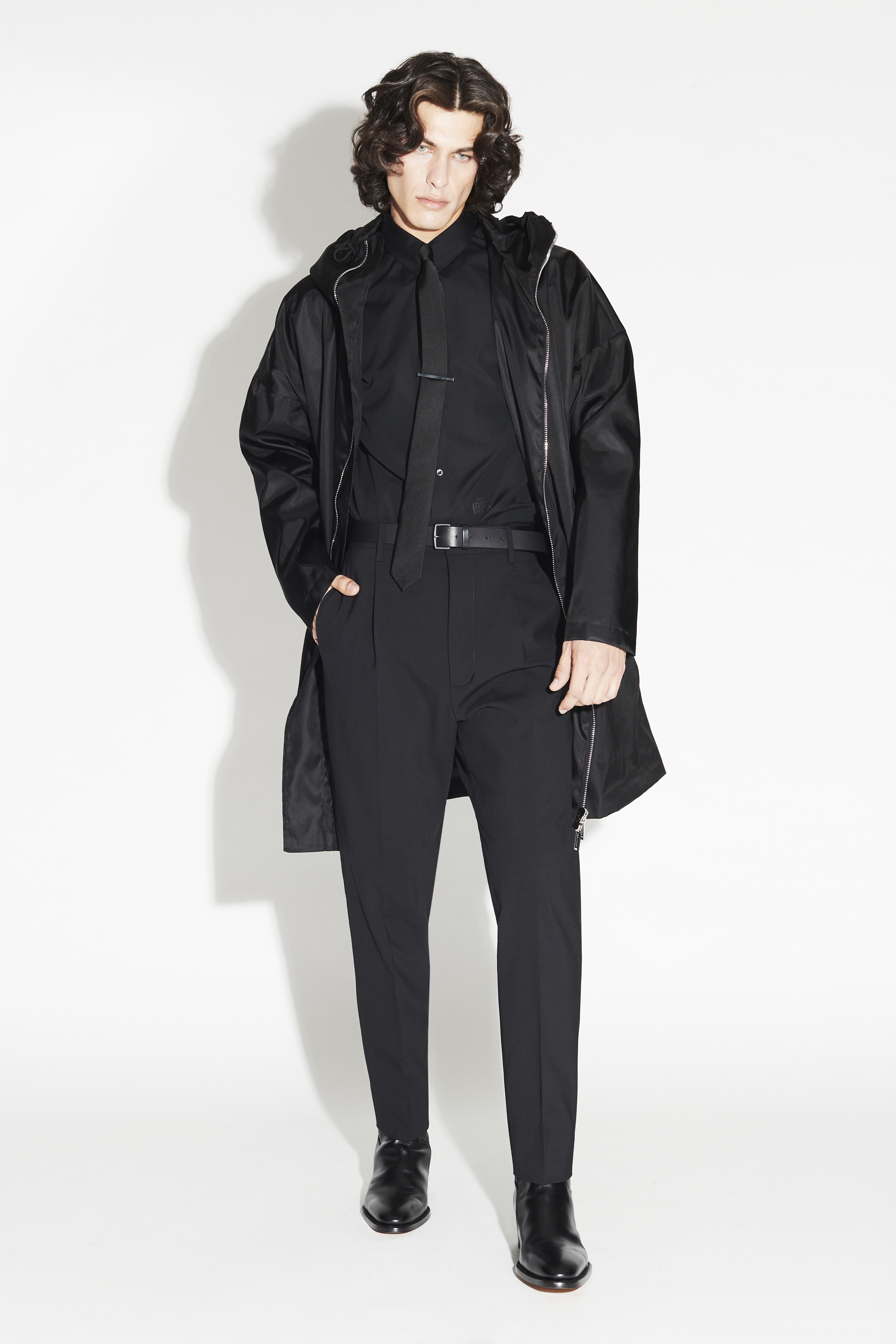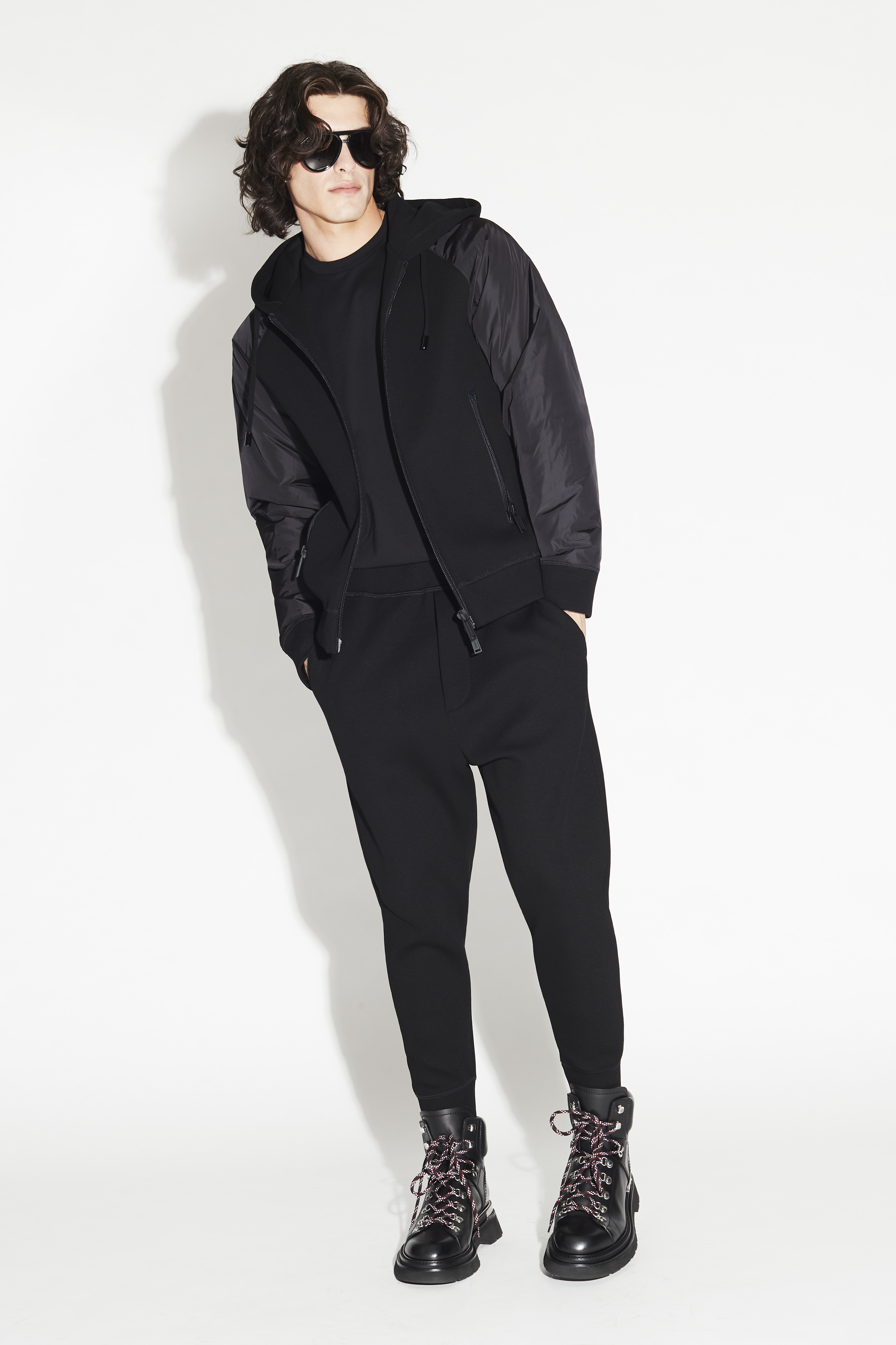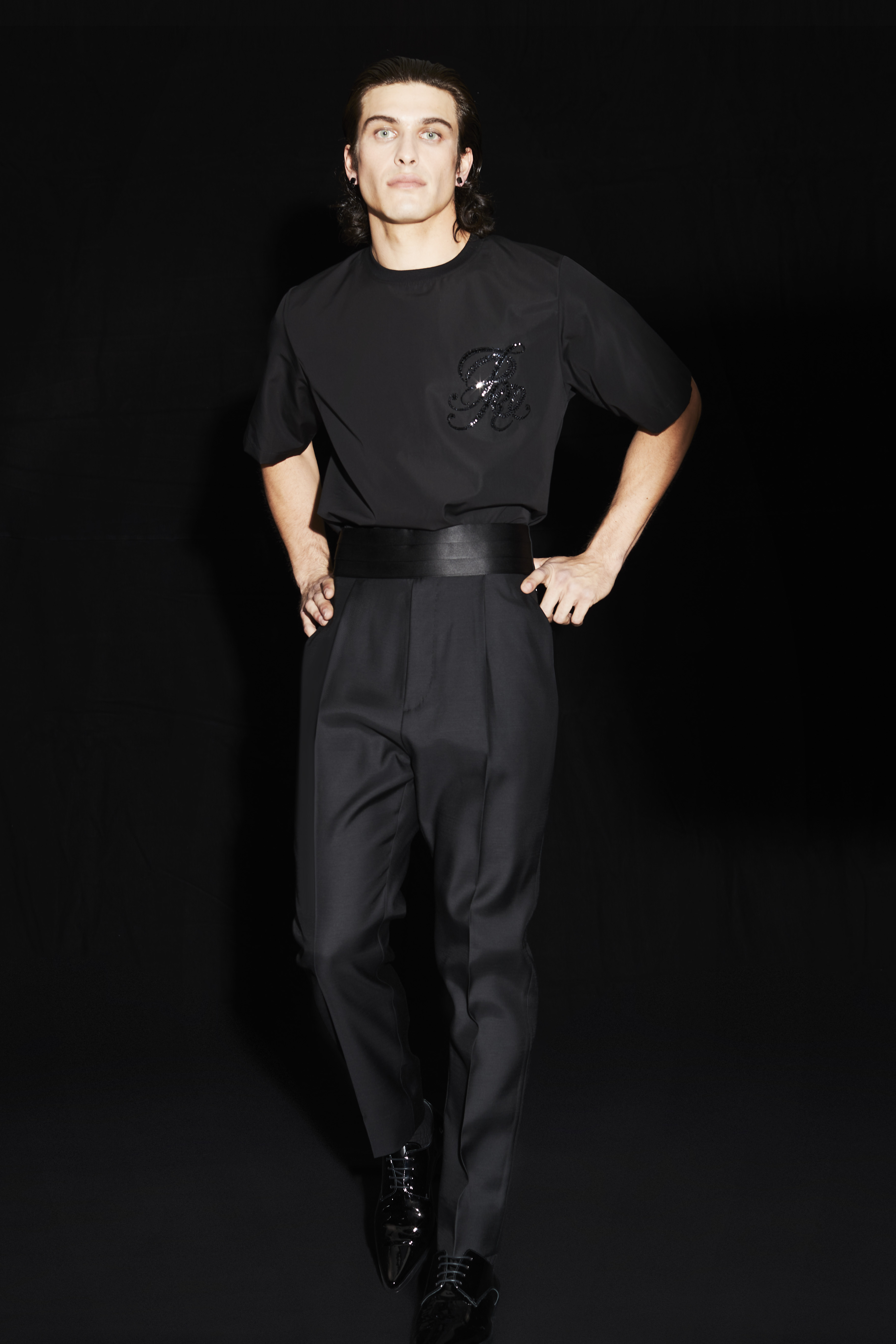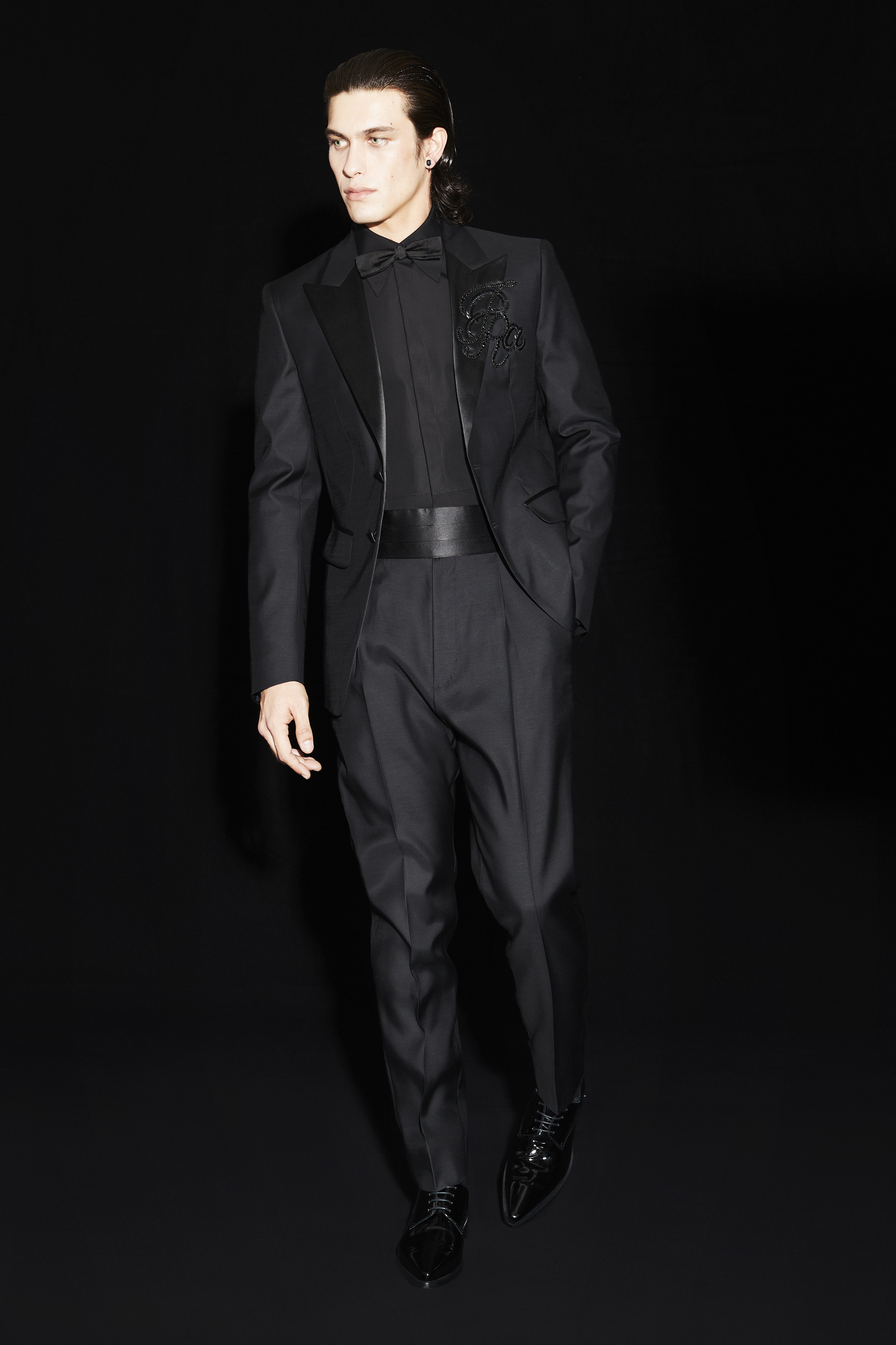 Eveningwear is a mix of contemporary and classic. The black tuxedo features a blazer, black tuxedo shirt, pleated pants and a slim bowtie and leather lace-ups. Unexpected evening looks are covered in a subtle shimmer of black crystals: jeans, a slouchy fit hoodie and relax fit shorts.