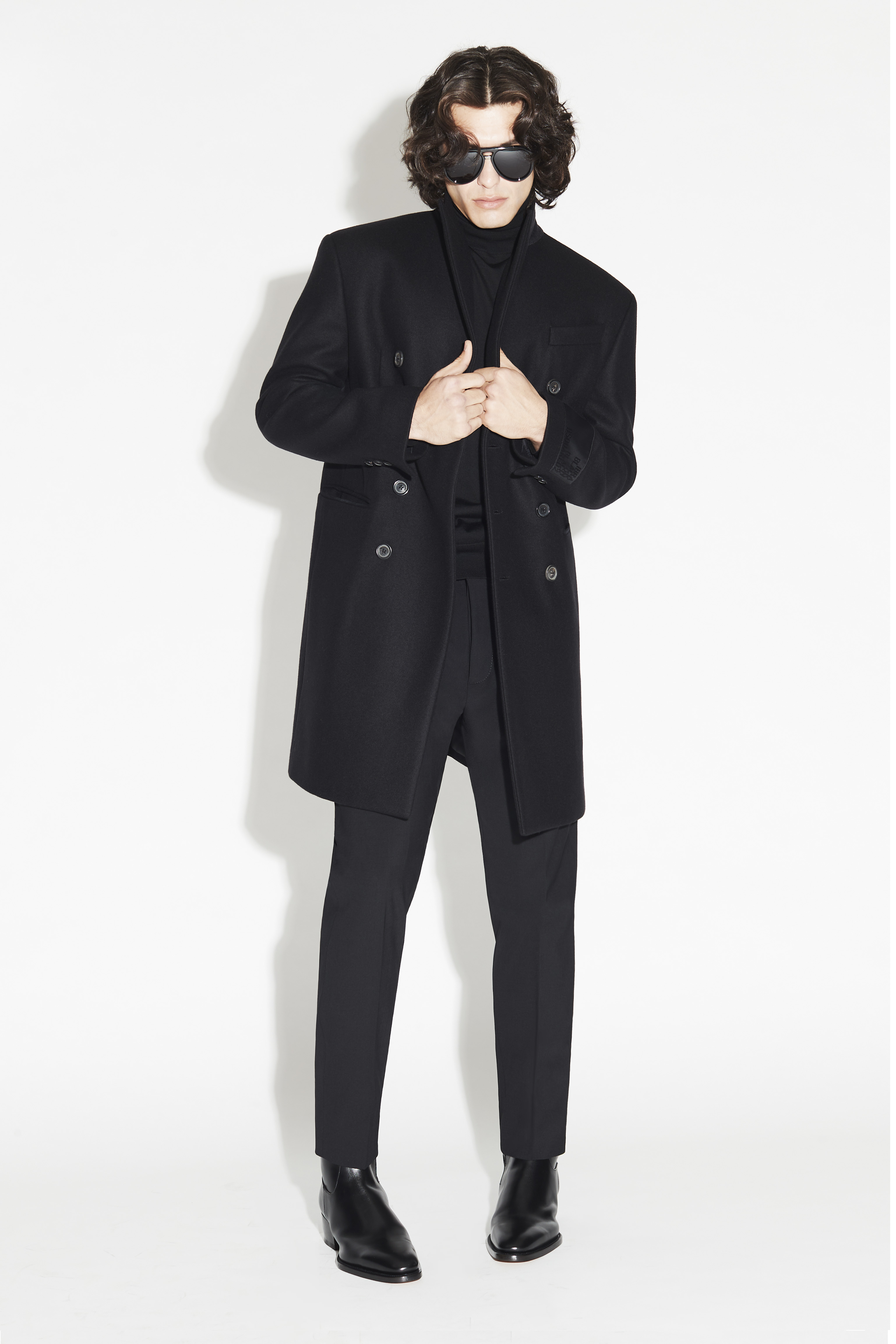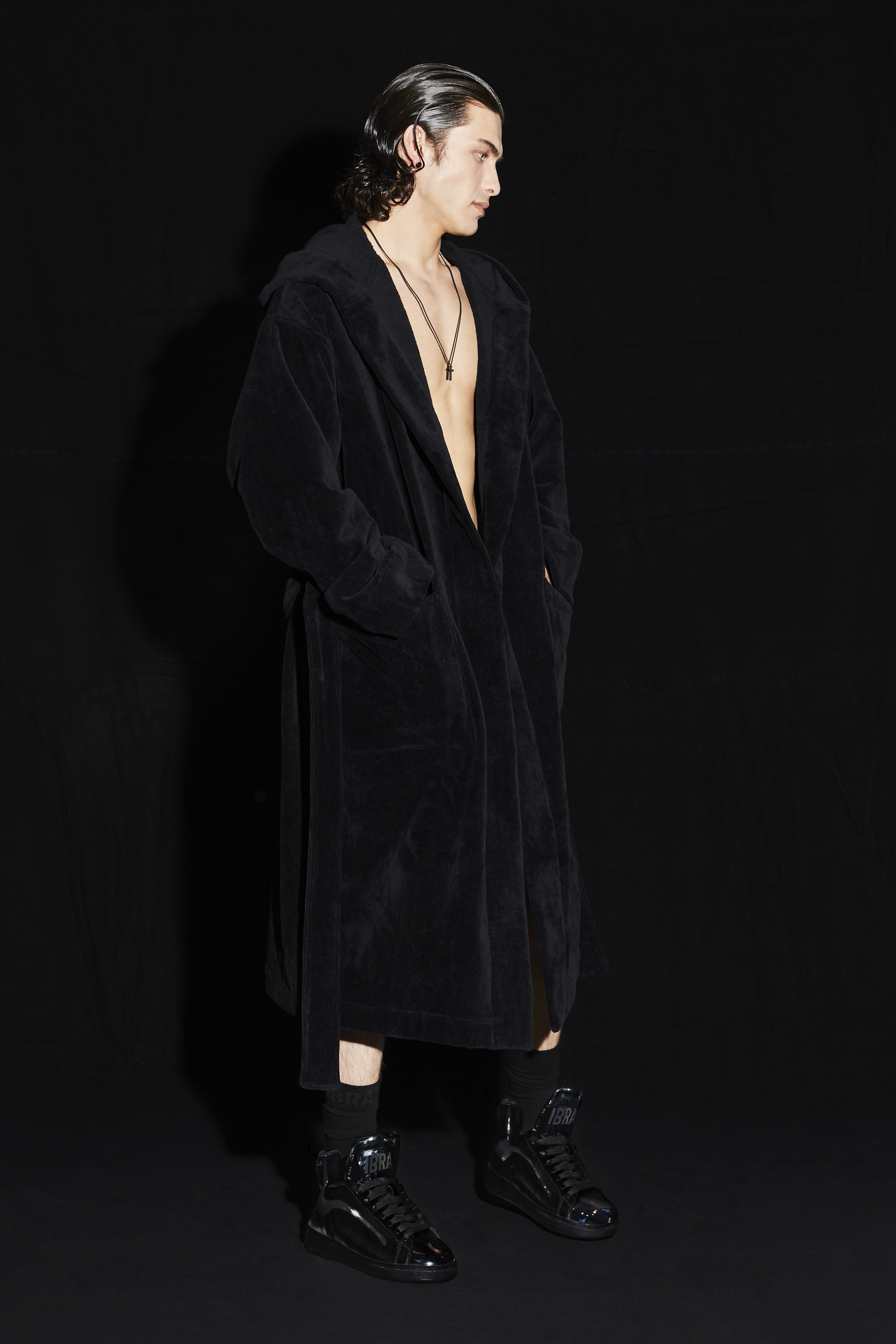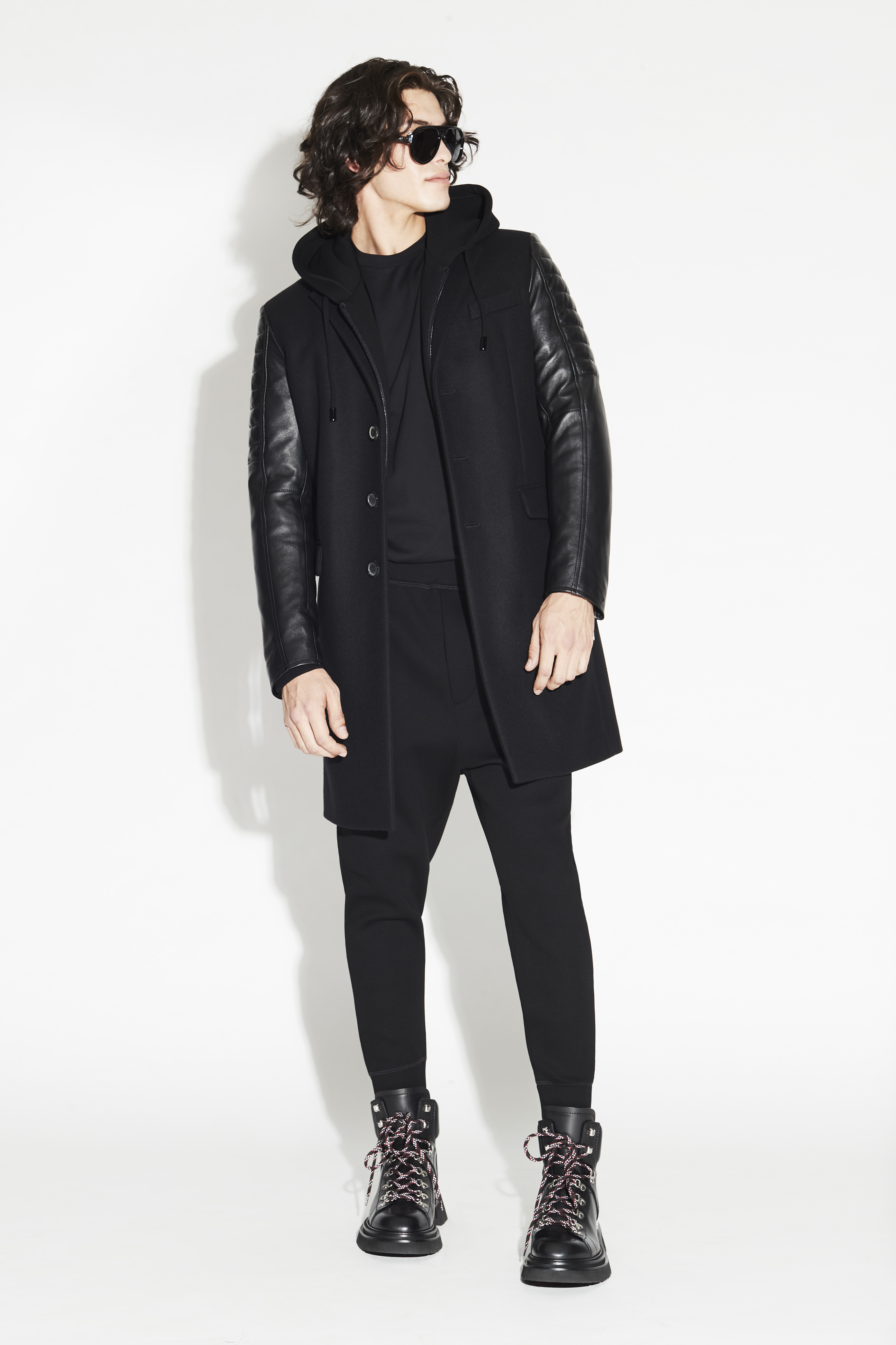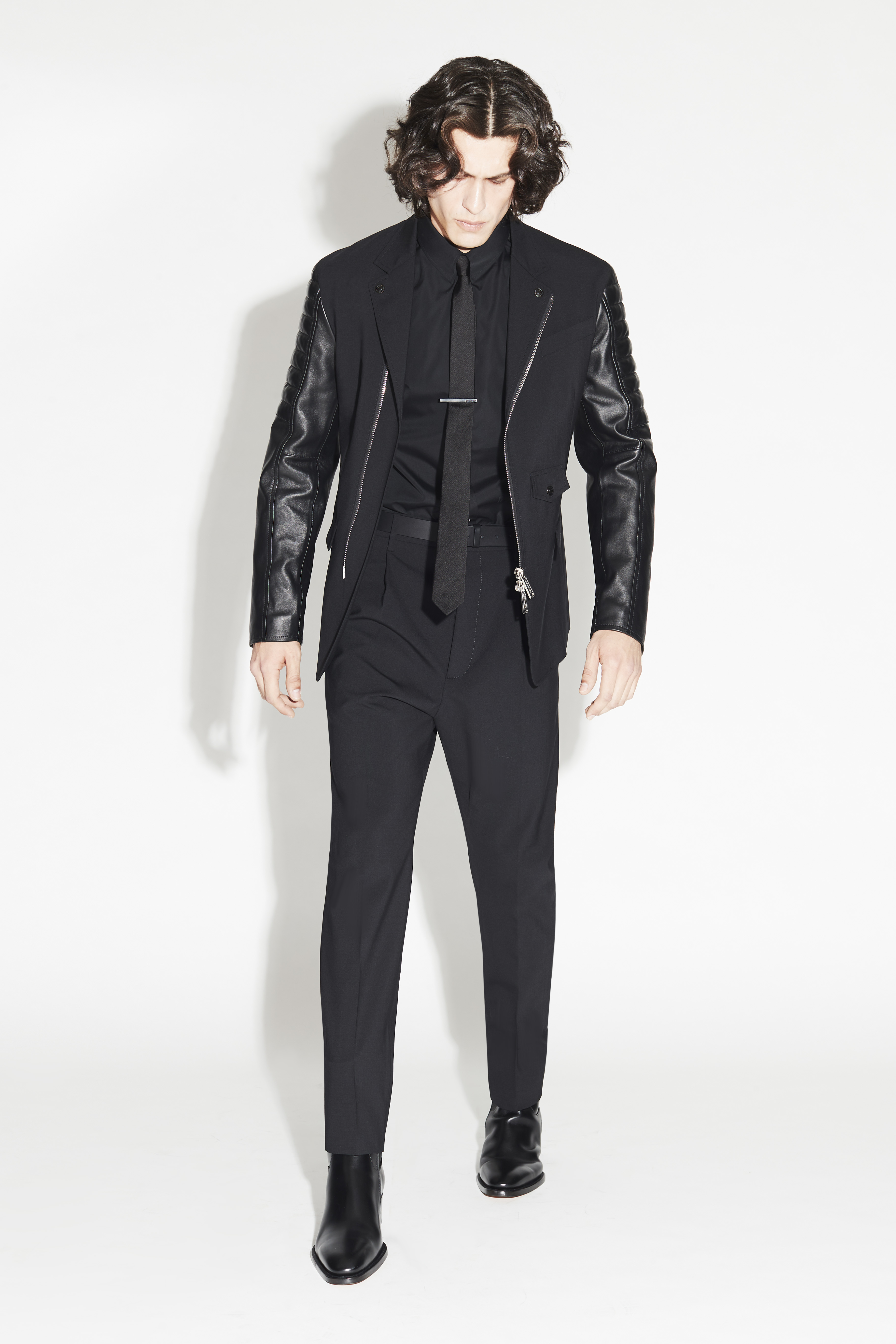 Eveningwear is a mix of contemporary and classic. The black tuxedo features a blazer, black tuxedo shirt, pleated pants and a slim bowtie and leather lace-ups. Unexpected evening looks are covered in a subtle shimmer of black crystals: jeans, a slouchy fit hoodie and relax fit shorts.