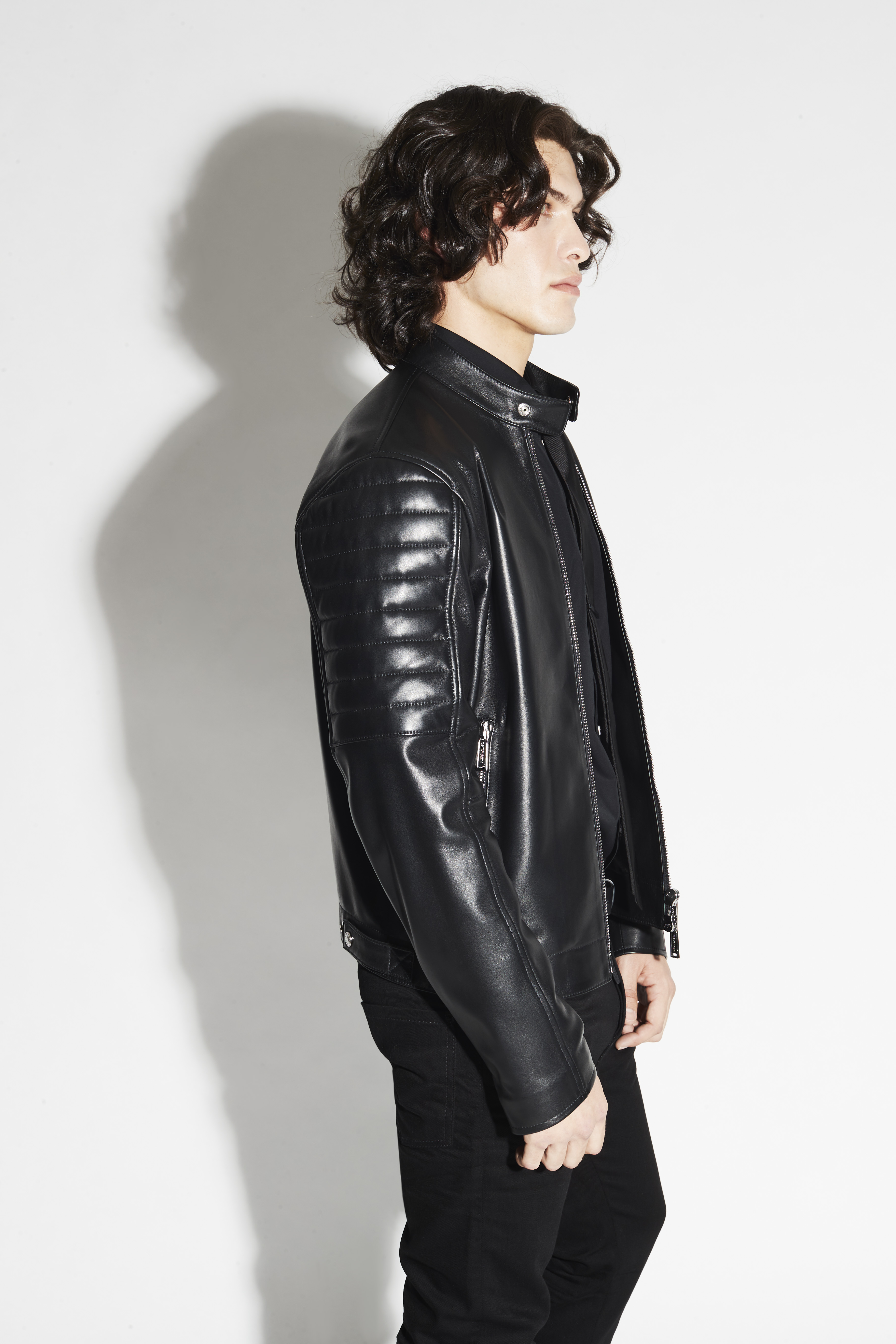 Everyday pieces are cut with modern elegance. A double-breasted felted wool coat, wool biker pants and merino knits are styled with a poplin shirt. Hybrid style outwear is constructed with leather biker sleeves, including a zip closure wool blazer zip and long wool coat. A bomber features Ibra printed on the reverse. T-shirts, black bull jeans and washed jean jacket and Western denim shirt are paired with boots and baseball caps. Sporty separates of hoodies and joggers are in technical or cotton fleece. Pool and beach wear is also covered with a mid-length swimsuit boxer, bathrobe and sandals.