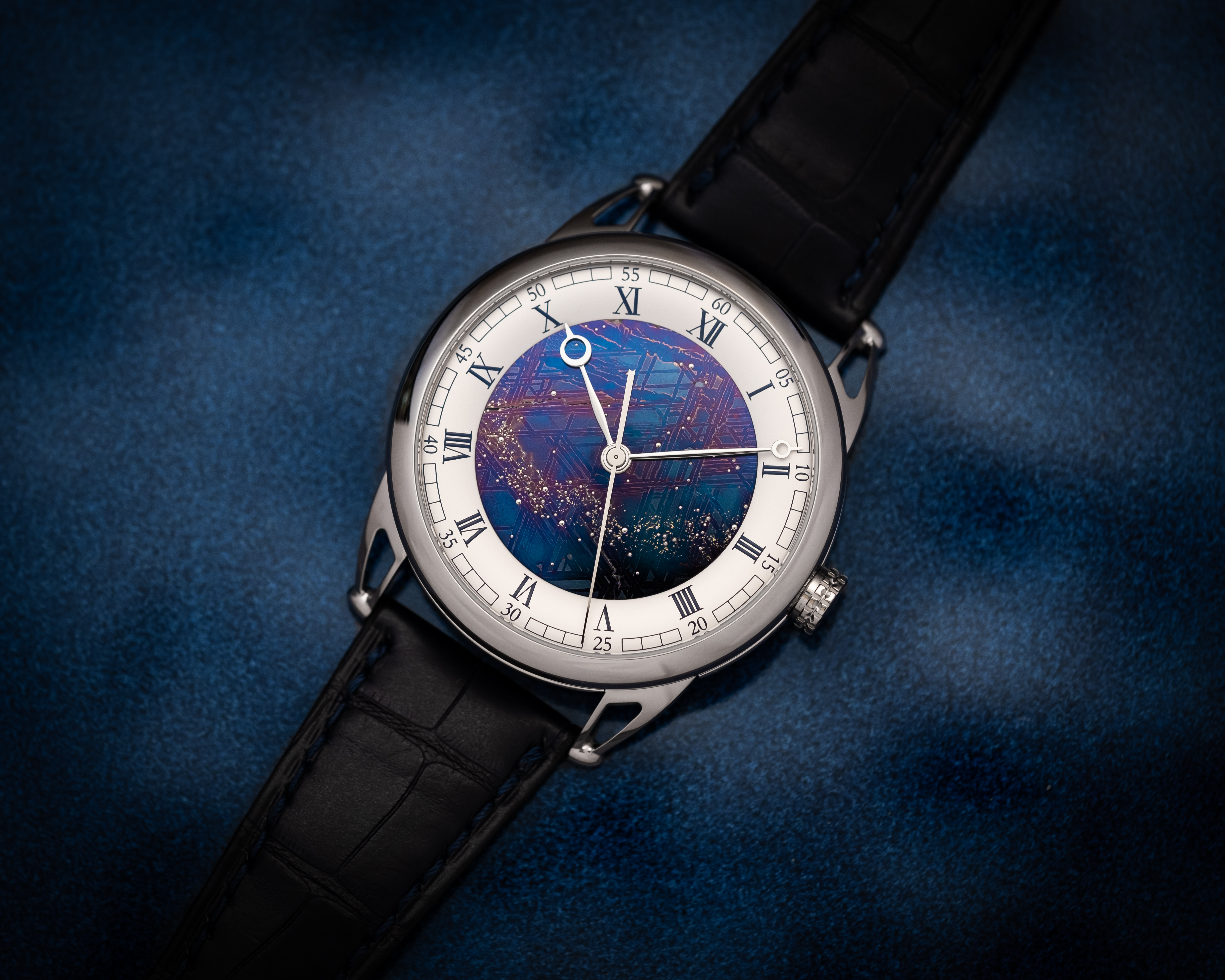 Created from a meteorite, the DB25 Starry Varius Aérolite becomes the witness to this chaotically orchestrated force. De Bethune has enriched its dial with a starry sky emblematic of this timeless material. Thus, a moment is engraved where time has ceased to exist.