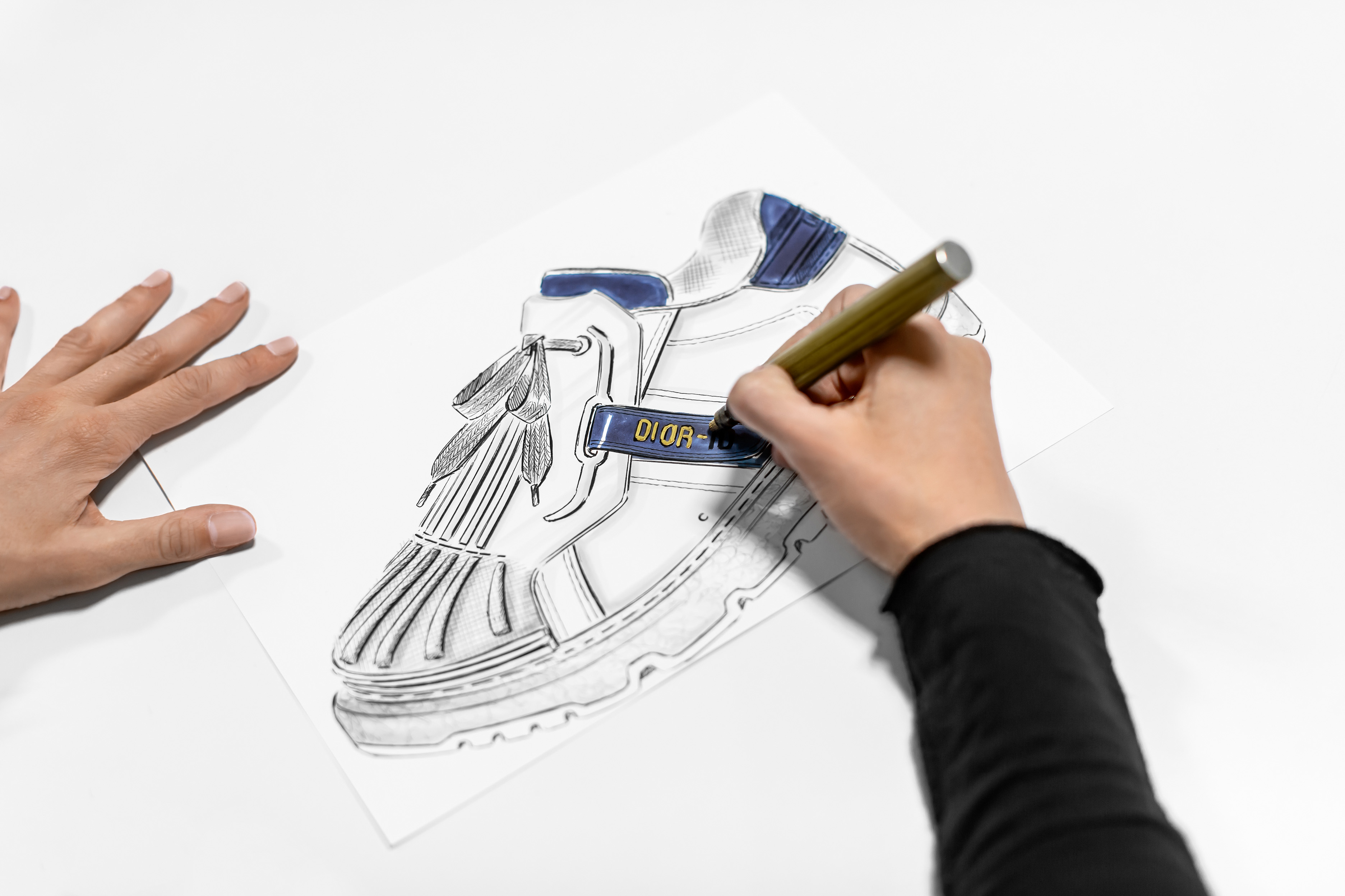 Celebrating the art of detail, an embossed gold “Dior-ID” signature takes on a three-dimensional effect, while the heel, tongue and thin side strap are colored blue, nude, green or red – matching the stitching on the upper. A thick, textured sole completes these exceptional creations, reinvented in these new shades for the spring-summer 2021 ready-to-wear collection.