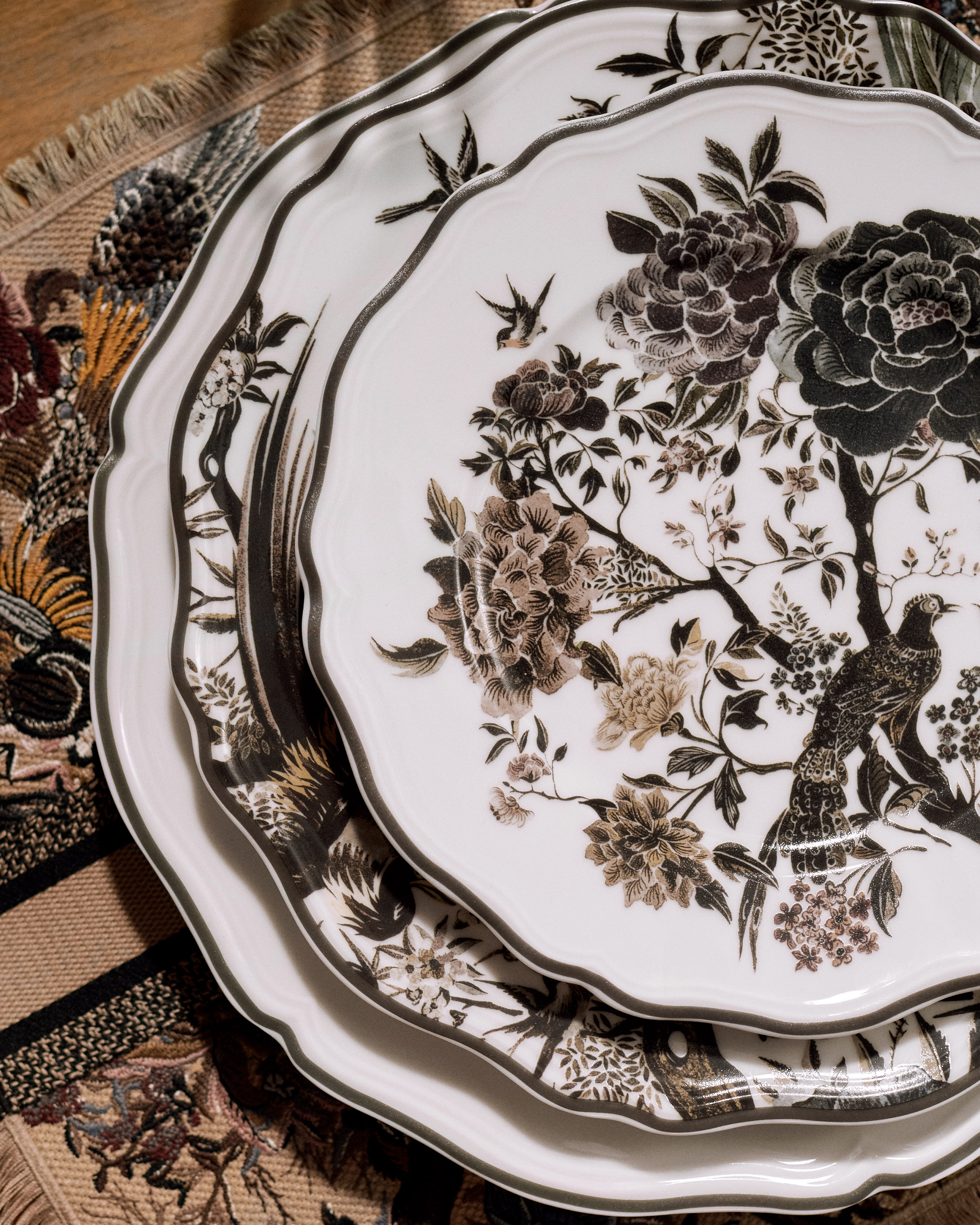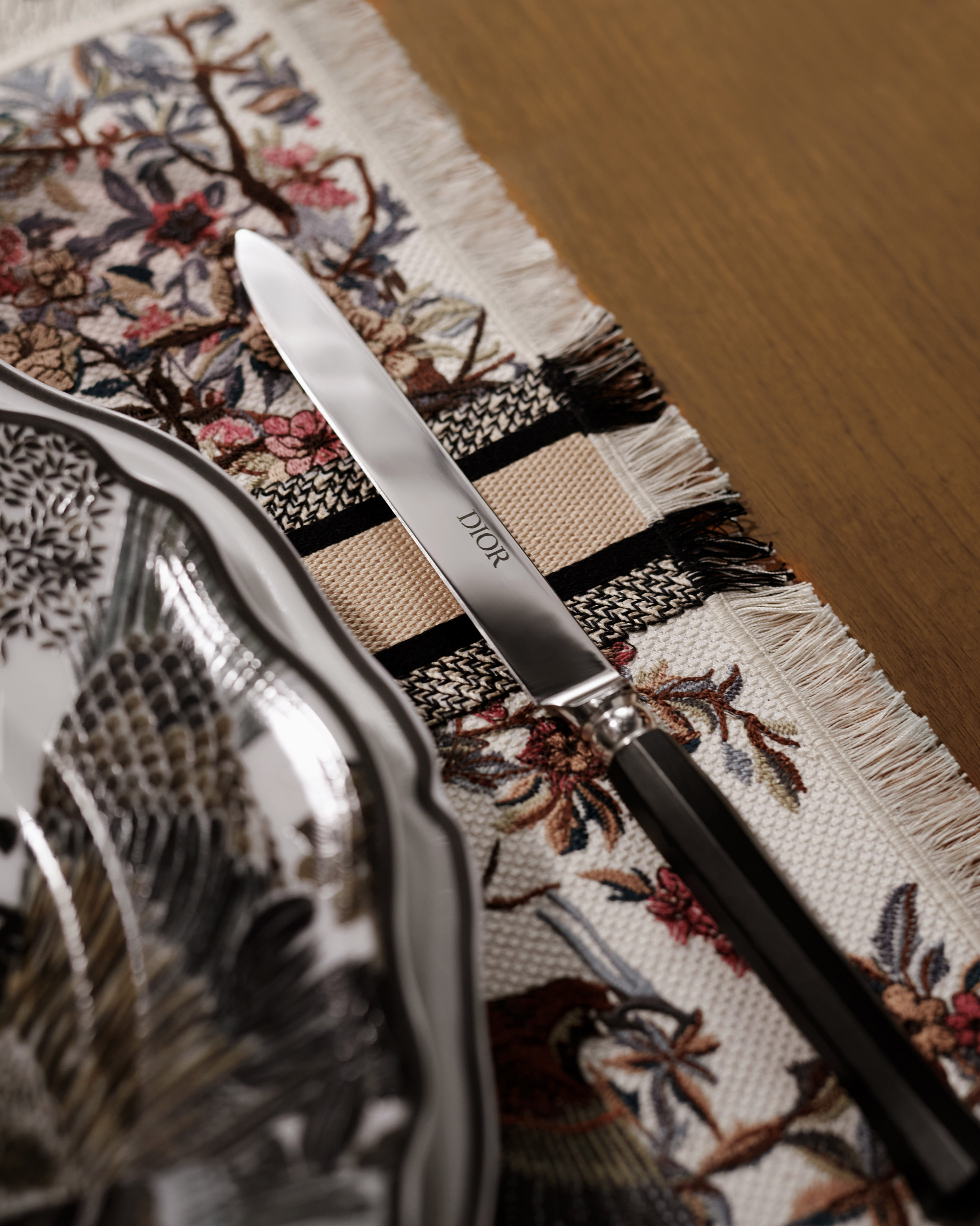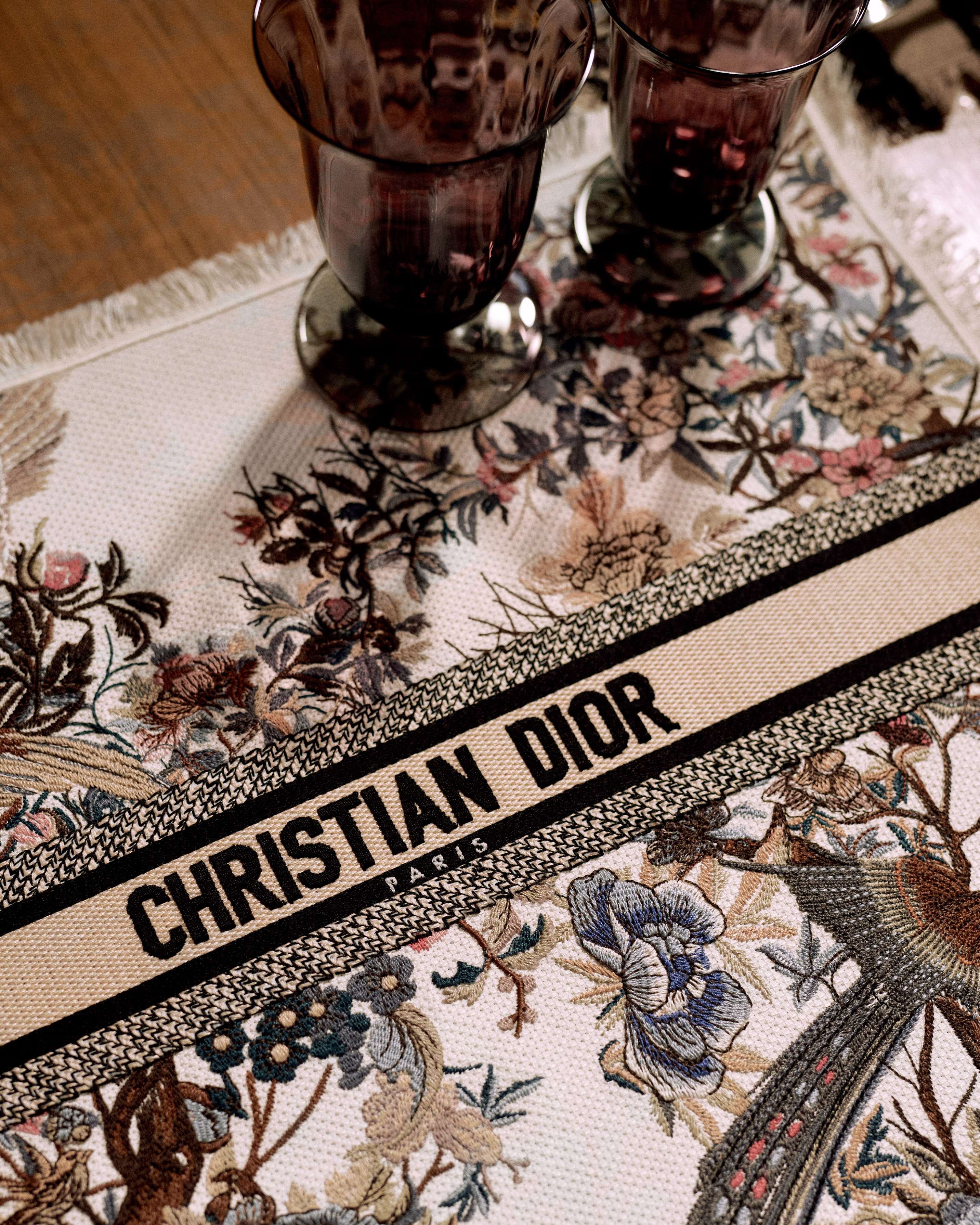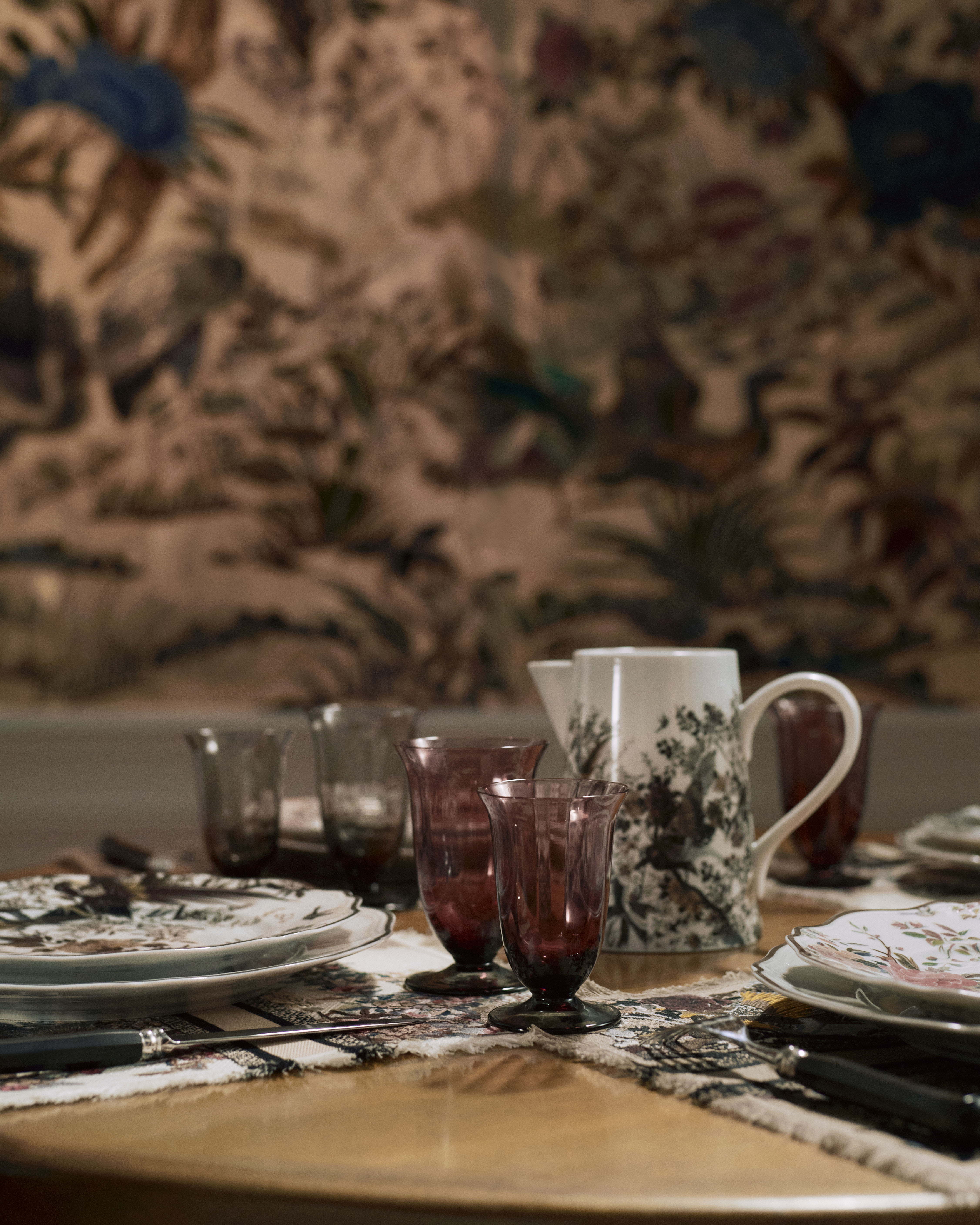 Like a precious echo, elegant designs featuring clematis, peonies dahlias and swallows are transposed onto decanters, porcelain plates and embroidered placemats. Embroidered cushions, notebooks and candles in matching shades complete this line that combines heritage and modernity, as a tribute to the passion cultivated by Monsieur Dior. “Living in a house that doesn’t resemble one,” recalled the founding couturier, “is a bit like wearing someone else’s clothes.”
