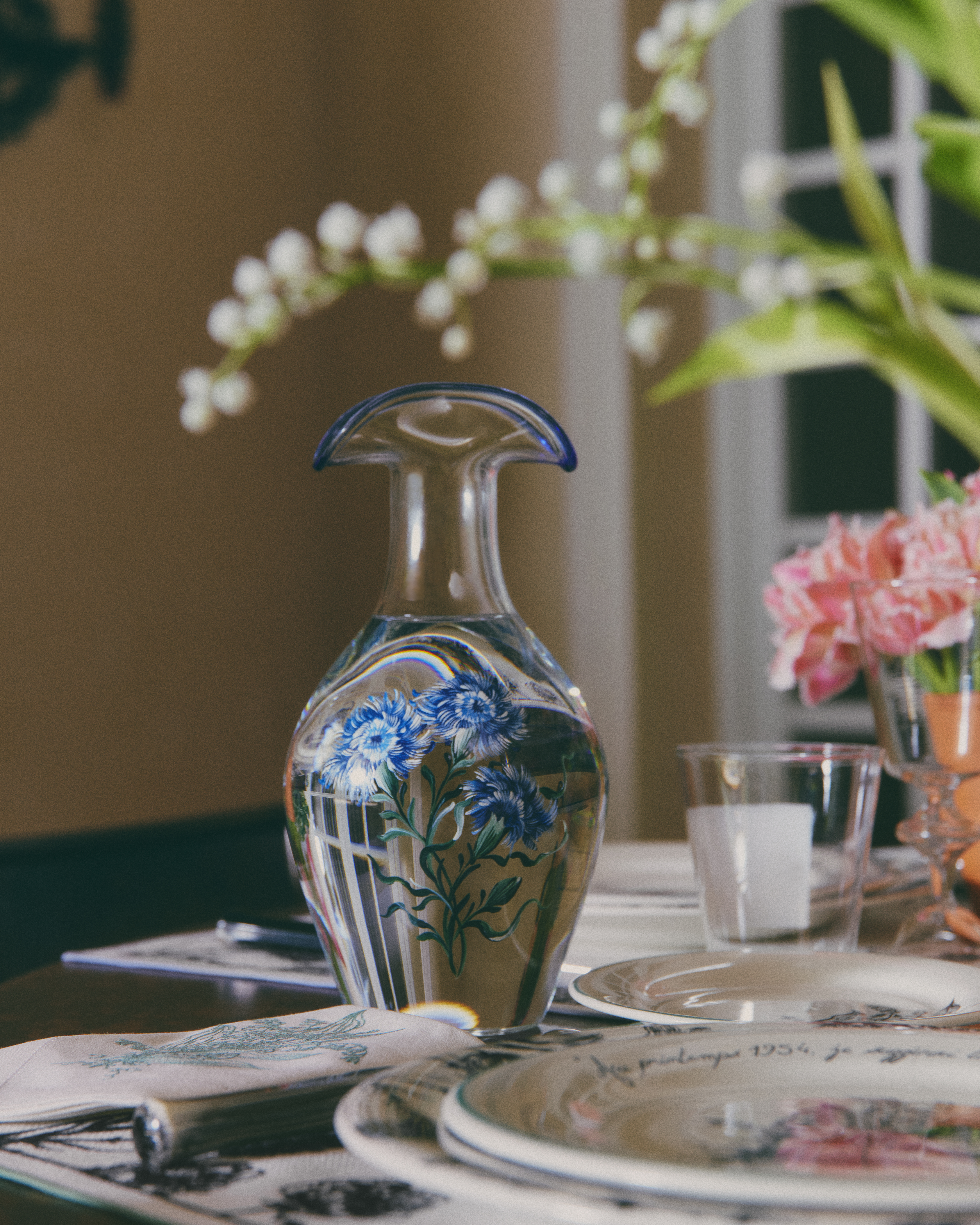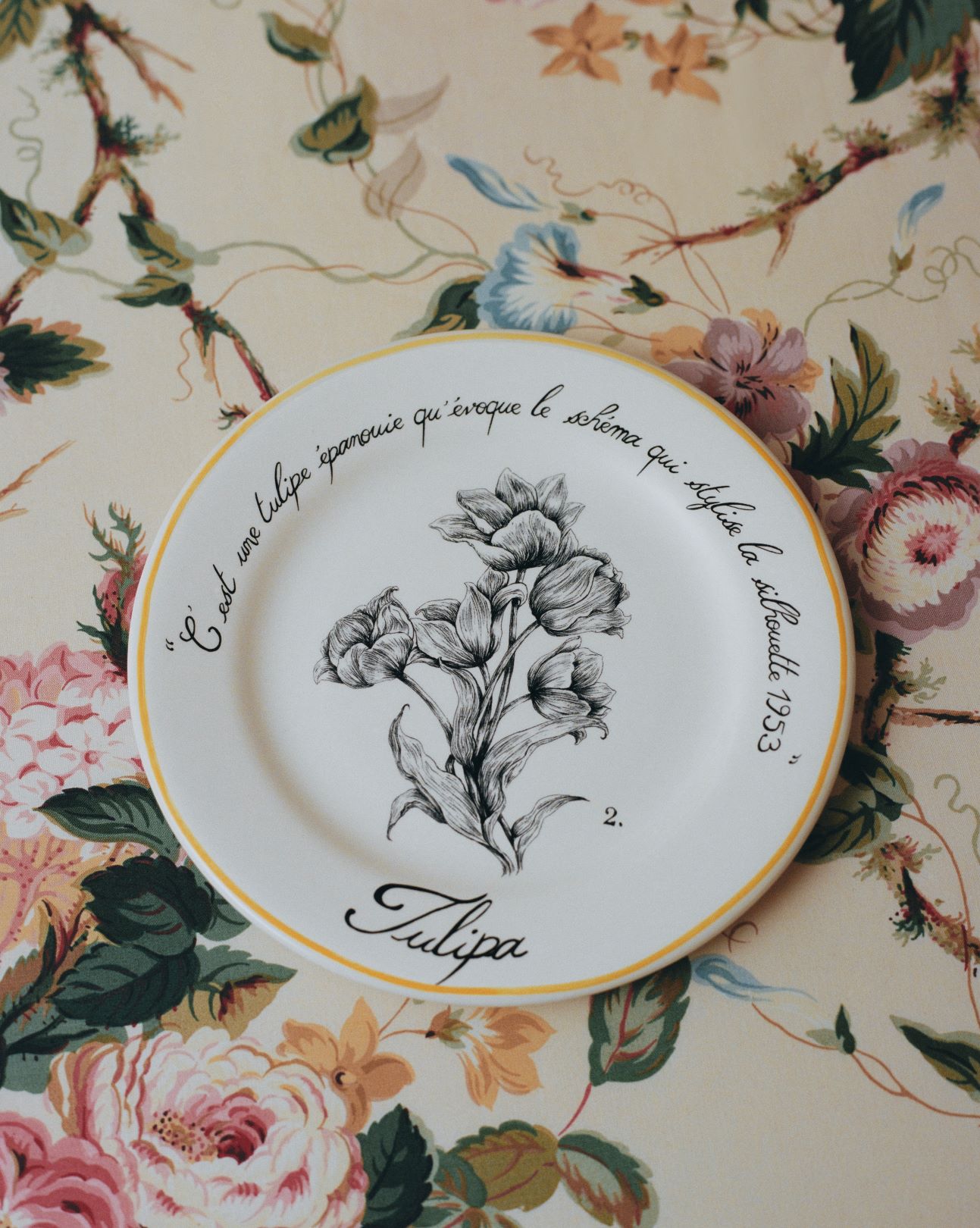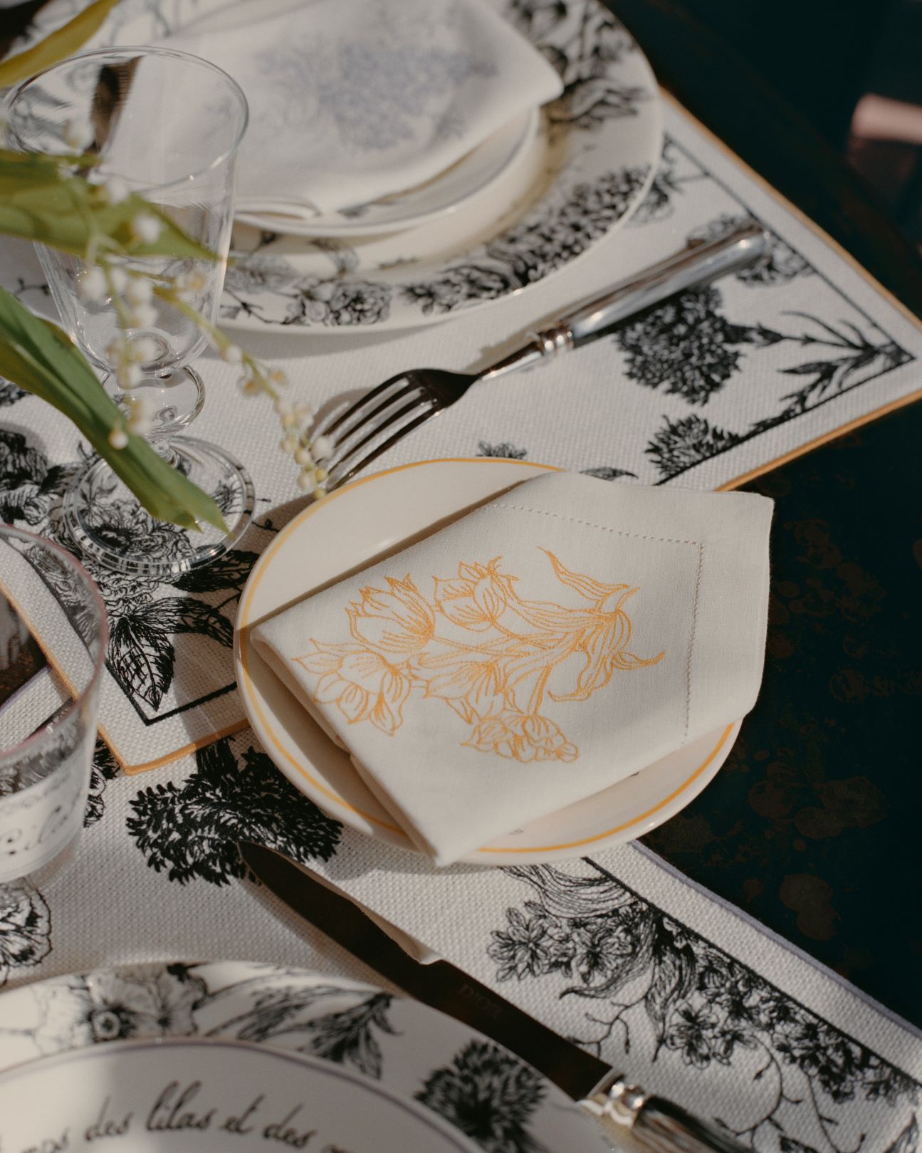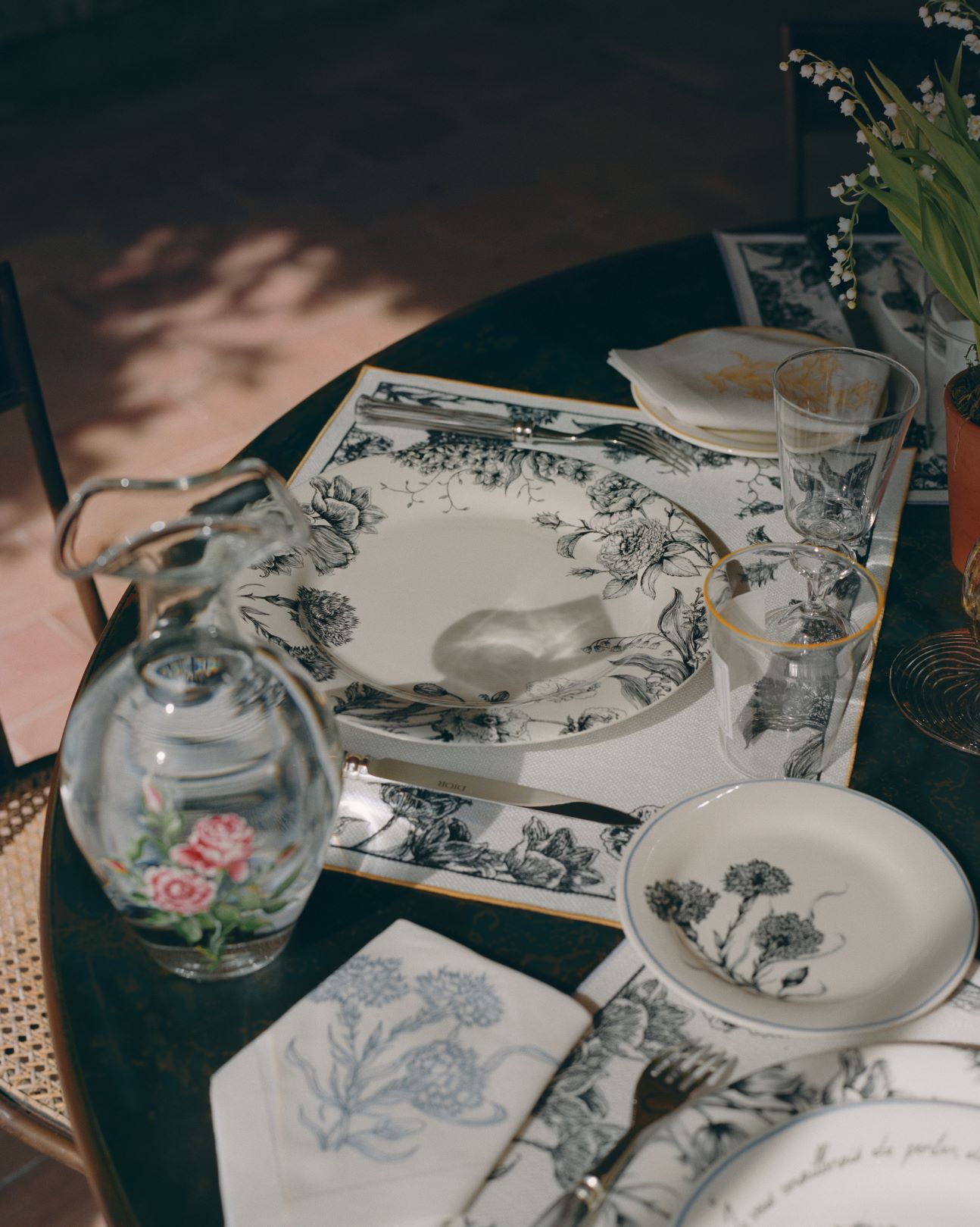 Celebrating the founding couturier’s passion for nature and botany, Dior Maison is unveiling a vibrantly hued collection based on the theme of the herbarium. Delicate sketches of lilacs, lilies of the valley, roses, carnations, tulips and papavers – echoing the plants in the garden of this extraordinary location in Montauroux – flourish on dinner and dessert plates, mouth-blown glass decanters, hand-painted glasses, napkins and embroidered placemats.