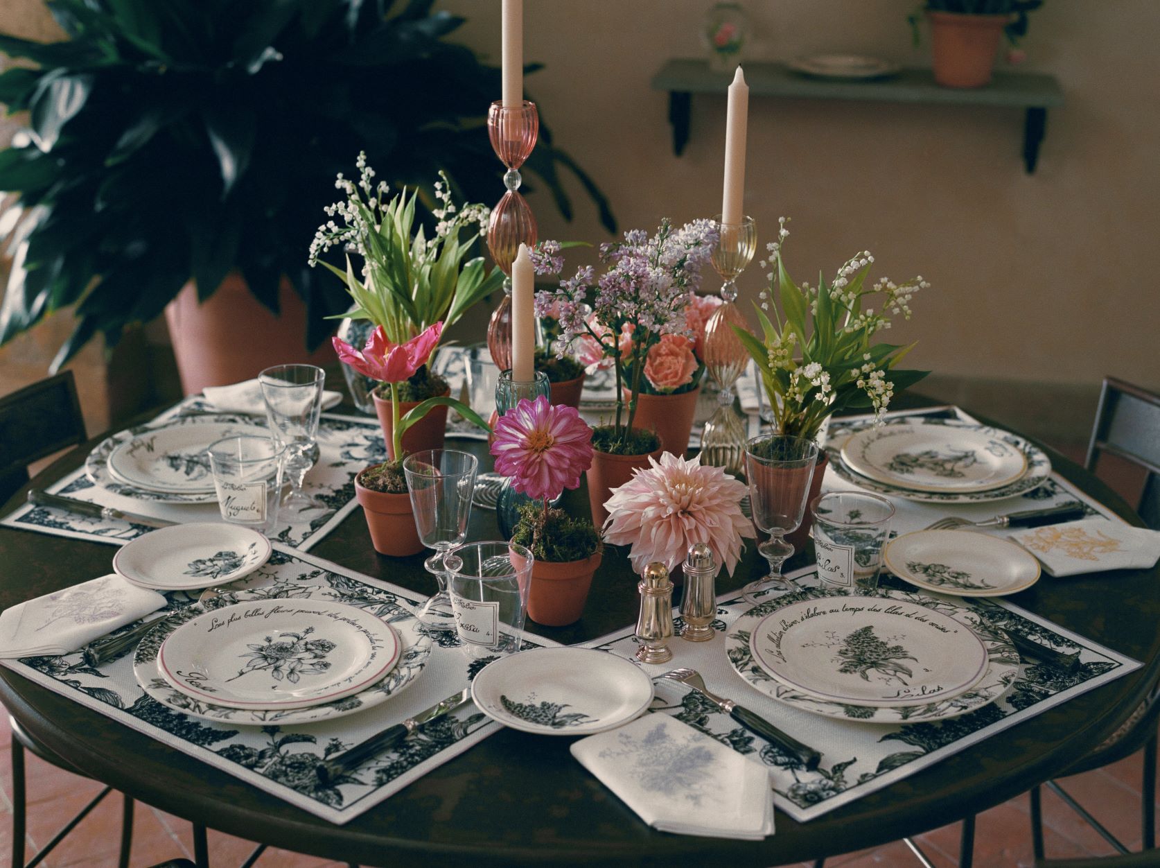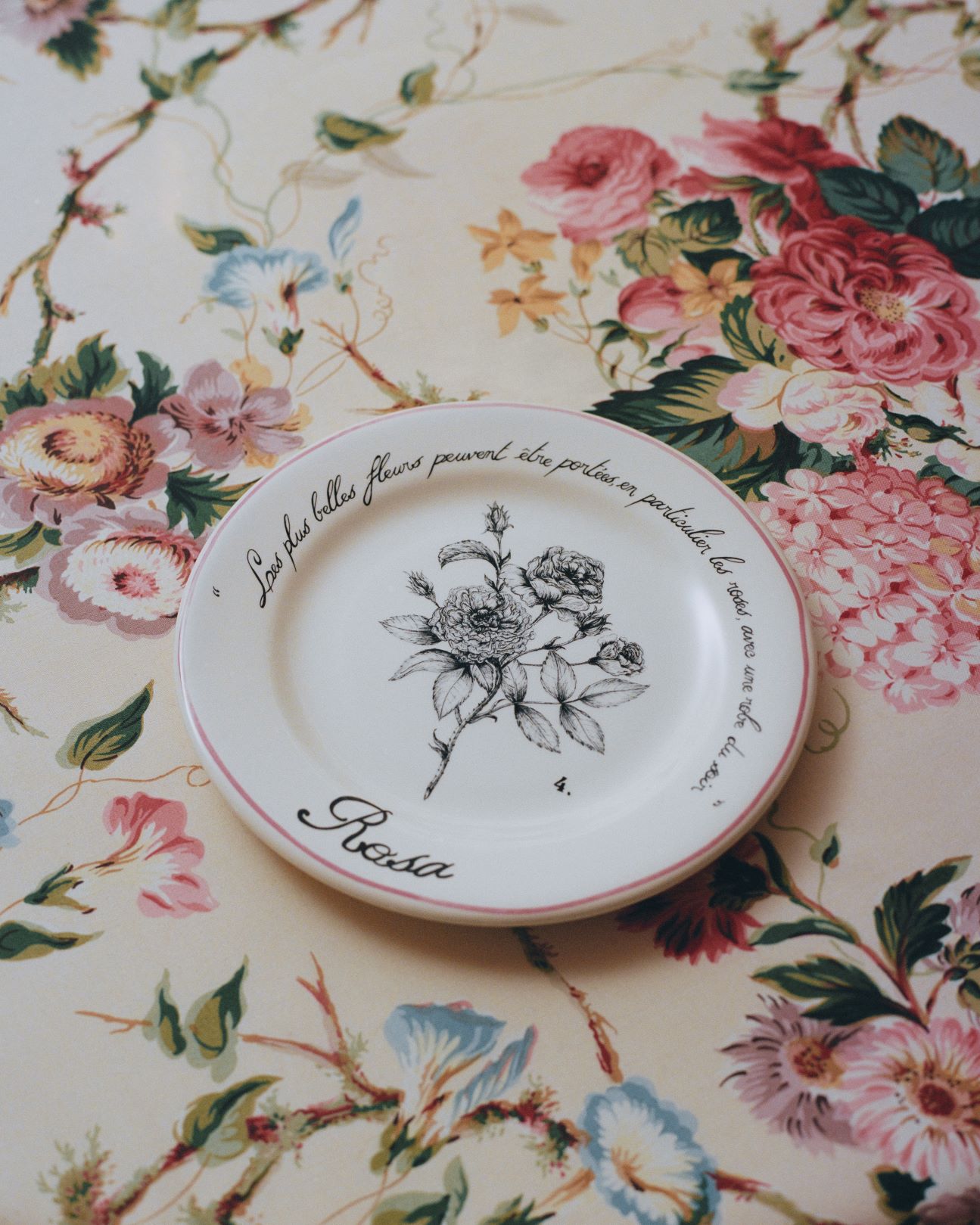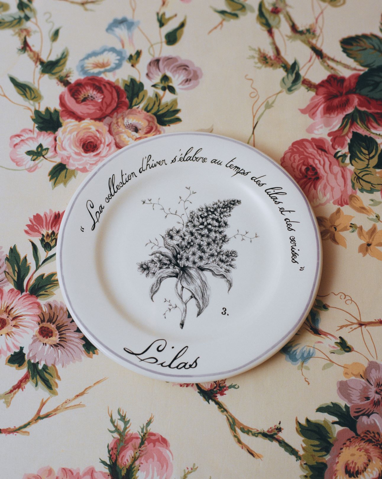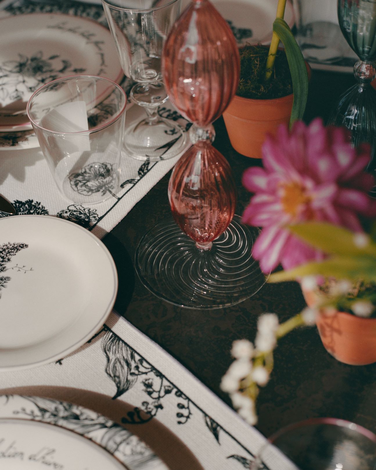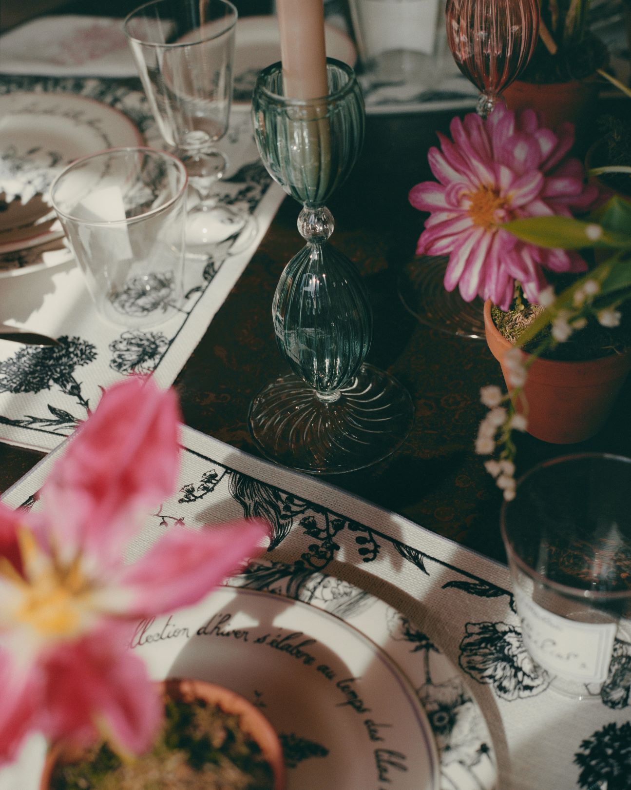 Celebrating the founding couturier’s passion for nature and botany, Dior Maison is unveiling a vibrantly hued collection based on the theme of the herbarium. Delicate sketches of lilacs, lilies of the valley, roses, carnations, tulips and papavers – echoing the plants in the garden of this extraordinary location in Montauroux – flourish on dinner and dessert plates, mouth-blown glass decanters, hand-painted glasses, napkins and embroidered placemats.