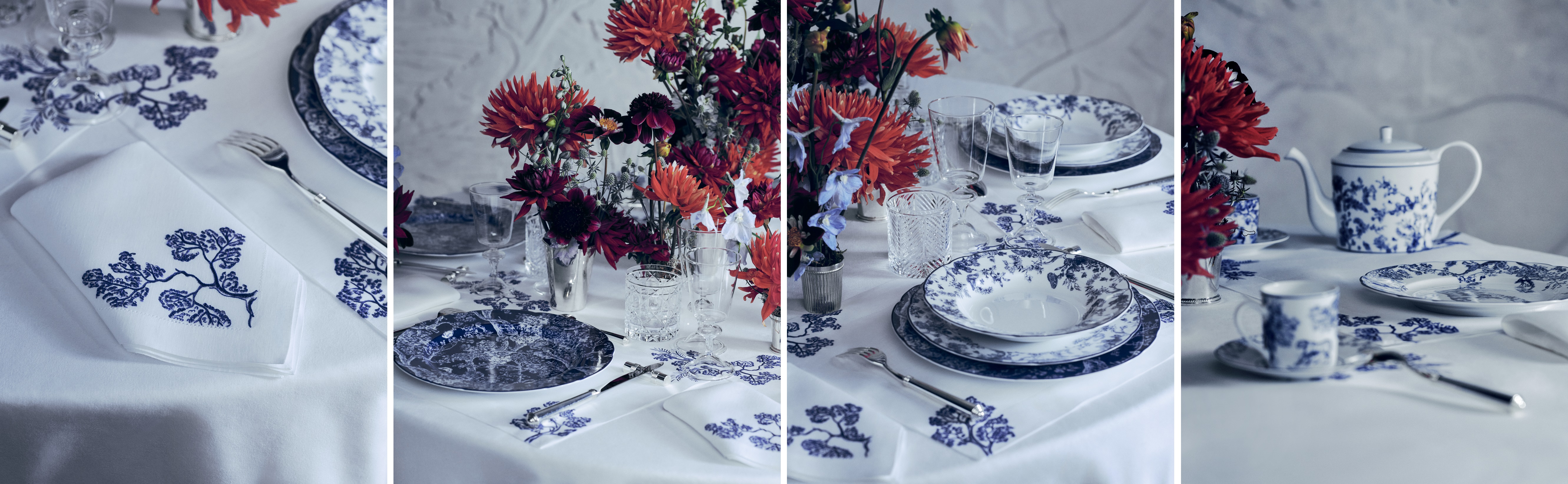 Constantly reinvented by Maria Grazia Chiuri, toile de Jouy, a symbol of French savoir-faire and Dior style, enhances the timeless Dior Maison line with its wild bestiary. Dinner, dessert and bread plates, as well as a platter, salad bowl, soup tureen and tea and coffee sets are all decorated with these intense blue sketches; a new variation that pays homage to one of Christian Dior’s key colors. Created in Limoges porcelain – extra white – from a mold, each piece is worked by hand, from the enameling to the meticulous painting requiring extreme delicacy, applying the “leaf-decorating” process. This enchanting collection is to be discovered in the boutique, alongside the table linen, either plain or in white jacquard, revisiting the unique patterns. A luminous celebration of the art of entertaining forever dear to Dior.